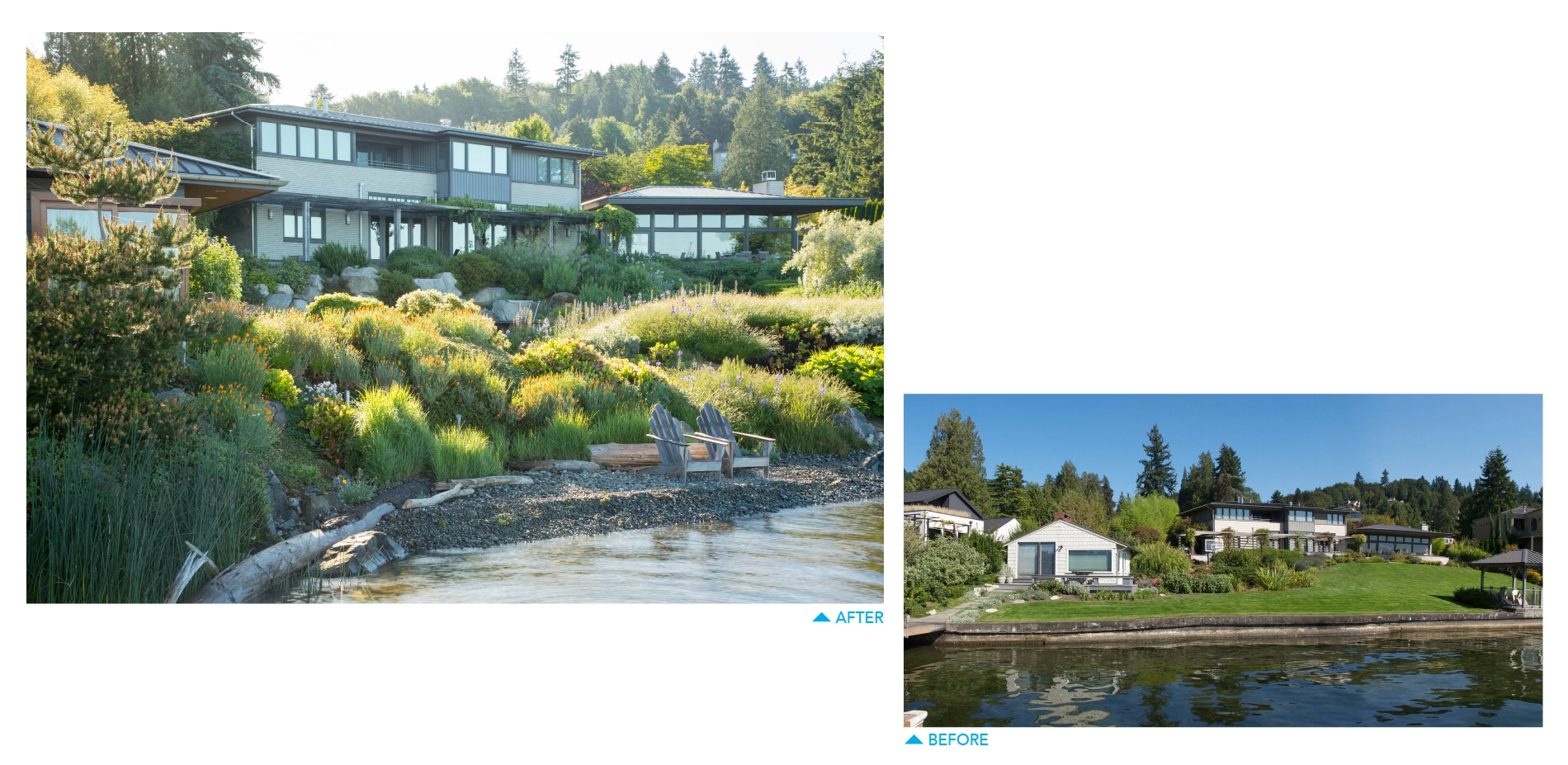 150' of southwest-facing shoreline is never a bad thing, yet this one-acre parcel in Seattle was compromised. A failing bulkhead and lawn run-off created hostile conditions for the lakeside ecology, and by restricting access was unfriendly for people, too. Fostering greater connections between people and nature at the land-water interface became the project’s main mission. With a focus on creating new specific experiences through the manipulation of landform, plant-life, the built environment and 'social choreography', the landscape now shows a mindful transitioning of space from built to un-built to create a dynamic place to enjoy nature, recreation and human company. Worlds away from the site’s previous suburban bland utility, the residential experience has been redefined. The landscape is now perceived as habitat and is used as such by humans and other animals. This project's ecological improvements to physical processes, shoreline habitat, and to water quality led to its adoption as a pilot project for the EPA's regional Green Shores for Homes program. It is used as an active 'laboratory' to fine-tune the GSH program.