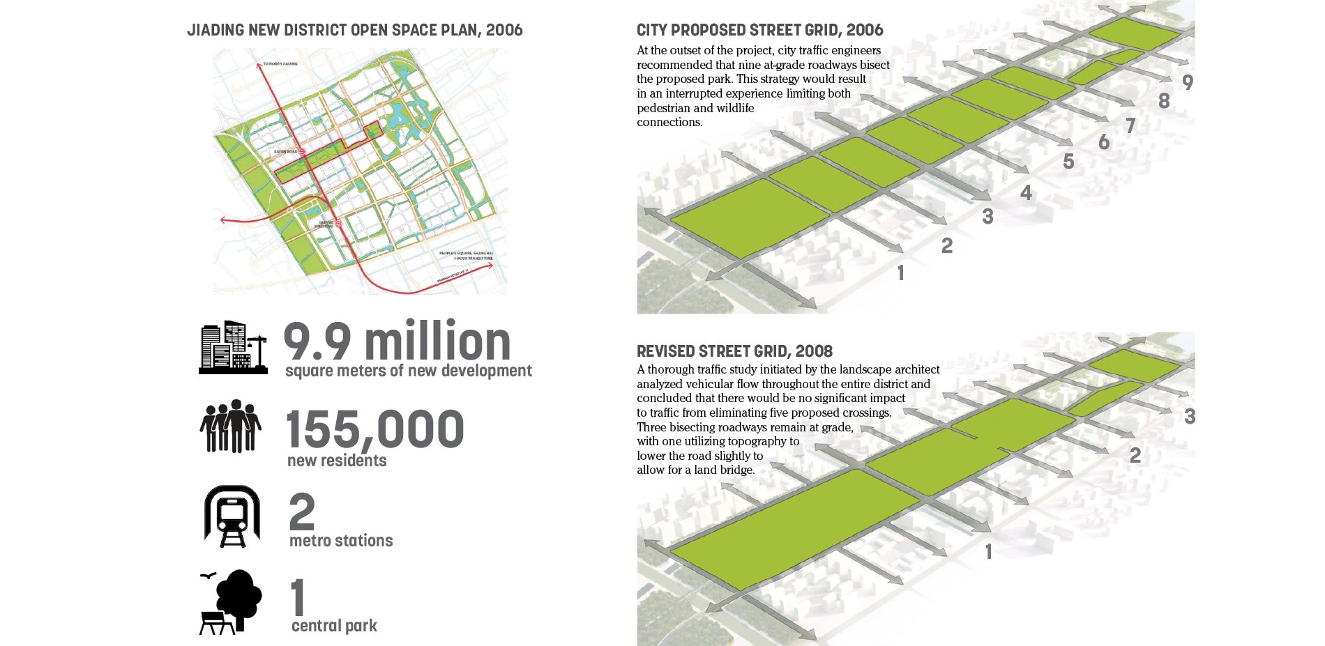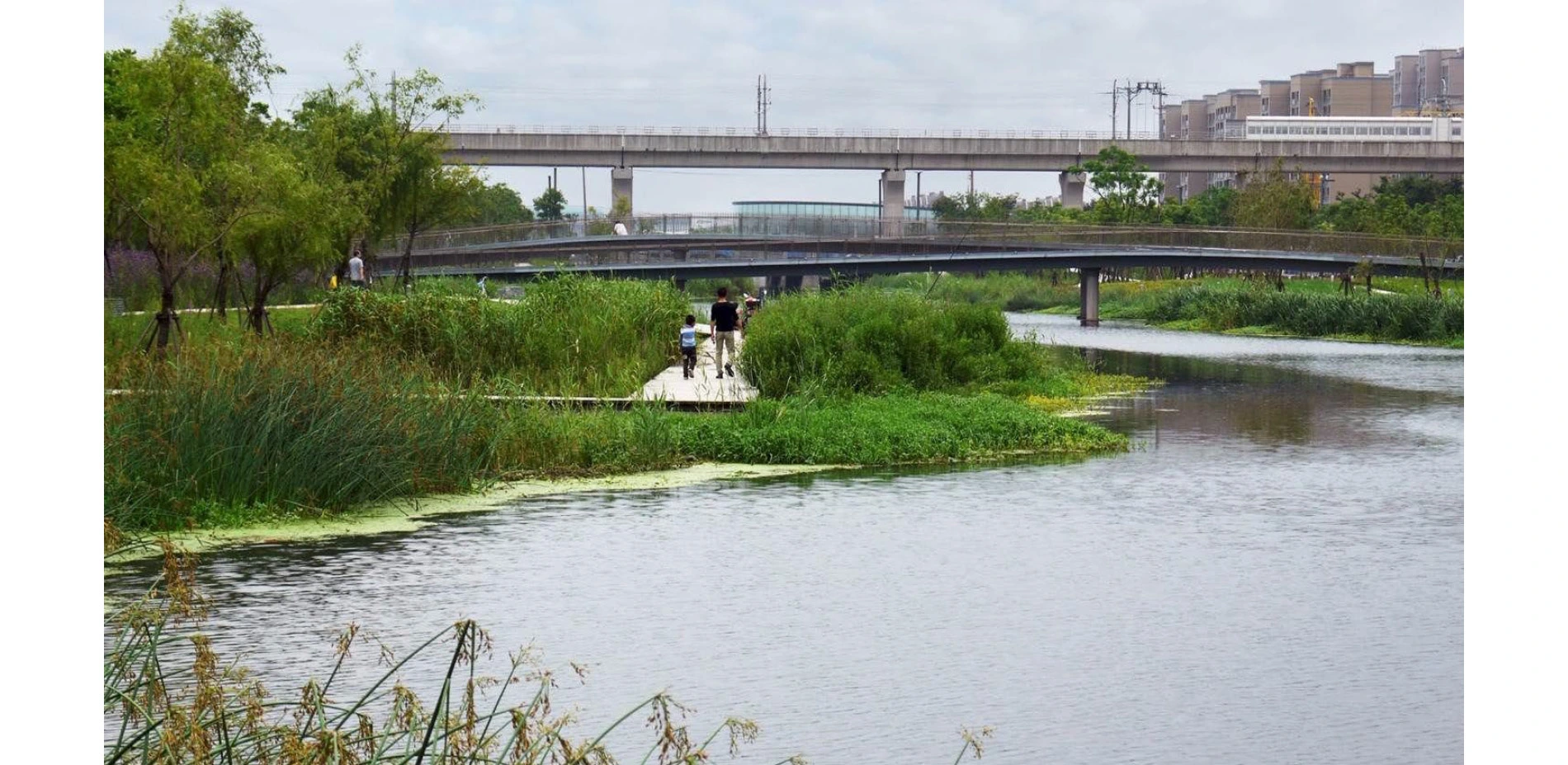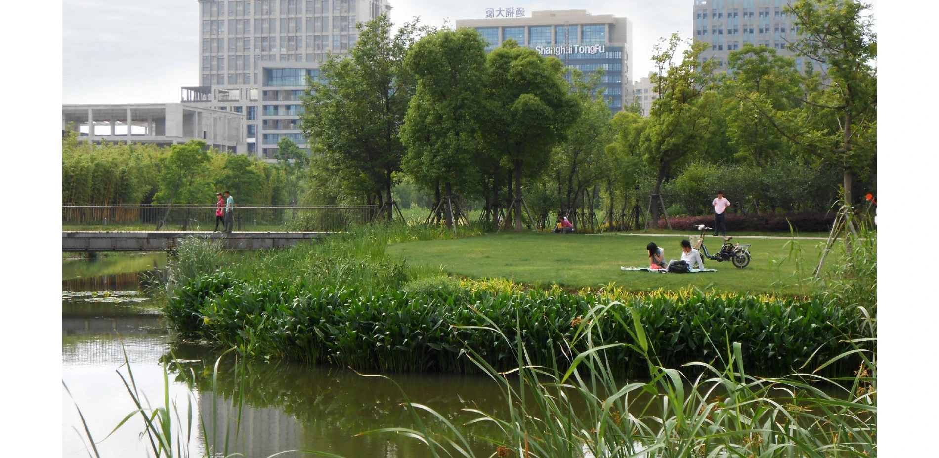 A NEW URBAN DISTRICT BORNE FROM A PARK The initial design brief for Jiading Park called for a radical transformation. In its existing state, the site was comprised of factories, warehouses, and fallow agricultural fields. Canals showed signs of eutrophication – the presence of excessive amounts of nutrients – causing an explosion of algal blooms and posing a public health hazard. The new park would have to not only reverse the negatives, but in turn reposition the site into a significant recreational space and lifestyle amenity. To do this, the landscape architects expanded the agenda to include an in depth review of the urban design of the entire district, as well as a comprehensive study of the site’s ecological systems. The goal was to conceive an immersive biophilic experience where natural capital could be restored. The City’s initial urban design strategy for Jiading District identified an open space reserved for the new park that was segmented into 10 sections with 9 roads cutting across its width. A thorough traffic study initiated by the landscape architect analyzed vehicular flow throughout the entire district and concluded that there would be no significant impact to traffic from eliminating five proposed crossings. Three of the bisecting roadways remain at grade, with one creatively manipulating topography to lower the road slightly to allow for a land bridge. The result was minimized fragmentation of the park, an uninterrupted pedestrian experience, and better connectivity of ecological systems and wildlife corridors. A 3.2 linear kilometer naturalized canal forms the backbone of the park. Here, wetlands improve water quality and support riparian habitats. Pockets of dense green cover, some inaccessible to humans, create refuge for wildlife. In total, water bodies make up 16.4% of the park while wetlands constitute some 9.2%. Pedestrian and cycling networks are overlaid onto this blue-green canvas, offering visitors options including secluded trails and broad promenades. These two big moves – altering the roadway grid and focusing on its ecological contribution – allowed the park to guide major urban design moves rather than simply reacting to given conditions. NATURAL SYSTEMS Existing canals on the site were retained, naturalized, and expanded to improve water quality and filter stormwater runoff. 60,700 square meters of constructed wetlands were created with a capacity to treat up to 10,900 cubic meters, exceeding the runoff volume from the site and surrounding roads and development that drain to the canals during a 95th percentile storm event. Biofiltration areas were included along adjacent roads to provide treatment prior to discharge into the park’s canals. A series of vegetated filter strips supplement the wetlands’ cleansing function, and sub-surface rainwater storage cisterns hold water for irrigation. A post-occupancy evaluation conducted by East China Normal University’s Urban & Rural Ecological Restoration Lab noted significant improvements in water quality across the site. Samples taken at multiple points along the main canal over the course of a full year demonstrated a 66% reduction of total nitrogen, and a 97% reduction of total phosphorous. The park offers a range of green cover from woodlands, wetlands, tree groves, and lawn areas. Naturalized woodlands comprise 14.4% of the total site area, tree groves comprise 17%, and lawns only around 5%. All vegetation introduced into the park is native to the lower Yangtze River Delta region. Approximately 2,500 existing trees on site were retained, with another 11,474 newly planted. In the final tally, there are some 62 species of trees throughout the park. The planting strategy focused on creating multiple canopy layers and contiguous forest cover, with varying vegetation density. Human accessibility is restricted in some parts, provided critical space for wildlife refuge. Upon completion of the park, fauna returned to the site at a remarkable rate. Pollinator species, not observed during initial site inventories, have bloomed and fish and amphibian communities have begun to thrive. Although no formal audit was undertaken, the park is anecdotally known to be home to many species of egrets, frogs, dragonflies, crayfish, birds, and fish. Some appear to have transferred from habitats near Yuanxiang Lake to the east. Also recorded in the post occupancy study conducted by East China Normal University, the park has had an impact on Jiading District’s urban heat island, with a reduction in park surface temperatures averaging 1.9 degrees Celsius. Estimates also suggest that approximately 167 tons of carbon will be sequestered annually in the park, up from a pre-development baseline of 39 tons. Carbon stored over 25 years will equal roughly 2,410 tons, up from 559 tons. URBAN SYSTEMS Jiading Park is the social and recreational hub of the burgeoning district, and is connected to a wider network of pedestrian pathways. In total, about 18 hectares of the park are dedicated to recreational uses. About 6,500 square meters of development area features restaurants, art galleries, and civic program. There are also 17 kilometers of paths and boardwalks throughout the park, with links from adjacent residential neighborhoods at multiple points to facilitate accessibility. As a catalyst for the new development, it is now framed by government, cultural, and civic buildings, mixed-use developments, and residential high-rises. It is also highly connected to the regional public transit network, with the Baiyun Road station of the Shanghai metro linking the park to downtown Shanghai in approximately 45 minutes via subway Line 11. PEOPLE & COMMUNITY Four distinct pathways run the length of Jiading Park – the Dynamic Path, the Tranquil Path, the Water Path, and the Tree Path. The Water Path runs alongside the main canal, past wetlands, filtration beds, planted wetland terraces, and waterfront boardwalks. The Dynamic Path 