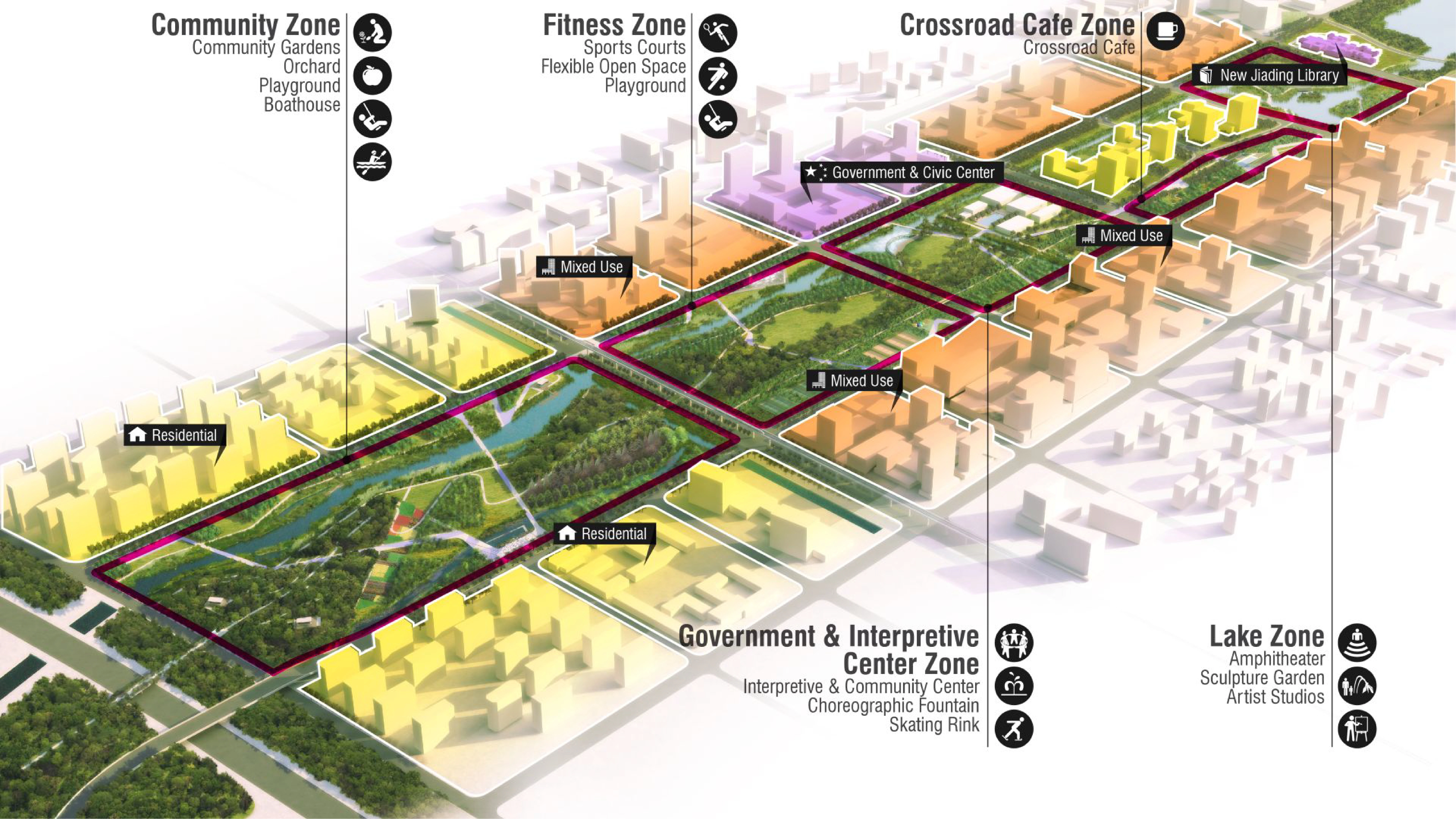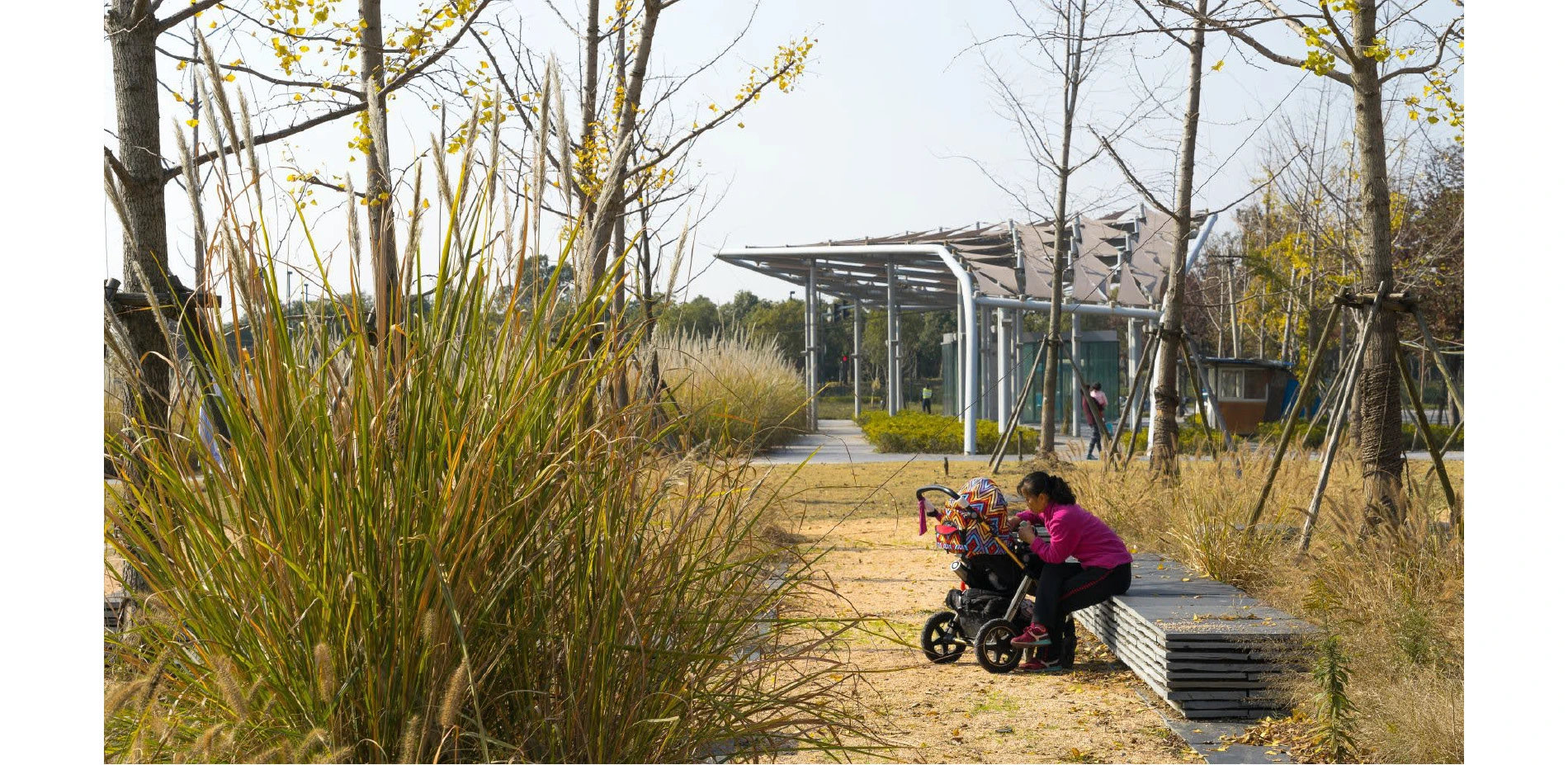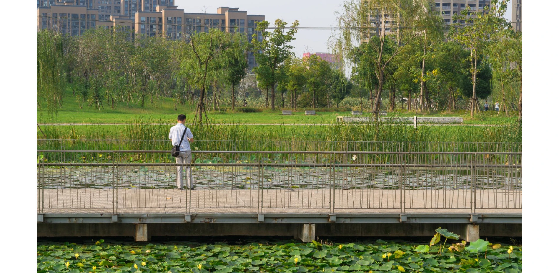 A NEW URBAN DISTRICT BORNE FROM A PARK The initial design brief for Jiading Park called for a radical transformation. In its existing state, the site was comprised of factories, warehouses, and fallow agricultural fields. Canals showed signs of eutrophication – the presence of excessive amounts of nutrients – causing an explosion of algal blooms and posing a public health hazard. The new park would have to not only reverse the negatives, but in turn reposition the site into a significant recreational space and lifestyle amenity. To do this, the landscape architects expanded the agenda to include an in depth review of the urban design of the entire district, as well as a comprehensive study of the site’s ecological systems. The goal was to conceive an immersive biophilic experience where natural capital could be restored. The City’s initial urban design strategy for Jiading District identified an open space reserved for the new park that was segmented into 10 sections with 9 roads cutting across its width. A thorough traffic study initiated by the landscape architect analyzed vehicular flow throughout the entire district and concluded that there would be no significant impact to traffic from eliminating five proposed crossings. Three of the bisecting roadways remain at grade, with one creatively manipulating topography to lower the road slightly to allow for a land bridge. The result was minimized fragmentation of the park, an uninterrupted pedestrian experience, and better connectivity of ecological systems and wildlife corridors. A 3.2 linear kilometer naturalized canal forms the backbone of the park. Here, wetlands improve water quality and support riparian habitats. Pockets of dense green cover, some inaccessible to humans, create refuge for wildlife. In total, water bodies make up 16.4% of the park while wetlands constitute some 9.2%. Pedestrian and cycling networks are overlaid onto this blue-green canvas, offering visitors options including secluded trails and broad promenades. These two big moves – altering the roadway grid and focusing on its ecological contribution – allowed the park to guide major urban design moves rather than simply reacting to given conditions. NATURAL SYSTEMS Existing canals on the site were retained, naturalized, and expanded to improve water quality and filter stormwater runoff. 60,700 square meters of constructed wetlands were created with a capacity to treat up to 10,900 cubic meters, exceeding the runoff volume from the site and surrounding roads and development that drain to the canals during a 95th percentile storm event. Biofiltration areas were included along adjacent roads to provide treatment prior to discharge into the park’s canals. A series of vegetated filter strips supplement the wetlands’ cleansing function, and sub-surface rainwater storage cisterns hold water for irrigation. A post-occupancy evaluation conducted by East China Normal University’s Urban & Rural Ecological Restoration Lab noted significant improvements in water quality across the site. Samples taken at multiple points along the main canal over the course of a full year demonstrated a 66% reduction of total nitrogen, and a 97% reduction of total phosphorous. The park offers a range of green cover from woodlands, wetlands, tree groves, and lawn areas. Naturalized woodlands comprise 14.4% of the total site area, tree groves comprise 17%, and lawns only around 5%. All vegetation introduced into the park is native to the lower Yangtze River Delta region. Approximately 2,500 existing trees on site were retained, with another 11,474 newly planted. In the final tally, there are some 62 species of trees throughout the park. The planting strategy focused on creating multiple canopy layers and contiguous forest cover, with varying vegetation density. Human accessibility is restricted in some parts, provided critical space for wildlife refuge. Upon completion of the park, fauna returned to the site at a remarkable rate. Pollinator species, not observed during initial site inventories, have bloomed and fish and amphibian communities have begun to thrive. Although no formal audit was undertaken, the park is anecdotally known to be home to many species of egrets, frogs, dragonflies, crayfish, birds, and fish. Some appear to have transferred from habitats near Yuanxiang Lake to the east. Also recorded in the post occupancy study conducted by East China Normal University, the park has had an impact on Jiading District’s urban heat island, with a reduction in park surface temperatures averaging 1.9 degrees Celsius. Estimates also suggest that approximately 167 tons of carbon will be sequestered annually in the park, up from a pre-development baseline of 39 tons. Carbon stored over 25 years will equal roughly 2,410 tons, up from 559 tons. URBAN SYSTEMS Jiading Park is the social and recreational hub of the burgeoning district, and is connected to a wider network of pedestrian pathways. In total, about 18 hectares of the park are dedicated to recreational uses. About 6,500 square meters of development area features restaurants, art galleries, and civic program. There are also 17 kilometers of paths and boardwalks throughout the park, with links from adjacent residential neighborhoods at multiple points to facilitate accessibility. As a catalyst for the new development, it is now framed by government, cultural, and civic buildings, mixed-use developments, and residential high-rises. It is also highly connected to the regional public transit network, with the Baiyun Road station of the Shanghai metro linking the park to downtown Shanghai in approximately 45 minutes via subway Line 11. PEOPLE & COMMUNITY Four distinct pathways run the length of Jiading Park – the Dynamic Path, the Tranquil Path, the Water Path, and the Tree Path. The Water Path runs alongside the main canal, past wetlands, filtration beds, planted wetland terraces, and waterfront boardwalks. The Dynamic Path 