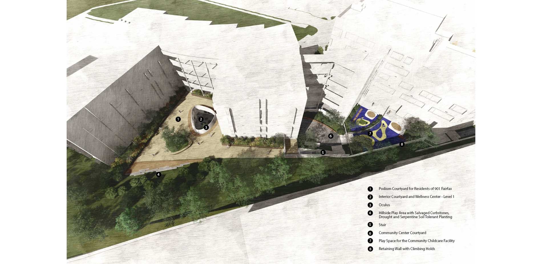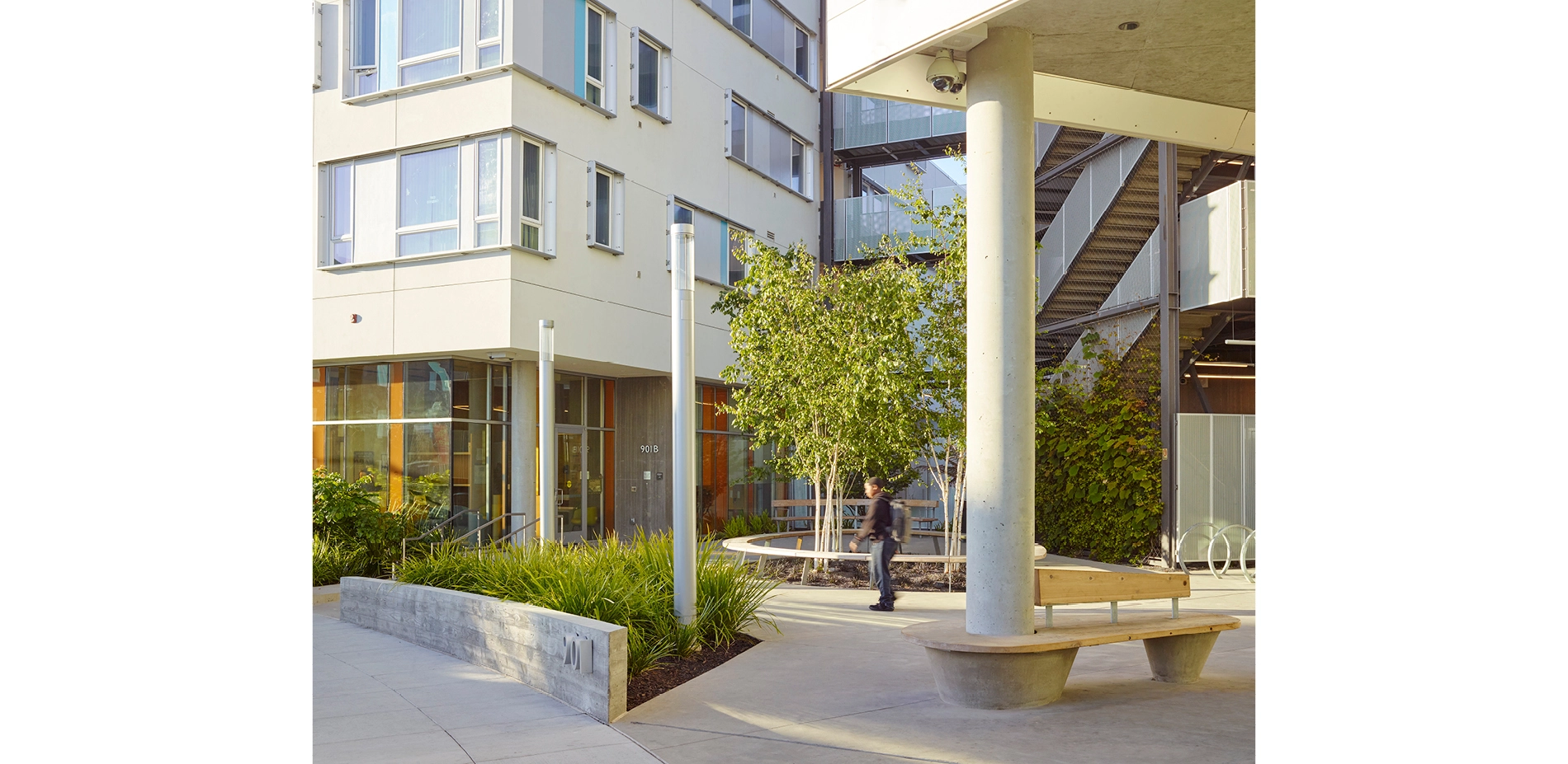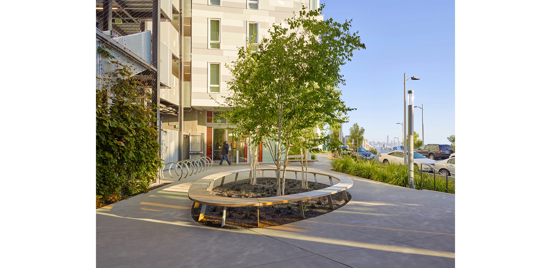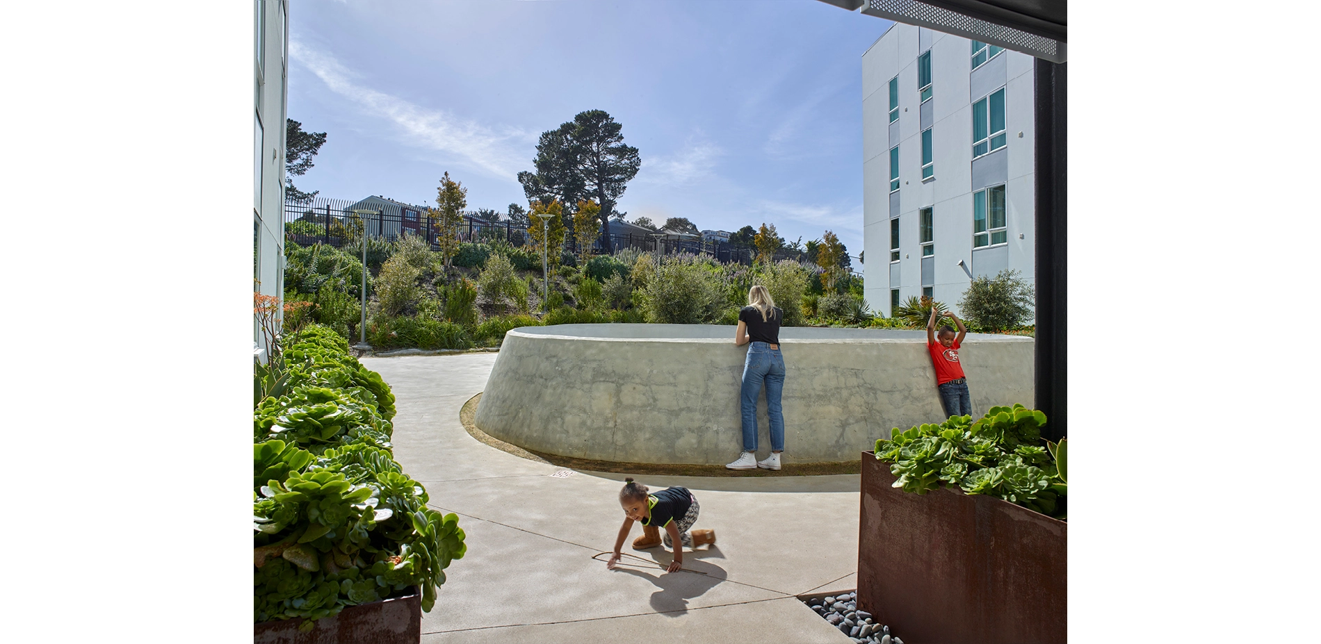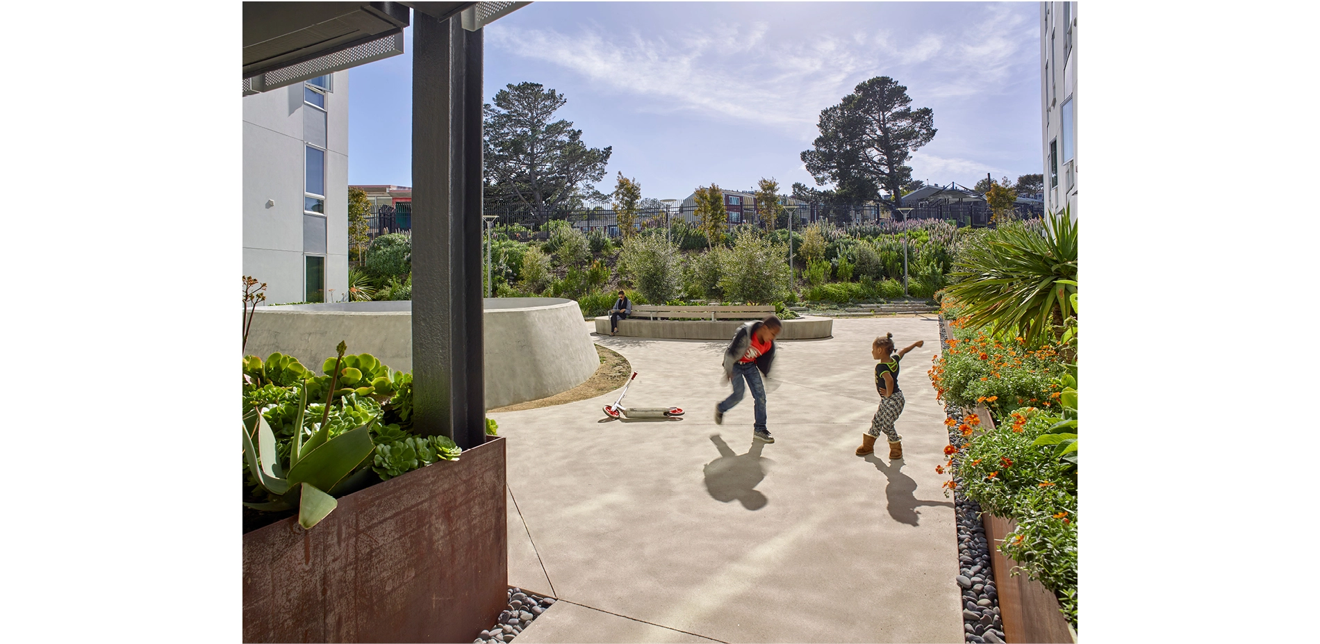 A Revitalized Neighborhood 901 Fairfax is located on a hillside above the former Hunters Point Naval Shipyard in one of San Francisco’s most rapidly changing and historically under-served neighborhoods. The development is the second of four phases at Hunters View and was funded by the HOPE SF project, a $2 billion initiative to create more than 4,600 new homes in southeast San Francisco. The design team identified innovative and creative approaches to a site with challenging topography, while meeting the client’s primary goal of achieving design efficiency to contain costs for this publicly funded project. A critical centerpiece of the rebuilt neighborhood, these two blocks contain 72 affordable homes, a community center, and childcare facility, with sweeping views of the San Francisco Bay. The design team worked with limited resources to deliver a number of amenities to the housing site, including a welcoming entry plaza, playground, community center courtyard, and podium courtyard. The design focused on creating connections to the site and community with a hillside restoration of drought tolerant planting and innovative sightline connections across multiple levels. Open pedestrian bridges connect floors of the housing and glass doors open out onto community courtyard space. Engaging the Community The design and development team undertook extensive community outreach efforts to gain the trust of the local community. Early meetings with long-time Hunters View residents focused on identifying the residents’ hopes for the project while addressing their concerns. The community was skeptical, having experienced broken promises in the past. The team identified key issues which were common to most residents, including the desire for community connection and the need for improved security. In order to address the need for connection, the design team focused on creating welcoming spaces that foster interaction with neighbors and are easily accessed by all members of the community. The plazas and courtyards are designed to be secure with all areas being visible—either from the street or from the nearby residences. Outdoor play areas were created within the housing block, in order to help create community and help residents become caretakers of their own environment. With a shared value to improve the community and quality of life for its residents, the design team saw the end users as the ultimate client. The community process also informed the programming for the community center and child development center, and their associated outdoor spaces. A Challenging Site with Many Uses The plaza outside the community center and childcare facility entrances serves as a fulcrum between the two disparate programs. The space is welcoming and inviting, where residents are encouraged to linger after they attend a community event or drop off their child at daycare. The guitar pick shaped bench, constructed of steel and local reclaimed Deodar cedar, is the sculptural center of this space and was originally envisioned as a ‘floating bench’. Several other benches with the same design language are located throughout the space, each offering a slightly different vantage and user experience. The floating bench encircles a grouping of birch trees which sway with the breeze. As you progress from the public plaza, you enter the semi-public childcare and community center courtyards. The sinuous, guitar pick shapes in the floating bench are echoed in the sand boxes and play surfacing for the nonprofit childcare facility that sits at the heart of the project. About 70 neighborhood infants, toddlers, and preschoolers receive affordable care and a safe place to play at this new facility. In order to carve outdoor spaces out of the challenging topography, the project required a 20’+ site retaining wall at the back of the site. Rather than being viewed as a constraint, the massive wall was an integral part of the program starting early in the design process. The retaining wall visually connects the adjacent childcare and community center courtyards, slicing through both spaces at an angle which slopes with the grade. In the childcare area, playful climbing holds were inserted into the wall to create a climbing surface, and children are encouraged to use the vertical surface for drawing with chalk. Sandboxes and a natural water play area provide additional amenities for the children to utilize. Planting in the childcare courtyard includes colorful and fragrant species such as Tibouchina and scented geraniums. Through valuable community input, certain amenities were identified for the community center courtyard. Residents voiced a desire for an outdoor space for barbecues and parties. The design team responded by creating a flexible community center space, where the doors to the multi-purpose room open wide and tables and chairs can be moved outdoors. A custom concrete countertop was also included in the space, so residents can locate a barbecue adjacent to the countertop and serve for a crowd of people. The large stair in the space, which leads to the courtyard on Level Two, doubles as a podium and stage for speakers or small performances. As you move to the podium courtyard, which is exclusively for residents of 901 Fairfax, the experience changes from the cool shade of sunken courtyards, to being perched within a sunny, wild hillside landscape. The landscape architects wanted users to feel they were immersed in an abundant garden when they were within this space. The planting is a mix of native species that tolerate the serpentine hillside, mixed with other drought tolerant and resilient species. Salvaged historic San Francisco granite curbs as low walls and casual seating further links this project to its site. The most striking feature of the design is a central oculus lightwell that brings sunlight down to the wellness center on the first floor. The courtyard and Oculus are also viewed from the residential 