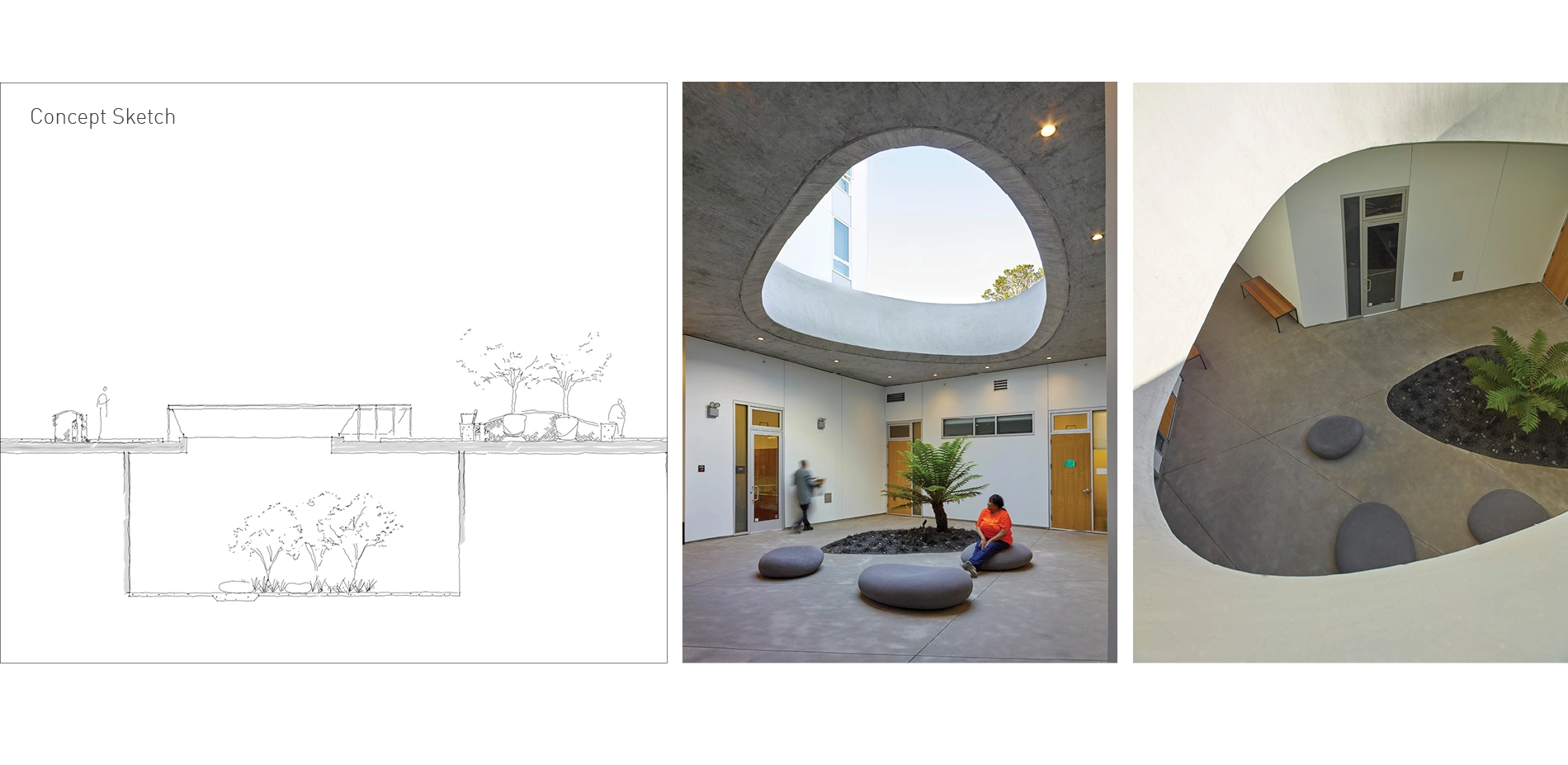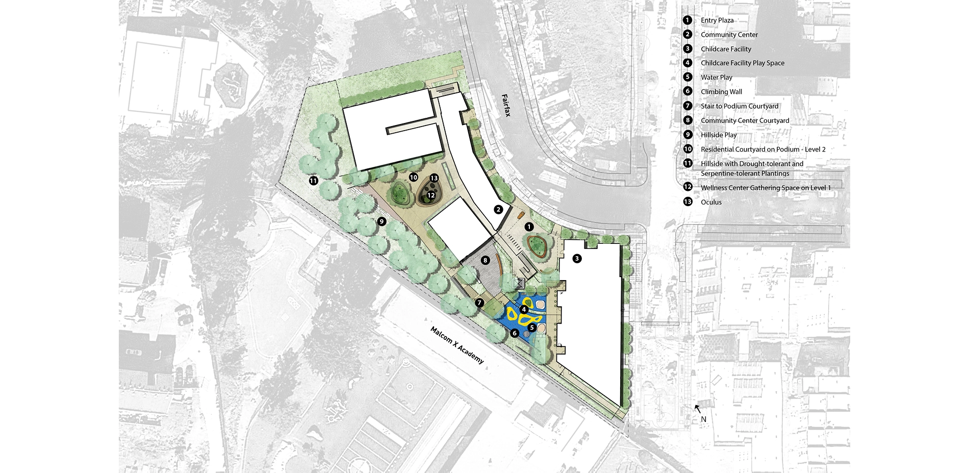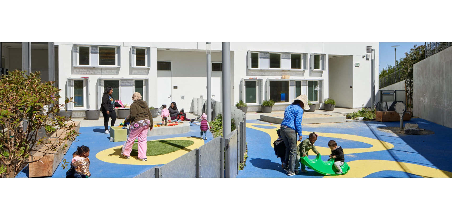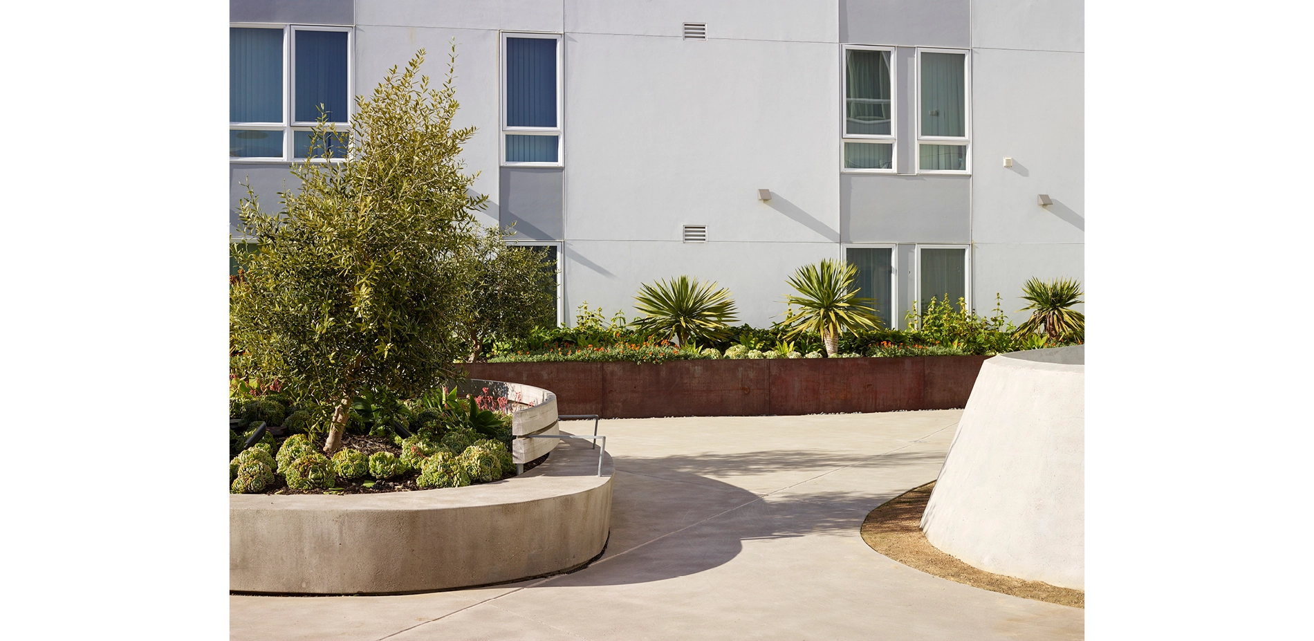 A Revitalized Neighborhood 901 Fairfax is located on a hillside above the former Hunters Point Naval Shipyard in one of San Francisco’s most rapidly changing and historically under-served neighborhoods. The development is the second of four phases at Hunters View and was funded by the HOPE SF project, a $2 billion initiative to create more than 4,600 new homes in southeast San Francisco. The design team identified innovative and creative approaches to a site with challenging topography, while meeting the client’s primary goal of achieving design efficiency to contain costs for this publicly funded project. A critical centerpiece of the rebuilt neighborhood, these two blocks contain 72 affordable homes, a community center, and childcare facility, with sweeping views of the San Francisco Bay. The design team worked with limited resources to deliver a number of amenities to the housing site, including a welcoming entry plaza, playground, community center courtyard, and podium courtyard. The design focused on creating connections to the site and community with a hillside restoration of drought tolerant planting and innovative sightline connections across multiple levels. Open pedestrian bridges connect floors of the housing and glass doors open out onto community courtyard space. Engaging the Community The design and development team undertook extensive community outreach efforts to gain the trust of the local community. Early meetings with long-time Hunters View residents focused on identifying the residents’ hopes for the project while addressing their concerns. The community was skeptical, having experienced broken promises in the past. The team identified key issues which were common to most residents, including the desire for community connection and the need for improved security. In order to address the need for connection, the design team focused on creating welcoming spaces that foster interaction with neighbors and are easily accessed by all members of the community. The plazas and courtyards are designed to be secure with all areas being visible—either from the street or from the nearby residences. Outdoor play areas were created within the housing block, in order to help create community and help residents become caretakers of their own environment. With a shared value to improve the community and quality of life for its residents, the design team saw the end users as the ultimate client. The community process also informed the programming for the community center and child development center, and their associated outdoor spaces. A Challenging Site with Many Uses The plaza outside the community center and childcare facility entrances serves as a fulcrum between the two disparate programs. The space is welcoming and inviting, where residents are encouraged to linger after they attend a community event or drop off their child at daycare. The guitar pick shaped bench, constructed of steel and local reclaimed Deodar cedar, is the sculptural center of this space and was originally envisioned as a ‘floating bench’. Several other benches with the same design language are located throughout the space, each offering a slightly different vantage and user experience. The floating bench encircles a grouping of birch trees which sway with the breeze. As you progress from the public plaza, you enter the semi-public childcare and community center courtyards. The sinuous, guitar pick shapes in the floating bench are echoed in the sand boxes and play surfacing for the nonprofit childcare facility that sits at the heart of the project. About 70 neighborhood infants, toddlers, and preschoolers receive affordable care and a safe place to play at this new facility. In order to carve outdoor spaces out of the challenging topography, the project required a 20’+ site retaining wall at the back of the site. Rather than being viewed as a constraint, the massive wall was an integral part of the program starting early in the design process. The retaining wall visually connects the adjacent childcare and community center courtyards, slicing through both spaces at an angle which slopes with the grade. In the childcare area, playful climbing holds were inserted into the wall to create a climbing surface, and children are encouraged to use the vertical surface for drawing with chalk. Sandboxes and a natural water play area provide additional amenities for the children to utilize. Planting in the childcare courtyard includes colorful and fragrant species such as Tibouchina and scented geraniums. Through valuable community input, certain amenities were identified for the community center courtyard. Residents voiced a desire for an outdoor space for barbecues and parties. The design team responded by creating a flexible community center space, where the doors to the multi-purpose room open wide and tables and chairs can be moved outdoors. A custom concrete countertop was also included in the space, so residents can locate a barbecue adjacent to the countertop and serve for a crowd of people. The large stair in the space, which leads to the courtyard on Level Two, doubles as a podium and stage for speakers or small performances. As you move to the podium courtyard, which is exclusively for residents of 901 Fairfax, the experience changes from the cool shade of sunken courtyards, to being perched within a sunny, wild hillside landscape. The landscape architects wanted users to feel they were immersed in an abundant garden when they were within this space. The planting is a mix of native species that tolerate the serpentine hillside, mixed with other drought tolerant and resilient species. Salvaged historic San Francisco granite curbs as low walls and casual seating further links this project to its site. The most striking feature of the design is a central oculus lightwell that brings sunlight down to the wellness center on the first floor. The courtyard and Oculus are also viewed from the residential 