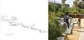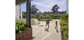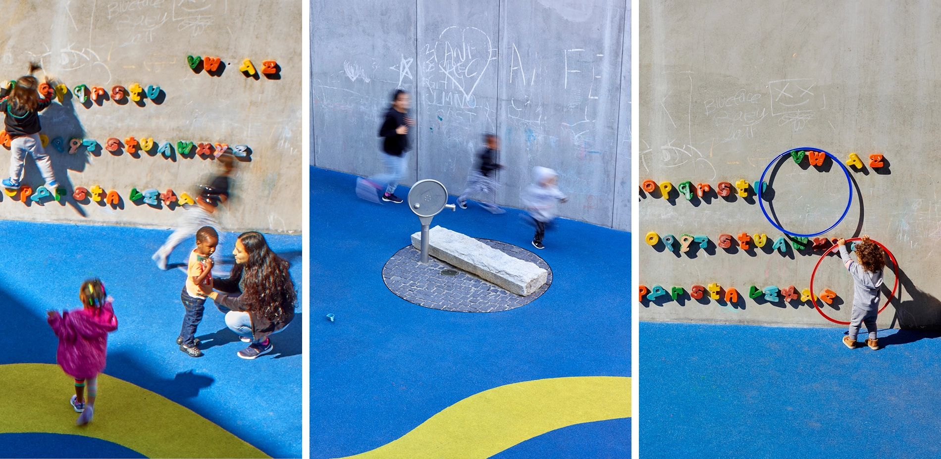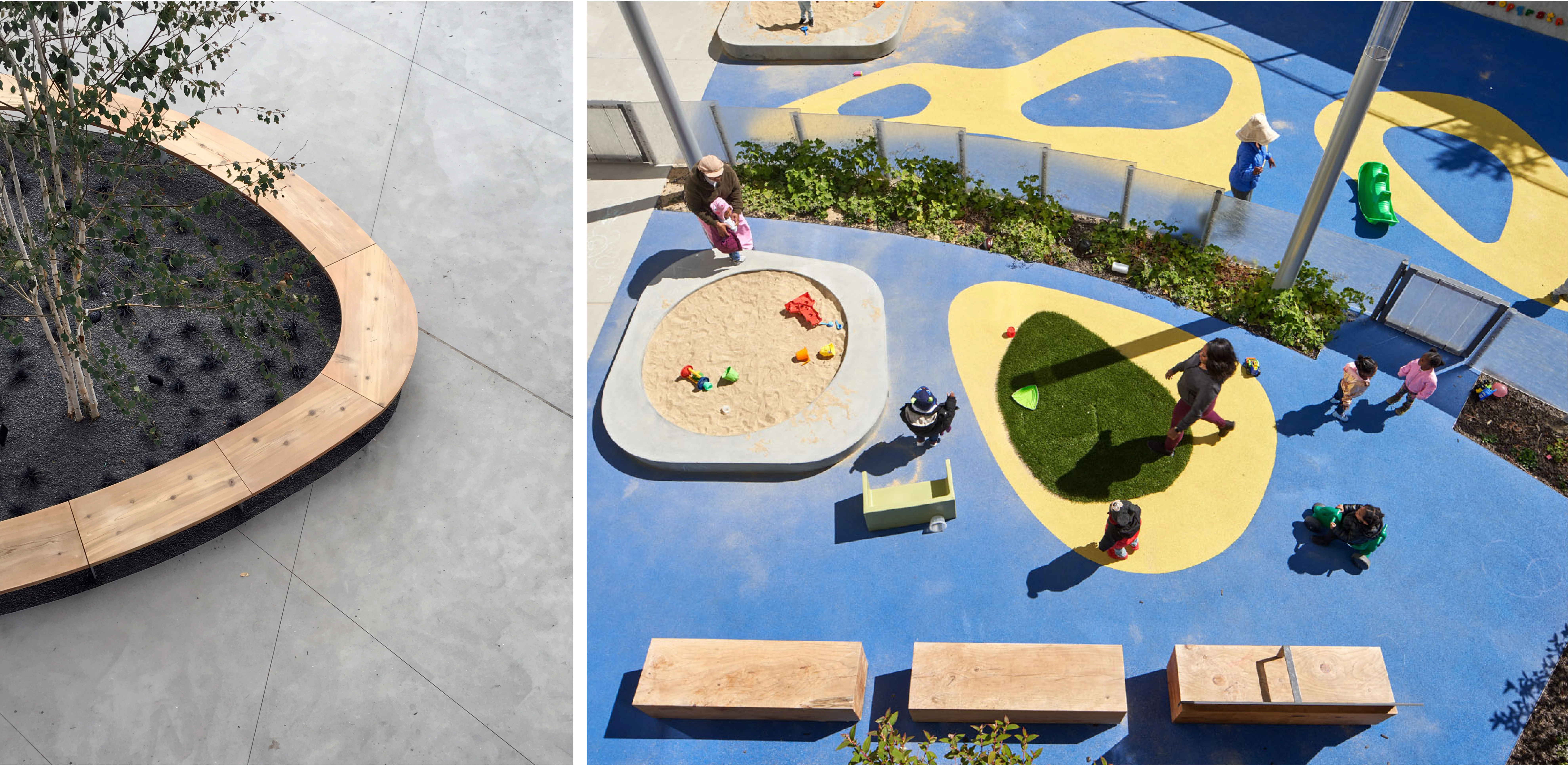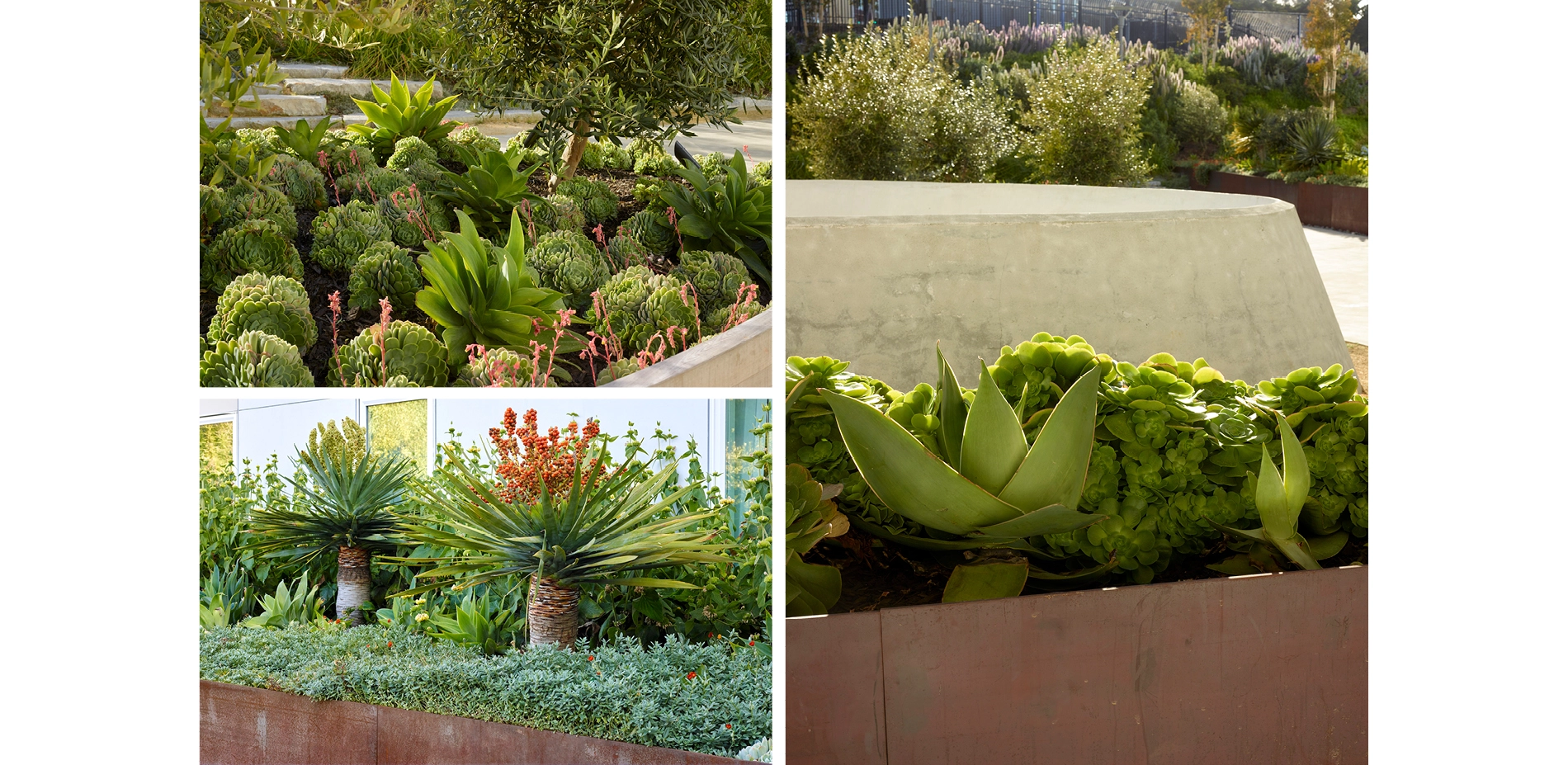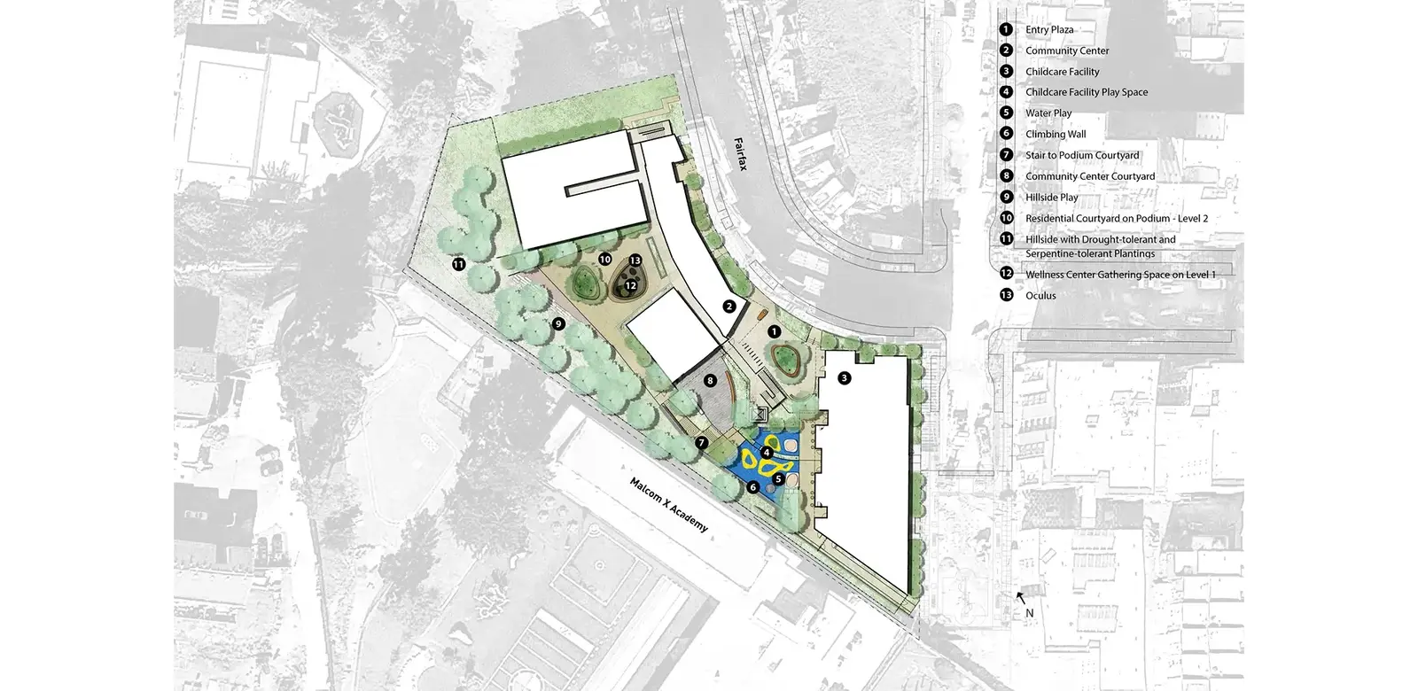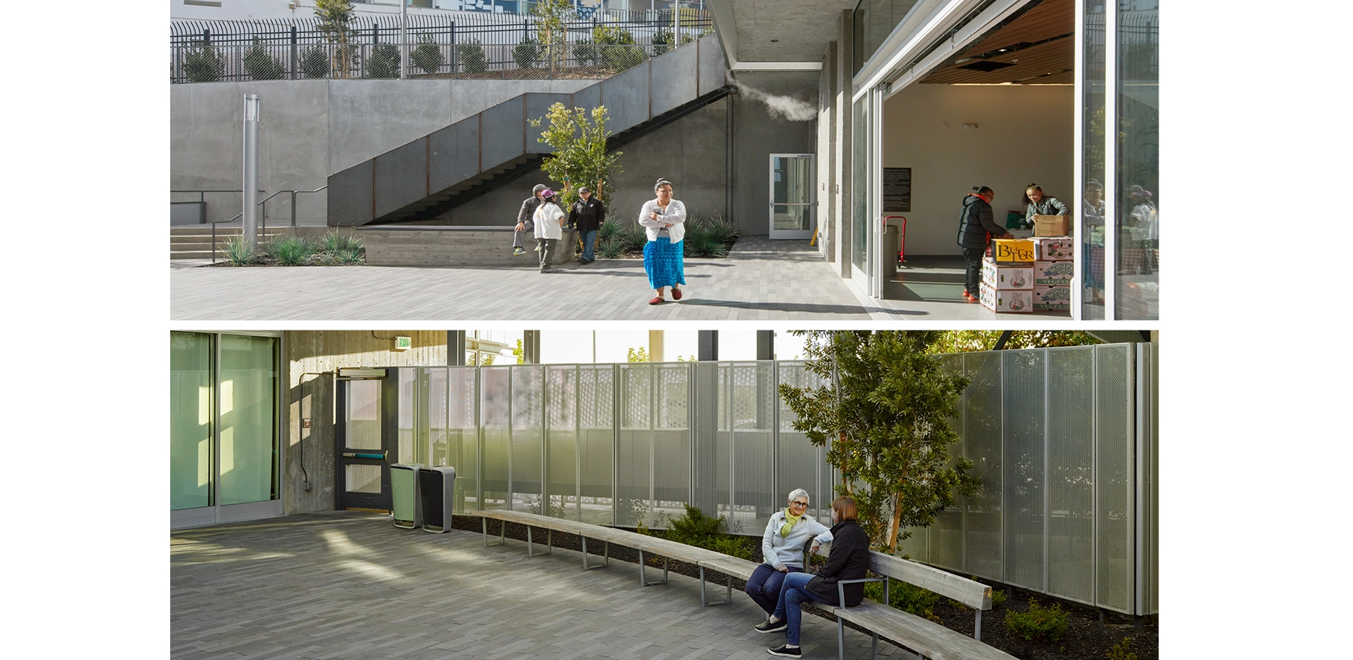 A Revitalized Neighborhood 901 Fairfax is located on a hillside above the former Hunters Point Naval Shipyard in one of San Francisco’s most rapidly changing and historically under-served neighborhoods. The development is the second of four phases at Hunters View and was funded by the HOPE SF project, a $2 billion initiative to create more than 4,600 new homes in southeast San Francisco. The design team identified innovative and creative approaches to a site with challenging topography, while meeting the client’s primary goal of achieving design efficiency to contain costs for this publicly funded project. A critical centerpiece of the rebuilt neighborhood, these two blocks contain 72 affordable homes, a community center, and childcare facility, with sweeping views of the San Francisco Bay. The design team worked with limited resources to deliver a number of amenities to the housing site, including a welcoming entry plaza, playground, community center courtyard, and podium courtyard. The design focused on creating connections to the site and community with a hillside restoration of drought tolerant planting and innovative sightline connections across multiple levels. Open pedestrian bridges connect floors of the housing and glass doors open out onto community courtyard space. Engaging the Community The design and development team undertook extensive community outreach efforts to gain the trust of the local community. Early meetings with long-time Hunters View residents focused on identifying the residents’ hopes for the project while addressing their concerns. The community was skeptical, having experienced broken promises in the past. The team identified key issues which were common to most residents, including the desire for community connection and the need for improved security. In order to address the need for connection, the design team focused on creating welcoming spaces that foster interaction with neighbors and are easily accessed by all members of the community. The plazas and courtyards are designed to be secure with all areas being visible—either from the street or from the nearby residences. Outdoor play areas were created within the housing block, in order to help create community and help residents become caretakers of their own environment. With a shared value to improve the community and quality of life for its residents, the design team saw the end users as the ultimate client. The community process also informed the programming for the community center and child development center, and their associated outdoor spaces. A Challenging Site with Many Uses The plaza outside the community center and childcare facility entrances serves as a fulcrum between the two disparate programs. The space is welcoming and inviting, where residents are encouraged to linger after they attend a community event or drop off their child at daycare. The guitar pick shaped bench, constructed of steel and local reclaimed Deodar cedar, is the sculptural center of this space and was originally envisioned as a ‘floating bench’. Several other benches with the same design language are located throughout the space, each offering a slightly different vantage and user experience. The floating bench encircles a grouping of birch trees which sway with the breeze. As you progress from the public plaza, you enter the semi-public childcare and community center courtyards. The sinuous, guitar pick shapes in the floating bench are echoed in the sand boxes and play surfacing for the nonprofit childcare facility that sits at the heart of the project. About 70 neighborhood infants, toddlers, and preschoolers receive affordable care and a safe place to play at this new facility. In order to carve outdoor spaces out of the challenging topography, the project required a 20’+ site retaining wall at the back of the site. Rather than being viewed as a constraint, the massive wall was an integral part of the program starting early in the design process. The retaining wall visually connects the adjacent childcare and community center courtyards, slicing through both spaces at an angle which slopes with the grade. In the childcare area, playful climbing holds were inserted into the wall to create a climbing surface, and children are encouraged to use the vertical surface for drawing with chalk. Sandboxes and a natural water play area provide additional amenities for the children to utilize. Planting in the childcare courtyard includes colorful and fragrant species such as Tibouchina and scented geraniums. Through valuable community input, certain amenities were identified for the community center courtyard. Residents voiced a desire for an outdoor space for barbecues and parties. The design team responded by creating a flexible community center space, where the doors to the multi-purpose room open wide and tables and chairs can be moved outdoors. A custom concrete countertop was also included in the space, so residents can locate a barbecue adjacent to the countertop and serve for a crowd of people. The large stair in the space, which leads to the courtyard on Level Two, doubles as a podium and stage for speakers or small performances. As you move to the podium courtyard, which is exclusively for residents of 901 Fairfax, the experience changes from the cool shade of sunken courtyards, to being perched within a sunny, wild hillside landscape. The landscape architects wanted users to feel they were immersed in an abundant garden when they were within this space. The planting is a mix of native species that tolerate the serpentine hillside, mixed with other drought tolerant and resilient species. Salvaged historic San Francisco granite curbs as low walls and casual seating further links this project to its site. The most striking feature of the design is a central oculus lightwell that brings sunlight down to the wellness center on the first floor. The courtyard and Oculus are also viewed from the residential 