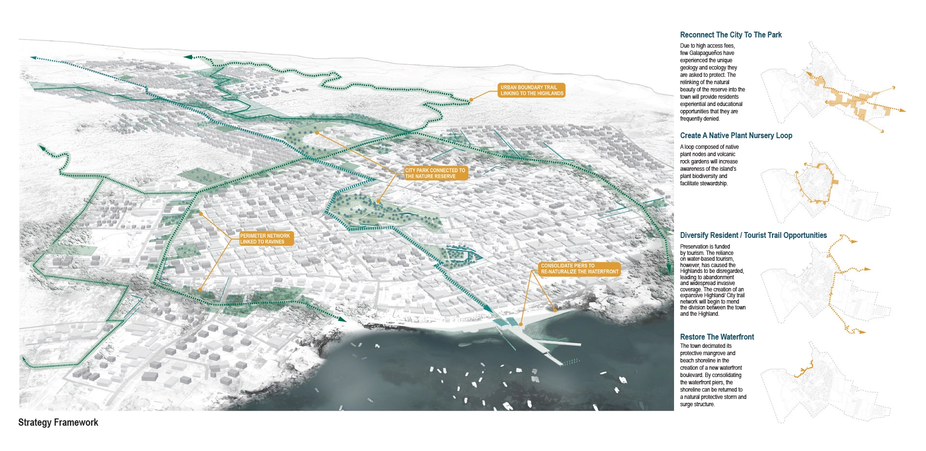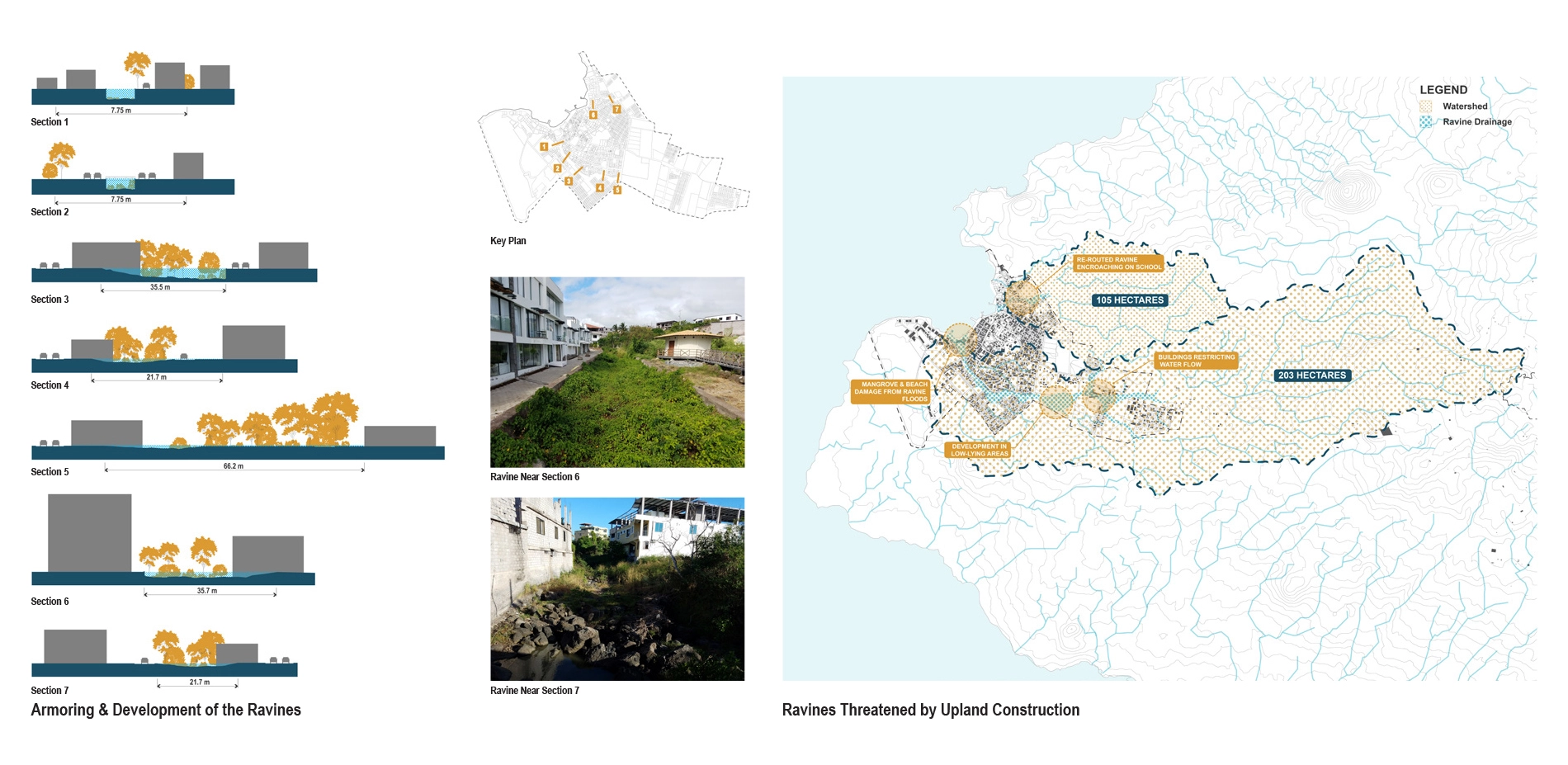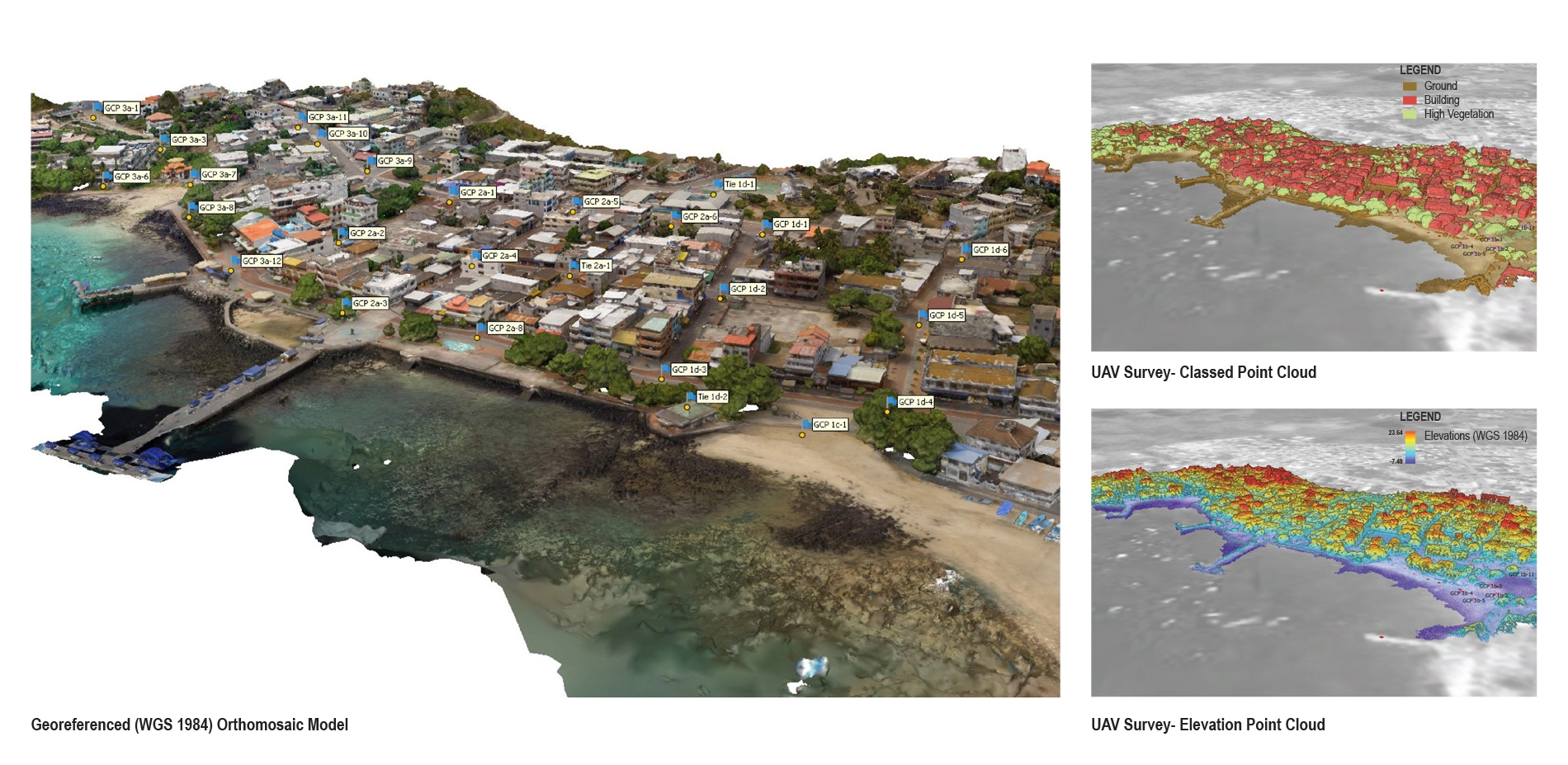 Background/ Challenges Today, there are roughly 34,000 residents living on four islands (Santa Cruz, San Cristóbal, Isabela, Floreana). Most growth has occurred in the last forty years due to the creation of a market for ecotourism as a means to “preserve” the Galápagos. This has resulted in what is referred to as the “Galápagos Paradox.” The islands are promoted as a pristine place to visit, thereby increasing the flow of goods and tourists, which introduces new species and requires an increasing population to supply labor. Conversely, tourist-generated revenue provides funding to protect and maintain the national park, and is the primary source of income and employment. Immigration to the islands (other than through marriage) was banned in 1998, while tourism has not been successfully limited even though the pressures on the local environment and people originate from developing the Galápagos as a tourism destination. As a consequence, water demand and building have increased dramatically, causing major challenges in water management, both in terms of drinking water and in terms of topography (i.e. water flow from the highlands into the lower-lying towns). As the famed site of Charles Darwin’s first landing spot and the second most populous island, San Cristóbal (where this phase of our work takes place) plays an important role in understanding how an isolated community in the middle of the ocean can sustain a good standard of living while protecting biodiversity and adapting to climate change. It is surprising that in one of the most scientifically studied and important nature sites in the world, there is little attention to the landscape itself. Project: The enormous amount of attention given to the natural environment of the Galápagos has not been extended to the urban areas. There is little to no planning and residents suffer from lack of clean water and limited access to the nature for which the islands are famous. The town continues to develop upland without consideration of the topography and ravines, which are critical for rainfall flowing from the highlands. Increased development into these zones will exacerbate town flooding and put people in harm’s way. They also have limited sewage treatment, and are discharging directly into the beach areas; leaking sewage pipes are possibly a source of drinking water contamination. Our team set out to address the risks and opportunities related to the town’s water. This process included: studying the topography for identifying major water flow areas; a topographic survey to accurately determine tide levels and thereby evaluate flooding vulnerabilities related to sea level rise/tsunamis; and testing drinking water to benchmark water quality. This projected included the participation of many key partners including residents and schools in Puerto Baquerizo Moreno, the Galapagos National Park, the Mayor’s office of San Cristóbal, the Charles Darwin Foundation, and the Oceanographic Institute of the Navy (INOCAR). Through this work, we hope to inform as many Galapagueños as possible so that they can be empowered to protect their health, and the health of the unique and fragile place that they call home. Process: Protecting (Urban Growth) The protection efforts in the National Park are not applied to areas within the urban boundary. Thus, the existing open areas of Puerto Baquerizo Moreno are disappearing quickly. Our landscape strategy concentrated primarily on the yet to be developed areas, and emphasized four principles: 1) continuing mixed development and more density upland, which follows the pattern of the oldest areas of town, rather than a “single house on a lot” model that is now prevalent; 2) the creation of multi-use community spaces within development blocks; 3) accommodating existing water flow patterns and significant vegetation patches; 4) establishing a ravine set back and envisioning it as a new connective corridor that will bring the natural beauty of the national park into the town, thus experientially and ecologically enriching the quickly densifying town. Our hope is for residents and local leaders to support a strategy for directing development away from low-lying areas and use this landscape framework as a vital social and ecological resource. Measuring (Topographic Mapping) Accurate surveys are foundational to the analysis, planning, and management of landscapes. As a discipline, we have normally outsourced this crucial component of the planning process by hiring surveyors or relying on existing surveys, topographic maps, or publicly available satellite imagery. While Earth observation data has increased dramatically in the last few decades, this information is not equally distributed. Surprisingly, the Galápagos Islands—one of the most scientifically studied sites in the world—lacks such data. Without a consistent and unified vertical datum, tides cannot be accurately referenced to the land. When we reached out to INOCAR (The Oceanographic Institute of the Navy in Ecuador, similar to the USA’s NOAA) to request this information for developing the urban growth framework described above, they instead asked for our assistance in the collection and registration of the gauge. Our team used off-the-shelf UAVs (drones) and GPS/ GNSS site survey equipment to record aerial survey information of Puerto Baquerizo Moreno’s shoreline and ravines. Over the course of a four-day collection period, our team collected approximately 20 hectares of high accuracy, high resolution survey data, including the tide gauge location and elevation. Ground control points (GCP) were distributed throughout the town before the collection periods. Each GCP was recorded with the GPS/ GNSS survey equipment to locate its exact location in geographic coordinates at centimeter-level accuracy. The array of overlapping digital aerial imagery collected was stitched together using photogrammetry software (Agisoft Metashape) an