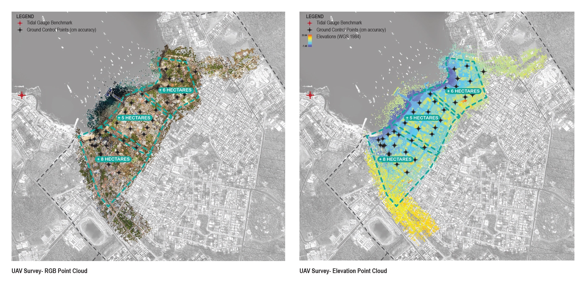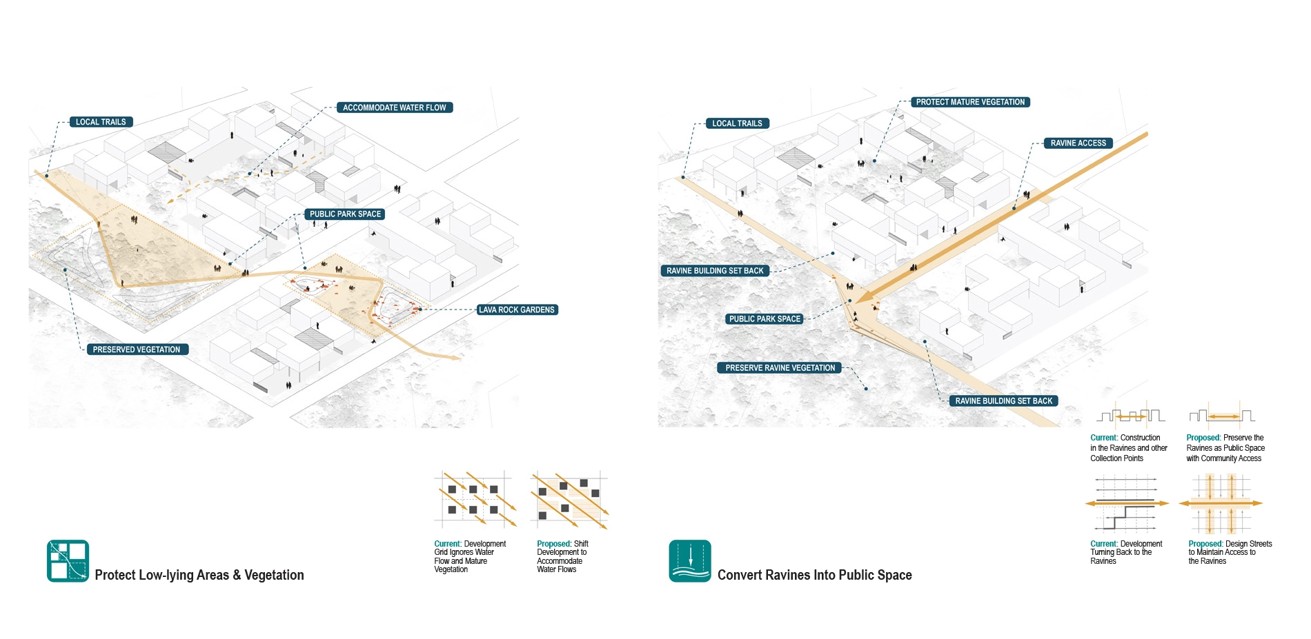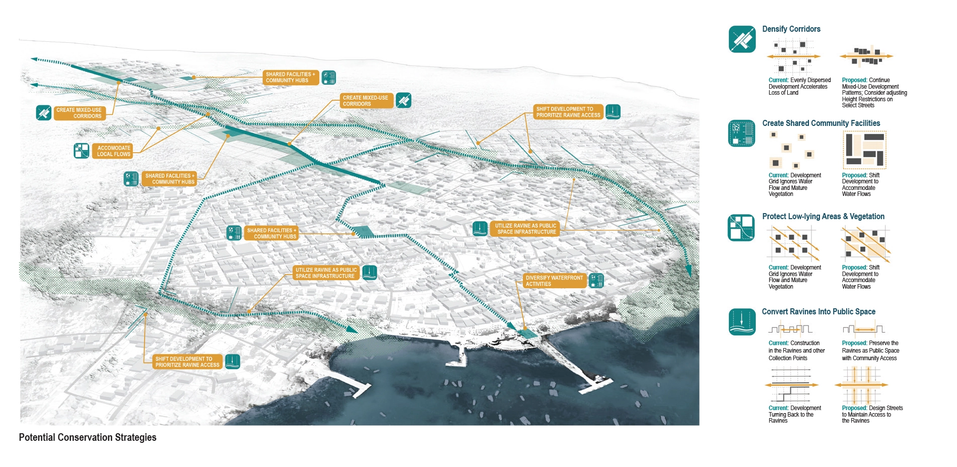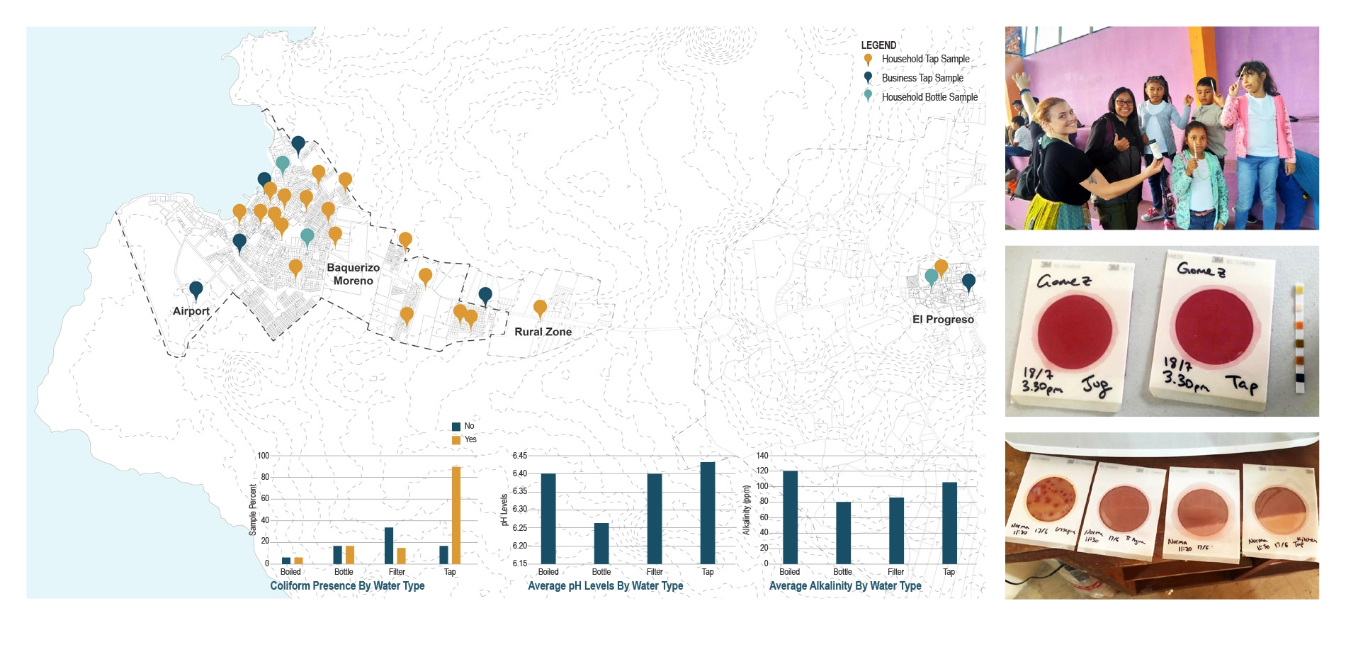 Background/ Challenges Today, there are roughly 34,000 residents living on four islands (Santa Cruz, San Cristóbal, Isabela, Floreana). Most growth has occurred in the last forty years due to the creation of a market for ecotourism as a means to “preserve” the Galápagos. This has resulted in what is referred to as the “Galápagos Paradox.” The islands are promoted as a pristine place to visit, thereby increasing the flow of goods and tourists, which introduces new species and requires an increasing population to supply labor. Conversely, tourist-generated revenue provides funding to protect and maintain the national park, and is the primary source of income and employment. Immigration to the islands (other than through marriage) was banned in 1998, while tourism has not been successfully limited even though the pressures on the local environment and people originate from developing the Galápagos as a tourism destination. As a consequence, water demand and building have increased dramatically, causing major challenges in water management, both in terms of drinking water and in terms of topography (i.e. water flow from the highlands into the lower-lying towns). As the famed site of Charles Darwin’s first landing spot and the second most populous island, San Cristóbal (where this phase of our work takes place) plays an important role in understanding how an isolated community in the middle of the ocean can sustain a good standard of living while protecting biodiversity and adapting to climate change. It is surprising that in one of the most scientifically studied and important nature sites in the world, there is little attention to the landscape itself. Project: The enormous amount of attention given to the natural environment of the Galápagos has not been extended to the urban areas. There is little to no planning and residents suffer from lack of clean water and limited access to the nature for which the islands are famous. The town continues to develop upland without consideration of the topography and ravines, which are critical for rainfall flowing from the highlands. Increased development into these zones will exacerbate town flooding and put people in harm’s way. They also have limited sewage treatment, and are discharging directly into the beach areas; leaking sewage pipes are possibly a source of drinking water contamination. Our team set out to address the risks and opportunities related to the town’s water. This process included: studying the topography for identifying major water flow areas; a topographic survey to accurately determine tide levels and thereby evaluate flooding vulnerabilities related to sea level rise/tsunamis; and testing drinking water to benchmark water quality. This projected included the participation of many key partners including residents and schools in Puerto Baquerizo Moreno, the Galapagos National Park, the Mayor’s office of San Cristóbal, the Charles Darwin Foundation, and the Oceanographic Institute of the Navy (INOCAR). Through this work, we hope to inform as many Galapagueños as possible so that they can be empowered to protect their health, and the health of the unique and fragile place that they call home. Process: Protecting (Urban Growth) The protection efforts in the National Park are not applied to areas within the urban boundary. Thus, the existing open areas of Puerto Baquerizo Moreno are disappearing quickly. Our landscape strategy concentrated primarily on the yet to be developed areas, and emphasized four principles: 1) continuing mixed development and more density upland, which follows the pattern of the oldest areas of town, rather than a “single house on a lot” model that is now prevalent; 2) the creation of multi-use community spaces within development blocks; 3) accommodating existing water flow patterns and significant vegetation patches; 4) establishing a ravine set back and envisioning it as a new connective corridor that will bring the natural beauty of the national park into the town, thus experientially and ecologically enriching the quickly densifying town. Our hope is for residents and local leaders to support a strategy for directing development away from low-lying areas and use this landscape framework as a vital social and ecological resource. Measuring (Topographic Mapping) Accurate surveys are foundational to the analysis, planning, and management of landscapes. As a discipline, we have normally outsourced this crucial component of the planning process by hiring surveyors or relying on existing surveys, topographic maps, or publicly available satellite imagery. While Earth observation data has increased dramatically in the last few decades, this information is not equally distributed. Surprisingly, the Galápagos Islands—one of the most scientifically studied sites in the world—lacks such data. Without a consistent and unified vertical datum, tides cannot be accurately referenced to the land. When we reached out to INOCAR (The Oceanographic Institute of the Navy in Ecuador, similar to the USA’s NOAA) to request this information for developing the urban growth framework described above, they instead asked for our assistance in the collection and registration of the gauge. Our team used off-the-shelf UAVs (drones) and GPS/ GNSS site survey equipment to record aerial survey information of Puerto Baquerizo Moreno’s shoreline and ravines. Over the course of a four-day collection period, our team collected approximately 20 hectares of high accuracy, high resolution survey data, including the tide gauge location and elevation. Ground control points (GCP) were distributed throughout the town before the collection periods. Each GCP was recorded with the GPS/ GNSS survey equipment to locate its exact location in geographic coordinates at centimeter-level accuracy. The array of overlapping digital aerial imagery collected was stitched together using photogrammetry software (Agisoft Metashape) an