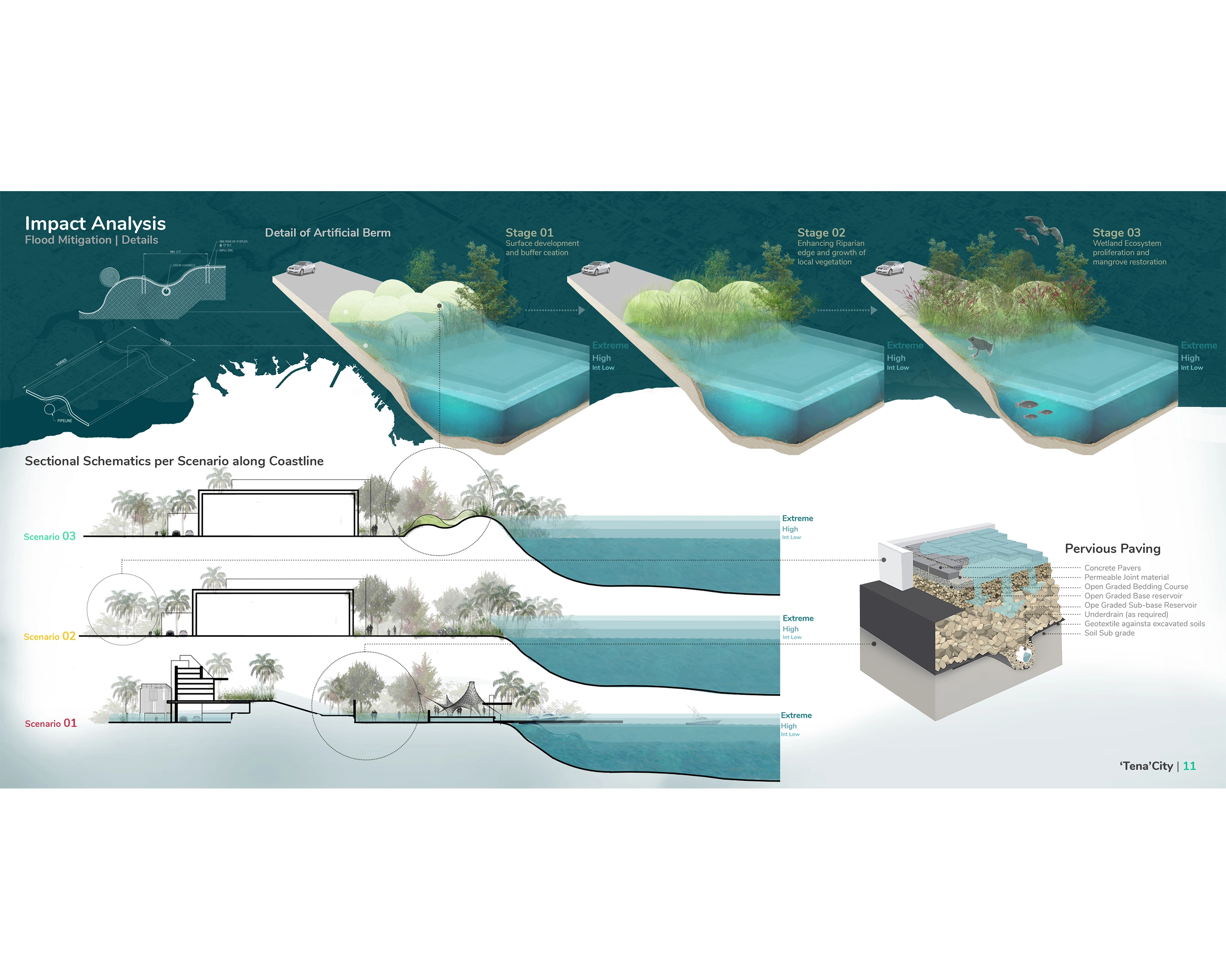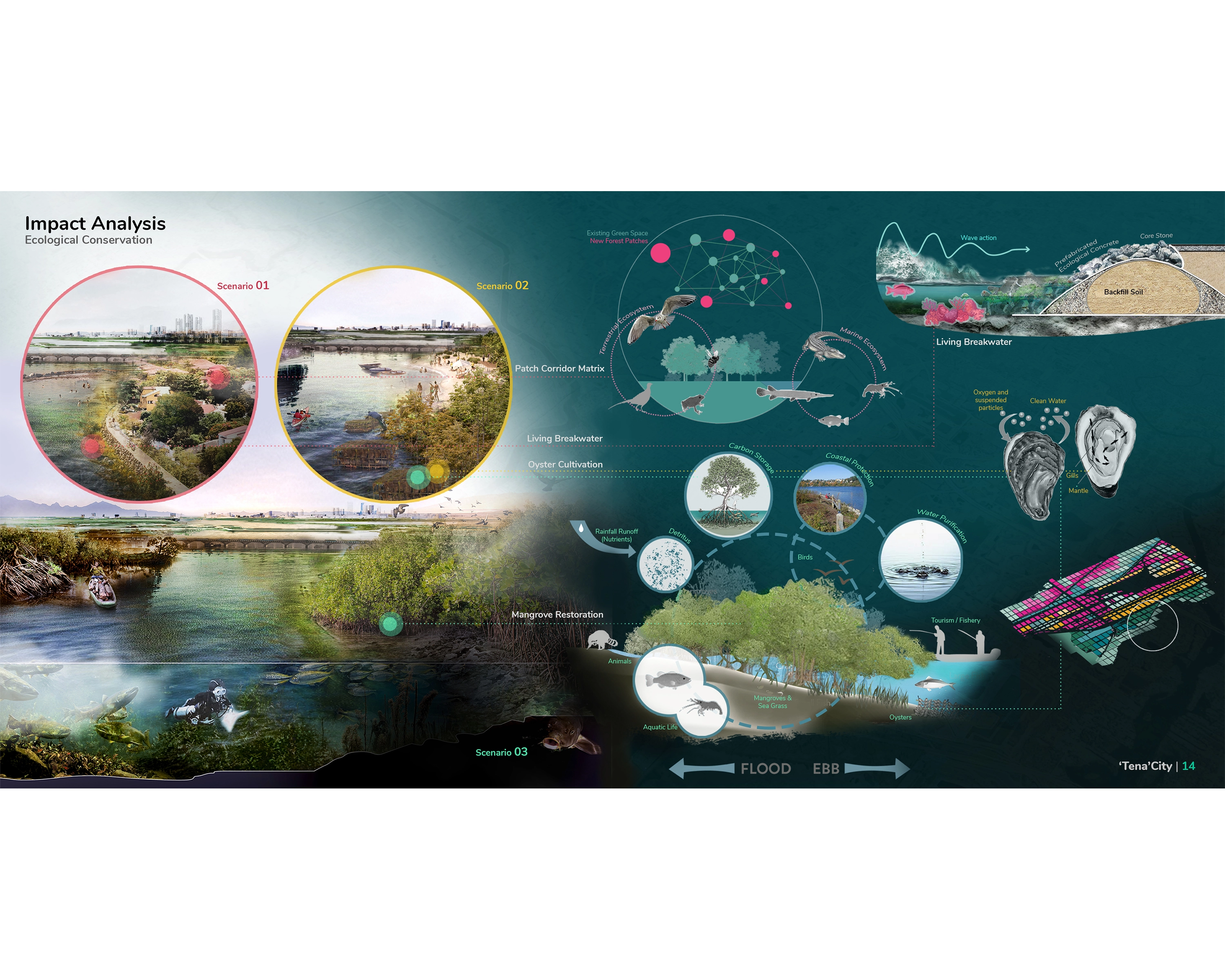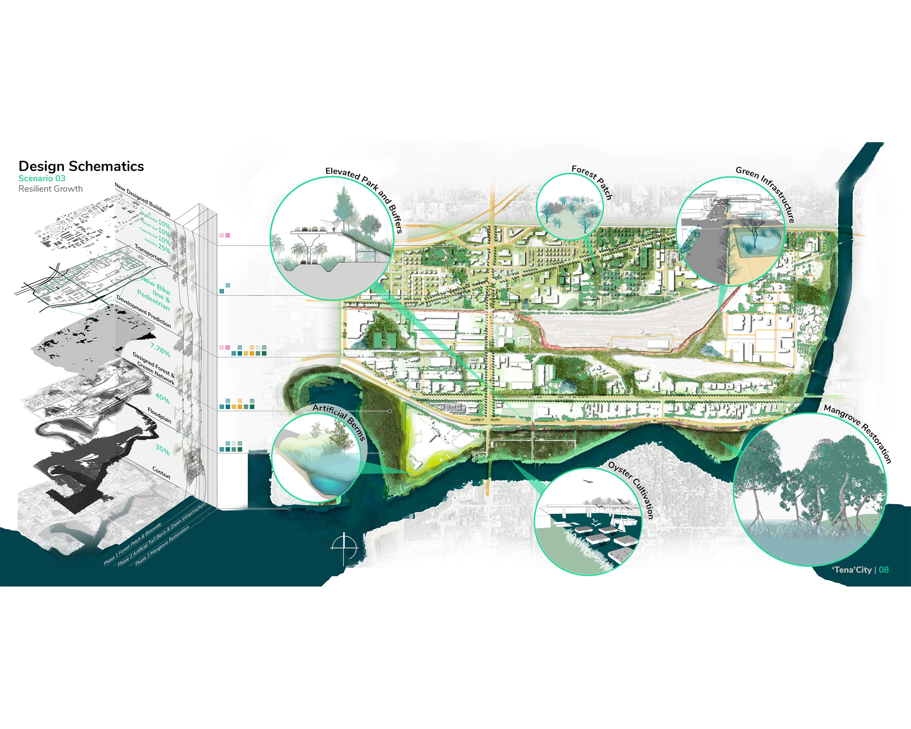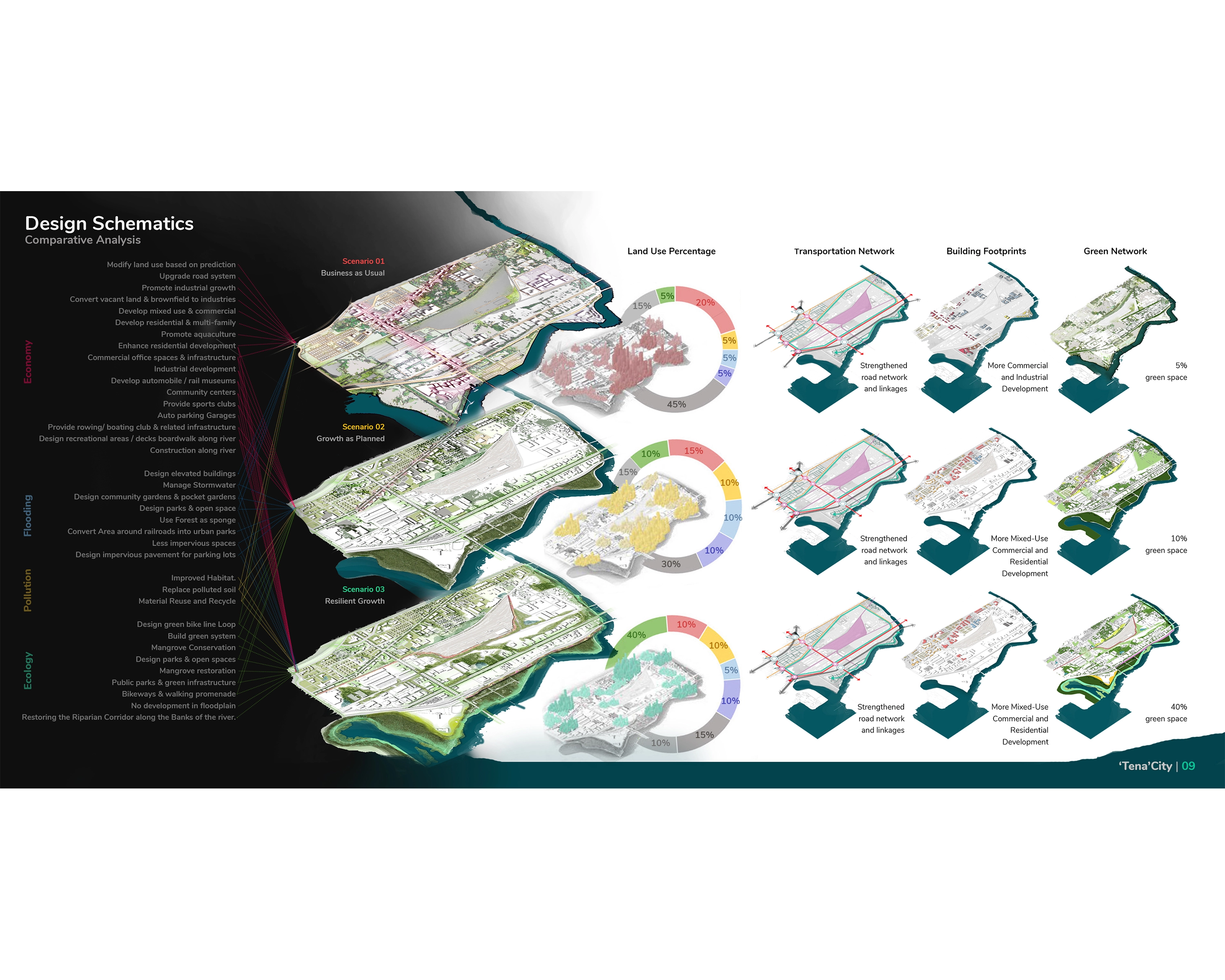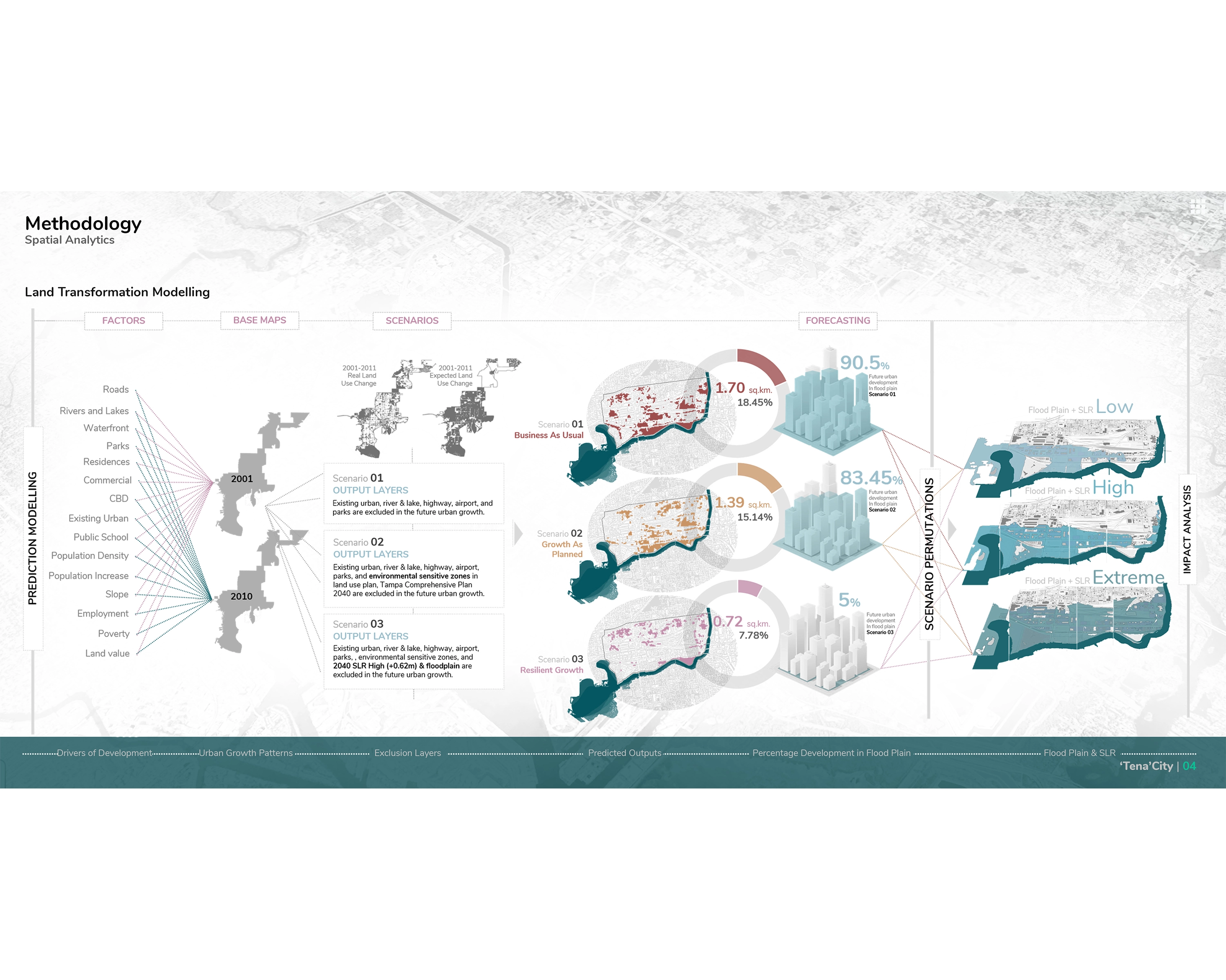 Introduction Tampa, FL is ranked in the top five in the most vulnerable U.S. cities to flooding and is expected to grow by over 100,000 people by 2040. Sea level rise also makes coastal populations more susceptible to flood risks. When open space land uses are converted to urban land uses, flood risk can increase. The capability to accurately predict both future flood plain changes and future urban growth allows for the capacity to better protect coastal communities from the effects of future climate change and helps support flood risk mitigation. With Tenacity, we integrate sea level rise and urban growth prediction modelling in design scenarios to produce sustainable design solutions to be implemented in urban design master plans for a heavily industrialized and marginalized neighborhood. Goals and Objectives The objective of this project was to understand how effective the current comprehensive plan is in adapting urban growth to decreasing flood risk and pollutant load and offer comparisons and solutions to offset any of its shortcomings. To do this, we propose a combination of new development and regeneration strategies and run resilience analytics and landscape performance models to analyze the impacts of each development scenario. Tenacity both develops and operates measures to evaluate the performance of the built environment, using baseline data to compare new urban growth schemes against to determine design benefits. Problem Statement The site is in the south eastern part of Tampa, along the Palm river, where it meets the McKay Bay which feeds into Tampa Bay. It is both heavily affected by flooding and characterized by industrial land uses, brown fields, and toxic release sites, resulting in severe pollution and related effects from runoff containing industrial by-products. This creates a direct impact on the aquatic life, local biodiversity, and indirectly affects human health due to polluted groundwater and air. The existing growth patterns are negligent towards these environmental problems and the site is in need of a design which properly applies both and structural and nonstructural mechanisms to build a resilient neighborhood. Tenacity builds on to these needs, using advanced spatial forecasting models and innovative design solutions based on growth predictions and design scenarios. Methodology Tenacity uses a series of tools on multi-scalar spatial datasets to increase resiliency. The Land Transformation Model (LTM) is a GIS-based neural network, used to predict land uses, examining relationships between spatial driving factors and land use changes. The LTM uses machine learning to calculate complex patterns through an artificial neural network. In this project, it is used to predict potential future urban growth of Tampa according to three different scenarios: 1) Business as usual – predicted urban growth based on current growth patterns; 2) Growth as planned – predicted urban growth based on the current land use plan; and 3) Resilient growth – predicted urban growth based on all future development occurring outside of the floodplain. Enhancing resilience in areas vulnerable to flooding is most effective with participation from the local community. The engagement process used to develop the master plan scenarios relied on feedback loops that support resilient design and planning. Research and design on these issues in this neighborhood were undertaken using a participatory approach in cooperation with local senior planners, public health researchers, machine learning flood modeling experts, and community contaminant sampling specialists. Prediction Modelling Urban flood exposure is calculated by overlapping existing urban and projected future urban scenarios with the delineated future flood risk zones. Following the previous land change ratio, there was a change of 8,917 pixels between 2001 and 2011, projecting a population increase of 32,600 people. The future urban growth scenarios project a change of 48,395 pixels corresponding to a 176,928 population change between 2001 and 2040. The predicted development pixel amounts are the same for all scenarios, but the locations of the pixels are different based on different exclusionary layers in each scenario. Business as usual (scenario 1) excludes existing urban, rivers and lakes, highways, airports, and parks from future development areas; Growth as Planned (scenario 2) also excludes environmentally sensitive areas from the future land use (according to the comprehensive plan’s policy); and Resilient Growth (scenario 3) also excludes development within future flood risk zones (2040 SLR High and 100-year floodplain). Design Schematics and Master Plan Outcomes The designs used the relative locations and amounts of the LTM prediction outputs to inform development locations and land use arrangement. The transportation hierarchy remained the same across all design sites but densities and land use arrangements altered since the location of new development was restricted in certain areas in the growth as planned and resilient growth scenarios. Within the site, nearly 90% of the new growth in scenario 1 would be in the floodplain, 83% in scenario 2 and only 5% in scenario 03. Each master plan outcome builds on a framework of design strategies categorized under four major categories of promoting economy, reducing pollutant transfer, flood mitigation and conserving ecology. Design Impact and Benefit The performance model outputs, based on the L-THIA performance spreadsheet, for the current conditions suggest that the business as usual scenario increases impervious surfaces, decreases green infrastructure area, increases area within high flood risk, and increases public exposure to contaminants/pollutants in surface runoff, compared to the other two scenarios. While growth as planned reduced pollutants compared to business as usual, both scenarios increase pollutant load in runoff compared to the current land use arrangement