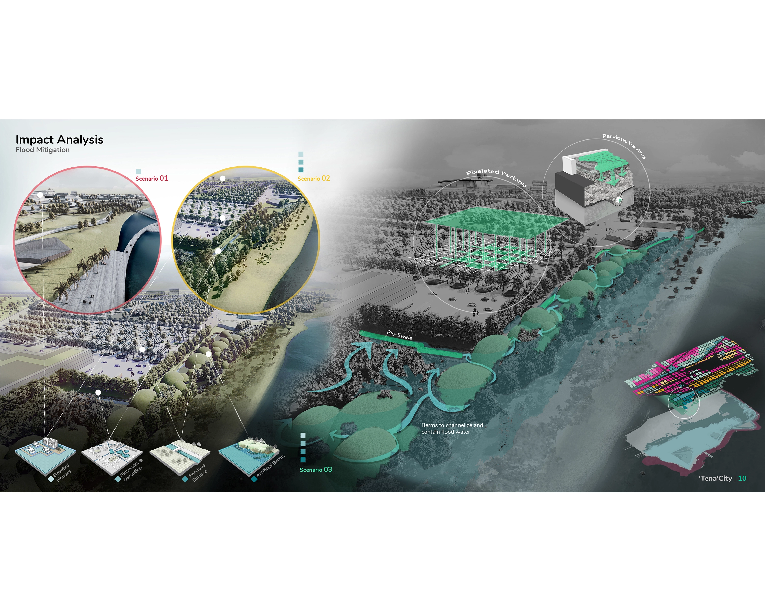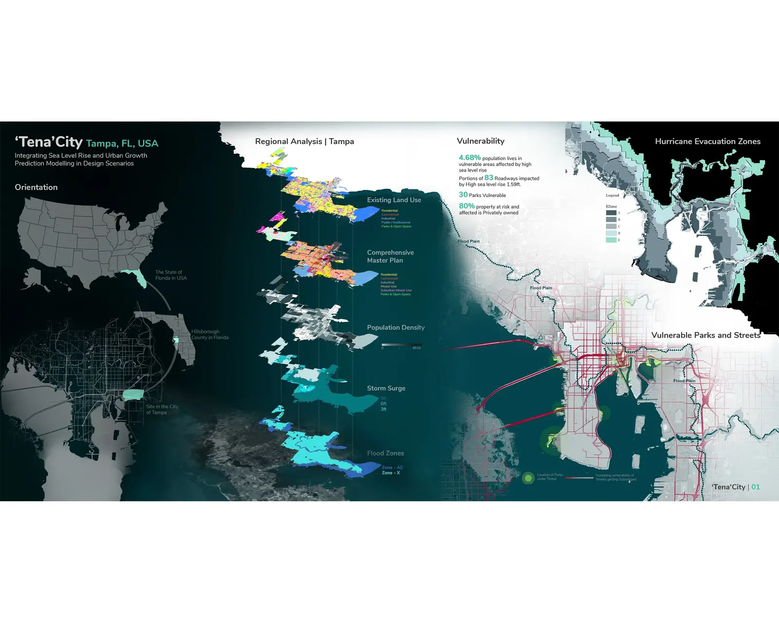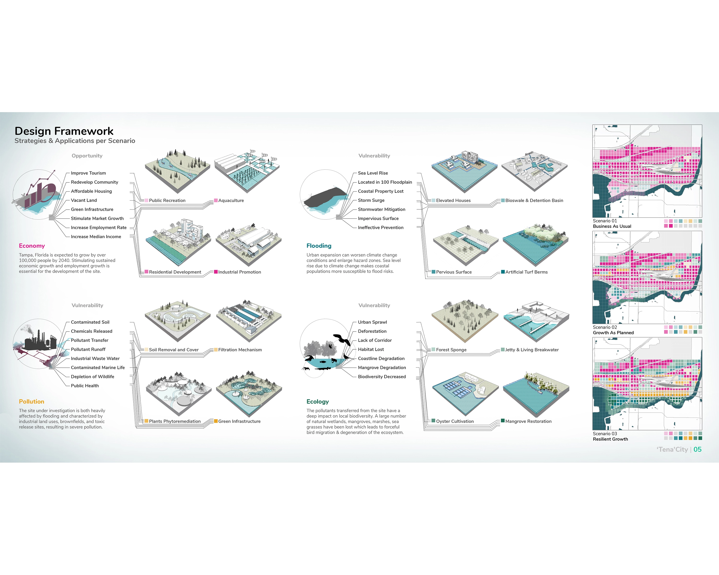 Urban expansion can worsen climate change conditions and enlarge hazard zones. Sea level rise due to climate change makes coastal populations more susceptible to flood risks. The use of land change prediction modelling to inform scenario-based planning has been helpful to increase capabilities when dealing with uncertainties in urbanization such as urban growth and flood risk, when compared to singular comprehensive plans. “Tenacity” uses the Land Transformation model to predict three different urban growth scenarios for Tampa, FL to determine how effective the current comprehensive plan is in adapting urban growth to decreasing flood risk and pollutant load. To achieve this, the project develops master plans according to each scenario and assesses their probable impact using the Long-Term Hydrologic Impact Analysis Low Impact Development Spreadsheet as a performance model. Findings of an in-depth analysis show that the current future land use plan for Tampa, while it appears to be better than current patterns of development, has higher flood exposure, storm-water run-off, and pollutant discharge than current conditions and should follow more resilient approaches to growth.