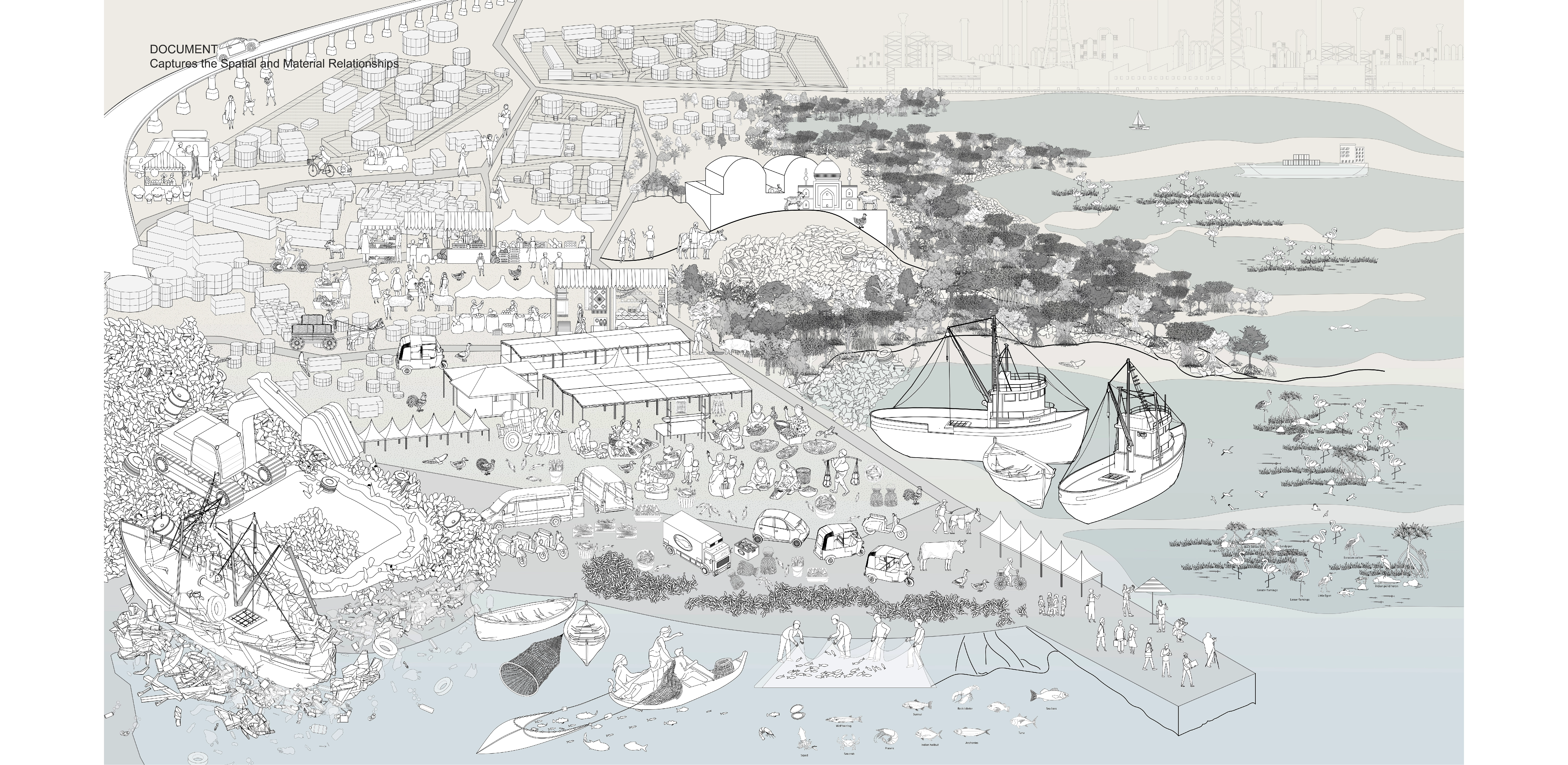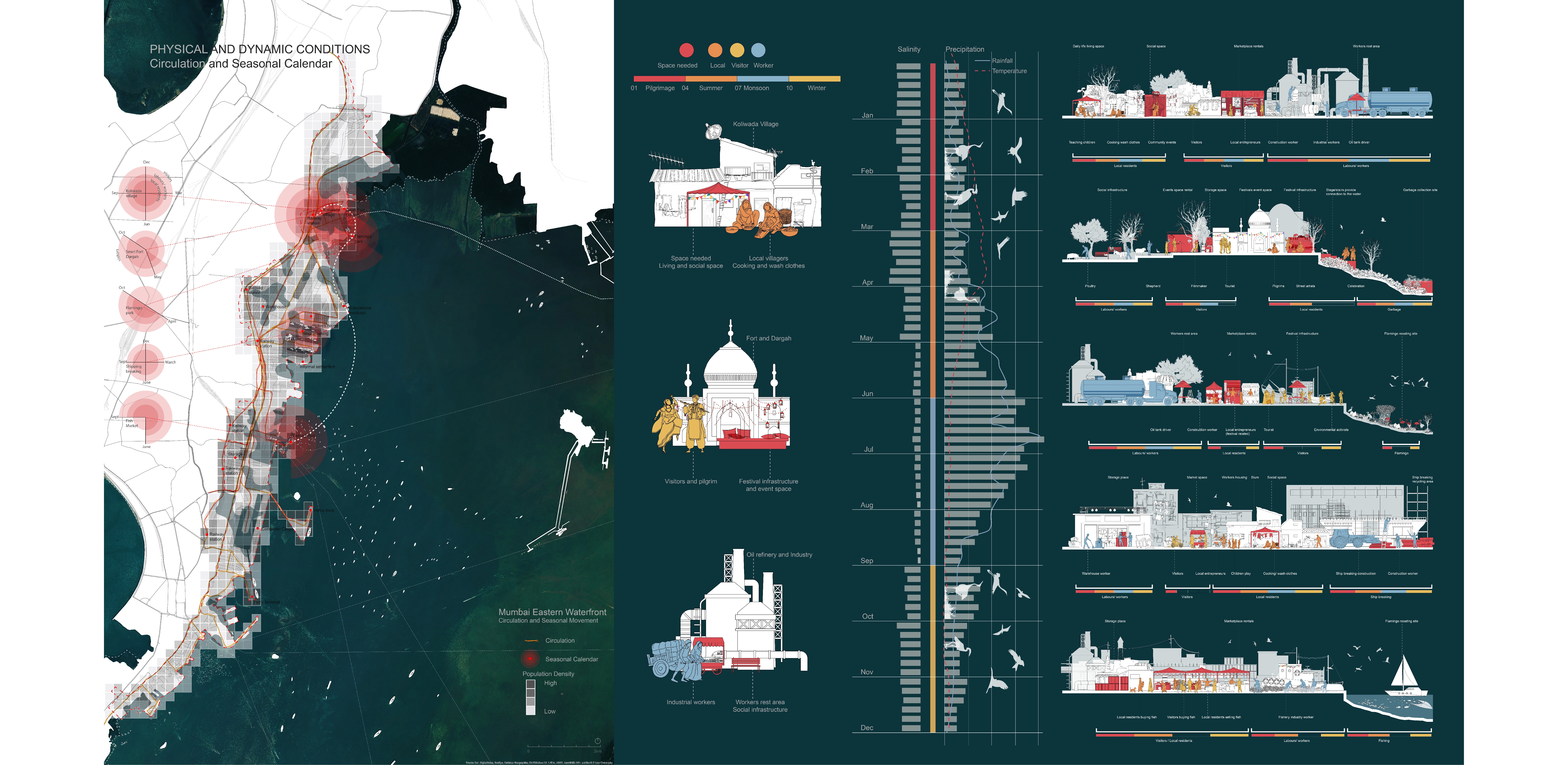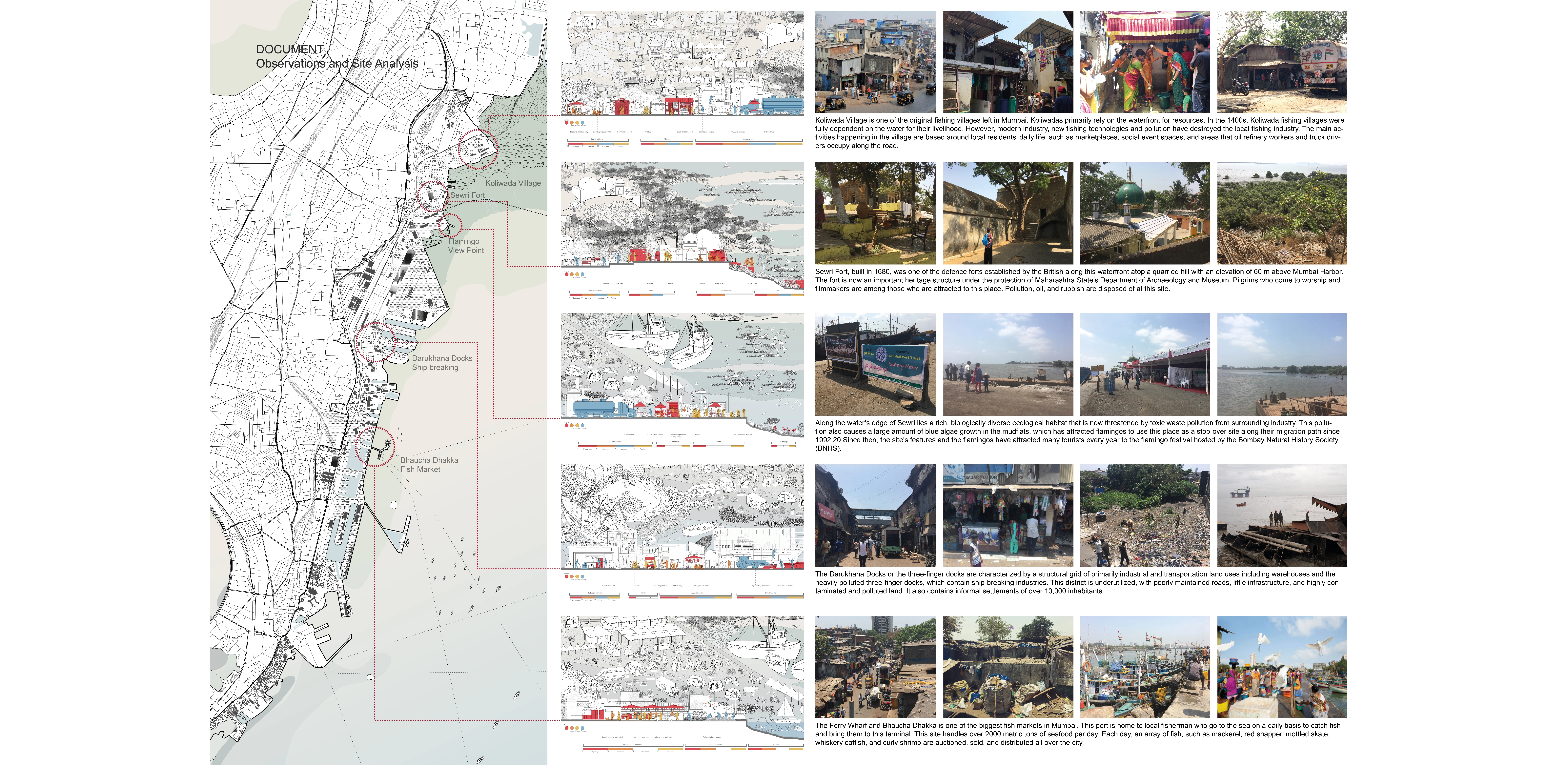 Background and Context The Mumbai Eastern Waterfront is one of the largest ports in the city; it is approximately 1800 acres in area and is the site of industrial activities, port activities, and formal and informal housing. All these activities are causing pollution outflow into the water, damaging the ecological habitat. In symbiosis with these adverse social and environmental conditions are the hubs of life, activity, and creativity inside these informal settlements. There is a co-existence relationship between the village life along the waterfront, the ecological habitat, and heavy industry, and there is a very dense intermixing of these social and environmental dynamics. Site and Observations This project examines a particular way of documenting the complex dynamics and intermixing of the spatial and material relationships happening on the site, which have informed this drawing method that captures the area’s moments of life. This project focuses on revealing and analyzing the dynamics and diversity of current social, ecological, economic, and spatial relationships currently present in five contested areas within the Eastern Waterfront. 1. Koliwada Village Koliwada Village is one of the original fishing villages left in Mumbai. Koliwadas primarily relies on the waterfront for resources. In the 1400s, Koliwada fishing villages were fully dependent on the water for their livelihood. However, modern industry, new fishing technologies and pollution have destroyed the local fishing industry. 2. Sewri Fort and Dargah Sewri Fort, built in 1680, was one of the defence forts established by the British along this waterfront atop a quarried hill with an elevation of 60 m above Mumbai Harbor. Pollution, oil, and rubbish are disposed of at this site. This neglect stems from many forms of disconnection, as industrial pollution is trapped and concentrated within the mangrove roots, killing them and the surrounding ecosystems. 3. Flamingo watchpoint The pollution from surrounding industry causes a large amount of blue algae growth in the mudflats, which has attracted flamingos to use this place as a stop-over site along their migration path since 1992. Since then, the site’s features and the flamingos have attracted many tourists every year to the flamingo festival hosted by the Bombay Natural History Society. 4. Shipbreaking yard The Darukhana Docks or the three-finger docks are characterized by a structural grid of primarily industrial and transportation land uses including warehouses and the heavily polluted three-finger docks, which contain ship-breaking industries. This district is underutilized, with poorly maintained roads, little infrastructure, and highly contaminated and polluted land. 5. Fish Market The Ferry Wharf and Bhaucha Dhakka is one of the biggest fish markets in Mumbai. This port is home to local fishermen who go to the sea on a daily basis to catch fish and bring them to this terminal. This site handles over 2000 metric tons of seafood per day. Objectives and Approach The project objectives and approach are to: - Document: capture the complex, dynamic and intertwined spatial and material relationships of the site. - Recognize: perceive the reality in a cultural context and demonstrate respect for a way of living. - Reconsider: rethink the interface between the land and water, as the water plays an important role in people’s livelihoods and cultural/spiritual practices. Intellectual Context Julia Watson’s “Lo-TEK Design by Radical Indigenism” introduces the power of lo-tech, a design movement that builds on indigenous philosophy and vernacular infrastructure to generate sustainable, resilient, natural-based technology. For the Mumbai Eastern Waterfront, the idea of lo-tech design is appropriate to apply to the site because of the recognized reality in a cultural context, such as a lack of infrastructure and a lack of government support. By showing respect for a way of life, the lo-tech design allows local communities to better understand their needs and desires, thus not requiring the government to step in with planning policies and urban strategies. The lo-tech design provides a self-sustaining or self-constructed model that helps local residents have a better quality of life with respect to their culture and the environment they are living in, and provides a way to improve informal settlements and develop solutions that address current social and ecological challenges. Physical and Dynamic Conditions Activities and circulation are interrelated and connected, and the seasonal calendar is an important consideration when designing for the site. From April to June, the weather starts to get hotter and more humid. April is also the time when the tidal exchange changes. Large areas of mudflats and algae are exposed to the surface, which attracts flamingos to come to the site from October to April. This is when the flamingo festival is held, and it attracts visitors and commercial activities. July to September is the monsoon season, which receives the most rainfall in the year, and the tide rises 4 to 5 meters above sea level. The fish market has no activities during the monsoon season, as it is breeding time for fish and other sea creatures. Lo-Tech Design Strategies In response to the current issues, the design explores a series of lo-tech interventions used to rethink the shoreline through pollution and treatment, culture and production, and recreation and ecology. The first phase is to create a buffer along the shoreline by inserting a mud dyke barrier to prevent erosion as well as to restore the mangroves. The second phase involves providing wastewater treatment at the outflow area through aquaculture and algae farming while taking advantage of pollutants to introduce a new form of economic reliance and to use wastewater as a resource for aquaculture production. The integrated mangrove aquaculture provides opportunities to create a network of fish farms within the ma