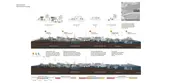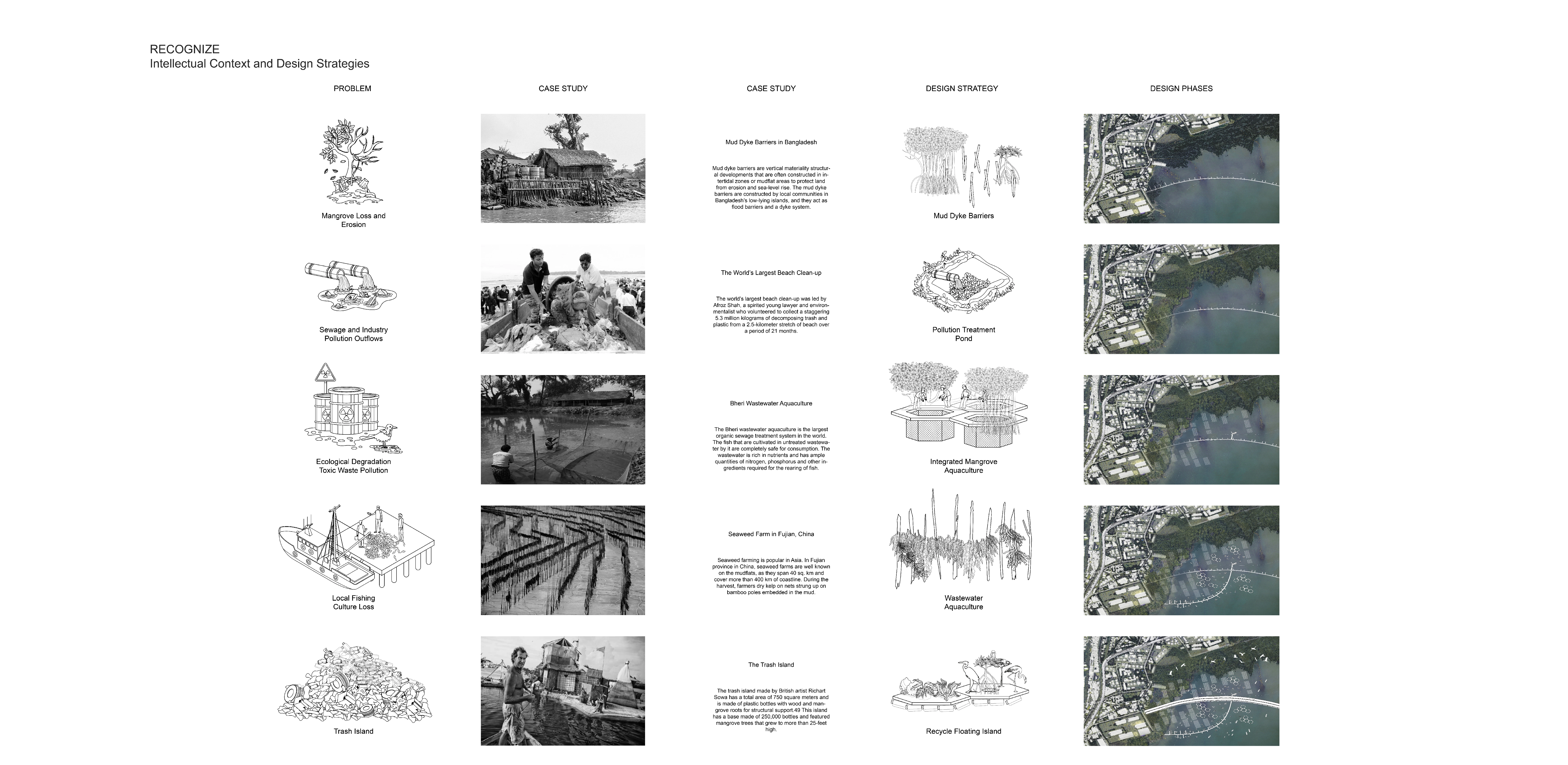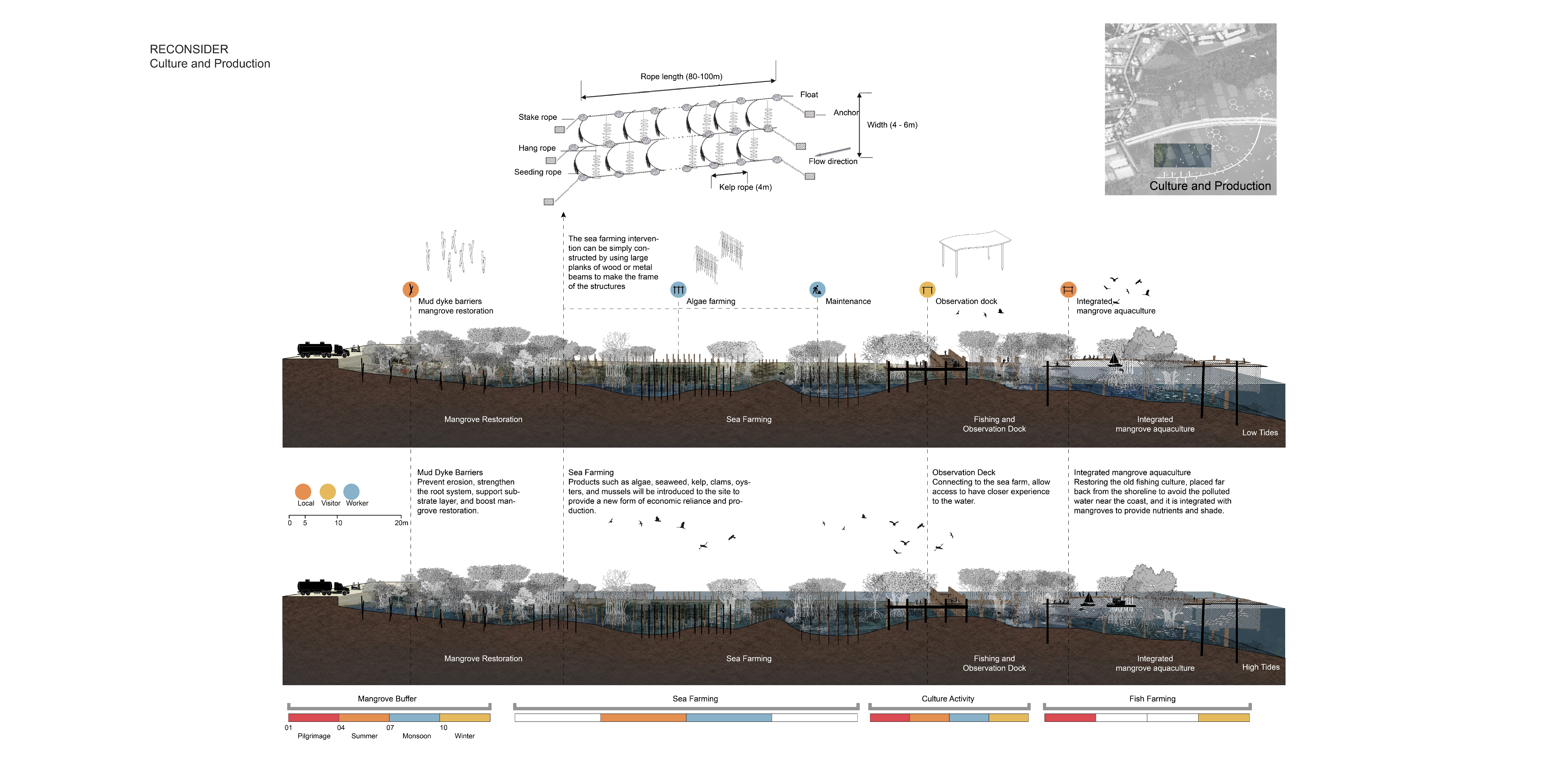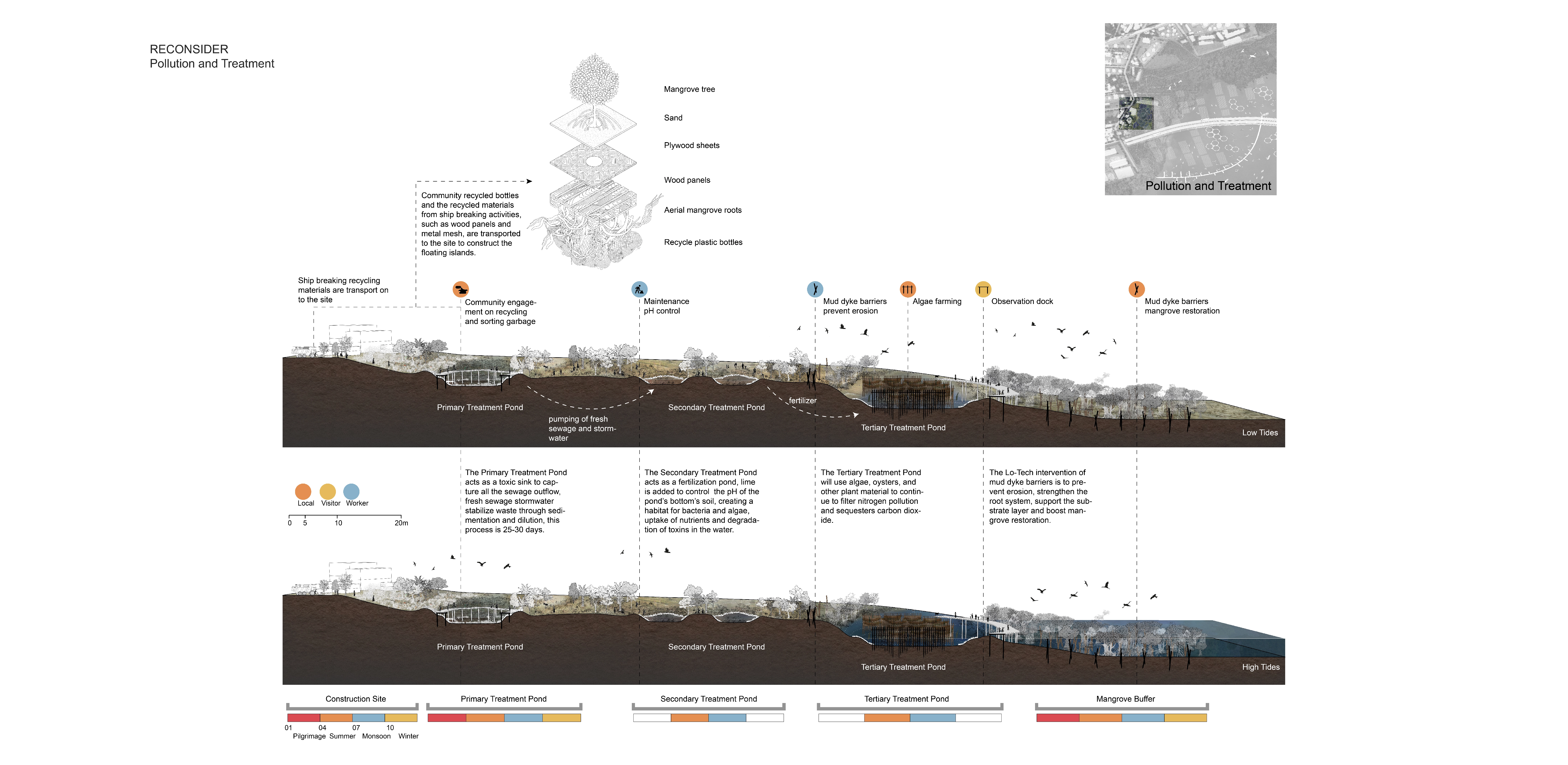 Background and Context The Mumbai Eastern Waterfront is one of the largest ports in the city; it is approximately 1800 acres in area and is the site of industrial activities, port activities, and formal and informal housing. All these activities are causing pollution outflow into the water, damaging the ecological habitat. In symbiosis with these adverse social and environmental conditions are the hubs of life, activity, and creativity inside these informal settlements. There is a co-existence relationship between the village life along the waterfront, the ecological habitat, and heavy industry, and there is a very dense intermixing of these social and environmental dynamics. Site and Observations This project examines a particular way of documenting the complex dynamics and intermixing of the spatial and material relationships happening on the site, which have informed this drawing method that captures the area’s moments of life. This project focuses on revealing and analyzing the dynamics and diversity of current social, ecological, economic, and spatial relationships currently present in five contested areas within the Eastern Waterfront. 1. Koliwada Village Koliwada Village is one of the original fishing villages left in Mumbai. Koliwadas primarily relies on the waterfront for resources. In the 1400s, Koliwada fishing villages were fully dependent on the water for their livelihood. However, modern industry, new fishing technologies and pollution have destroyed the local fishing industry. 2. Sewri Fort and Dargah Sewri Fort, built in 1680, was one of the defence forts established by the British along this waterfront atop a quarried hill with an elevation of 60 m above Mumbai Harbor. Pollution, oil, and rubbish are disposed of at this site. This neglect stems from many forms of disconnection, as industrial pollution is trapped and concentrated within the mangrove roots, killing them and the surrounding ecosystems. 3. Flamingo watchpoint The pollution from surrounding industry causes a large amount of blue algae growth in the mudflats, which has attracted flamingos to use this place as a stop-over site along their migration path since 1992. Since then, the site’s features and the flamingos have attracted many tourists every year to the flamingo festival hosted by the Bombay Natural History Society. 4. Shipbreaking yard The Darukhana Docks or the three-finger docks are characterized by a structural grid of primarily industrial and transportation land uses including warehouses and the heavily polluted three-finger docks, which contain ship-breaking industries. This district is underutilized, with poorly maintained roads, little infrastructure, and highly contaminated and polluted land. 5. Fish Market The Ferry Wharf and Bhaucha Dhakka is one of the biggest fish markets in Mumbai. This port is home to local fishermen who go to the sea on a daily basis to catch fish and bring them to this terminal. This site handles over 2000 metric tons of seafood per day. Objectives and Approach The project objectives and approach are to: - Document: capture the complex, dynamic and intertwined spatial and material relationships of the site. - Recognize: perceive the reality in a cultural context and demonstrate respect for a way of living. - Reconsider: rethink the interface between the land and water, as the water plays an important role in people’s livelihoods and cultural/spiritual practices. Intellectual Context Julia Watson’s “Lo-TEK Design by Radical Indigenism” introduces the power of lo-tech, a design movement that builds on indigenous philosophy and vernacular infrastructure to generate sustainable, resilient, natural-based technology. For the Mumbai Eastern Waterfront, the idea of lo-tech design is appropriate to apply to the site because of the recognized reality in a cultural context, such as a lack of infrastructure and a lack of government support. By showing respect for a way of life, the lo-tech design allows local communities to better understand their needs and desires, thus not requiring the government to step in with planning policies and urban strategies. The lo-tech design provides a self-sustaining or self-constructed model that helps local residents have a better quality of life with respect to their culture and the environment they are living in, and provides a way to improve informal settlements and develop solutions that address current social and ecological challenges. Physical and Dynamic Conditions Activities and circulation are interrelated and connected, and the seasonal calendar is an important consideration when designing for the site. From April to June, the weather starts to get hotter and more humid. April is also the time when the tidal exchange changes. Large areas of mudflats and algae are exposed to the surface, which attracts flamingos to come to the site from October to April. This is when the flamingo festival is held, and it attracts visitors and commercial activities. July to September is the monsoon season, which receives the most rainfall in the year, and the tide rises 4 to 5 meters above sea level. The fish market has no activities during the monsoon season, as it is breeding time for fish and other sea creatures. Lo-Tech Design Strategies In response to the current issues, the design explores a series of lo-tech interventions used to rethink the shoreline through pollution and treatment, culture and production, and recreation and ecology. The first phase is to create a buffer along the shoreline by inserting a mud dyke barrier to prevent erosion as well as to restore the mangroves. The second phase involves providing wastewater treatment at the outflow area through aquaculture and algae farming while taking advantage of pollutants to introduce a new form of economic reliance and to use wastewater as a resource for aquaculture production. The integrated mangrove aquaculture provides opportunities to create a network of fish farms within the ma