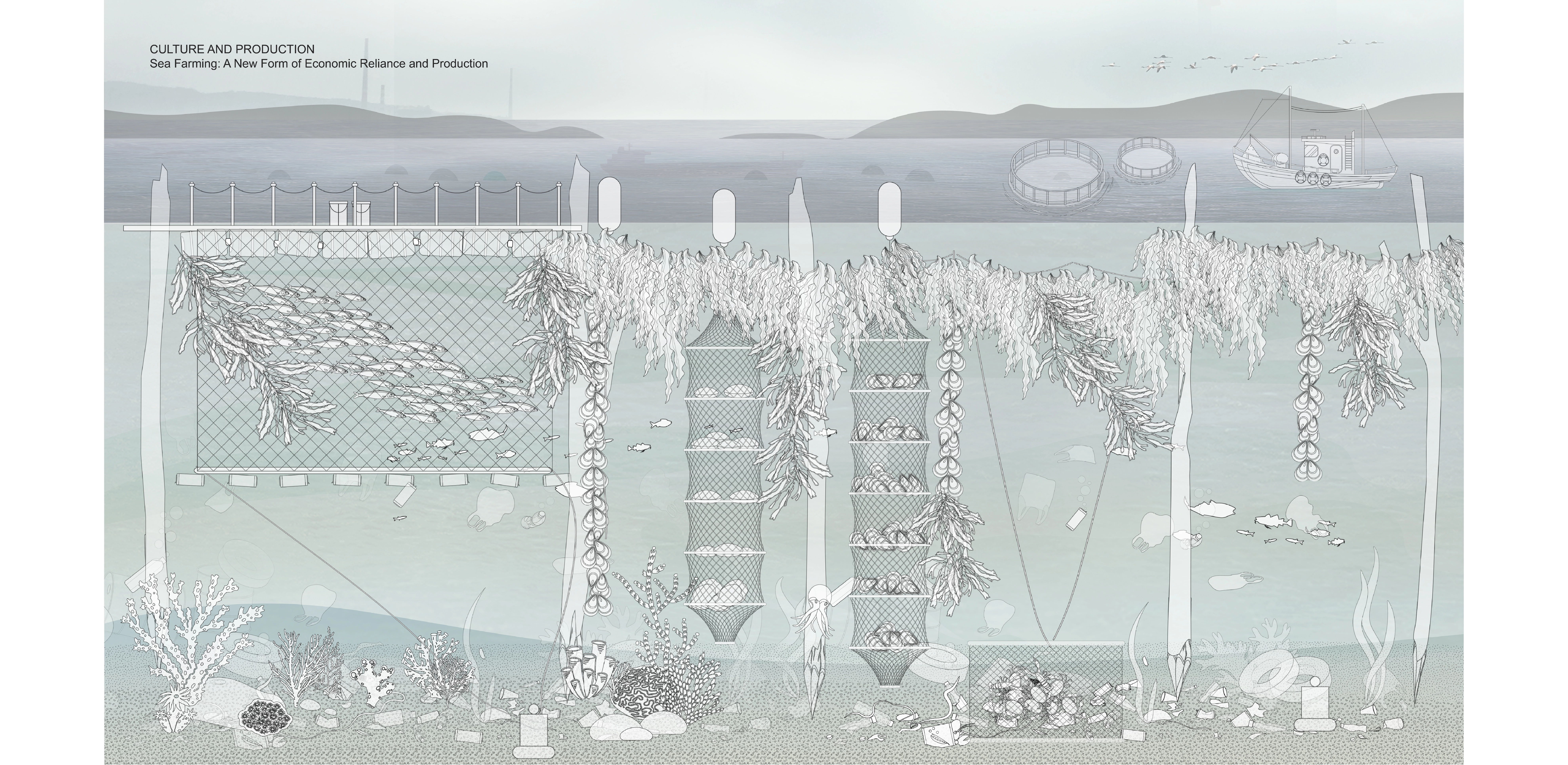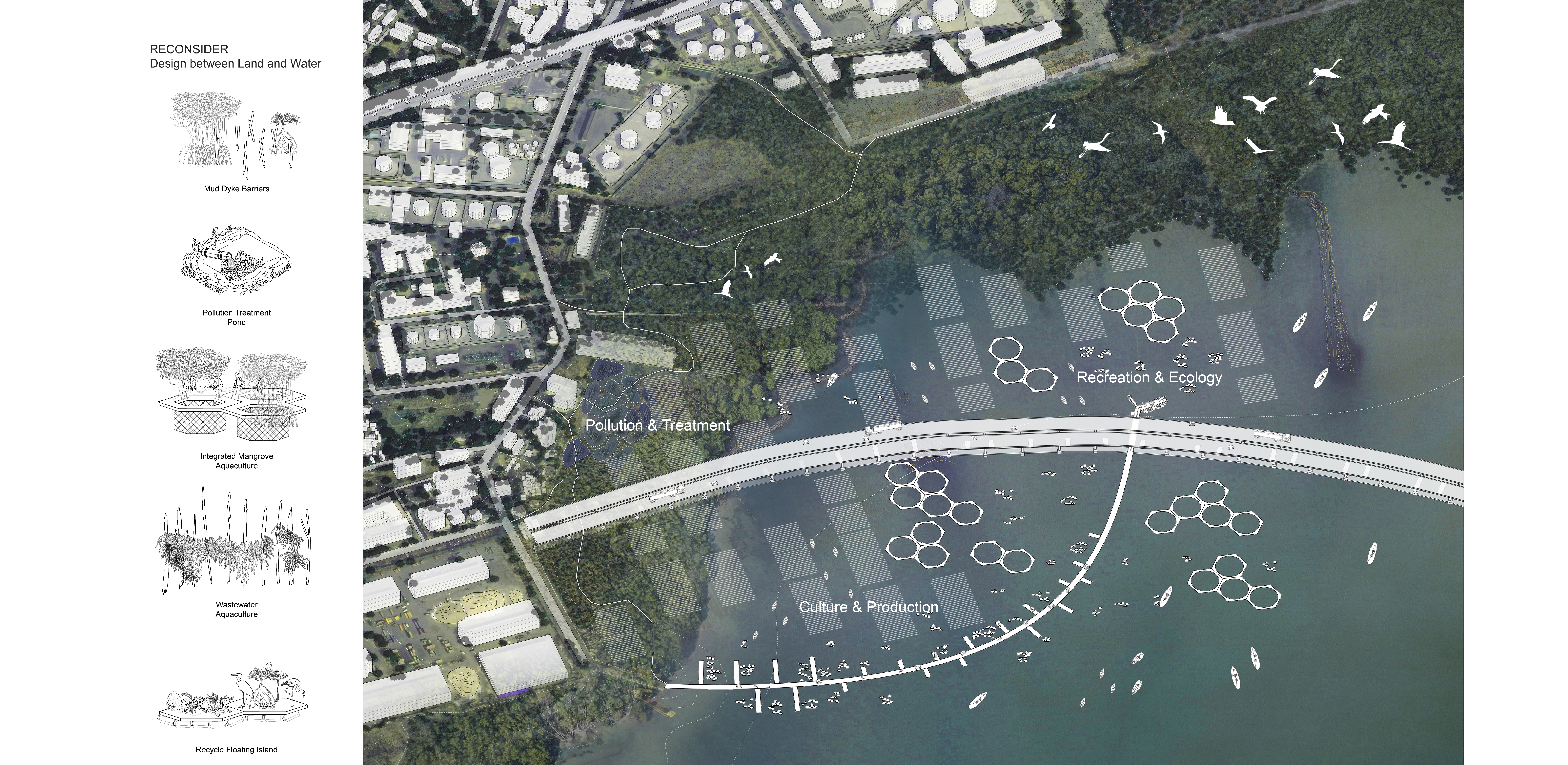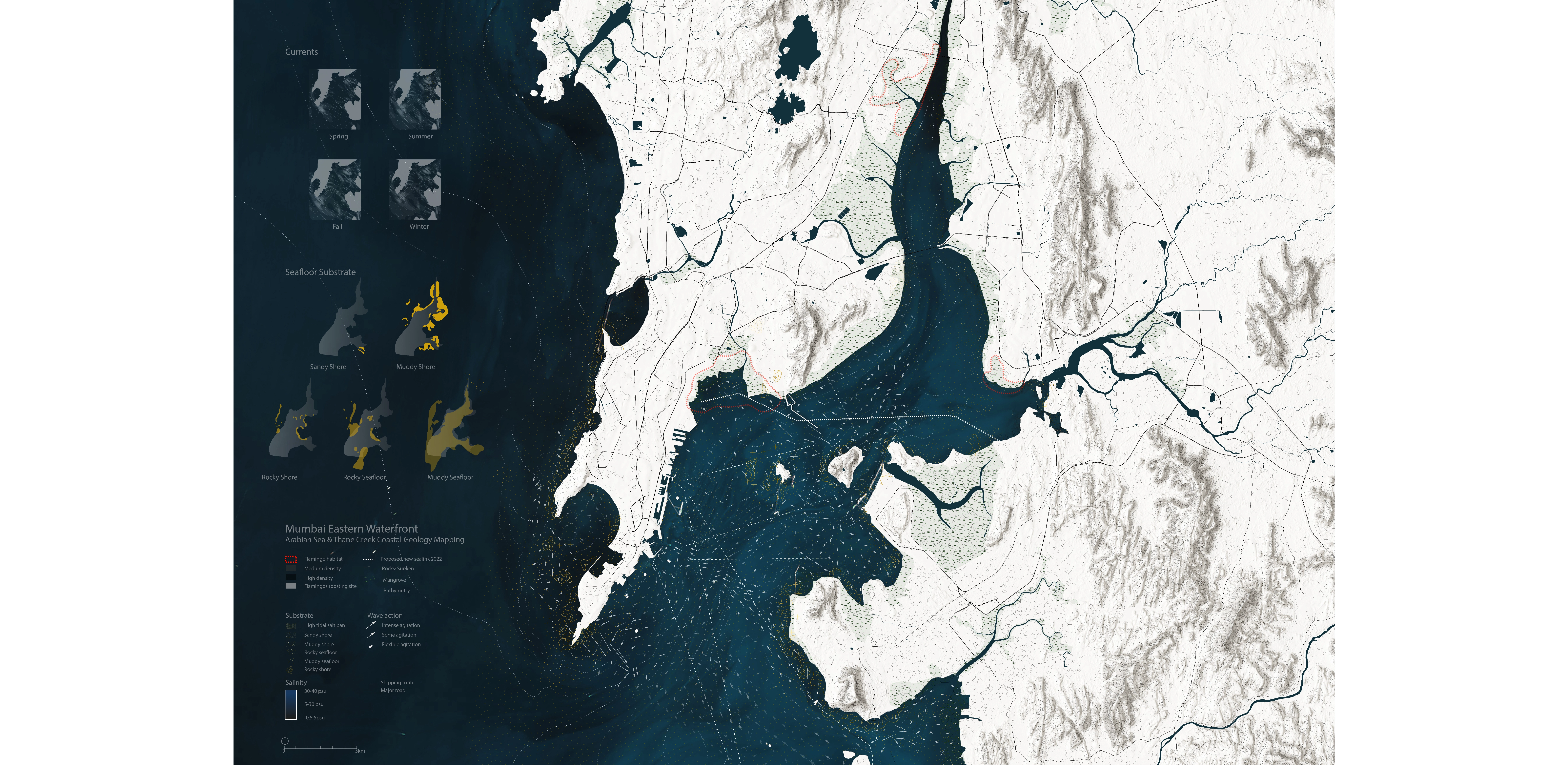 Mumbai’s eastern harbor is characterized by jarring juxtapositions of flamingo habitats and maritime wreckage, or historic fishing villages and petroleum plants. This proposal aims to harvest and repurpose buoyant waste materials into floating islands that would enable aquatic farming and become flamingo habitats, propelling newfound commitment to the waterfront. Industrial pollution causes blue algal blooms, upon which the flamingos feed, yet the pollution harms other marine growth. A design that recognizes the many local cultural conventions encourages new mangroves and pollution treatment ponds, which would serve multiple purposes, such as reducing toxins while promoting aquaculture that would continue to sustain nearby fisherfolk.