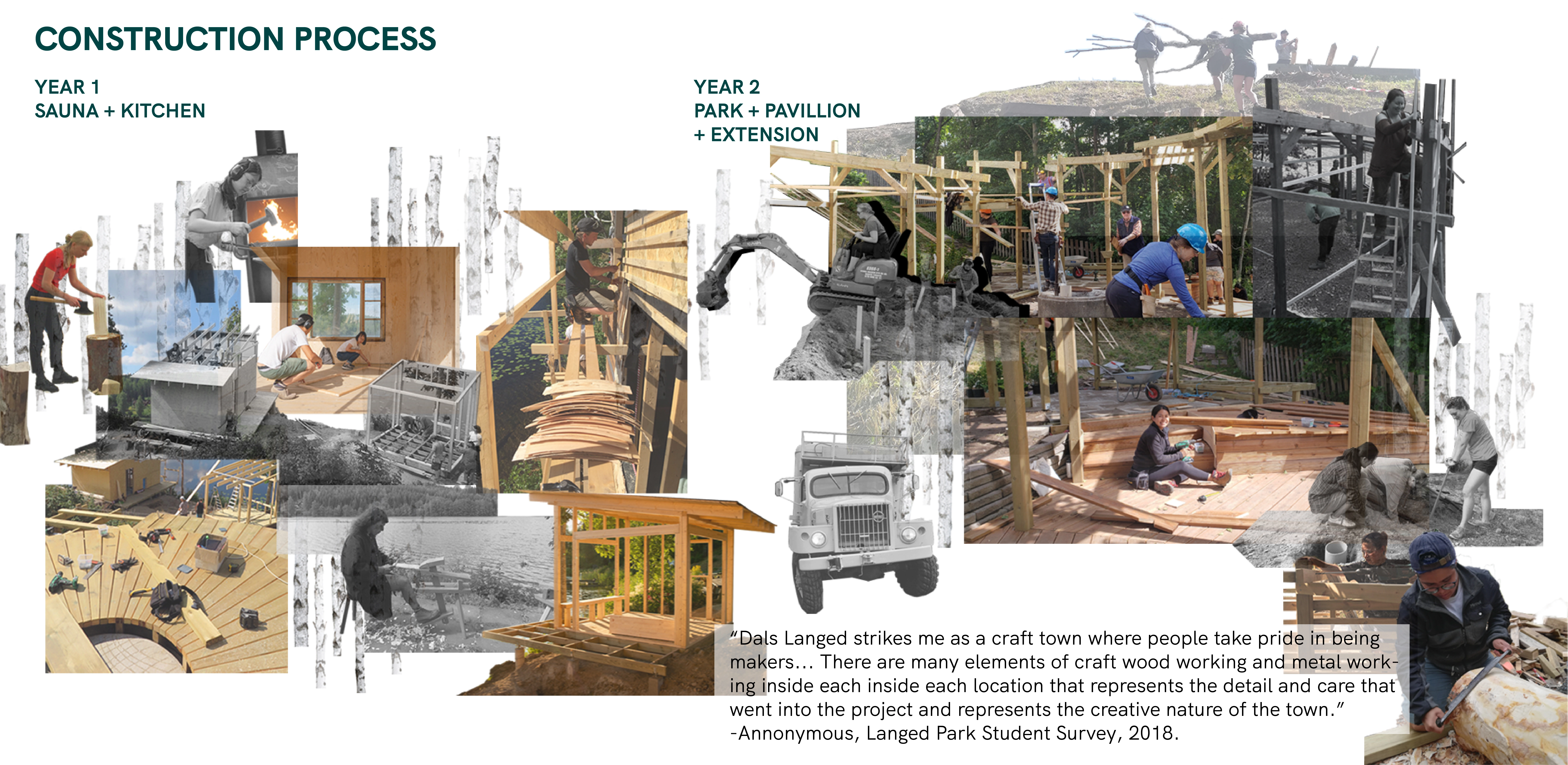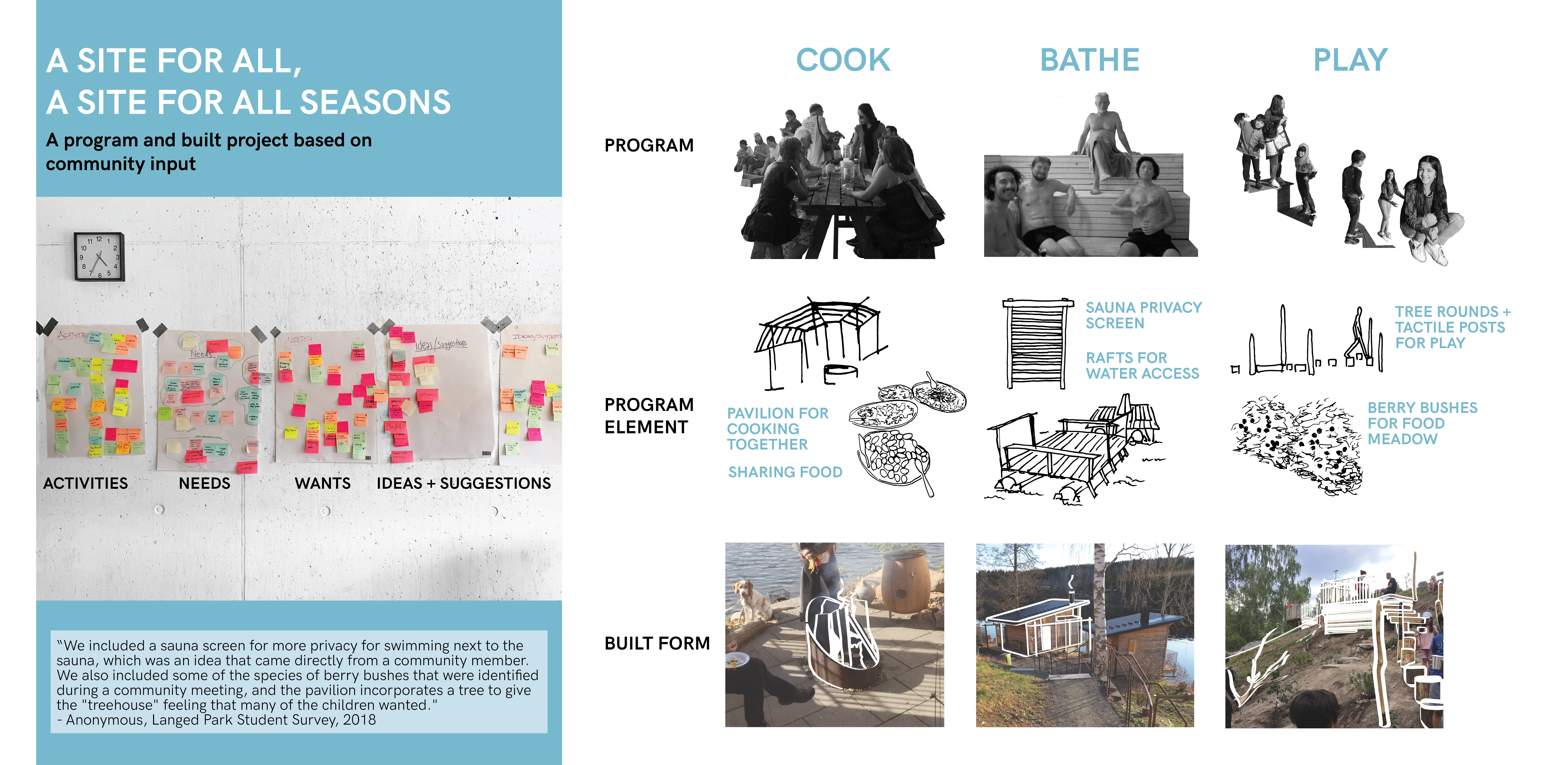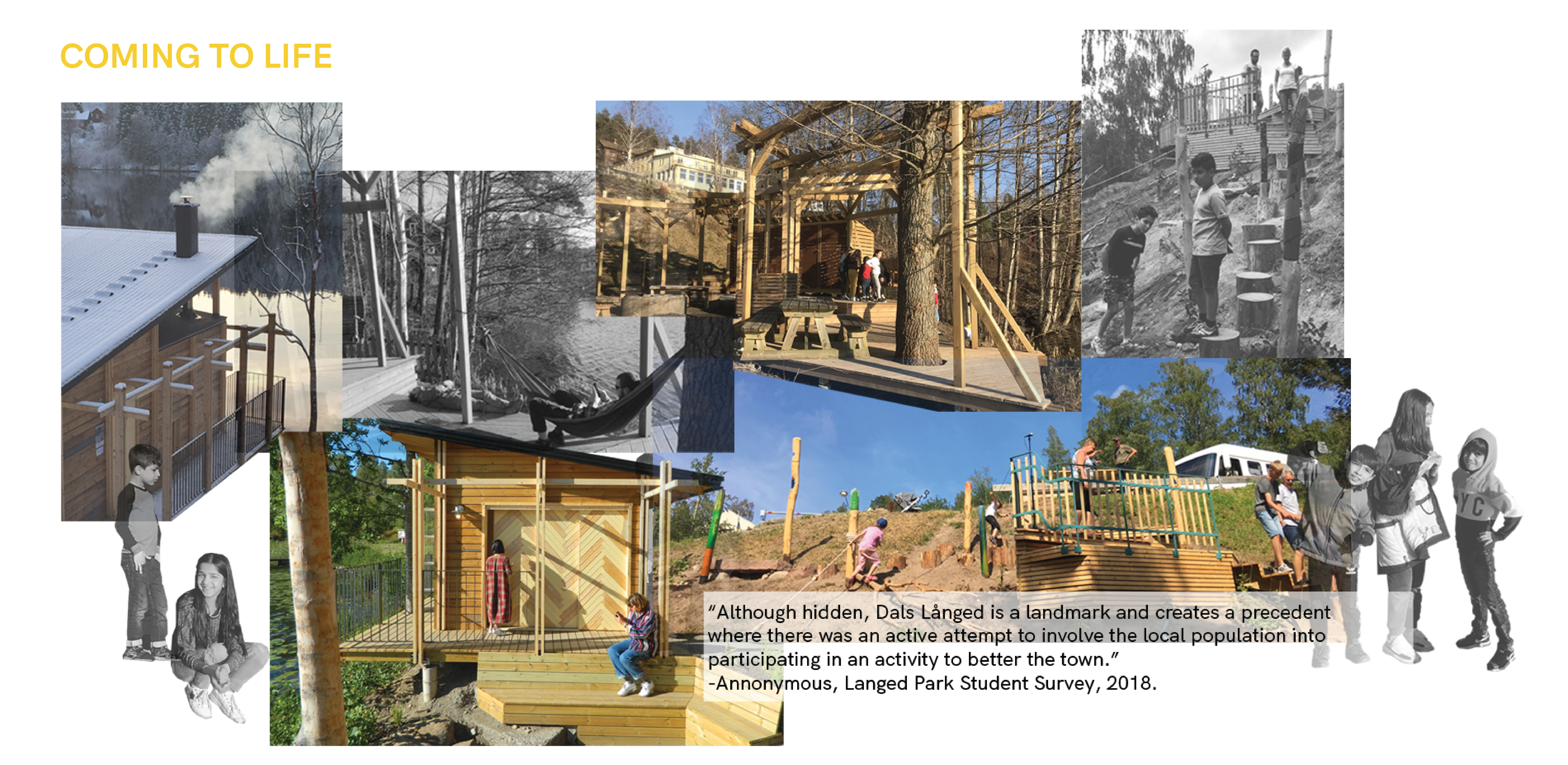 As part of a community redevelopment process in Dals Långed, Sweden, a design-build learning model was employed to reimagine how a central public park can foster a communal sense of place amidst ongoing social migration and dislocation. Dals Långed is a rural village in southwestern Sweden. The Dalsland Canal defines the village, initially through industry and water transport and now through tourism and recreation. Urban migration and the closing of industry have put social and economic pressure on the region. However, the trend of depopulation has started to blur with growing Syrian and other immigrant communities settling in Sweden’s rural areas. More than 5.6 million people have fled Syria since 2011 due to the war (UNHCR). Sweden has accepted the second highest number of Syrian refugees in Europe. This open door policy is laudable, yet Syrian newcomers face a host of political, social, and economic complexities, often manifest in various forms of discrimination while isolated in rural areas due to urban housing shortages. Still, there are profound stories of resilience and fortitude within this context of trauma and alienation. A continuing evaluation of our project found shared aspirations among Syrian newcomers in the cultivation of new, diverse social networks and the importance of safe places to learn the Swedish language and meet non-Syrian friends. Both are requisites for integration and cultivation of a “home”, but remain entangled in social, cultural, and economic challenges. This impact of human movement is both unique to Dals Långed and part of a growing global narrative resulting in increasing rates of displacement and urban migration. There is a great need for novel public spaces and inclusive processes to cultivate them. METHODS AND SITE: Interviews with Syrian newcomers and established local residents, focus groups with elementary school students on the site, vernacular craft demonstrations with local artisans, research presentations at a local craft school, formal county-wide community meetings, and an open drop-in studio format informed this two-year working relationship that builds upon the diverse stories of Dals Långed to reimagine the town’s centrally located ”village green”. The site, chosen through a preliminary community outreach process and public open space analysis, sits between the Dalsland Canal and the historic rail station. Prior to the intervention, its notable and ecological features included established quaking aspen and birch, hillsides of wild flowers, a habitat-rich wetland edge planting, and spectacular views of the canal and lake. These were carefully preserved and incorporated into the site master plan and constructed interventions. It was and remains a gateway conduit for tourism in Dals Langed. The public dock connects recreational boaters visiting the region to the town, and an RV campground offers accommodation to regional visitors. Prior to our involvement, everyday activities were infrequent and the site was considered underused and often ignored by many in the community. PROJECT PHASES: An initial master plan explored how multicultural activities, social gathering, and intergenerational play could accommodate and nurture the future and evolving contexts within Dals Långed. An important consideration was how the site could be reactivated while preserving and enhancing sensitive ecological assets. Following the required setbacks, the structures were built on post/pier footings to minimize excavation, water access was achieved using floating rafts, and denuded areas were revegetated. The project’s first phase highlighted the site’s cultural and ecological connection to water. The three principal program elements were a bastu (traditional Swedish sauna), a kitchen pavilion, and a cooking hearth/gathering garden situated between the two structures. The sauna is a historic public space typology presenting an environment of vulnerability and equity. The act of bathing together offers a culturally significant way to cross barriers between people. It also functioned as a topic of dialogue around cultural connotations of gender and nudity amongst the ethnic Swedes and Syrian community. As a winter activity, when people primarily shelter within their homes, the sauna activates the park as a community outlet for social interchange and friendship. The food pavilion and cooking hearth build upon a successful precursor: a temporary community kitchen fostering cultural exchange of food, recipes, and language. The project’s second phase was an invaluable opportunity to reassess community goals and amend issues that had arisen since the prior summer’s intervention. Many Syrians noted that they felt the park was really beautiful, but that it was for others, not for them. The goal of long-term investment in the project is that overtime, a sense of co-ownership will evolve and take root. As a catalyst, the second phase explored incorporating play, learning and contemplation. The program became an adventure playscape that weaves between extensive plantings of native food species, including fruit trees, berry bushes, and vines. The idea was enthusiastically endorsed by all segments of the community, and anecdotal results document that children are impressive motivators for cultural interchange. Initial review has demonstrated that children's use of the playscape has encouraged families to come and use the park’s various program elements: cooking, eating, quiet contemplation, and swimming. Summer experiences the highest volume of users; this upcoming season will provide valuable insights about the extent of co-ownership. The community is optimistic that the summer’s festivals will be a time of sharing space, socializing, and exchanging food and recipes while children play amongst the edible garden. PERSPECTIVES AND LESSONS LEARNED: Each year’s team was structured around a collaboration among students from various universities in th