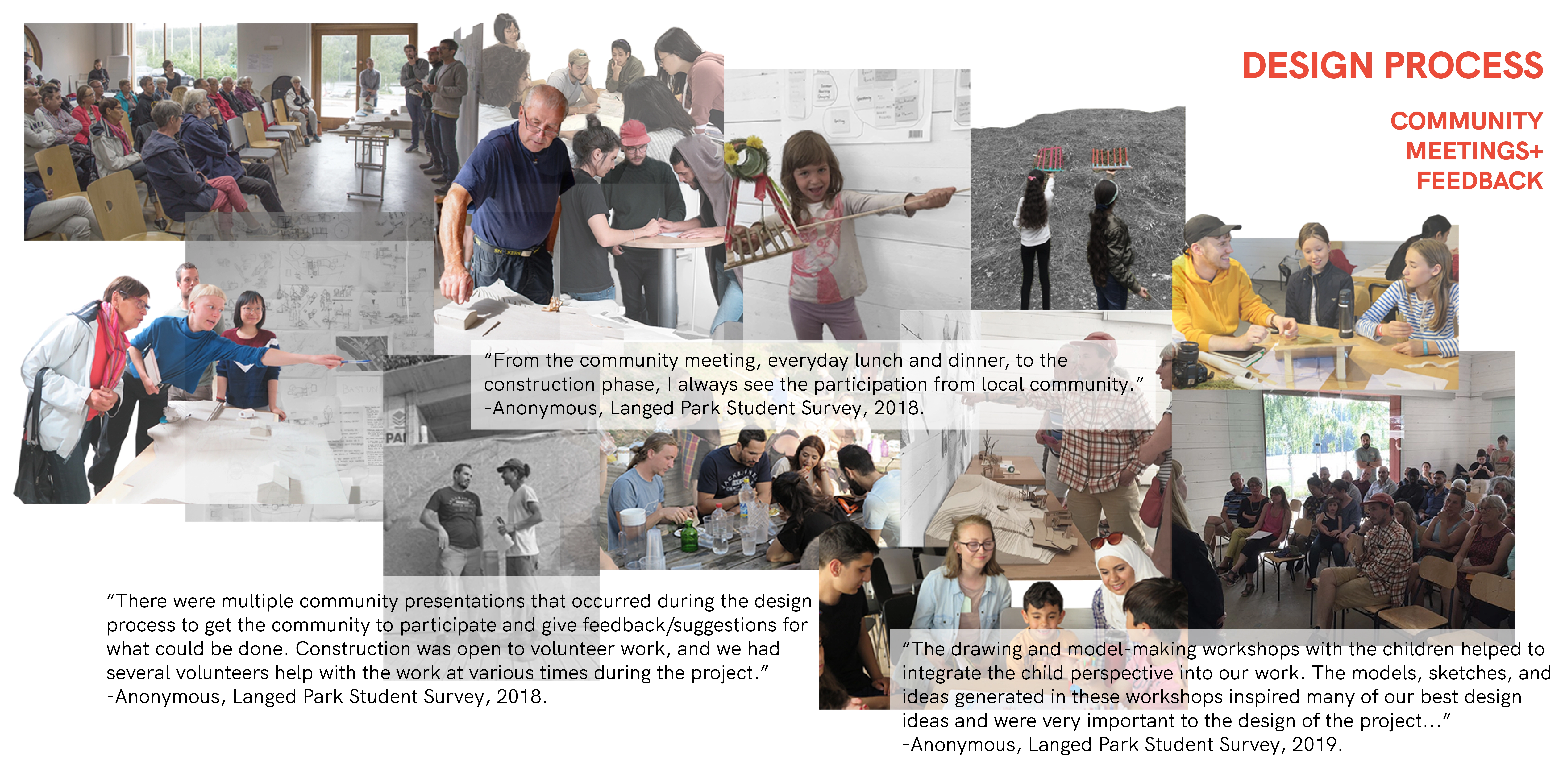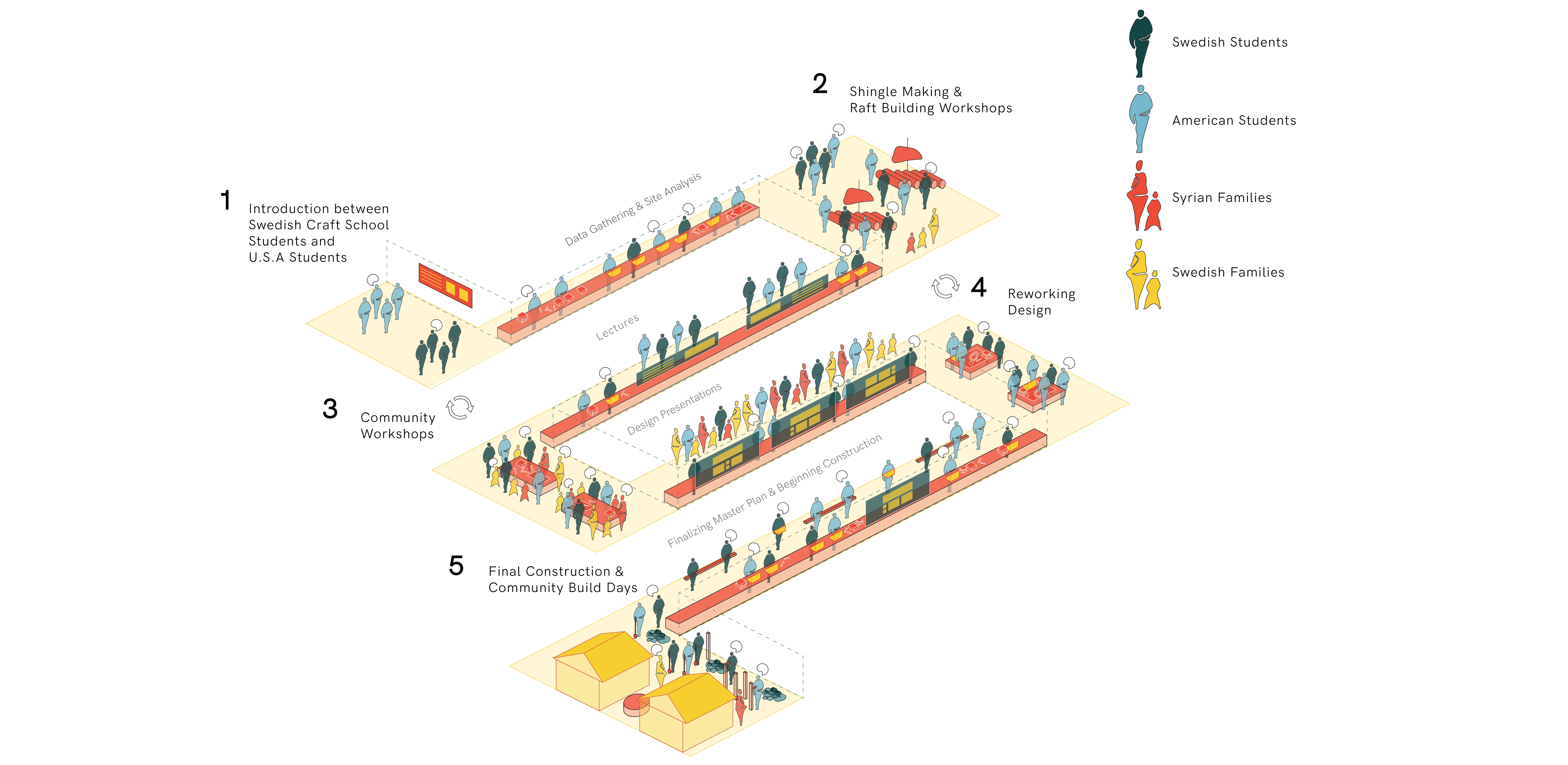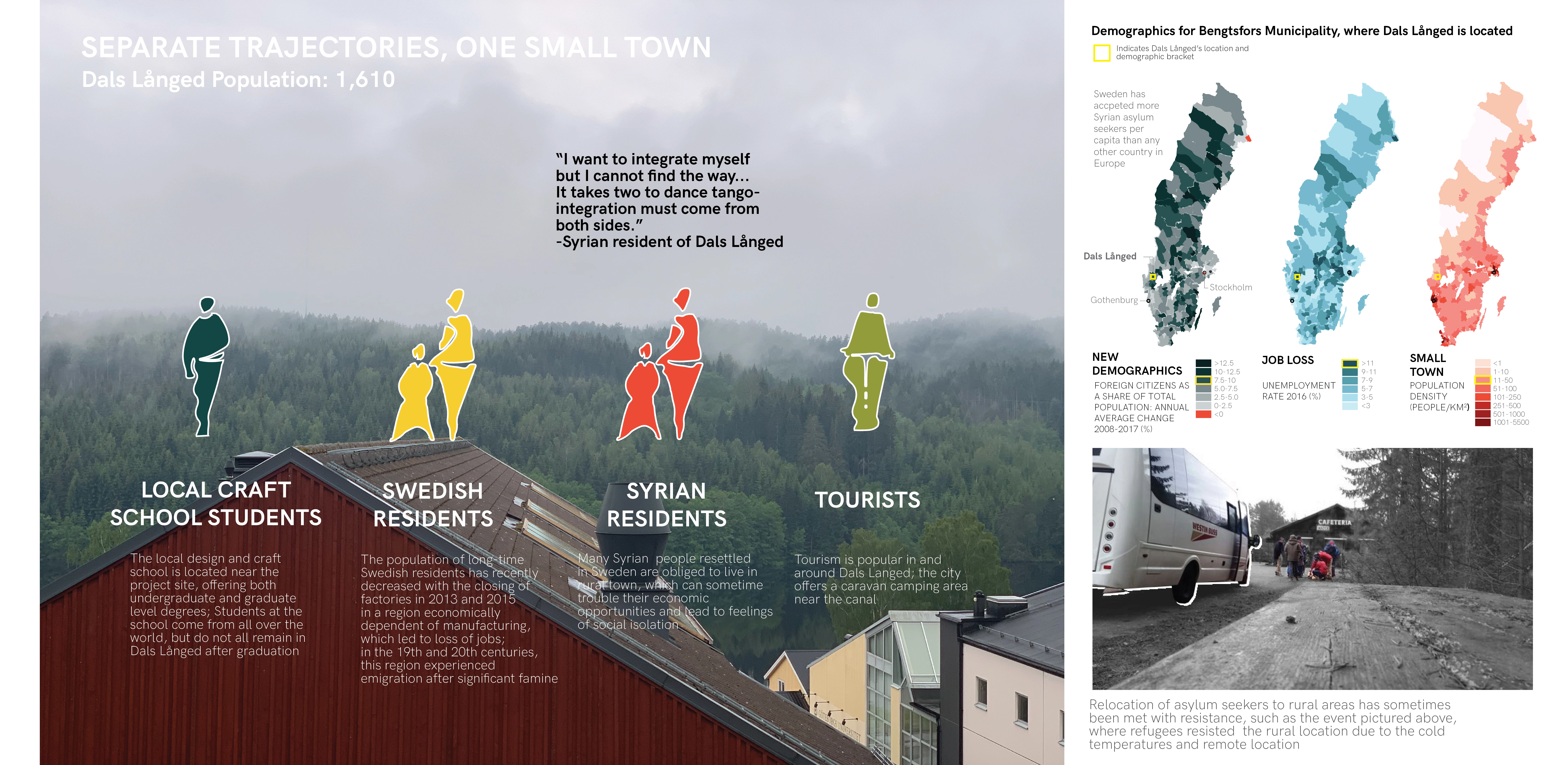 As part of a community redevelopment process in Dals Långed, Sweden, a design-build learning model was employed to reimagine how a central public park can foster a communal sense of place amidst ongoing social migration and dislocation. Dals Långed is a rural village in southwestern Sweden. The Dalsland Canal defines the village, initially through industry and water transport and now through tourism and recreation. Urban migration and the closing of industry have put social and economic pressure on the region. However, the trend of depopulation has started to blur with growing Syrian and other immigrant communities settling in Sweden’s rural areas. More than 5.6 million people have fled Syria since 2011 due to the war (UNHCR). Sweden has accepted the second highest number of Syrian refugees in Europe. This open door policy is laudable, yet Syrian newcomers face a host of political, social, and economic complexities, often manifest in various forms of discrimination while isolated in rural areas due to urban housing shortages. Still, there are profound stories of resilience and fortitude within this context of trauma and alienation. A continuing evaluation of our project found shared aspirations among Syrian newcomers in the cultivation of new, diverse social networks and the importance of safe places to learn the Swedish language and meet non-Syrian friends. Both are requisites for integration and cultivation of a “home”, but remain entangled in social, cultural, and economic challenges. This impact of human movement is both unique to Dals Långed and part of a growing global narrative resulting in increasing rates of displacement and urban migration. There is a great need for novel public spaces and inclusive processes to cultivate them. METHODS AND SITE: Interviews with Syrian newcomers and established local residents, focus groups with elementary school students on the site, vernacular craft demonstrations with local artisans, research presentations at a local craft school, formal county-wide community meetings, and an open drop-in studio format informed this two-year working relationship that builds upon the diverse stories of Dals Långed to reimagine the town’s centrally located ”village green”. The site, chosen through a preliminary community outreach process and public open space analysis, sits between the Dalsland Canal and the historic rail station. Prior to the intervention, its notable and ecological features included established quaking aspen and birch, hillsides of wild flowers, a habitat-rich wetland edge planting, and spectacular views of the canal and lake. These were carefully preserved and incorporated into the site master plan and constructed interventions. It was and remains a gateway conduit for tourism in Dals Langed. The public dock connects recreational boaters visiting the region to the town, and an RV campground offers accommodation to regional visitors. Prior to our involvement, everyday activities were infrequent and the site was considered underused and often ignored by many in the community. PROJECT PHASES: An initial master plan explored how multicultural activities, social gathering, and intergenerational play could accommodate and nurture the future and evolving contexts within Dals Långed. An important consideration was how the site could be reactivated while preserving and enhancing sensitive ecological assets. Following the required setbacks, the structures were built on post/pier footings to minimize excavation, water access was achieved using floating rafts, and denuded areas were revegetated. The project’s first phase highlighted the site’s cultural and ecological connection to water. The three principal program elements were a bastu (traditional Swedish sauna), a kitchen pavilion, and a cooking hearth/gathering garden situated between the two structures. The sauna is a historic public space typology presenting an environment of vulnerability and equity. The act of bathing together offers a culturally significant way to cross barriers between people. It also functioned as a topic of dialogue around cultural connotations of gender and nudity amongst the ethnic Swedes and Syrian community. As a winter activity, when people primarily shelter within their homes, the sauna activates the park as a community outlet for social interchange and friendship. The food pavilion and cooking hearth build upon a successful precursor: a temporary community kitchen fostering cultural exchange of food, recipes, and language. The project’s second phase was an invaluable opportunity to reassess community goals and amend issues that had arisen since the prior summer’s intervention. Many Syrians noted that they felt the park was really beautiful, but that it was for others, not for them. The goal of long-term investment in the project is that overtime, a sense of co-ownership will evolve and take root. As a catalyst, the second phase explored incorporating play, learning and contemplation. The program became an adventure playscape that weaves between extensive plantings of native food species, including fruit trees, berry bushes, and vines. The idea was enthusiastically endorsed by all segments of the community, and anecdotal results document that children are impressive motivators for cultural interchange. Initial review has demonstrated that children's use of the playscape has encouraged families to come and use the park’s various program elements: cooking, eating, quiet contemplation, and swimming. Summer experiences the highest volume of users; this upcoming season will provide valuable insights about the extent of co-ownership. The community is optimistic that the summer’s festivals will be a time of sharing space, socializing, and exchanging food and recipes while children play amongst the edible garden. PERSPECTIVES AND LESSONS LEARNED: Each year’s team was structured around a collaboration among students from various universities in th