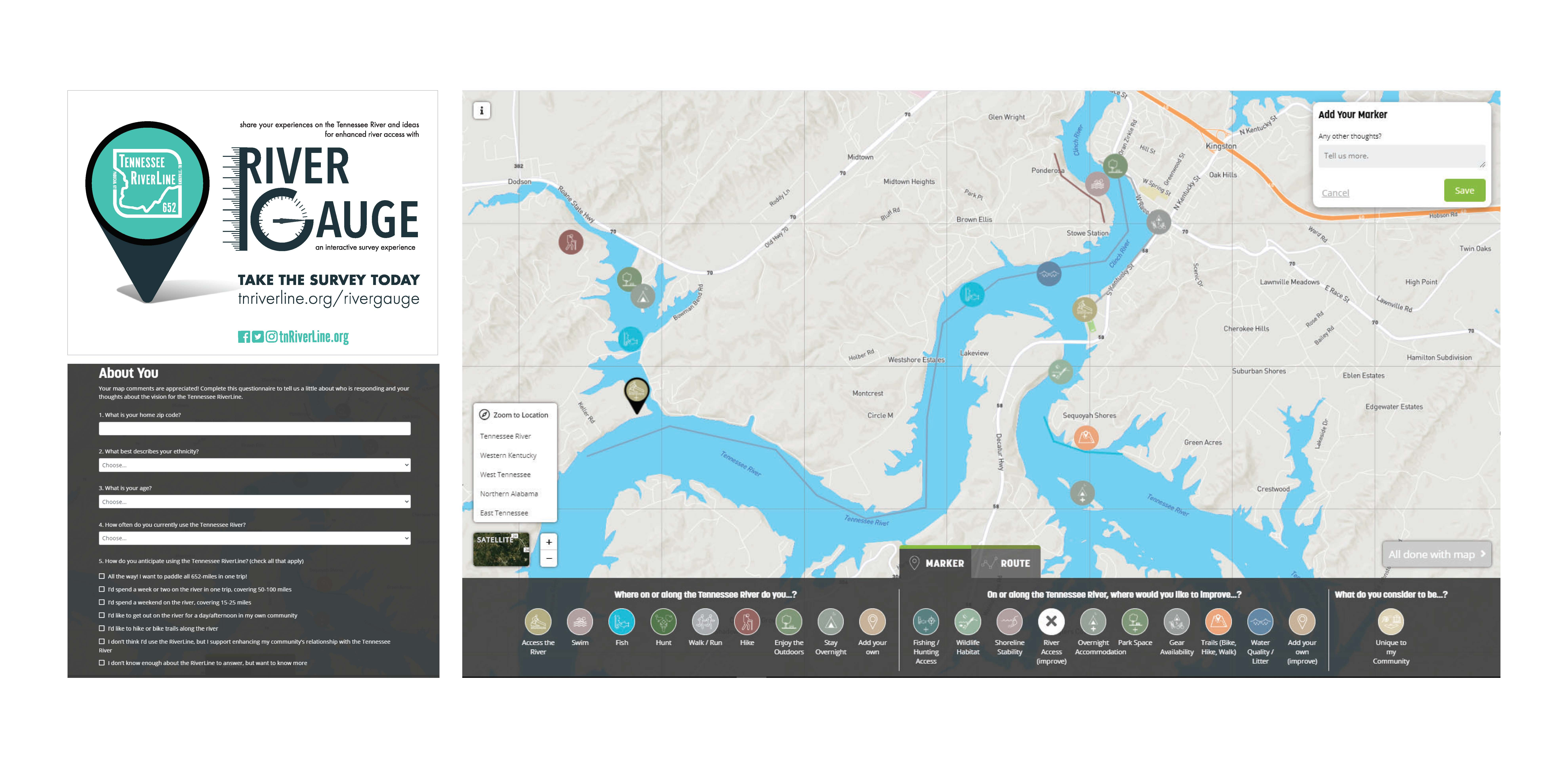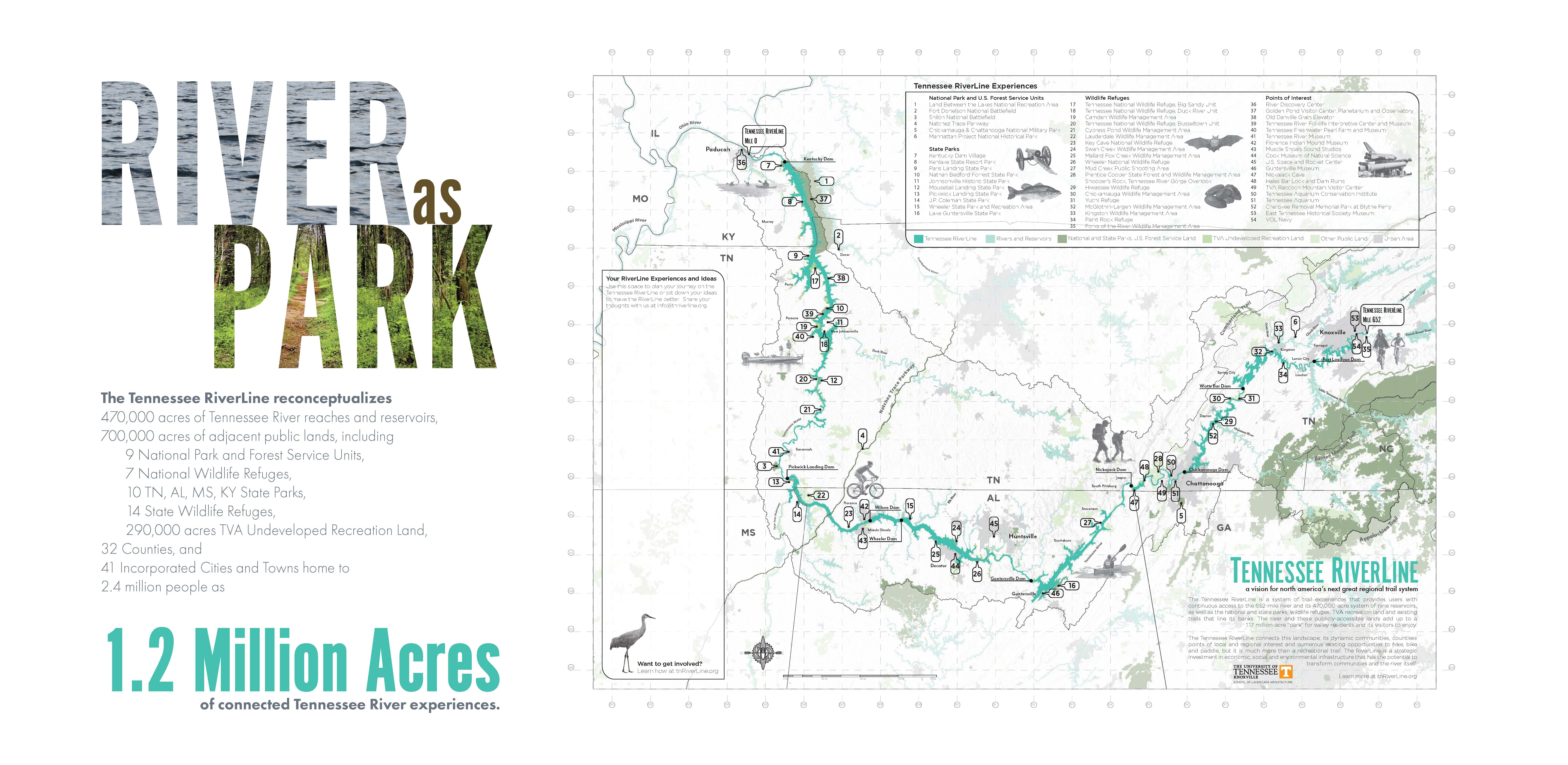 652 to YOU is a comprehensive communications and public engagement strategy developed to raise awareness of the Tennessee RiverLine vision, and empower the public as a critical participant in the vision’s further development locally and regionally. Crafted by a team of students in the University of Tennessee School of Landscape Architecture in support of the Tennessee RiverLine Partnership, this system of events and participatory planning activities allowed leaders, residents, neighbors, and friends Tennessee River communities to offer feedback to this transformative vision, while creating a platform to share their own ideas about how their community’s relationship with the Tennessee River could be enhanced, unlocking latent potentials for economic resilience, public health and environmental stewardship. In the process, 652 to YOU built a robust and engaged foundation of grassroots supporters invested in the realization of North America’s next great regional trail system.