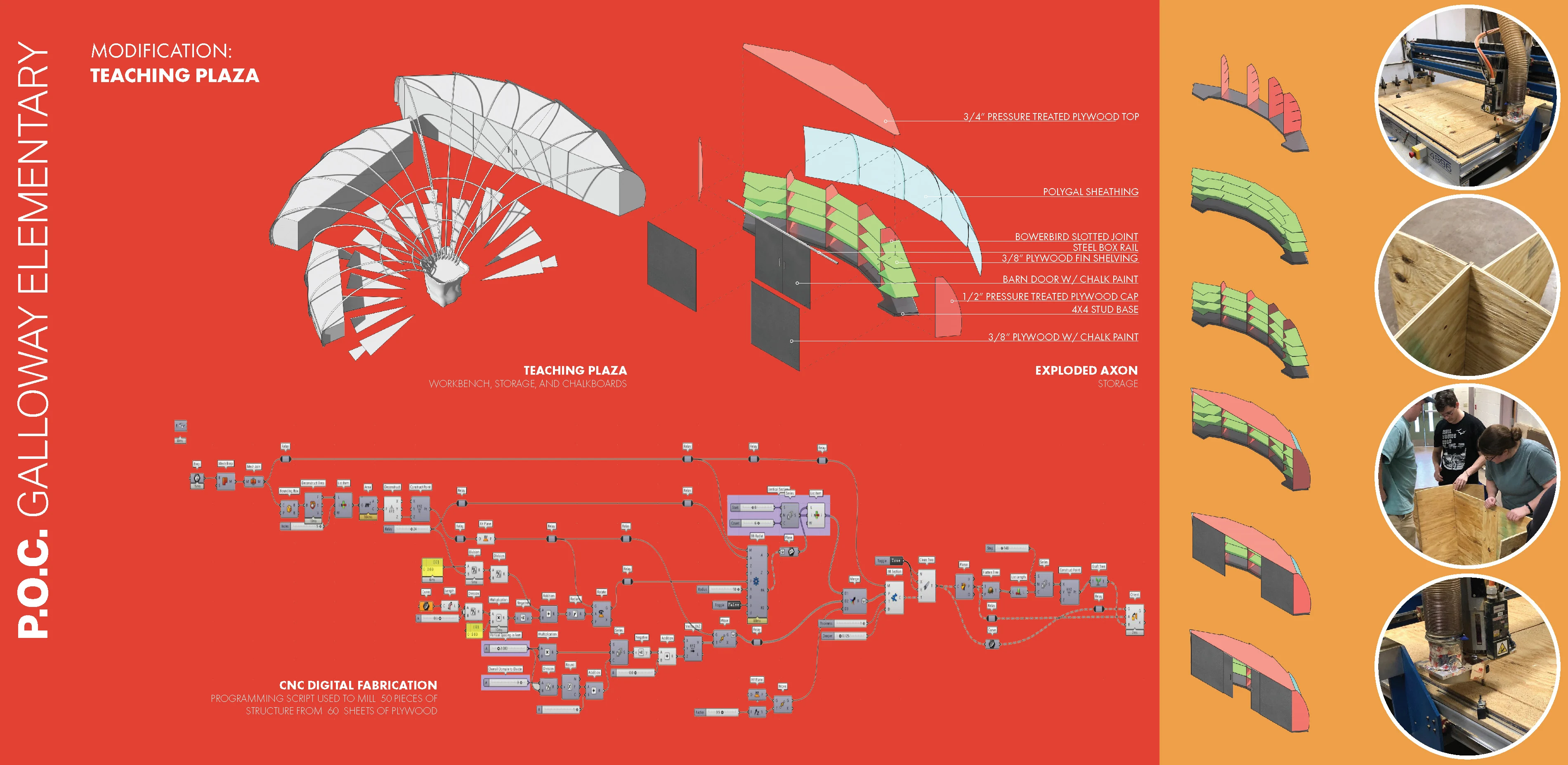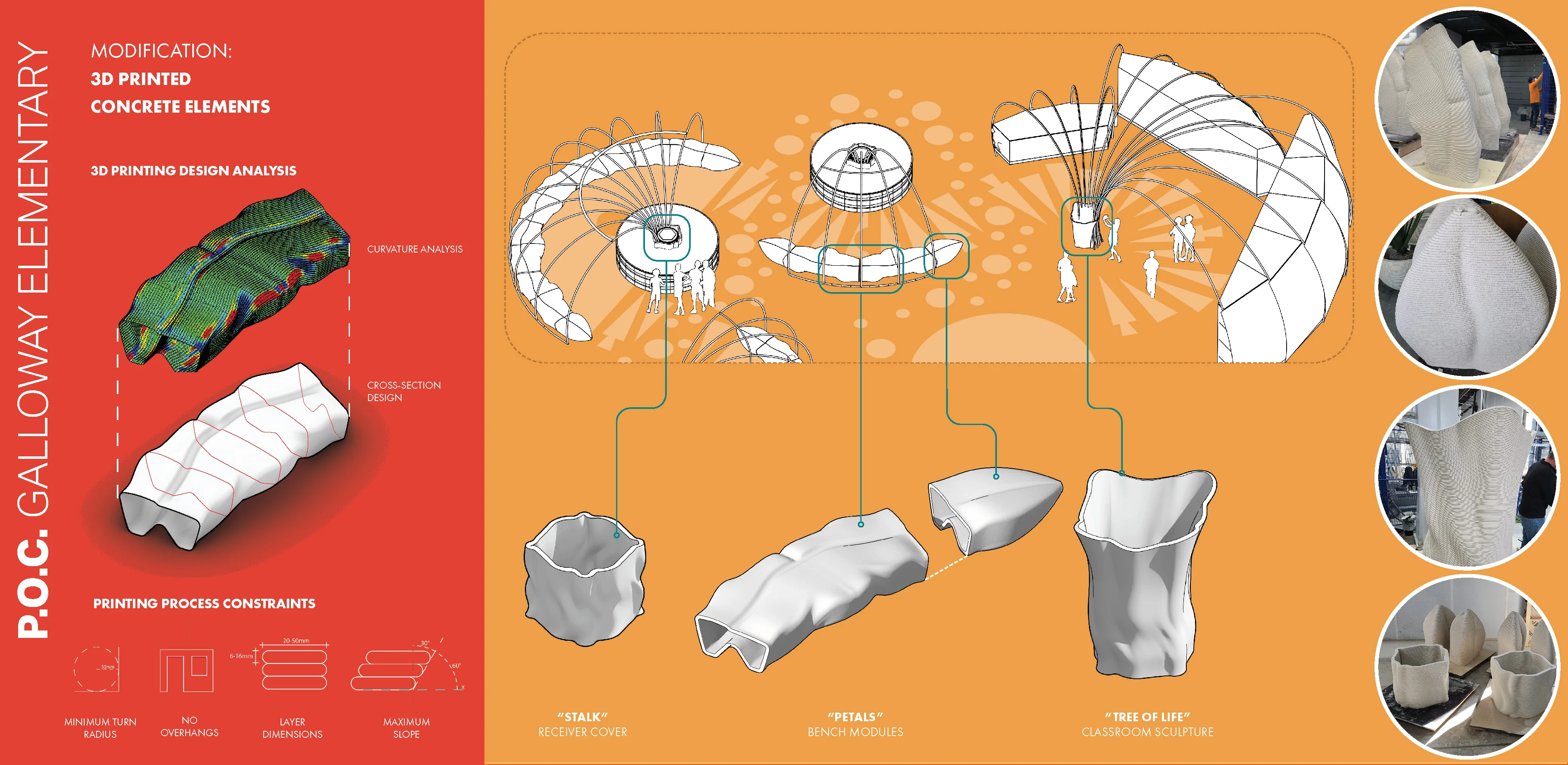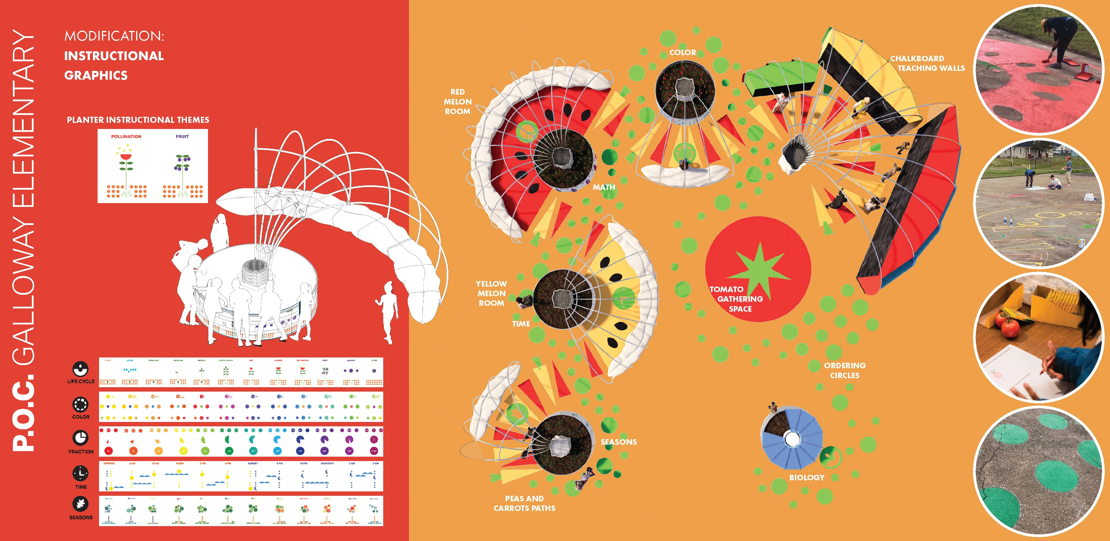 Background: This dynamic, community service, design project began with exploring the potential for a learning garden at an elementary school and evolved into designing a prototype for learning gardens focused on health, food, and nutrition education. Through research into learning gardens’ physical, pedagogical and administrative needs, the team determined that there was a major divide between the way gardens were used and how they were being built. Most applications envision a type of hope garden or miniature farm, designed for production where kids are active “farmers” cultivating the garden throughout the year. While this model has been successfully executed with incredible examples like King Middle School in Berkeley, it is an incredibly resource intense and is beyond the reach of most struggling schools. A study surveying school principals found that funding and maintenance were the two biggest barriers to school learning gardens, and that most of them aren’t used for producing food but learning about it. Phases: 1. Design of a prototype learning garden that meets all of the defined objectives. 2. The adaptation of the design for two proof of concept gardens. 3. Refinement and documentation of the prototype for dissemination. Phase 1: The design process began with meeting with educators and farmers to understand how much space is actually required to teach about food. After about 500 s.f. per class was settled on, the next step was to explore what off-the-shelf resources were available to meet this need. An 8’ diameter trough was decided on as the ideal height, durability, and size for the garden. Looking to high-tunnel design, the team developed a plan for using readily available materials to create a rotated hoop and bench system around the planter. A sub-surface irrigation system was added to the bottom to reduce watering needs. Vinyl tick marks and numbers were planned for the sides of the planter to create 12 growing stations that could be used by one or two students. The resulting design is flexible, adaptable, and easily maintained within a limited budget of under $1,500 in materials. A plan for a cold-frame alternative was also developed which allows classes to start plants from seed and create a mini greenhouse in winter months. Phase 2: The original plan was to execute a design for the existing Galloway Elementary in Jackson, MS based on the typology, but during the semester the new Partnership School in Starkville, MS became interested and offered the opportunity to test the design on a larger scale. For both projects, the team developed a scaled model to facilitate workshops with stakeholders to understand the spatial arrangements of multiple gardens. The Partnership School The 6th and 7th grade Partnership School is planned to open in the fall of 2020. The school is arranged in learning pods, with up to 125 kids per pod. To facilitate the design of the gardens, the team held a workshop with school district teachers, administrators, and the professional design team for the school. Using scaled models on bases, multiple alternatives were developed to create four separate garden pods with six garden typologies each. A preferred, formal plan was chosen by the school district and then turned over to the design team to detail and bid. The gardens are being constructed over the summer and will be open when the school opens this fall. Galloway Elementary The K through 5th grade Galloway Elementary school is located in a USDA classified food desert, surrounded by fast-food chains. The existing school is extremely limited in funding and resources. With a $25,000 budget from an arts grant, the team started the process by engaging the 5th graders in a creative workshop on food nutrition to generate inspiration for the design. An abandoned asphalt playground adjacent to the gym provided the perfect platform for the garden. It was also an opportunity to explore how the typology could be improved to make it more dynamic in terms of design and experience, more flexible in terms of instruction and course delivery, and more interesting in terms of excitement and fun for the students. The garden was planned to be implemented at the end of the semester with volunteers but was delayed due to COVID 19 until the fall. However, all of the components have been fabricated by students and are awaiting installation. 3D Printed Concrete At the beginning of the design, the team reached out to a concrete manufacturer who is developing a new, rapid concrete printing technology. As a partial donation, the company agreed to work with the team to develop an alternative design for the benches and “vases” to hide the hoop receivers. These elements are the first execution of the new technology in the U.S. and use the unprecedented flexibility of the technology to make organic surfaces that turn the planters into giant flowers, where students sit on petals. The team worked with the concrete company to design, refine and print the elements. Planter Instructional Themes Instead of simple ticks and numbers to delineate teaching stations, the team developed a complex lesson plans built on the same 12 station organization. Working with an educator, the team developed five, unique themes that offer lesson plans on time, color, math, biology, and seasons. These themes allow for teachers to use the garden for almost every subject and ensure that the gardens will be used for not just food education, but as an integral part of the classroom. Ground plane Graphics Inspired by drawings of vegetables by school children during the initial workshop, the team explored options on moving students through the space, creating areas for gathering, and facilitating instruction. A plan was developed that moved students through either the peas or carrots path, so that teachers could navigate around other classes already in the garden. Along the path are red and yellow melons that help to distinguish planters. A large 