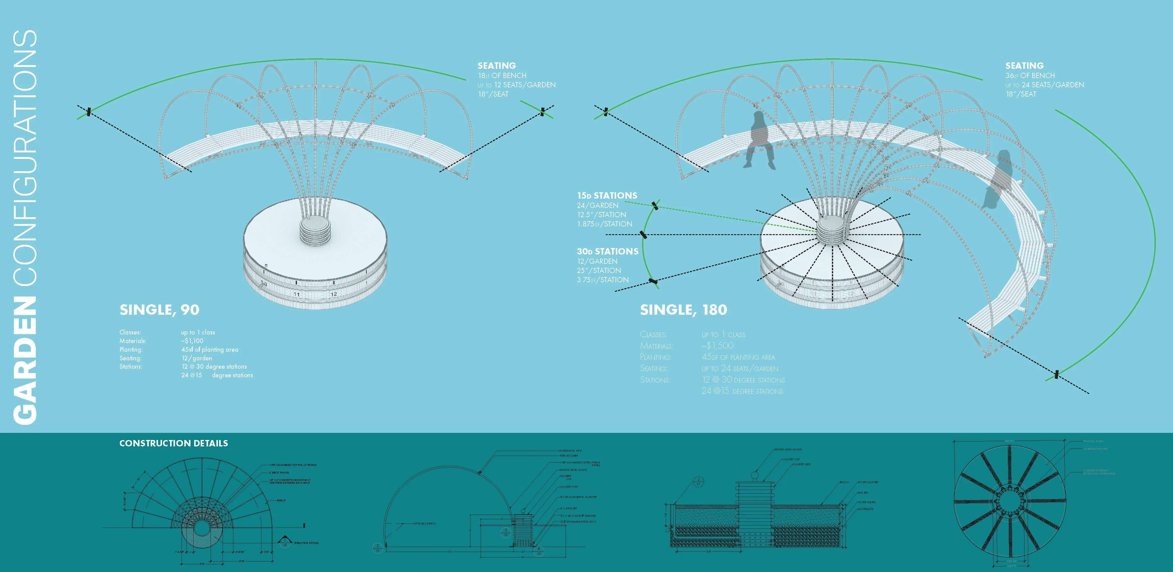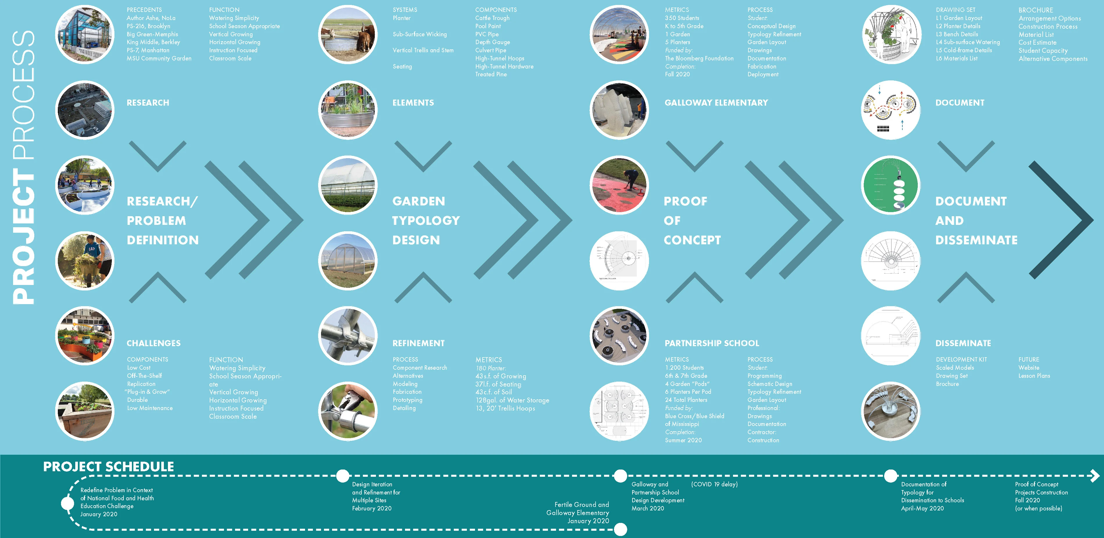 A prototype teaching garden combines low-cost materials with reduced maintenance needs in an easily implementable design. Drawing design inspiration from garden use objectives, the prototype led to two proof-of-concept sites, with feedback from these sites informing refinements to the final product. The studio deployed 3D-printed concrete for infrastructural components of the garden, such as storage space and planters with attached benches, and used graphic treatments to demarcate specific garden zones. Shifting to online instruction in the face of COVID-19, the studio renewed focus on developing documentation for the prototype to allow broad, web-based dissemination.