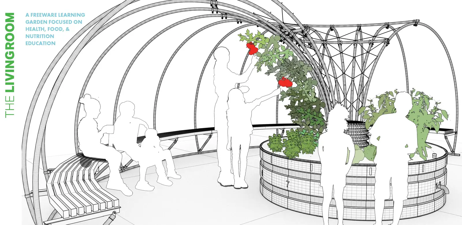 The LivingRoom learning garden attempts to redefine what a learning garden looks like and how it functions by aligning teacher needs with food, health, and nutrition education goals. Materials for the basic typology are readily available for under $1,500.00 and can be implemented at any school using detailed design drawings. Focused on instruction, the garden provides a flexible, expandable, and maintainable approach to giving students the experience of seeing seeds grow into food they can eat. Two proof of concept site designs explore various ways the garden could be scaled, adapted, and refined. The Partnership School garden is formal application and is executed at a grand scale for a large school. While, the Galloway Elementary School garden illustrates approaches to creating a garden experience that is much more than just the individual planters. It also highlights the creative potential of a collaborative process to include expertise from multiple disciplines as graphics, structures, and site design are seamlessly integrated into a unique and dynamic garden for school children.