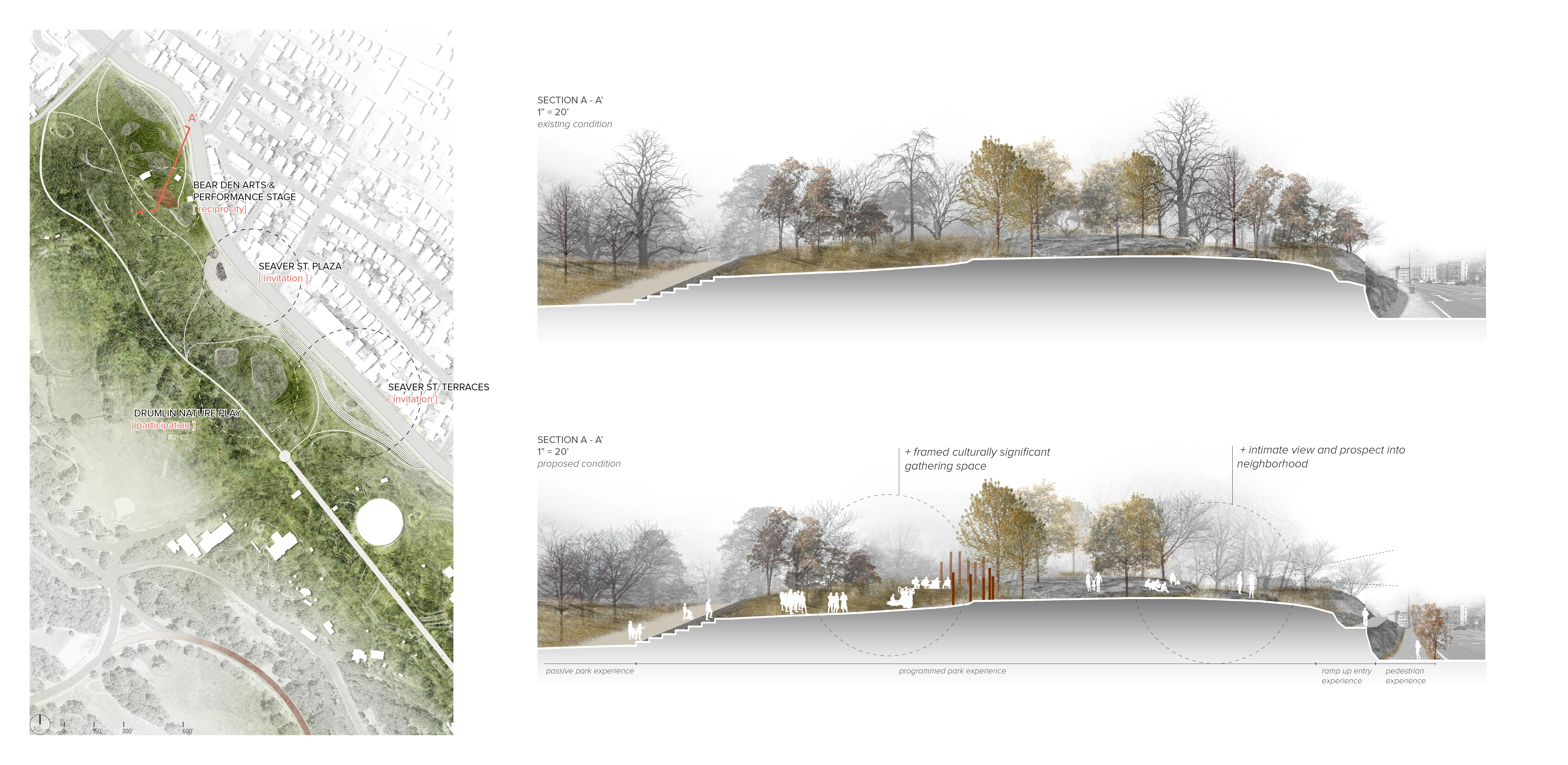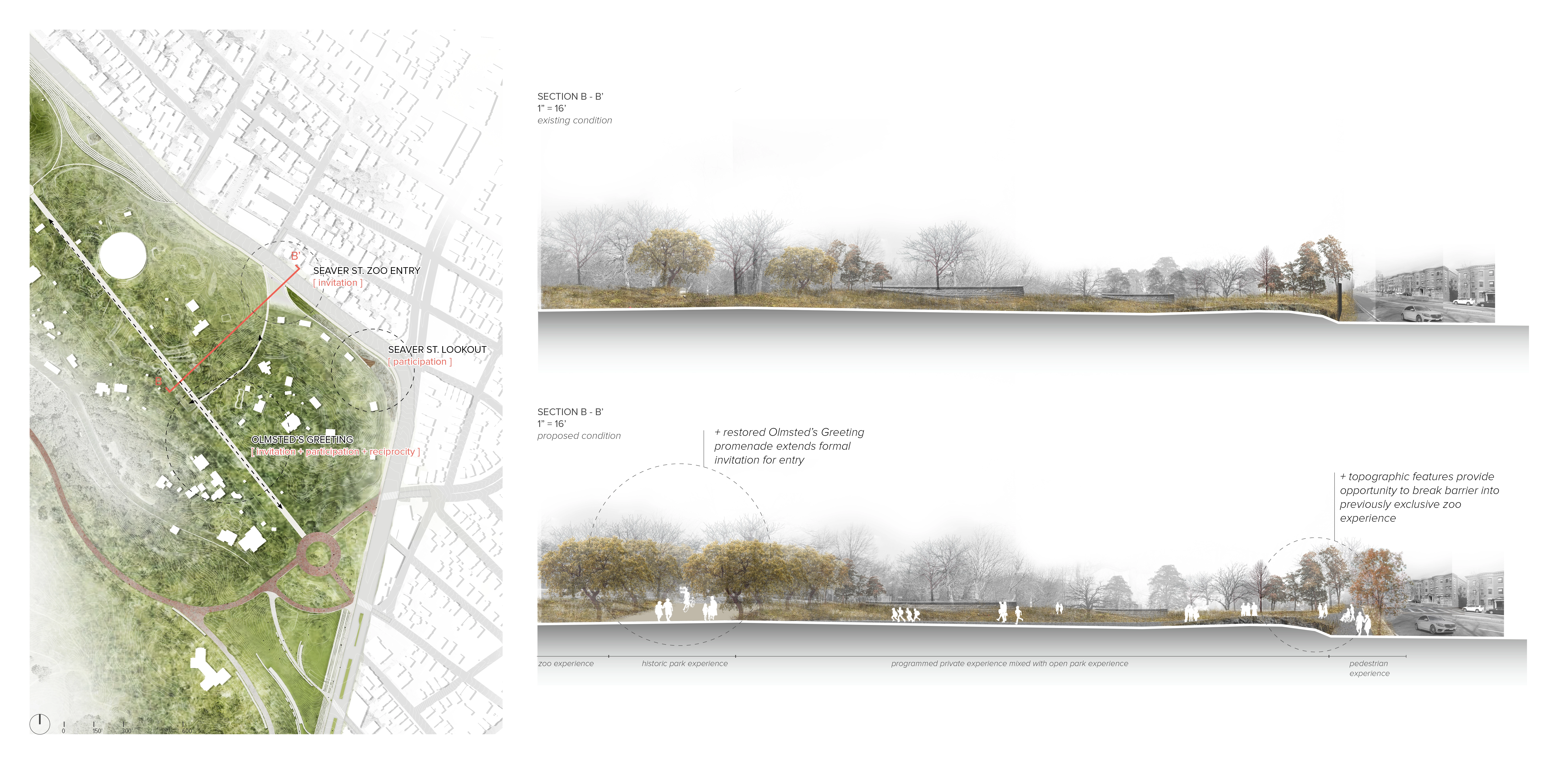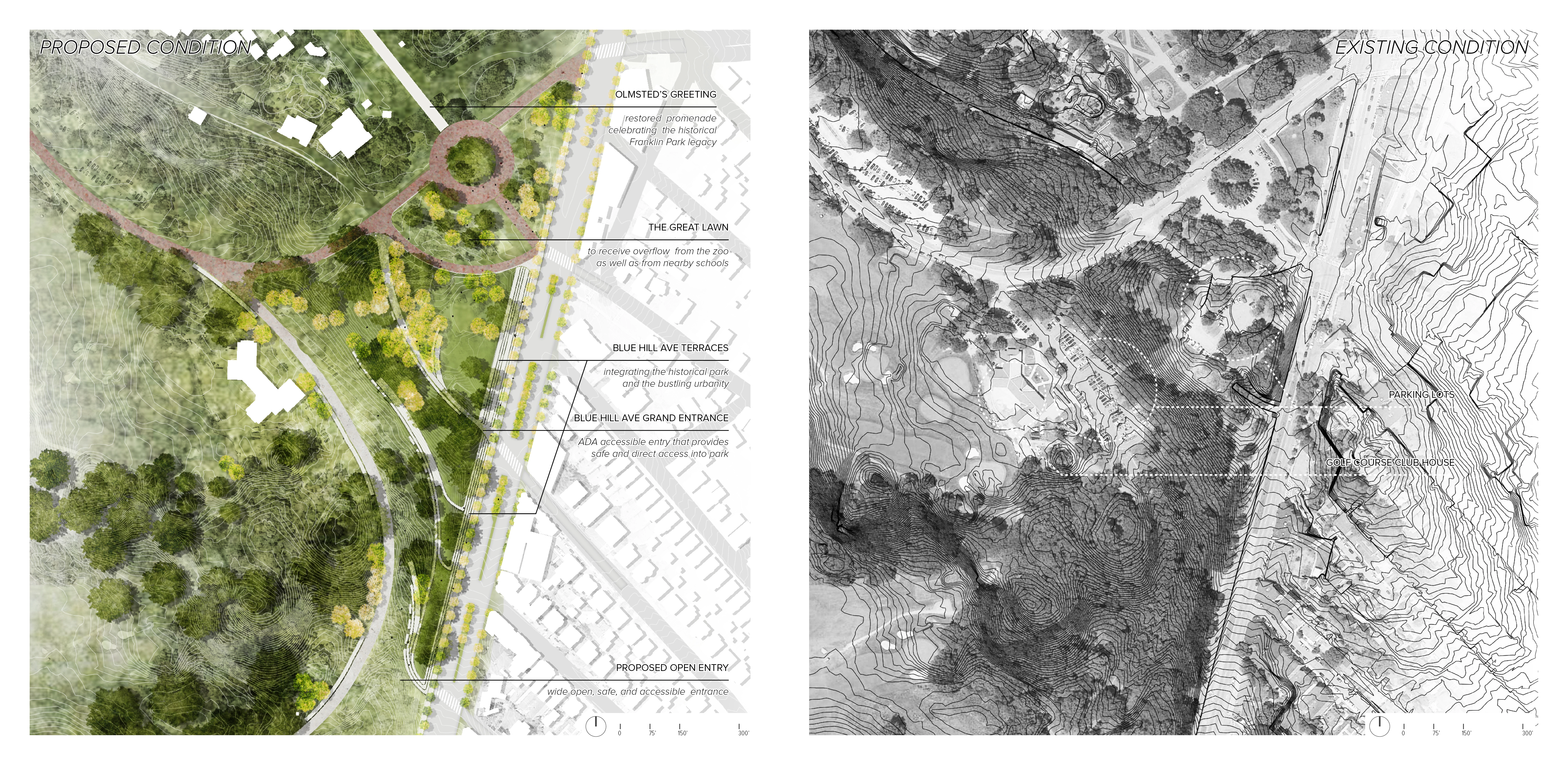 The thesis of the studio, titled ‘A Feminist Lens on Franklin Park’, studies Franklin Park as a basis for broader questions of current landscape practices including the role of a historical, designed landscape, and the value of public space in contemporary city context. These questions, along with the theories of care and inclusivity, as well as challenges of surrounding urban context, influence the approach of the proposal to designing collective spaces that in turn informs a contemporary park adaptation of harmonious inter-connectivity between a large, historical urban park and the surrounding neighborhood fabric, with particular attention to social equity. Franklin Park has a long life that stretches back to the 19th century, and will continue to become one of the most important urban parks as considered in the Boston 2030 Plan. As the ‘crown jewel’ of Emerald Necklace system founded by Frederick Law Olmsted, Franklin Park was envisioned to become a ‘country park’ that offers respite and escape from the bustling city life for the working- and middle-class. Through passage of time, the Park as well as the surrounding urban fabric has gone through waves of changes. Today, the Park sits at the intersection of large yet socially-divided neighborhoods - Jamaica Plain in the West side is a community with largely well-off and educated Caucasian residents; in the East side are neighborhoods including Roxbury, Dorchester, and Mattapan. These communities are struggling with racial, social and economic disparities with a large population of socially vulnerable groups such as people of color, disabilities, low income and education. The physical boundaries aligning the Franklin Park edges, the East and West social-demographic disparities, along with unequal programmatic interests on site, resulted in both tangible and in-tangible barriers to the park, with little to no accessibility and use of the Park along its Eastern edges. The proposal, titled Breaking Barriers, intents to re-envision the edge of Franklin Park to activate the under-utilized spaces to connect and engage with identified potential park users within the surrounding neighborhood fabric. The proposal re-establishes a healthier relationship between the park and adjacent neighborhood through three processional strategies that correspond to and assimilate the process of establishing interpersonal relationships: A. Invitation – by breaking physical barriers to the site and choreographing welcoming entry experiences as the first gesture to encourage Park access. Design operates with existing site topography and geological features to expand and embed gathering opportunities along the edges to provide visual and physical connection between the park the urban context. B. Participation - by breaking the social barriers and provide spatial opportunities for participation in the public realm to maximize encountering, foster interactions, and sparkle conversations that engages in the process of exchange and understanding. Design operates by establishing rich spatial hierarchy through materiality and topographic interventions. C. Reciprocity – by breaking psychological barriers that lends to embracement and acceptance of the Park through establishing resonance, which operates through incorporating context-specific neighborhood characters into the Park system, while enabling the Park to radiate and reflect upon the history and culture of the surrounding urban fabric, enhancing the interconnectivity and sense of belonging. The proposal is testified in three different scales: 1) At the master plan scale, a framework for the proposal imagines four distinct edge conditions of Franklin Park, each considers potential user groups from the surrounding neighborhood and context both inside and outside the park to provide varying Park experiences: 1a. The Neighborhood Edge – focuses on enhancing the intimate relationship between park and neighborhood with ‘backyard’ public spaces that become convenient for daily, habitual use. 1b. The Wilderness Edge - contains the largest amount of forested areas within the Park that are loved by both visitors and neighboring residents, therefore focuses on providing balanced vehicular and pedestrian traffic and equal experience to both outside visitors and neighborhood park users. 1c. The Activities Edge – this part of the site is full of visible drumline geological features and programming of the Park, so the focus is on revealing and maximizing these distinct features to provide the most dynamic entry and gathering experiences. 1d. The Green Edge - is a linear green buffer that is site to a number of heritage trees and has the best view into the rolling hills of the ‘country park’. Therefore, the focus is on blending the edge experience of bustling urban scenery and the feeling of escape into the country park, by framing and allowing views both into and outside of the park. 2) At the Park’s edge scale, design interventions concentrated on the Eastern edge where the Park is least utilized and the neighborhood social-demographic issues are the most prominent. The proposal is then testified through a series of broad gestures that address site-specific design opportunities: Along the proposed Activities Edge, the key edge experience includes adapting the old zoo Bear Den area into a more intimate arts and performance stage that celebrates the art culture of Roxbury neighborhood and the legendary African American activist Elma Lewis, who contributed significantly to Boston’s African American art scene. Another key edge moment investigates breaking barriers at a new entrance to the Franklin Park Zoo by restoring Olmsted’s original plan of ‘The Greeting’, a wide promenade connecting both ends of the zoo, and opening up the promenade for public access and connection. 3) At the scale of human body, the selected site is located at the beginning of the Green Edge immediately south of the Zoo,