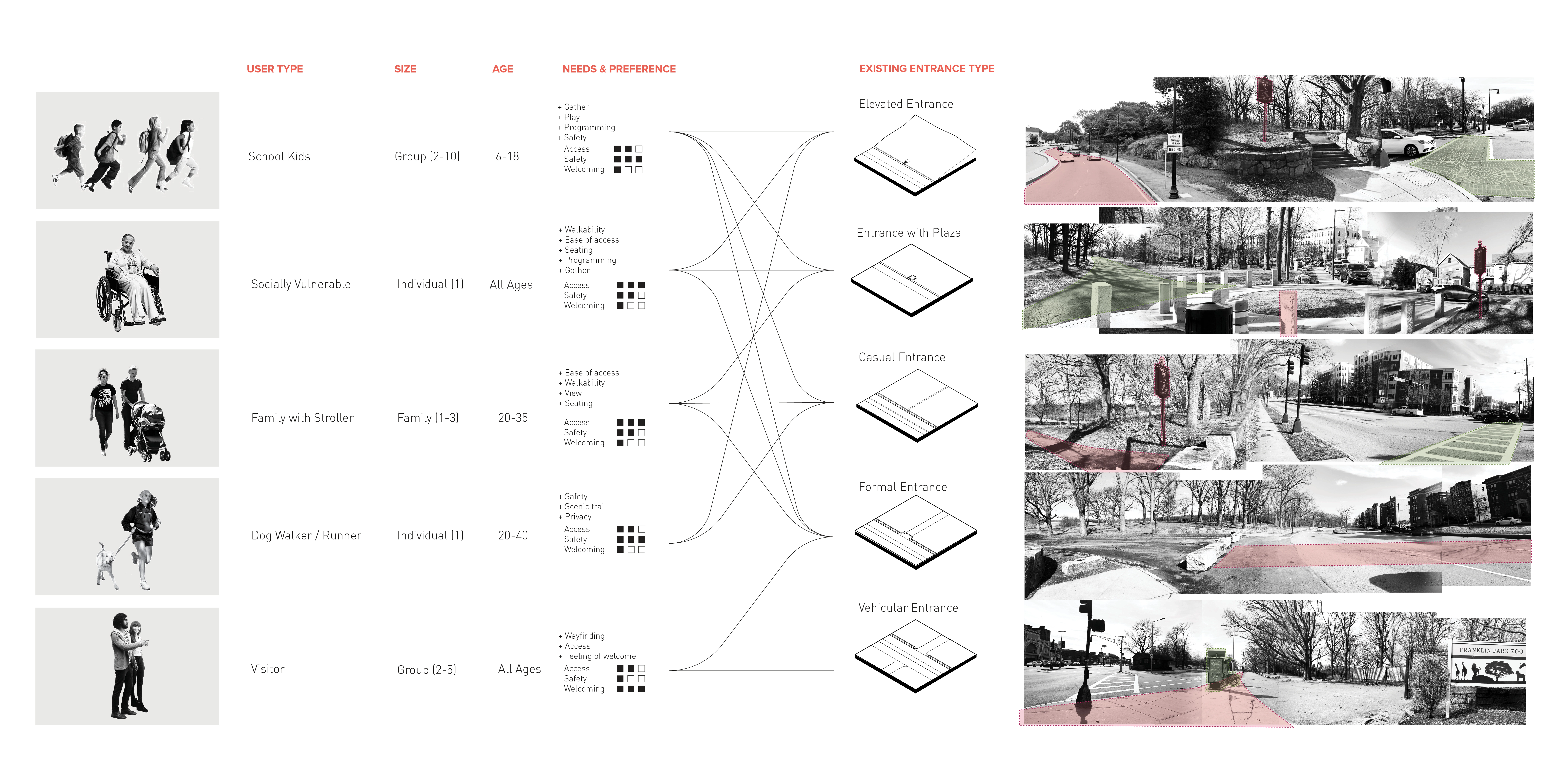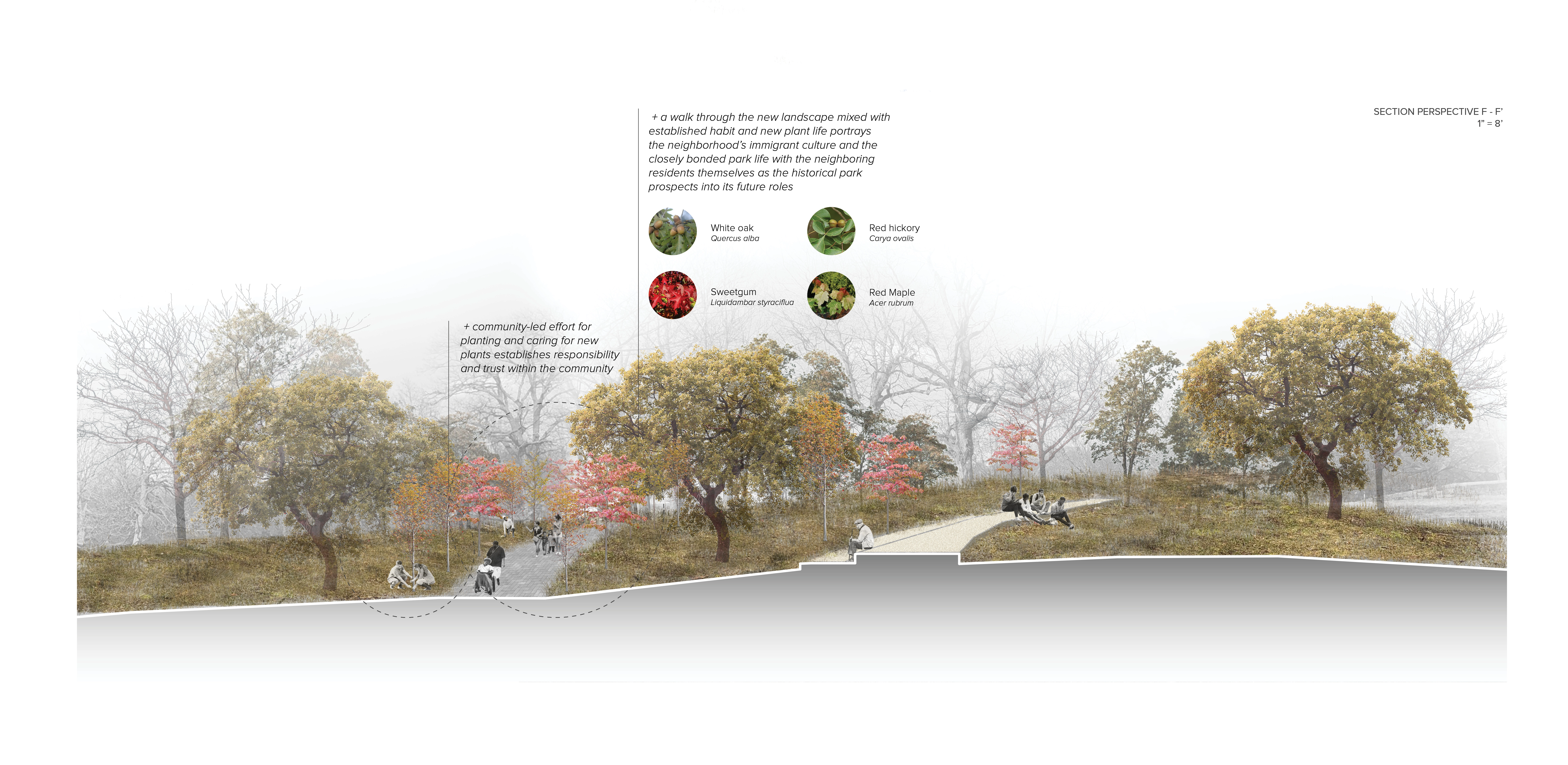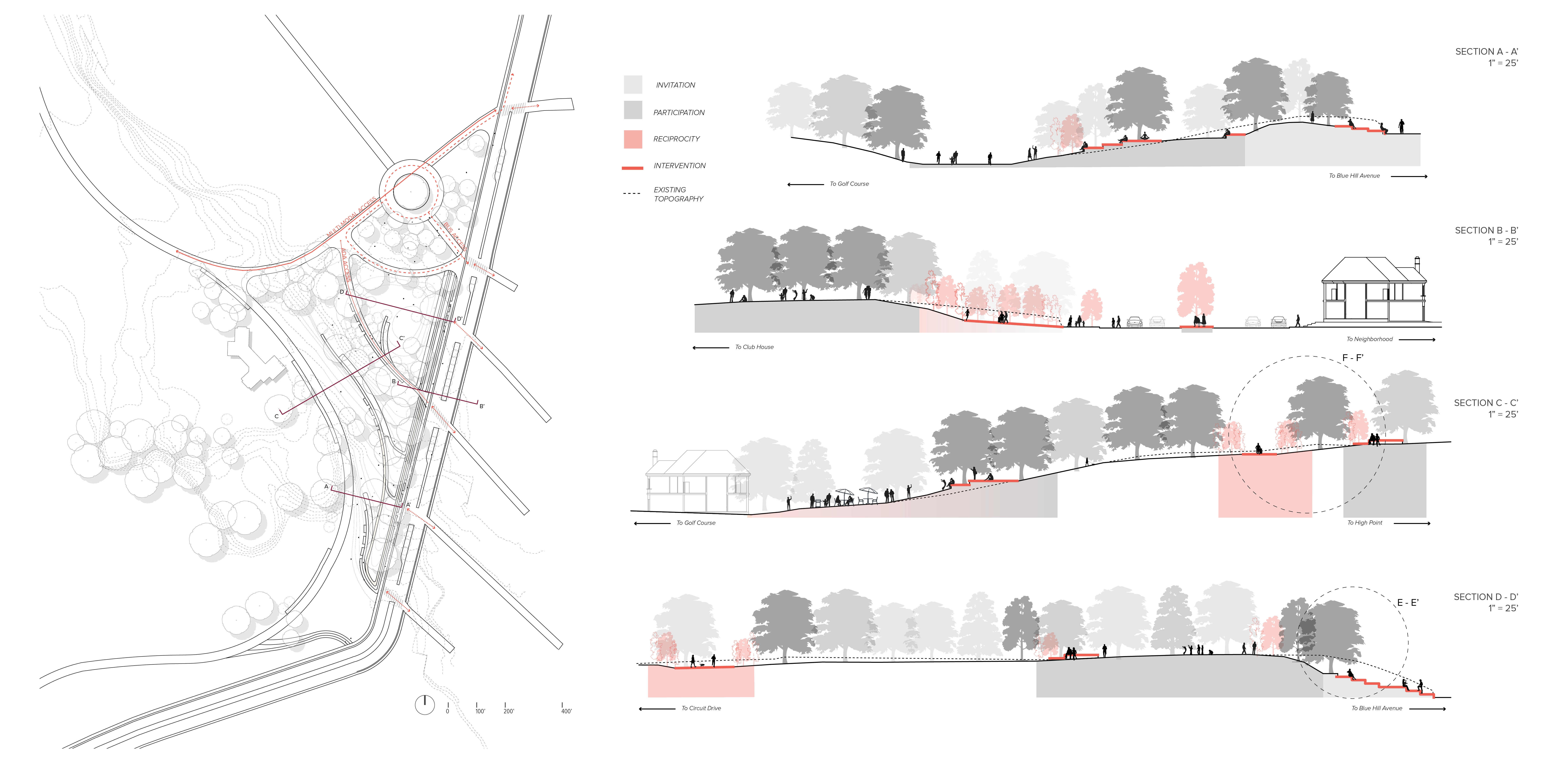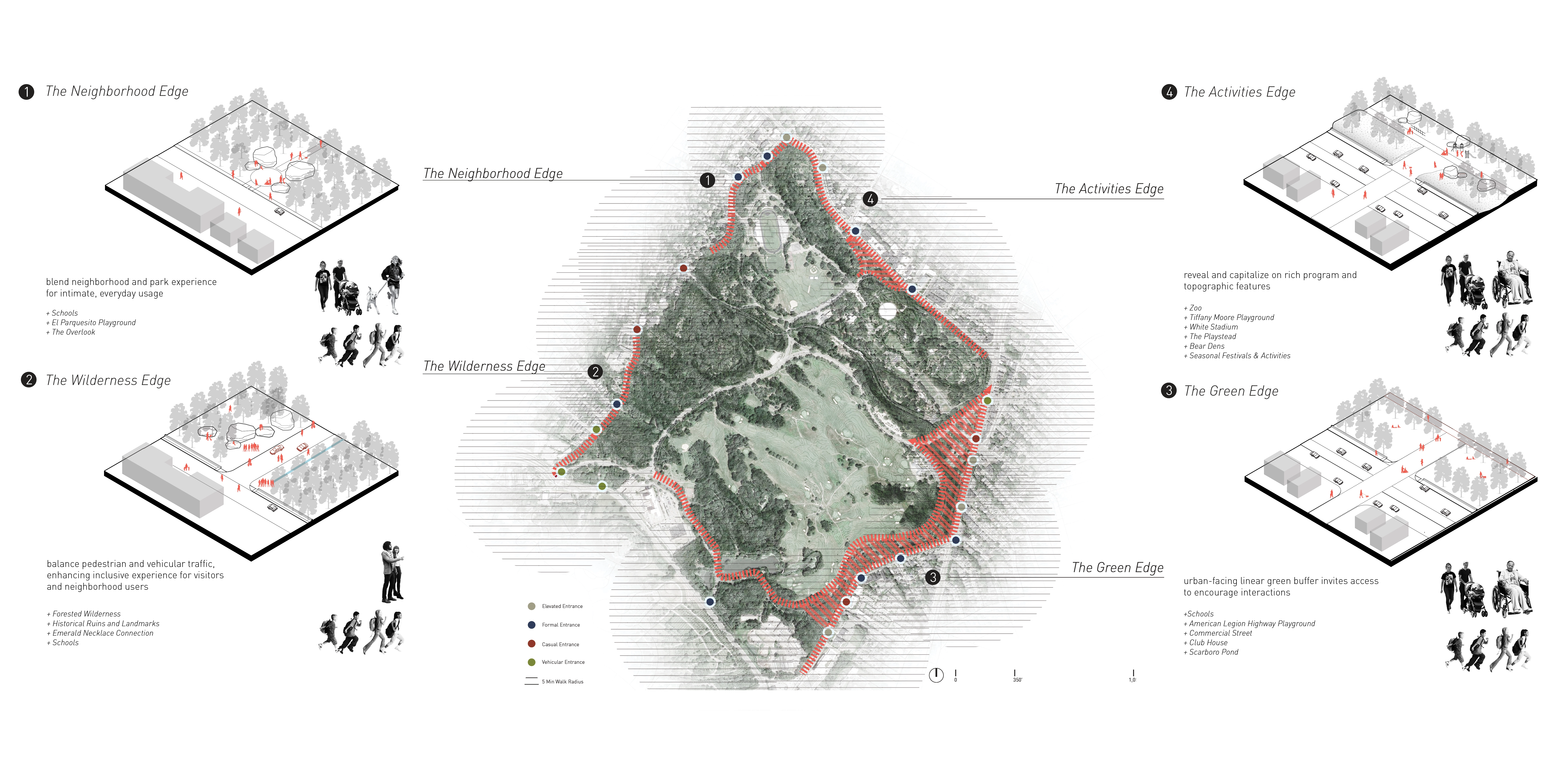 The thesis of the studio, titled ‘A Feminist Lens on Franklin Park’, studies Franklin Park as a basis for broader questions of current landscape practices including the role of a historical, designed landscape, and the value of public space in contemporary city context. These questions, along with the theories of care and inclusivity, as well as challenges of surrounding urban context, influence the approach of the proposal to designing collective spaces that in turn informs a contemporary park adaptation of harmonious inter-connectivity between a large, historical urban park and the surrounding neighborhood fabric, with particular attention to social equity. Franklin Park has a long life that stretches back to the 19th century, and will continue to become one of the most important urban parks as considered in the Boston 2030 Plan. As the ‘crown jewel’ of Emerald Necklace system founded by Frederick Law Olmsted, Franklin Park was envisioned to become a ‘country park’ that offers respite and escape from the bustling city life for the working- and middle-class. Through passage of time, the Park as well as the surrounding urban fabric has gone through waves of changes. Today, the Park sits at the intersection of large yet socially-divided neighborhoods - Jamaica Plain in the West side is a community with largely well-off and educated Caucasian residents; in the East side are neighborhoods including Roxbury, Dorchester, and Mattapan. These communities are struggling with racial, social and economic disparities with a large population of socially vulnerable groups such as people of color, disabilities, low income and education. The physical boundaries aligning the Franklin Park edges, the East and West social-demographic disparities, along with unequal programmatic interests on site, resulted in both tangible and in-tangible barriers to the park, with little to no accessibility and use of the Park along its Eastern edges. The proposal, titled Breaking Barriers, intents to re-envision the edge of Franklin Park to activate the under-utilized spaces to connect and engage with identified potential park users within the surrounding neighborhood fabric. The proposal re-establishes a healthier relationship between the park and adjacent neighborhood through three processional strategies that correspond to and assimilate the process of establishing interpersonal relationships: A. Invitation – by breaking physical barriers to the site and choreographing welcoming entry experiences as the first gesture to encourage Park access. Design operates with existing site topography and geological features to expand and embed gathering opportunities along the edges to provide visual and physical connection between the park the urban context. B. Participation - by breaking the social barriers and provide spatial opportunities for participation in the public realm to maximize encountering, foster interactions, and sparkle conversations that engages in the process of exchange and understanding. Design operates by establishing rich spatial hierarchy through materiality and topographic interventions. C. Reciprocity – by breaking psychological barriers that lends to embracement and acceptance of the Park through establishing resonance, which operates through incorporating context-specific neighborhood characters into the Park system, while enabling the Park to radiate and reflect upon the history and culture of the surrounding urban fabric, enhancing the interconnectivity and sense of belonging. The proposal is testified in three different scales: 1) At the master plan scale, a framework for the proposal imagines four distinct edge conditions of Franklin Park, each considers potential user groups from the surrounding neighborhood and context both inside and outside the park to provide varying Park experiences: 1a. The Neighborhood Edge – focuses on enhancing the intimate relationship between park and neighborhood with ‘backyard’ public spaces that become convenient for daily, habitual use. 1b. The Wilderness Edge - contains the largest amount of forested areas within the Park that are loved by both visitors and neighboring residents, therefore focuses on providing balanced vehicular and pedestrian traffic and equal experience to both outside visitors and neighborhood park users. 1c. The Activities Edge – this part of the site is full of visible drumline geological features and programming of the Park, so the focus is on revealing and maximizing these distinct features to provide the most dynamic entry and gathering experiences. 1d. The Green Edge - is a linear green buffer that is site to a number of heritage trees and has the best view into the rolling hills of the ‘country park’. Therefore, the focus is on blending the edge experience of bustling urban scenery and the feeling of escape into the country park, by framing and allowing views both into and outside of the park. 2) At the Park’s edge scale, design interventions concentrated on the Eastern edge where the Park is least utilized and the neighborhood social-demographic issues are the most prominent. The proposal is then testified through a series of broad gestures that address site-specific design opportunities: Along the proposed Activities Edge, the key edge experience includes adapting the old zoo Bear Den area into a more intimate arts and performance stage that celebrates the art culture of Roxbury neighborhood and the legendary African American activist Elma Lewis, who contributed significantly to Boston’s African American art scene. Another key edge moment investigates breaking barriers at a new entrance to the Franklin Park Zoo by restoring Olmsted’s original plan of ‘The Greeting’, a wide promenade connecting both ends of the zoo, and opening up the promenade for public access and connection. 3) At the scale of human body, the selected site is located at the beginning of the Green Edge immediately south of the Zoo,