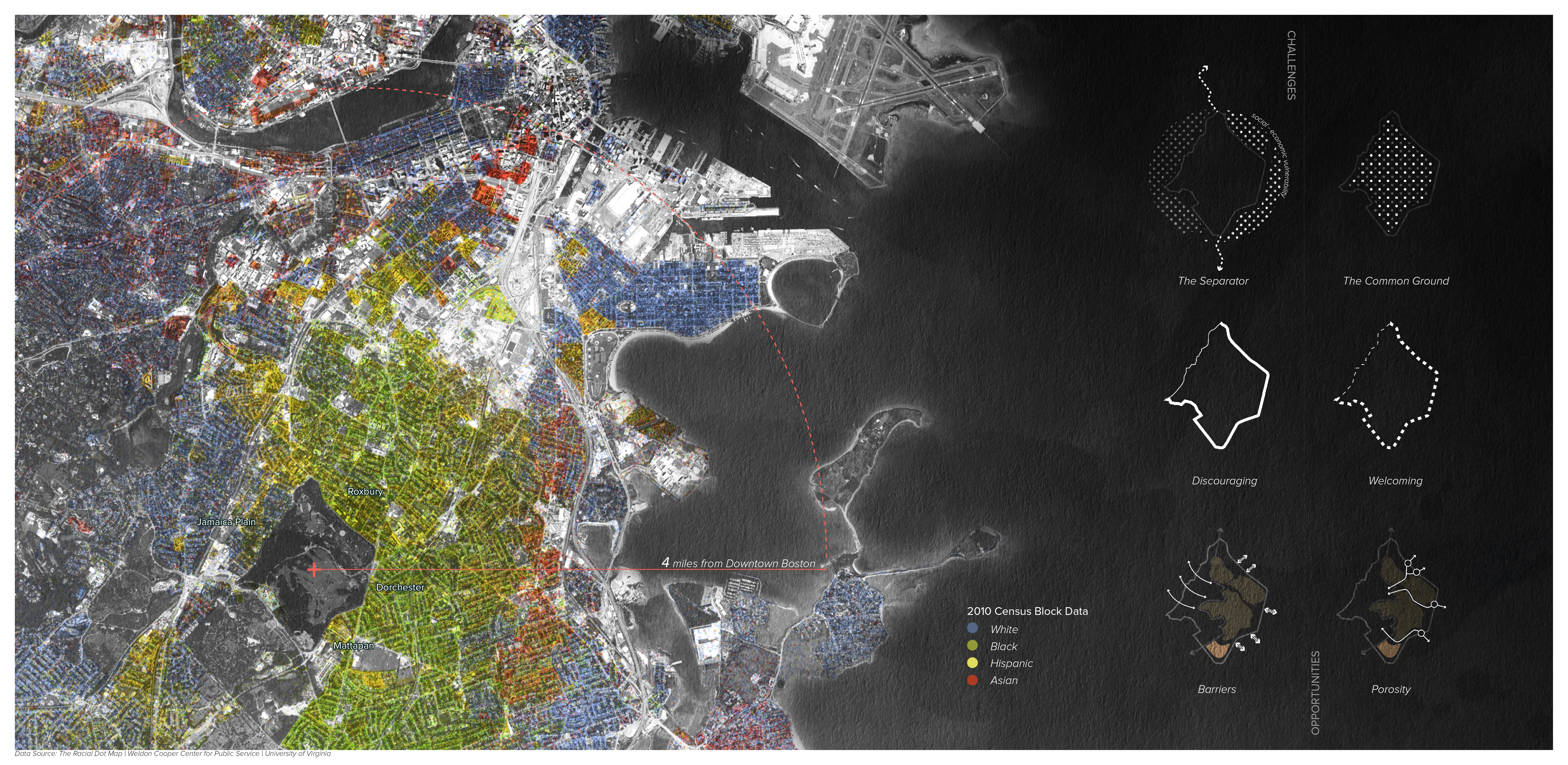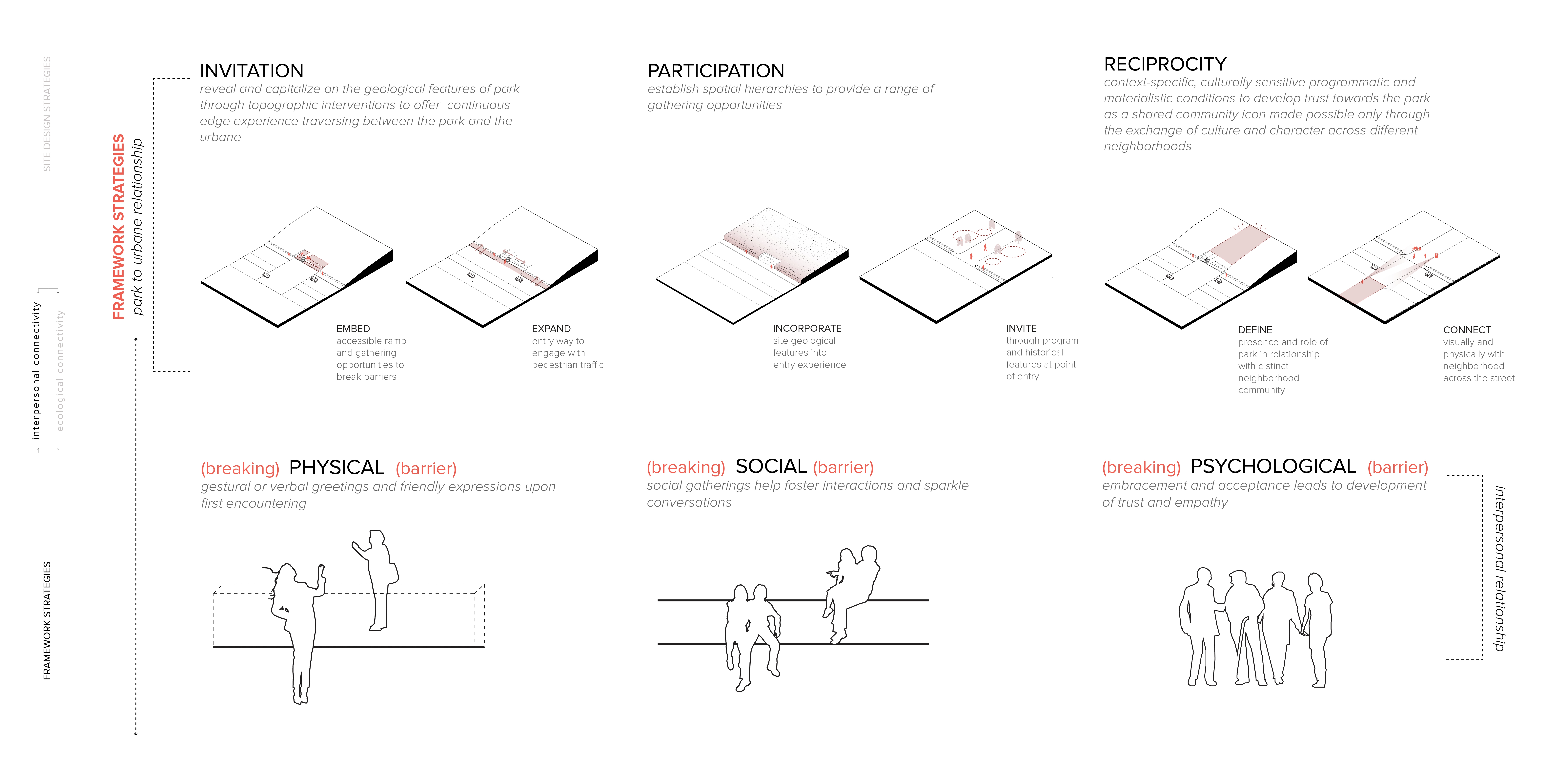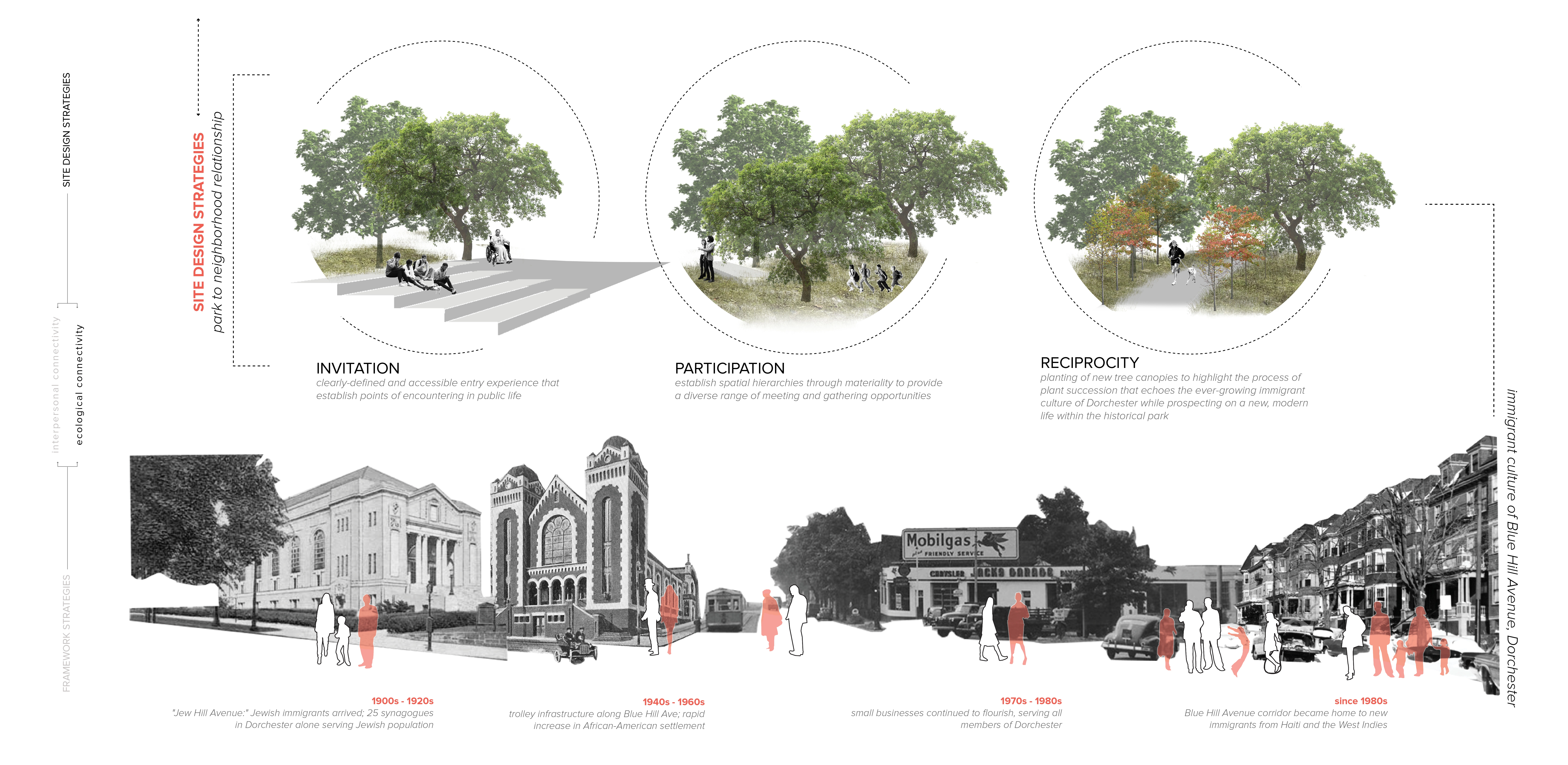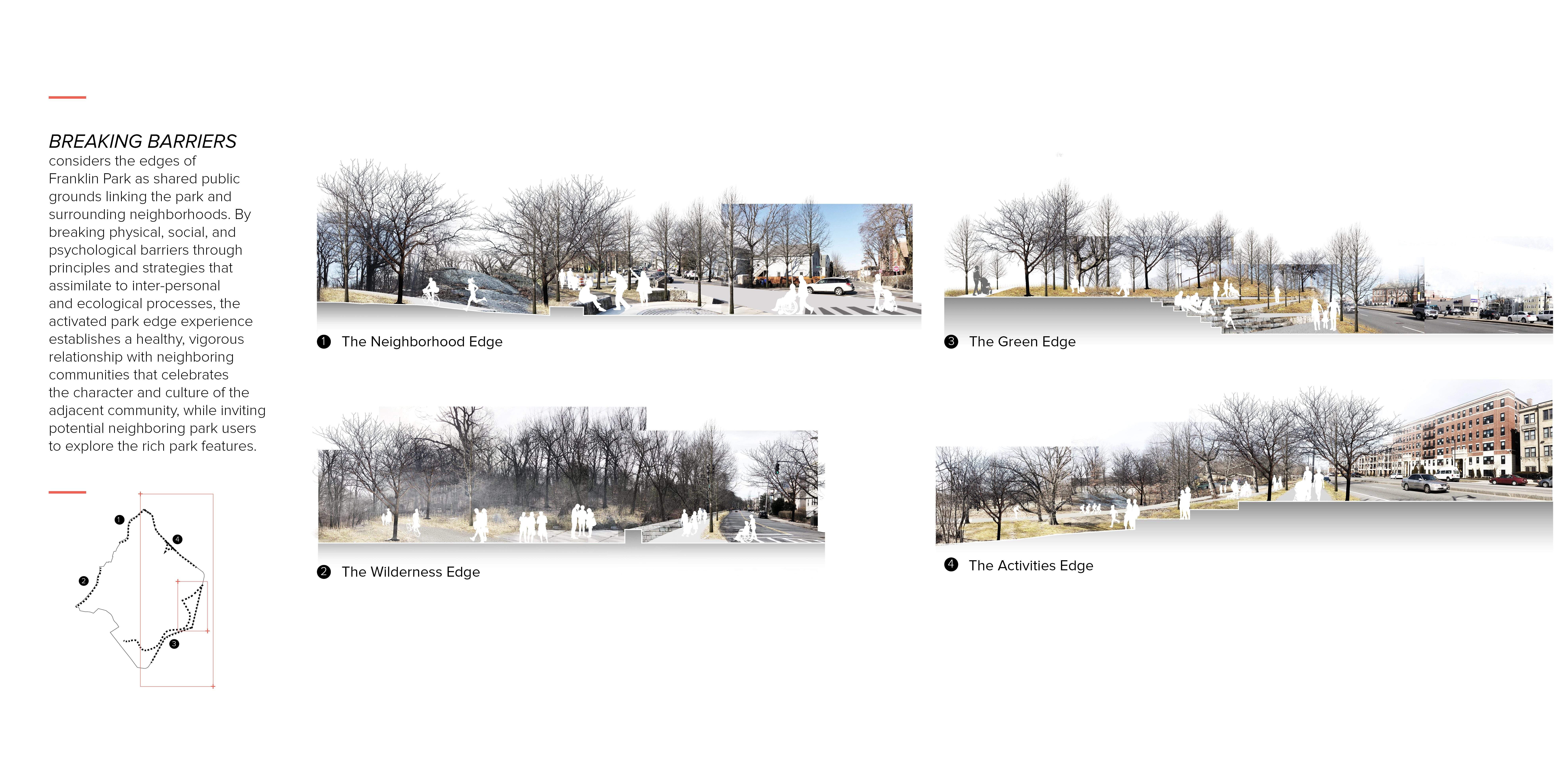 Breaking Barriers is a design proposal that envisions Franklin Park as a shared natural asset welcoming diverse neighborhood community through activating the Park’s edges. The edges function as public ground celebrating the culture and character of each adjacent neighborhood, while inviting potential neighboring park users to explore the rich park features. The proposal is executed through a procession of strategies that correspond to inter-personal relationship-building processes including: a) invitation – aims to break physical barriers of the park through choreographing inviting and pedestrian-friendly Park entry experiences. b) participation – aims to break social barriers of the Park through establishing various gathering opportunities suitable for a wide range of social needs to maximize interactions amongst community members. c) reciprocity – aims to break psychological barriers by establishing context-specific and culturally sensitive connections between the Park and the surrounding neighborhood fabric. Through establishing a thickened edge experience, Breaking Barriers aims to carry on Olmsted’s legacy Franklin Park vision that marks the beginning of the ‘country park’ experience welcoming people of all gender, color, and social status.