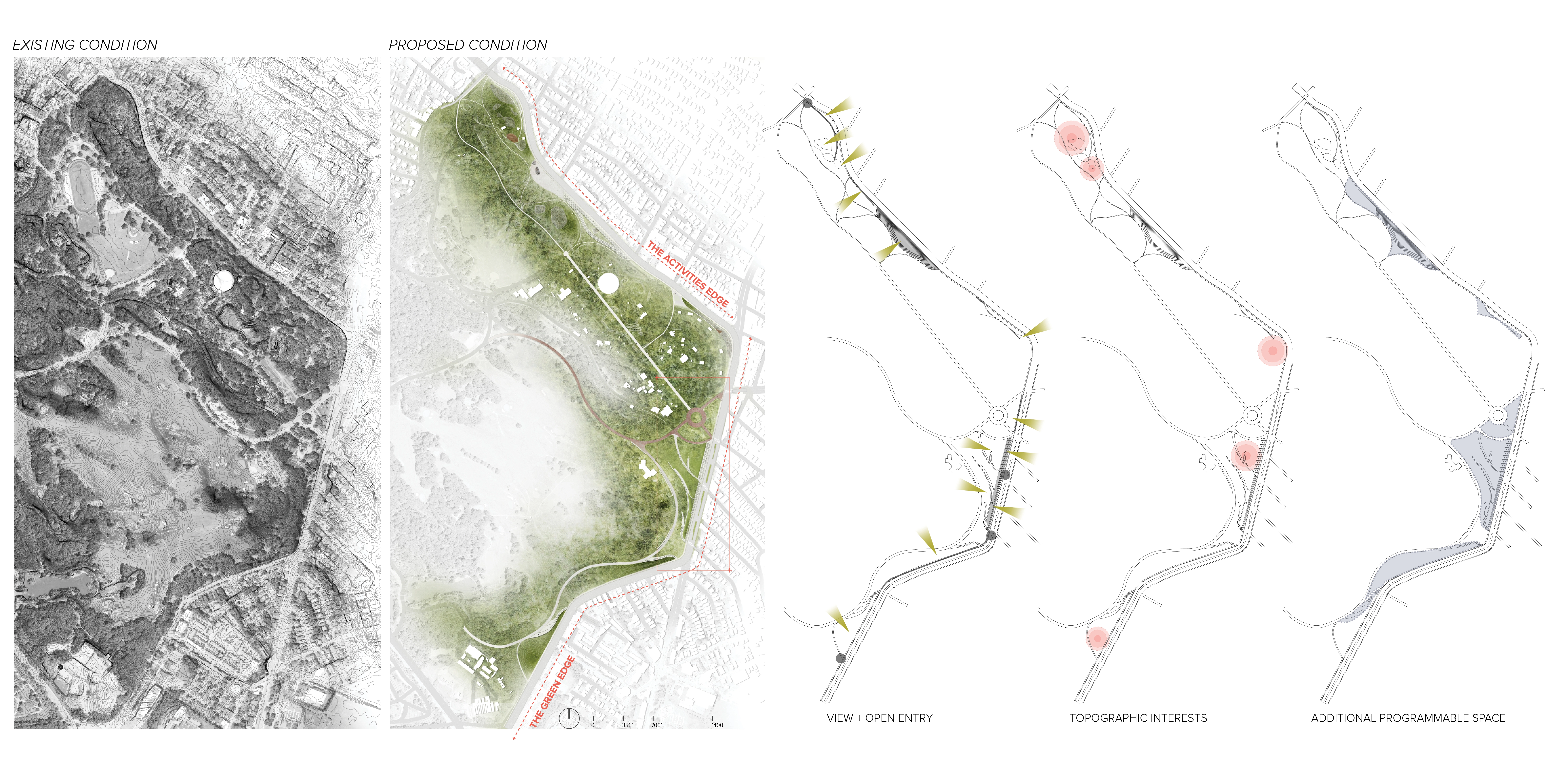The work of Frederick Law Olmsted is often considered canonical in the landscape architecture field, yet his design for Franklin Park deserves revisiting with a contemporary lens. Walled off from neighborhoods along its eastern edge, the park effectively turns its back on the socially vulnerable residents. By opening up entrances along this edge, the park would nurture neighborly relationships and invite daily use, creating a vast, public backyard for residents who may not have their own. By rethinking Franklin Park in its current context, and modifying the park to allow more equitable access to it, this project fulfills Olmsted’s welcoming vision with updated design.