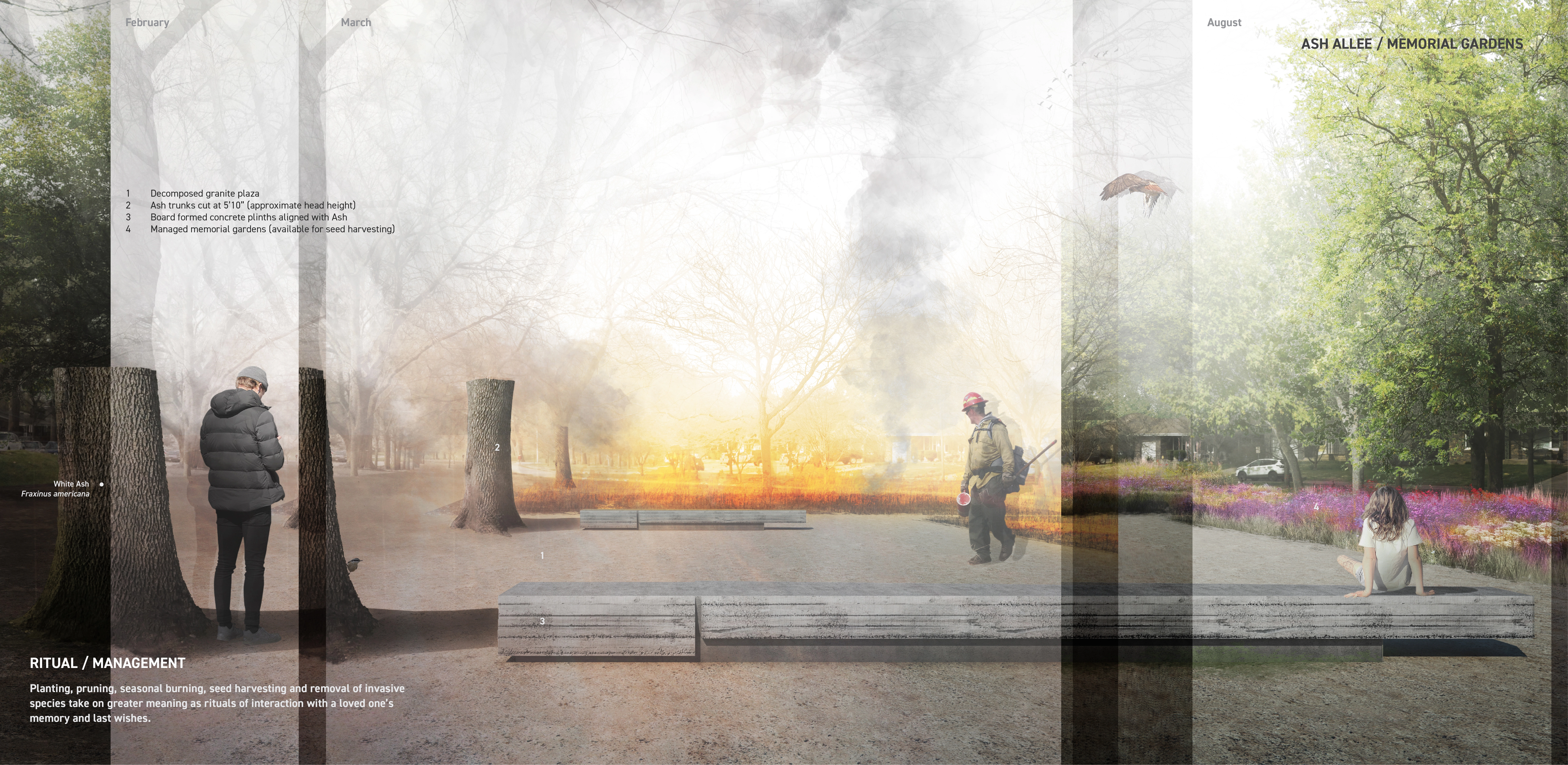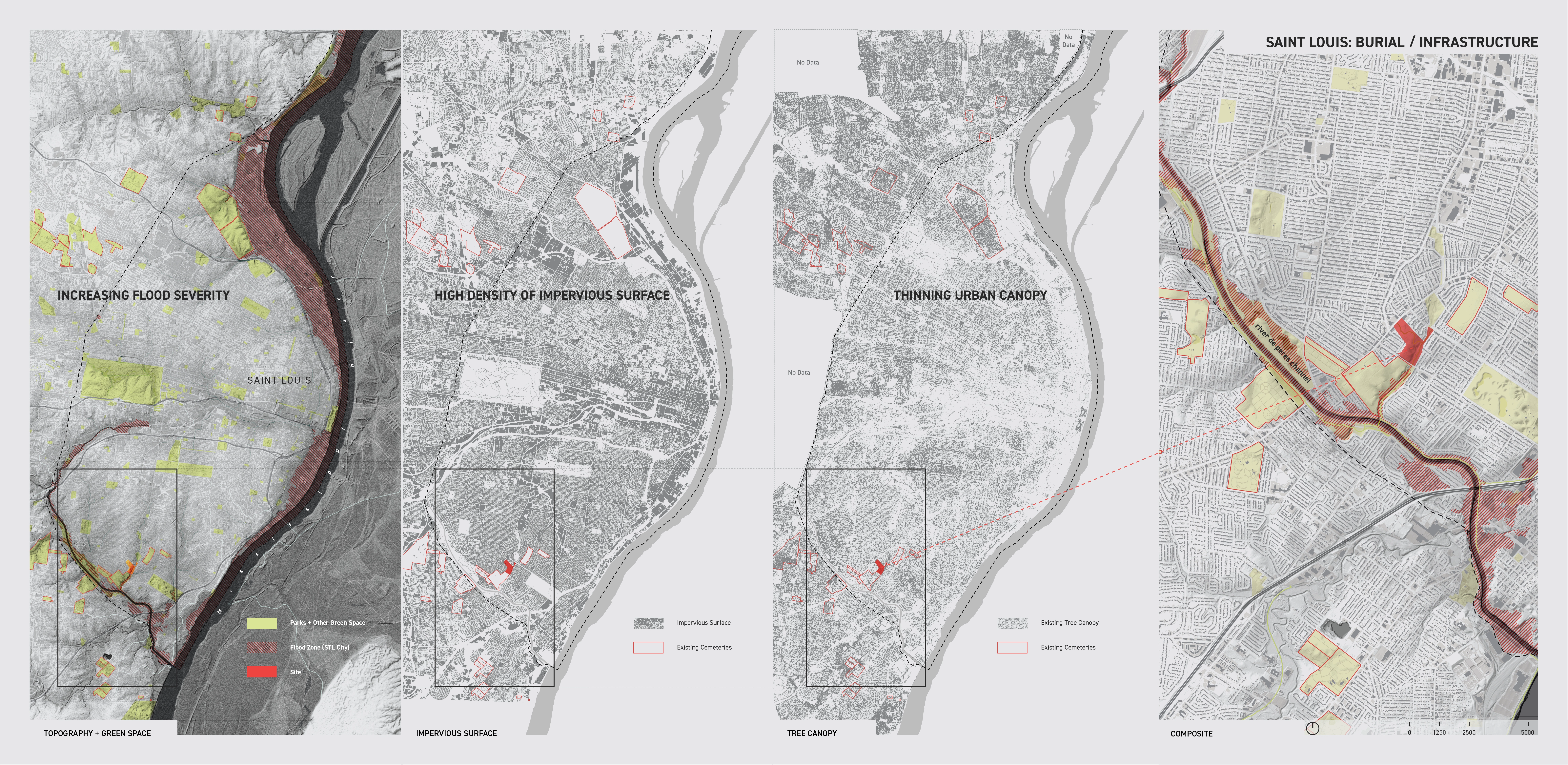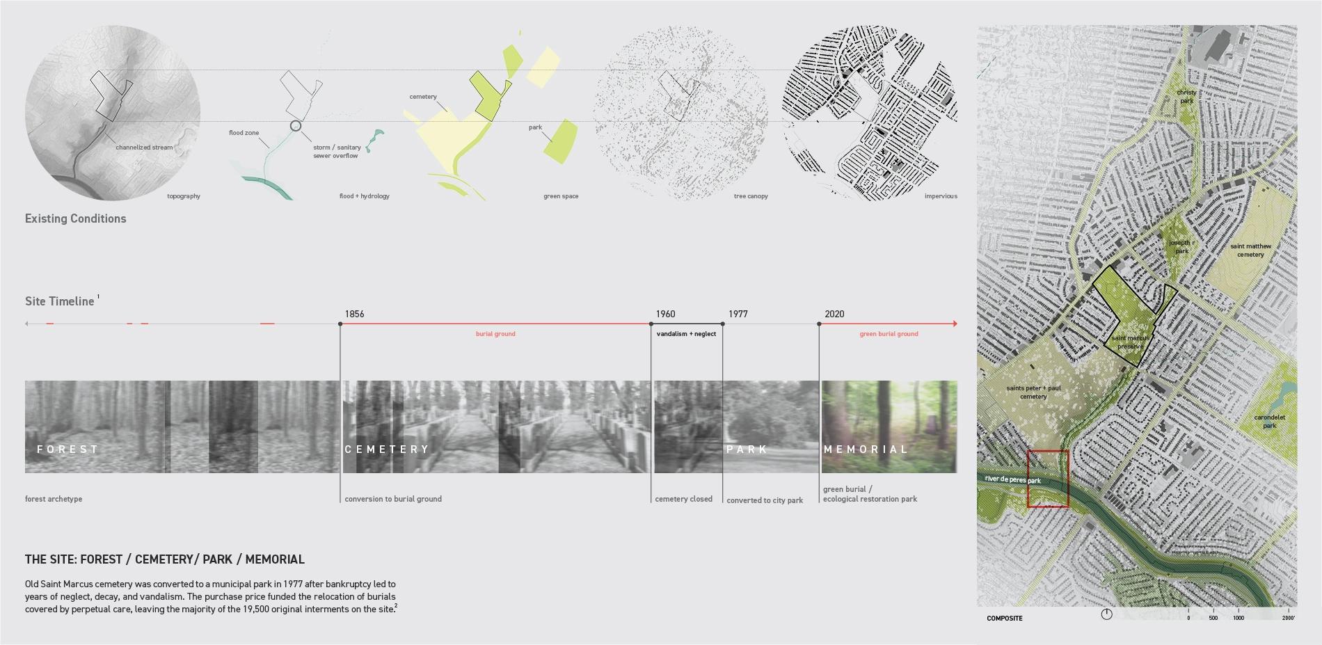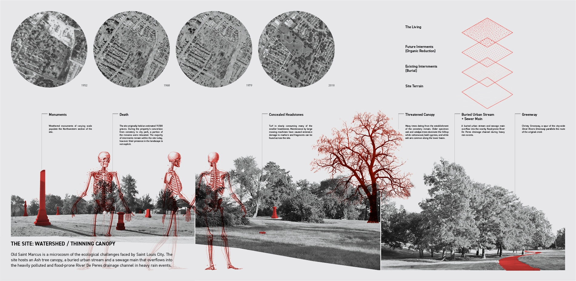 Dark Matter, a research by design thesis, investigates organic reduction (composting) of human remains as a means of promoting biological and cultural diversity in urban cemeteries. The project is a comprehensive application of technological advancements within the green funeral industry to a site in the Boulevard Heights neighborhood of Saint Louis, Missouri. While the project cites and assumes the physical realities of the method pioneered by Katrina Spade and her company Recompose, the proposal imagines an accompanying landscape that accommodates the material application, the subsequent adaptation of cultural practices and the concerns of the recently deceased who have opted for this environmentally ethical funeral process. The design intervention seeks to dovetail this new typology of memorial landscape into the complexities of an existing burial site, neighborhood and city. The practices of the contemporary American funeral industry come at a high financial and environmental cost. A standard burial averages $9,900; cremation with visitation is commonly above $6,000. Over 800,000 gallons of embalming fluids are buried in the United States annually, including formaldehyde, a known carcinogen. Additionally, 115 million tons of steel and the equivalent of 4 million forest acres of hardwood are buried in casket constructions. The most robust barrier between body and soil is the concrete vault, a common requirement from cemeteries or municipalities. Vault construction commits 2.3 billion tons of concrete to the earth every year. Commonly thought of as a more environmentally friendly option, cremation also leaves a troubling environmental legacy. Cremation is energy intensive, and the majority of crematoriums operate on fossil fuels. Emissions from a crematorium deliver a cocktail of chemicals, persistent organic pollutants, NMVocs and trace heavy metals such as mercury into the atmosphere. The popularity of ‘green burials’ have steadily increased in the United States over the last two decades. Green burial practices minimize negative environmental impacts through forgoing the use of embalming fluids and requiring that only non-toxic and biodegradable materials accompany the body in the earth. In an additional step towards environmental responsibility, conservation cemeteries have committed burial fees to establish and grow public land trusts that preserve ecosystems and prohibit future development. The recently legalized practice of organic reduction relies on thermophyllic microbial activity to transform human tissue and bone into inert soil-like organic material over the span of 4-6 weeks. This transformation occurs down to a molecular level, and results in the complete dissolution of the human body prior to interment. SITE The proposed site, Old Saint Marcus Cemetery, is situated within a larger history of displacement and trauma associated with Saint Louis’s burial grounds. Originally a German Evangelical cemetery, Saint Marcus is one of a constellation of the oldest remaining cemeteries along the political border of Saint Louis City and County. Their geographical arrangement is a result of successive cholera epidemics, disproportionate investment, predacious development, and the city’s tortured history of racial suppression, segregation and disenfranchisement from slavery through the present. The dead were not exempt from the changing city’s impositions. Older urban burial grounds were routinely exhumed and bodies relocated to the perimeter of the growing city, only to be encroached upon and surrounded anew. Many older cemeteries have experienced bankruptcy and subsequent decline. Saint Marcus was converted to a city park in 1977 after bankruptcy led to years of neglect, decay, and vandalism. The purchase funded relocation of burials under perpetual care, but left the majority of the original 19,500 interments on site. The original layout of cemetery paths and roads were removed and a curving path was installed to link the commercial Gravois Avenue to the North with the greenway and residential neighborhoods to the South. Large scale monuments and headstones remain on site though turf is slowly consuming many of the smaller markers. Saint Marcus hosts a microcosm of ecological challenges faced by the Saint Louis region. The most critical is the deterioration of the city’s urban tree canopy and an increasing frequency and severity of flood events. EXPANDED FIELD OF GRIEF In the anthropocene, an era of mass extinction, global pandemic, and accelerating climate change, an individual’s commitment to an environmentally ethical funeral practice is a deeply intentional final act that bares profound concern and empathy for the world they are leaving. The process of organic reduction removes any conceit of somatic permanence and allows the merging of human matter with non-human ecologies. This choice fuses the loss of an individual life with the diffuse and existential nature of environmental decline and ecological loss. A funerary site designed to accommodate this expanded field of grief suggests a new typology of memorial landscape is required, one that can accommodate personal and communal loss. The program of such a landscape must adapt to expressions of grief akin to mourning, reflection, ceremony, and collective action. The landscape must supply moments of spatial intimacy juxtaposed with experiences that position a human body within an immensity of time and ecological complexity. The death of Saint Louis’ Ash trees by the Emerald Ash Borer is one of the regions most visible examples of ecological loss. Fraxinus spp. are the most prolific street tree in the city, over 18% or approximately 15,000 Ash shade the city’s avenues and parks. Dark Matter refashions the city’s lost Ash canopy as a resource and catalyst for ecological and cultural change. Ash trunks removed from around the city will be strategically distributed across the site. Their concentrated presence will