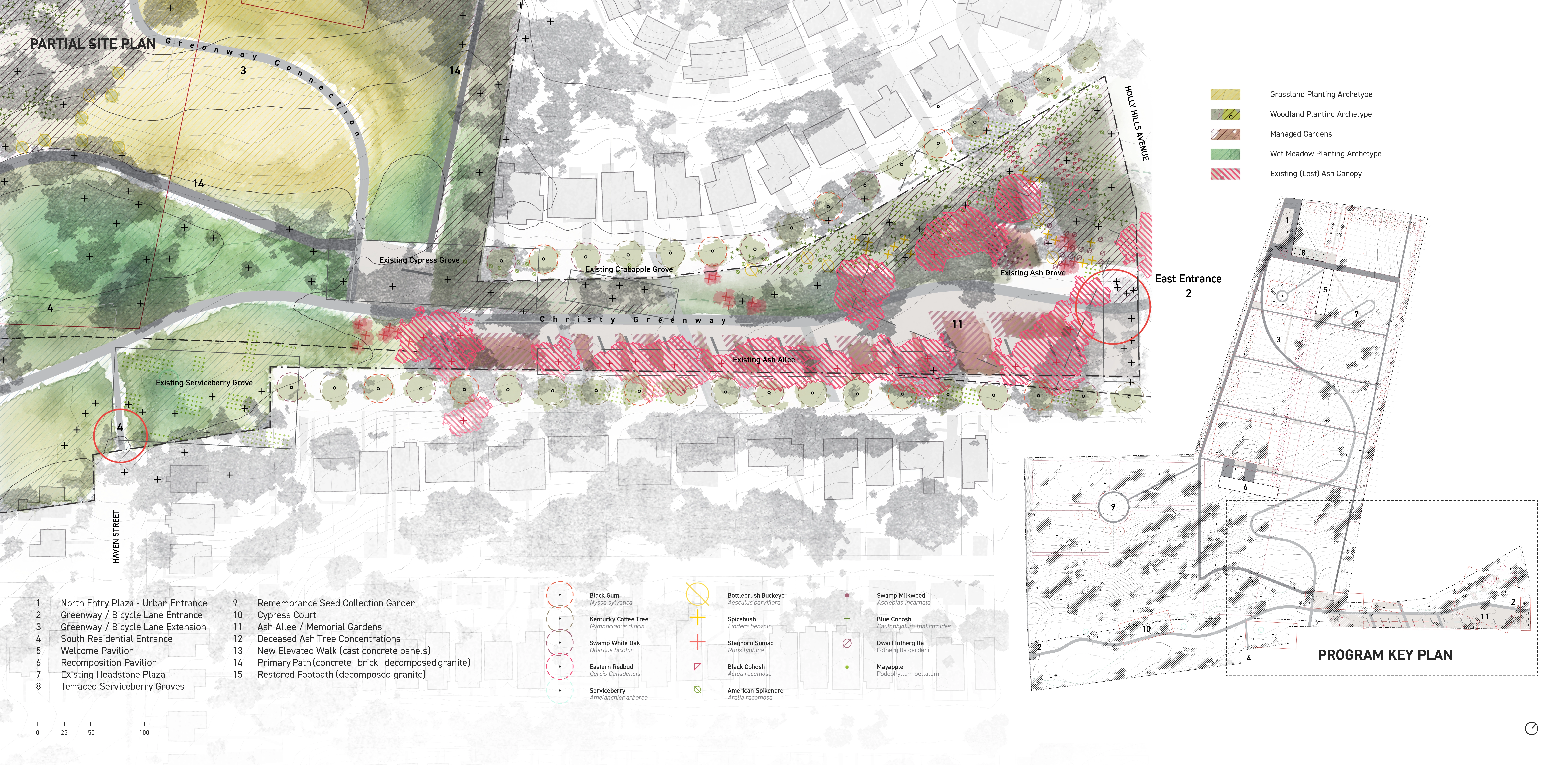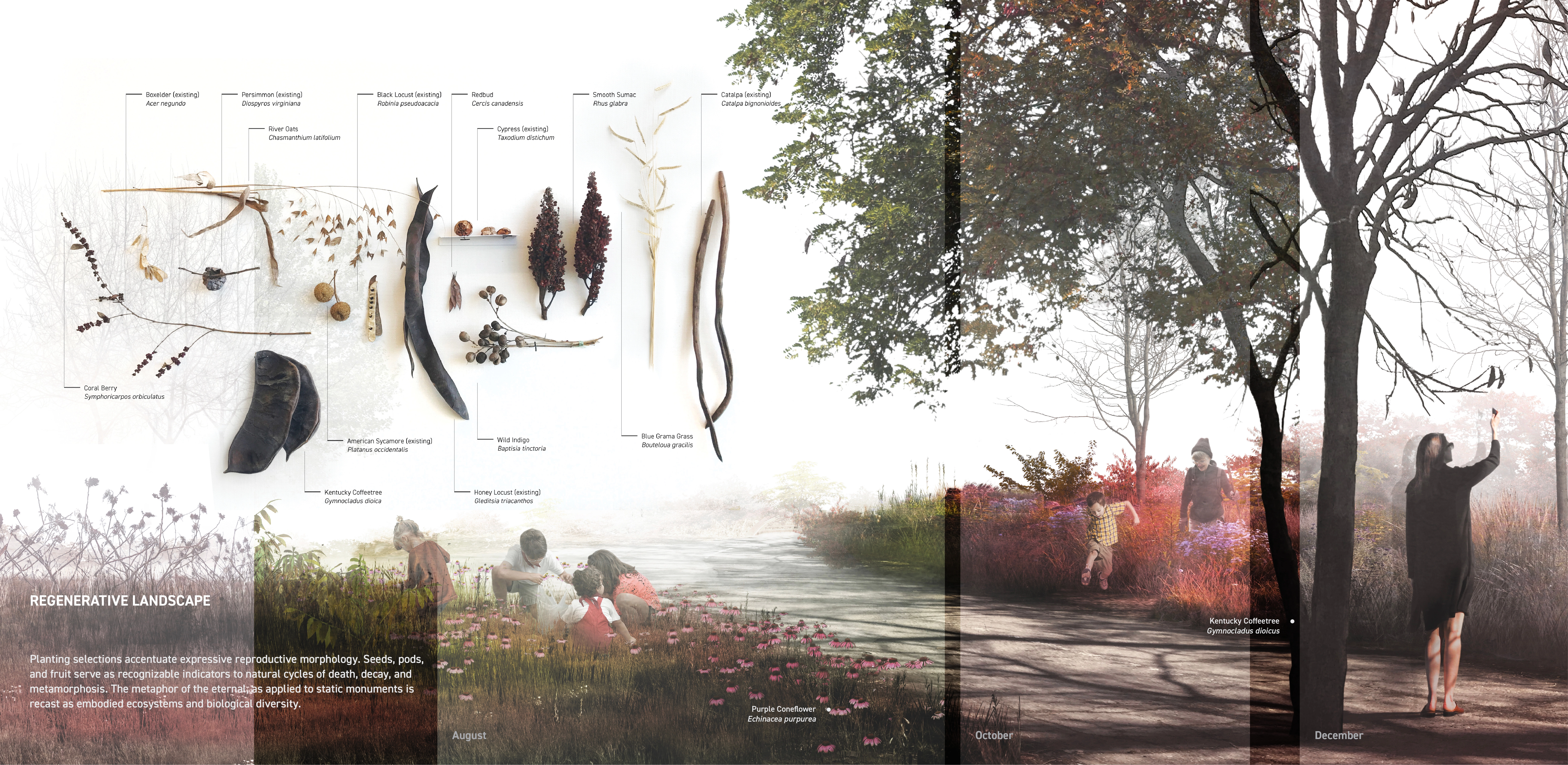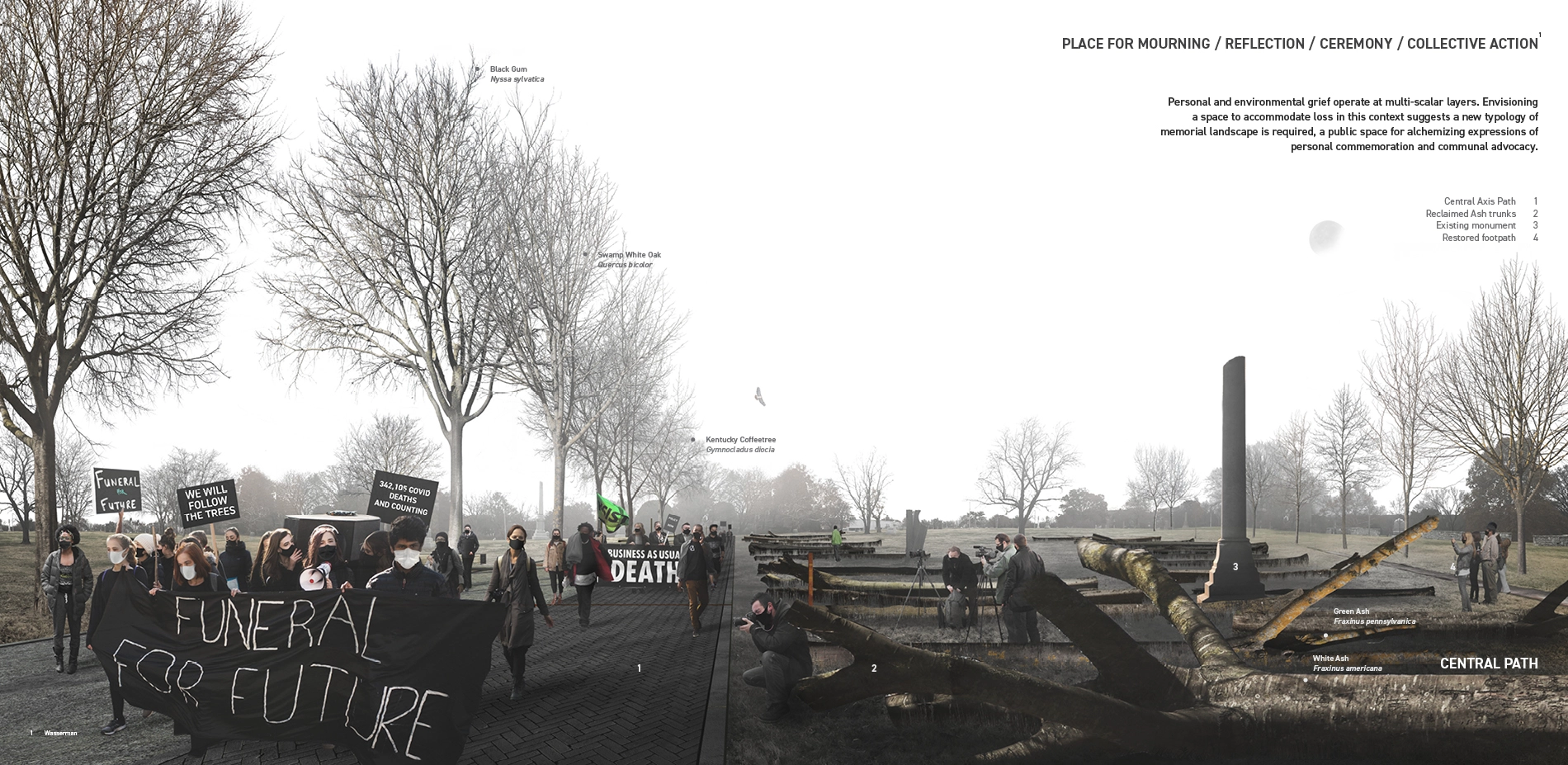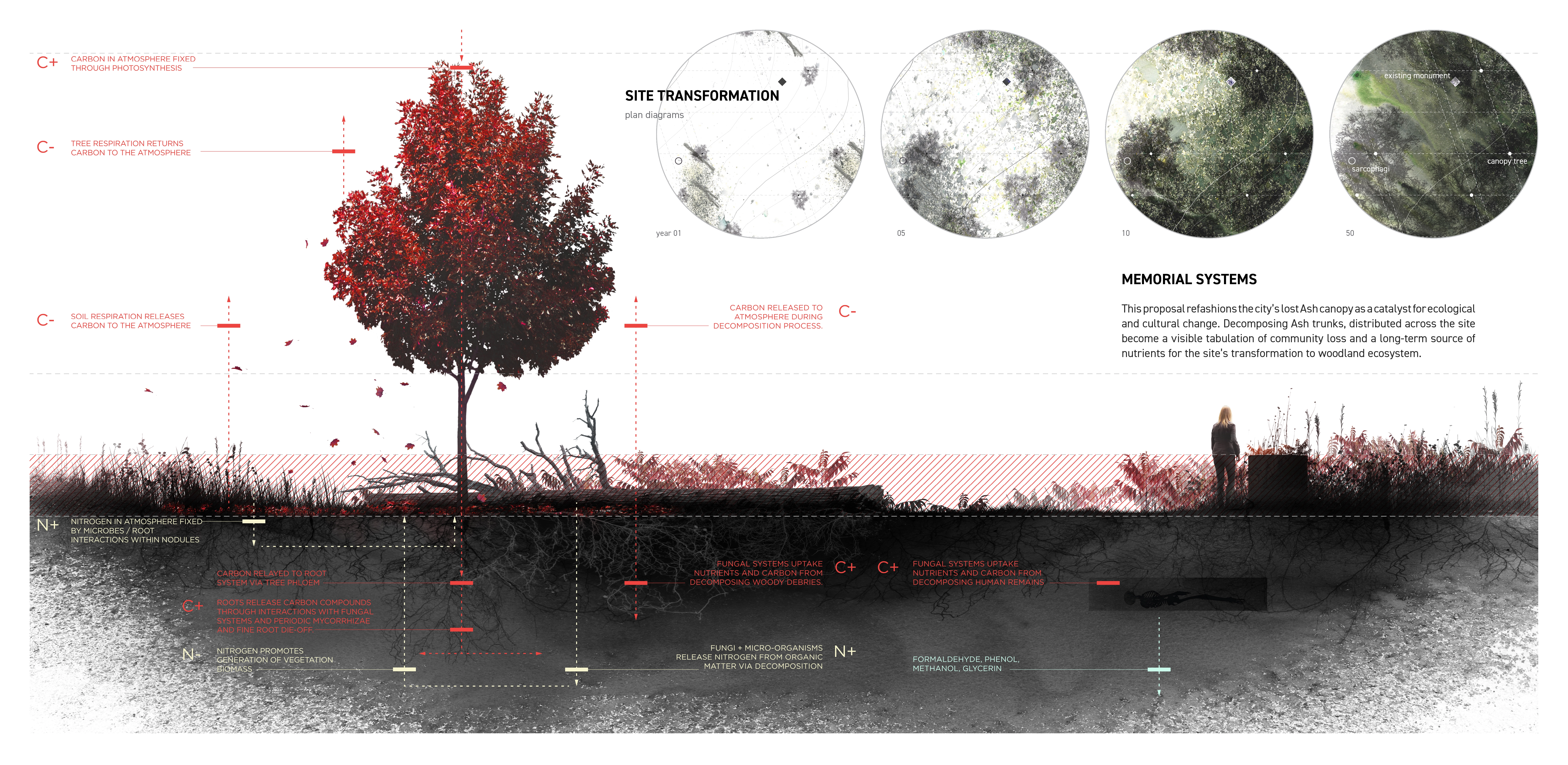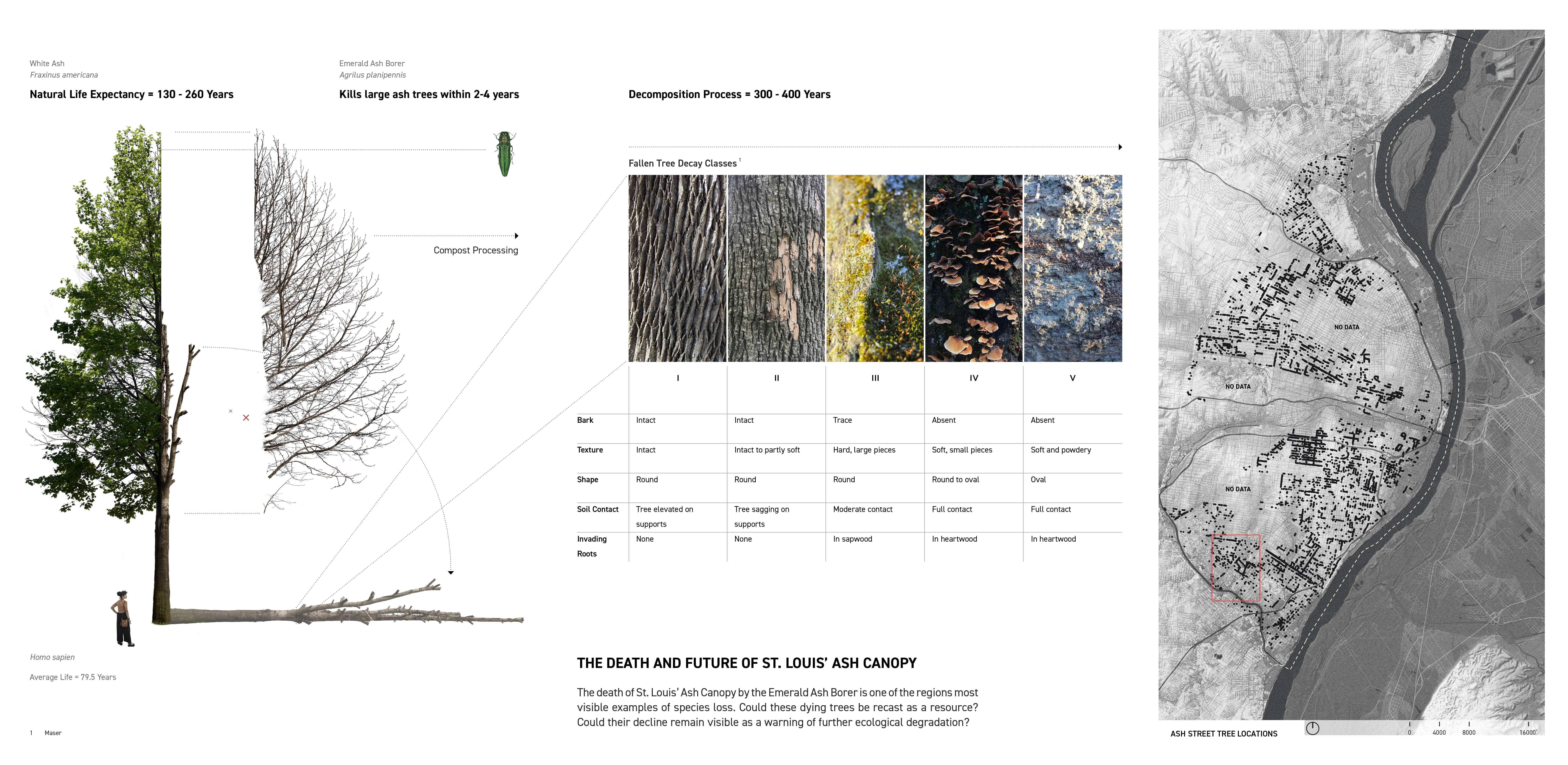 Dark Matter, a research by design thesis, investigates organic reduction (composting) of human remains as a means of promoting biological and cultural diversity in urban cemeteries. The project is a comprehensive application of technological advancements within the green funeral industry to a site in the Boulevard Heights neighborhood of Saint Louis, Missouri. While the project cites and assumes the physical realities of the method pioneered by Katrina Spade and her company Recompose, the proposal imagines an accompanying landscape that accommodates the material application, the subsequent adaptation of cultural practices and the concerns of the recently deceased who have opted for this environmentally ethical funeral process. The design intervention seeks to dovetail this new typology of memorial landscape into the complexities of an existing burial site, neighborhood and city. The practices of the contemporary American funeral industry come at a high financial and environmental cost. A standard burial averages $9,900; cremation with visitation is commonly above $6,000. Over 800,000 gallons of embalming fluids are buried in the United States annually, including formaldehyde, a known carcinogen. Additionally, 115 million tons of steel and the equivalent of 4 million forest acres of hardwood are buried in casket constructions. The most robust barrier between body and soil is the concrete vault, a common requirement from cemeteries or municipalities. Vault construction commits 2.3 billion tons of concrete to the earth every year. Commonly thought of as a more environmentally friendly option, cremation also leaves a troubling environmental legacy. Cremation is energy intensive, and the majority of crematoriums operate on fossil fuels. Emissions from a crematorium deliver a cocktail of chemicals, persistent organic pollutants, NMVocs and trace heavy metals such as mercury into the atmosphere. The popularity of ‘green burials’ have steadily increased in the United States over the last two decades. Green burial practices minimize negative environmental impacts through forgoing the use of embalming fluids and requiring that only non-toxic and biodegradable materials accompany the body in the earth. In an additional step towards environmental responsibility, conservation cemeteries have committed burial fees to establish and grow public land trusts that preserve ecosystems and prohibit future development. The recently legalized practice of organic reduction relies on thermophyllic microbial activity to transform human tissue and bone into inert soil-like organic material over the span of 4-6 weeks. This transformation occurs down to a molecular level, and results in the complete dissolution of the human body prior to interment. SITE The proposed site, Old Saint Marcus Cemetery, is situated within a larger history of displacement and trauma associated with Saint Louis’s burial grounds. Originally a German Evangelical cemetery, Saint Marcus is one of a constellation of the oldest remaining cemeteries along the political border of Saint Louis City and County. Their geographical arrangement is a result of successive cholera epidemics, disproportionate investment, predacious development, and the city’s tortured history of racial suppression, segregation and disenfranchisement from slavery through the present. The dead were not exempt from the changing city’s impositions. Older urban burial grounds were routinely exhumed and bodies relocated to the perimeter of the growing city, only to be encroached upon and surrounded anew. Many older cemeteries have experienced bankruptcy and subsequent decline. Saint Marcus was converted to a city park in 1977 after bankruptcy led to years of neglect, decay, and vandalism. The purchase funded relocation of burials under perpetual care, but left the majority of the original 19,500 interments on site. The original layout of cemetery paths and roads were removed and a curving path was installed to link the commercial Gravois Avenue to the North with the greenway and residential neighborhoods to the South. Large scale monuments and headstones remain on site though turf is slowly consuming many of the smaller markers. Saint Marcus hosts a microcosm of ecological challenges faced by the Saint Louis region. The most critical is the deterioration of the city’s urban tree canopy and an increasing frequency and severity of flood events. EXPANDED FIELD OF GRIEF In the anthropocene, an era of mass extinction, global pandemic, and accelerating climate change, an individual’s commitment to an environmentally ethical funeral practice is a deeply intentional final act that bares profound concern and empathy for the world they are leaving. The process of organic reduction removes any conceit of somatic permanence and allows the merging of human matter with non-human ecologies. This choice fuses the loss of an individual life with the diffuse and existential nature of environmental decline and ecological loss. A funerary site designed to accommodate this expanded field of grief suggests a new typology of memorial landscape is required, one that can accommodate personal and communal loss. The program of such a landscape must adapt to expressions of grief akin to mourning, reflection, ceremony, and collective action. The landscape must supply moments of spatial intimacy juxtaposed with experiences that position a human body within an immensity of time and ecological complexity. The death of Saint Louis’ Ash trees by the Emerald Ash Borer is one of the regions most visible examples of ecological loss. Fraxinus spp. are the most prolific street tree in the city, over 18% or approximately 15,000 Ash shade the city’s avenues and parks. Dark Matter refashions the city’s lost Ash canopy as a resource and catalyst for ecological and cultural change. Ash trunks removed from around the city will be strategically distributed across the site. Their concentrated presence will