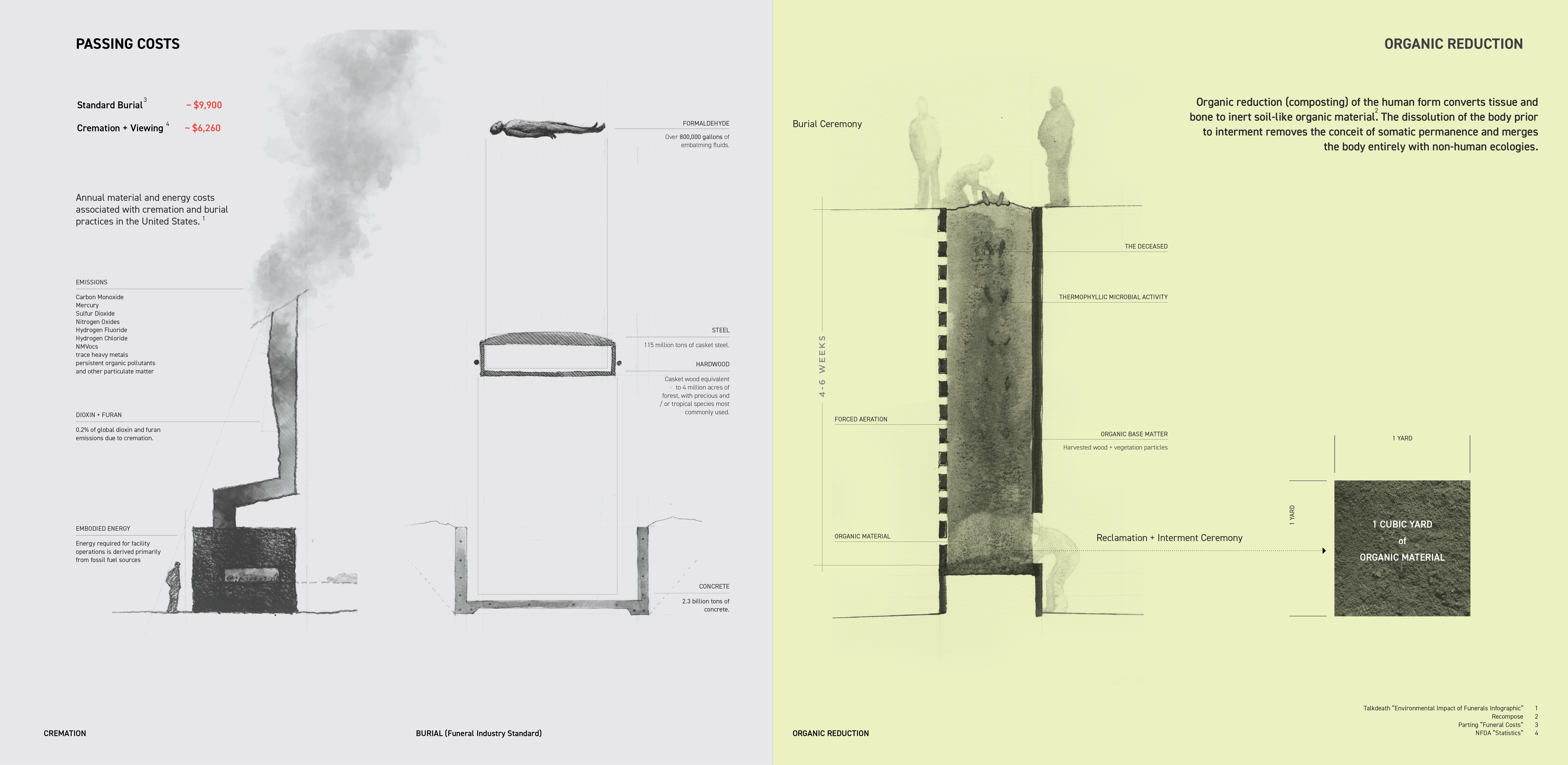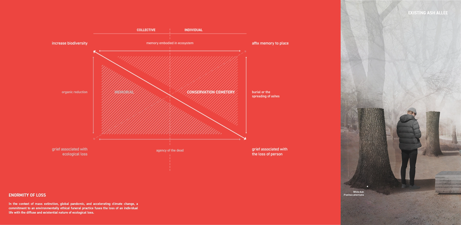 Dark Matter investigates organic reduction as a means of promoting biological and cultural diversity in urban cemeteries. Dissolution of the body prior to interment foregrounds the transference of matter to adjacent life; the memorials embodiment of place is expanded to include natural systems and ecological productivity. The funerary landscape is decentralized from static site of memorial to evolving memorial system that invites engagement with the living. In the context of mass extinction, climate change and global pandemic, an environmentally ethical funeral practice fuses the loss of individual with the diffuse and existential nature of ecological loss. These layered forms of grief operate at multiple temporal scales and suggest a new typology of memorial landscape that engages natural cycles of a duration that exceeds the human life. To address these forms of grief, this funerary landscape offers biodiverse public spaces that meaningfully rejoin bodily death to broader natural cycles of ecological metamorphosis. Rituals of commemoration, management, and activism would alchemize to unexpected results when program of memorial, ecological preserve, and space for collective action merge.