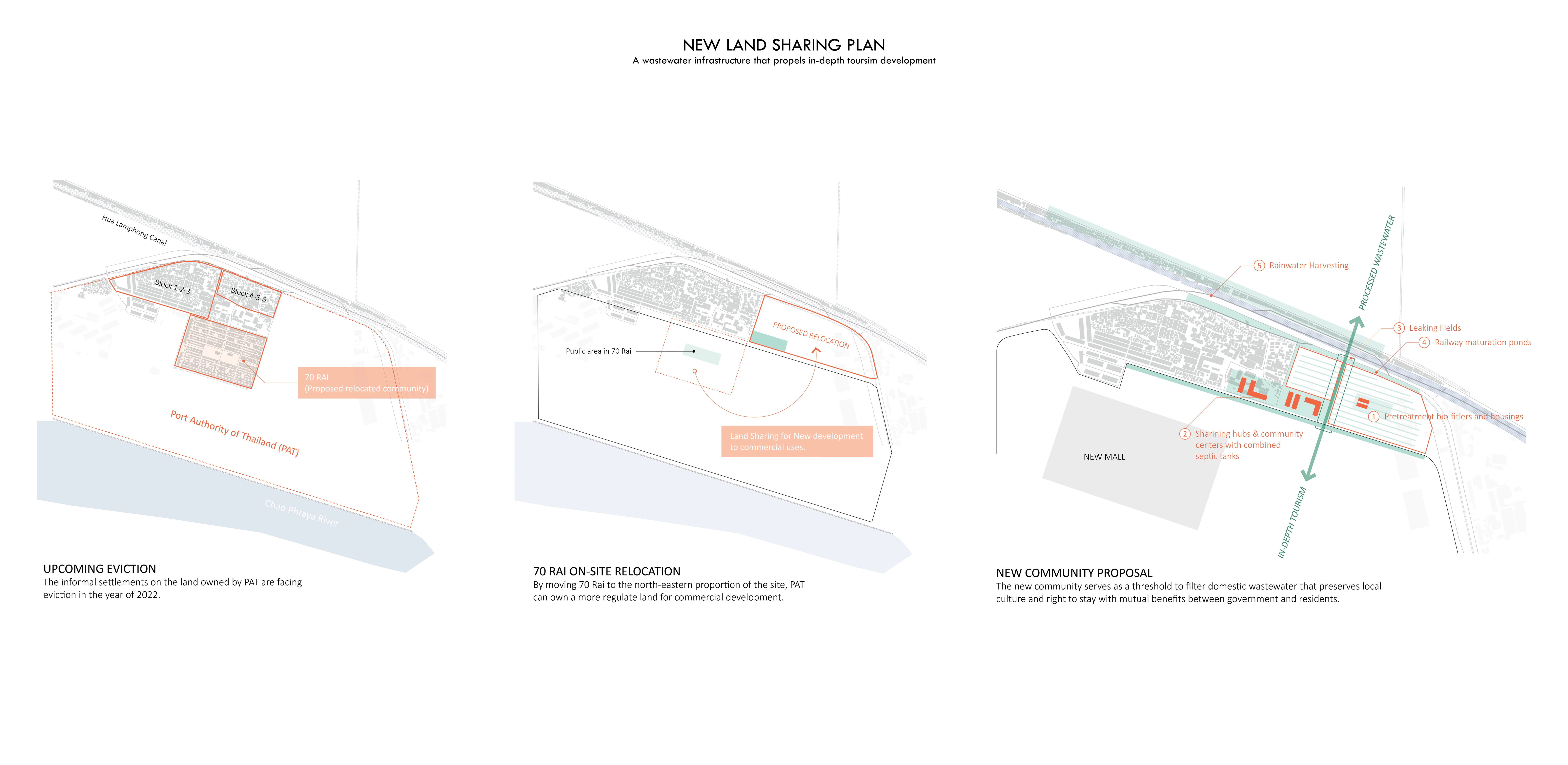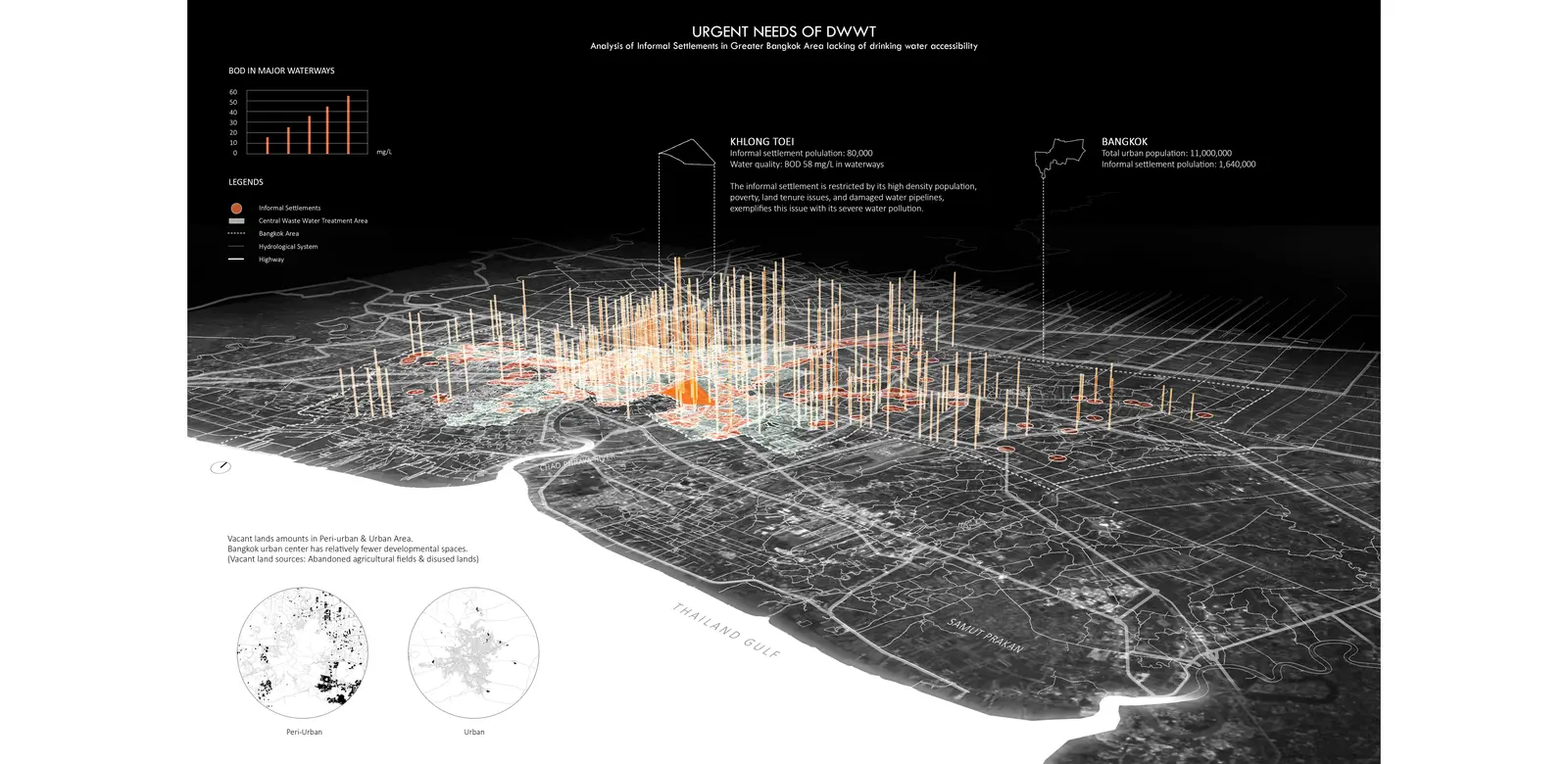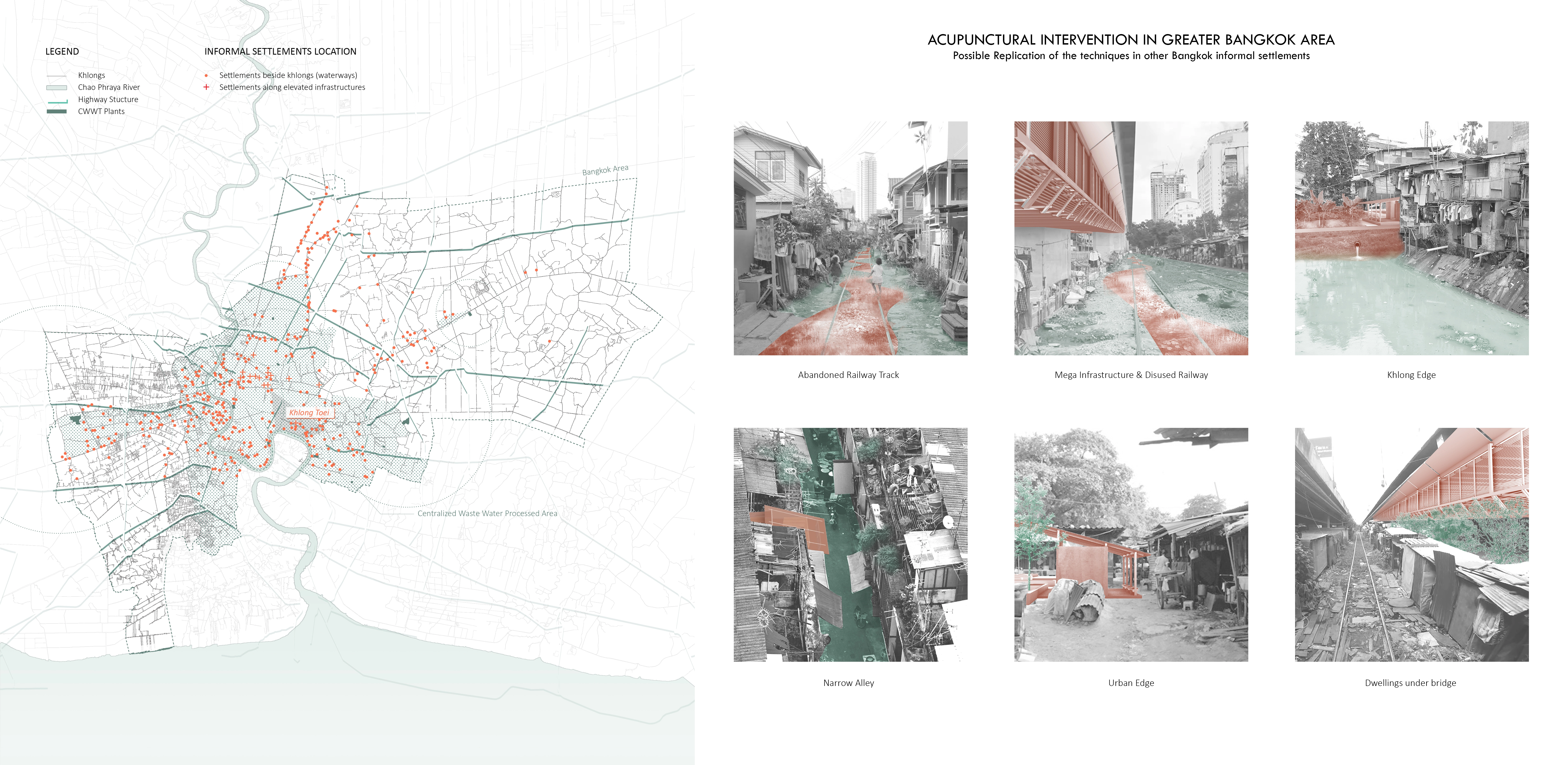 This project aims to redefine Bangkok informal settlements as a means to tackle urban sanitary and flooding problems. The study site --Khlong Toei Community is the largest complex of Bangkok informal settlement and is currently facing issues such as population density, lack of accessibility to drinking water and eviction from Port Authority of Thailand (PAT). Instead of massive relocation, the intervention of a new land sharing plan that improves water supply and self-help food production will propel “in-depth tourism” that preserves local culture and “the right to stay with mutual benefits” between the city government and local residents.