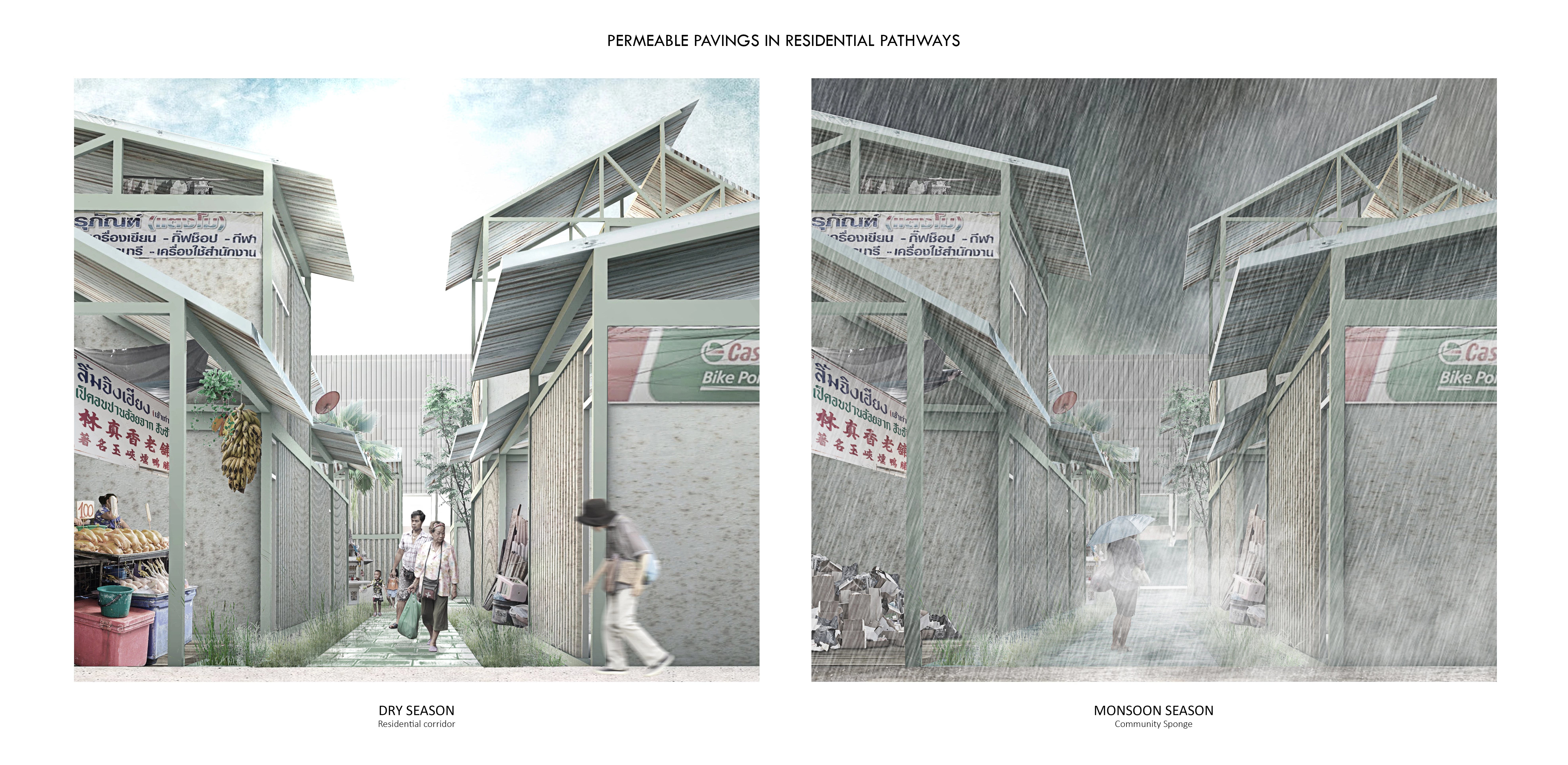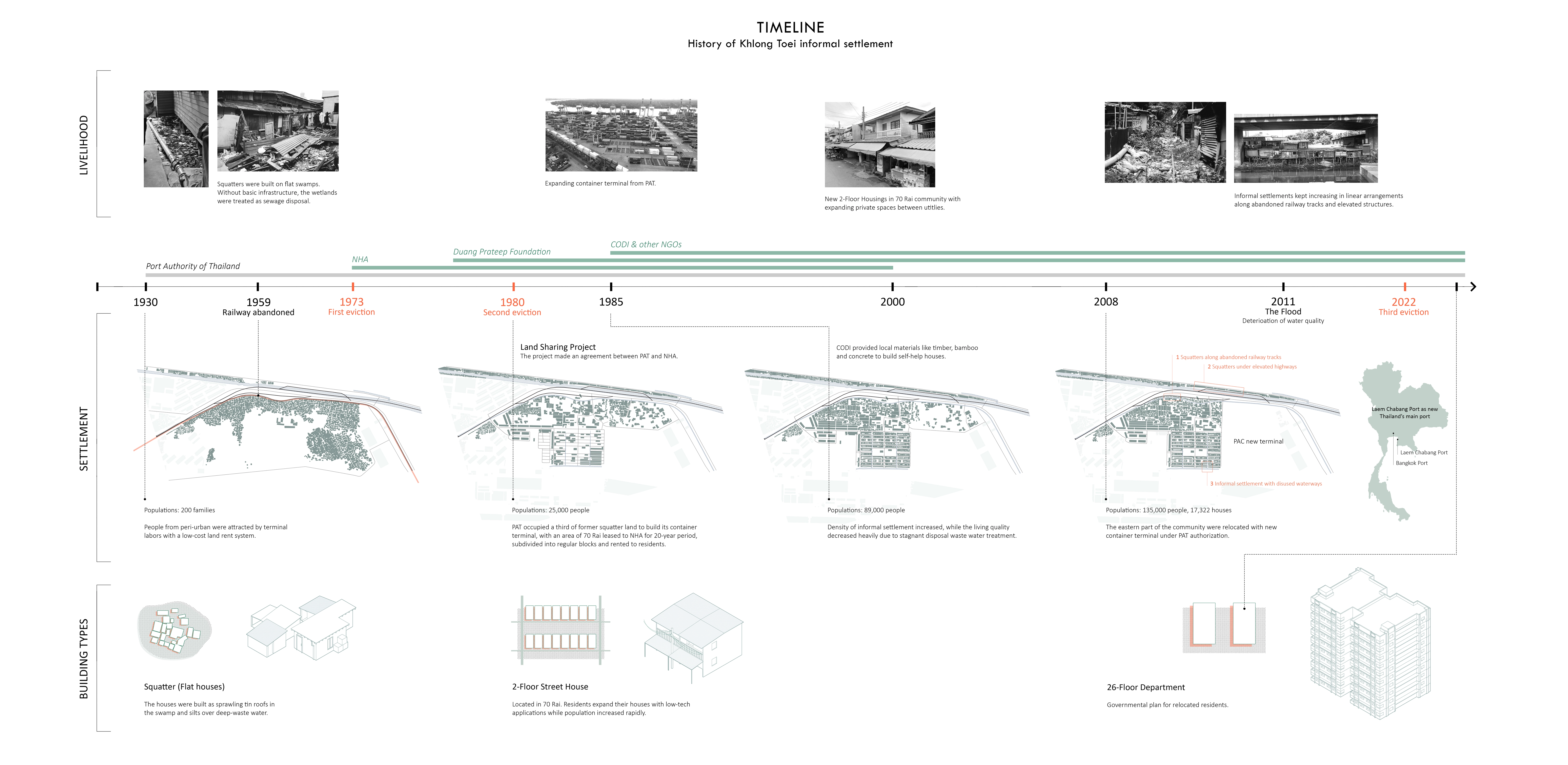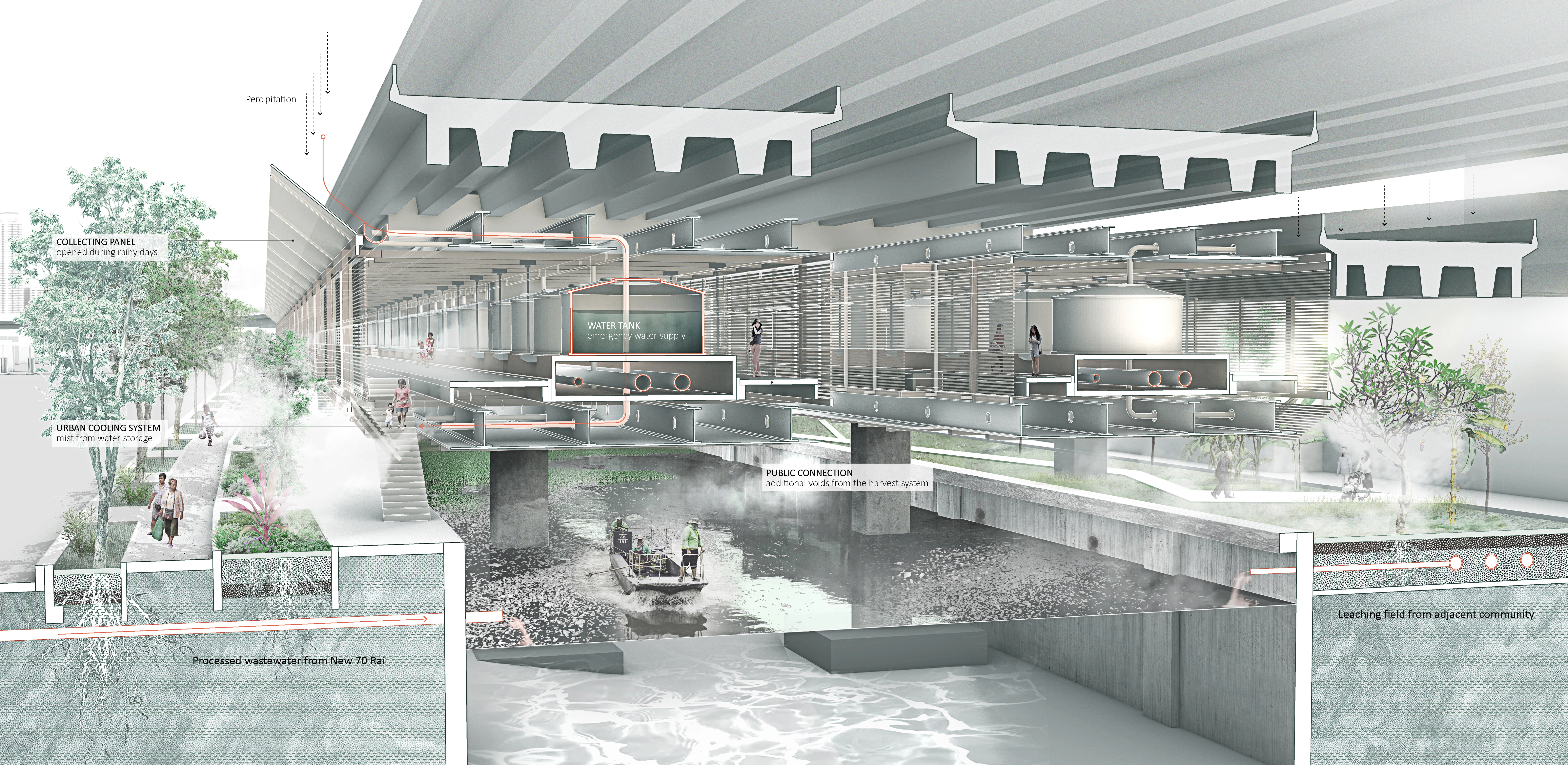 This project aims to redefine Bangkok informal settlements as a means to tackle urban sanitary and flooding problems. The study site --Khlong Toei Community is the largest complex of Bangkok informal settlement and is currently facing issues such as population density, lack of accessibility to drinking water and eviction from Port Authority of Thailand (PAT). Instead of massive relocation, the intervention of a new land sharing plan that improves water supply and self-help food production will propel “in-depth tourism” that preserves local culture and “the right to stay with mutual benefits” between the city government and local residents.