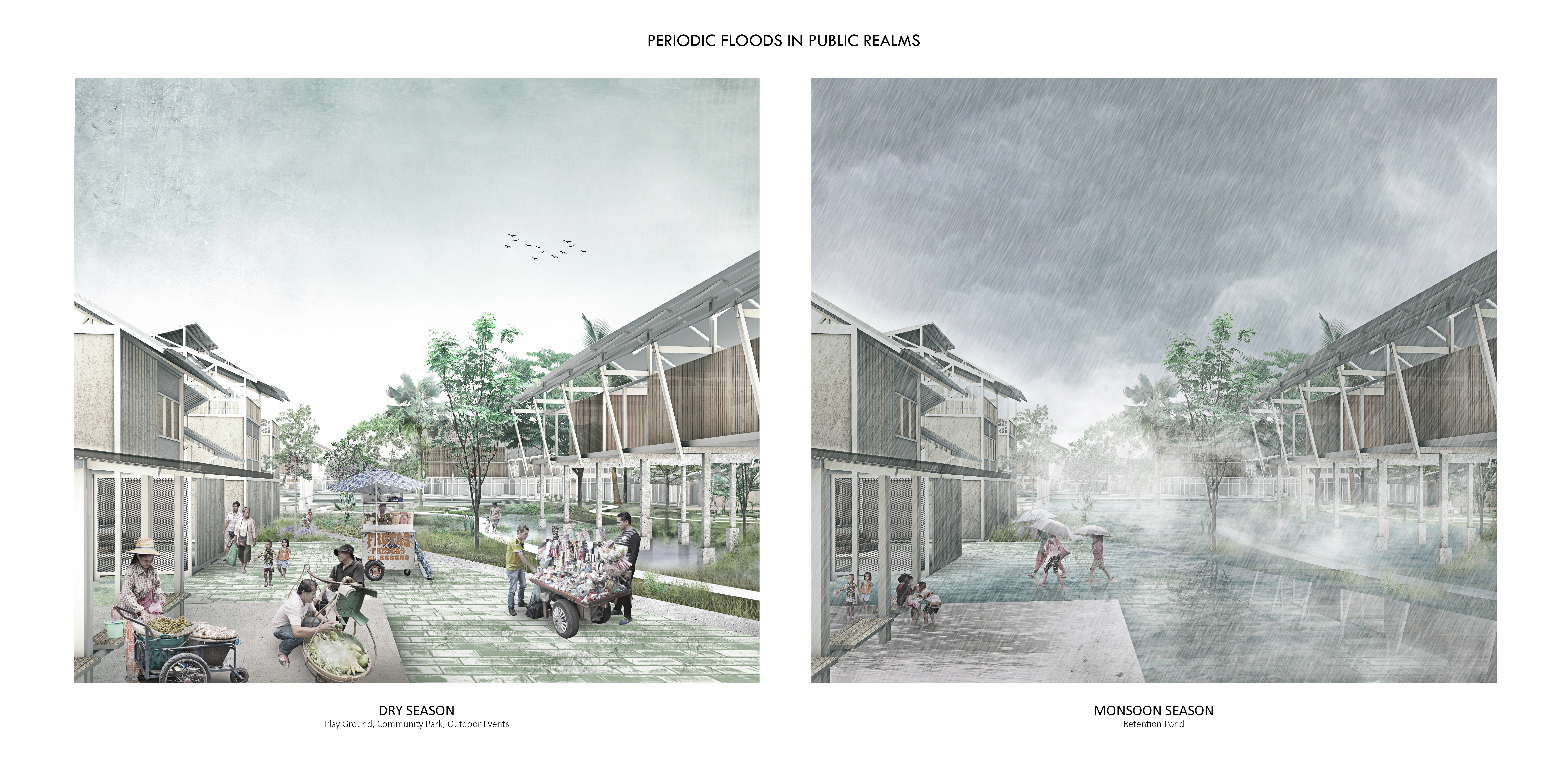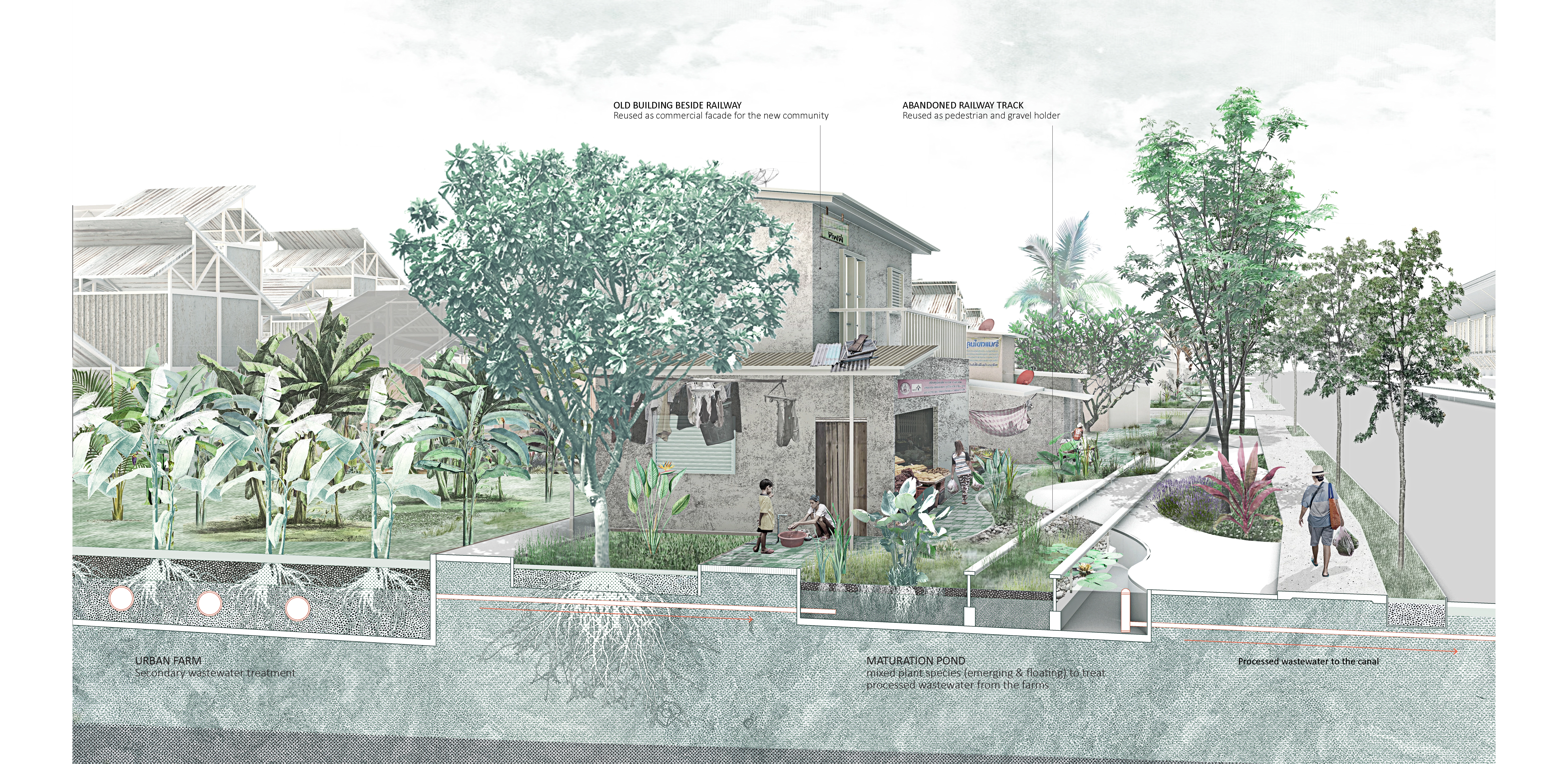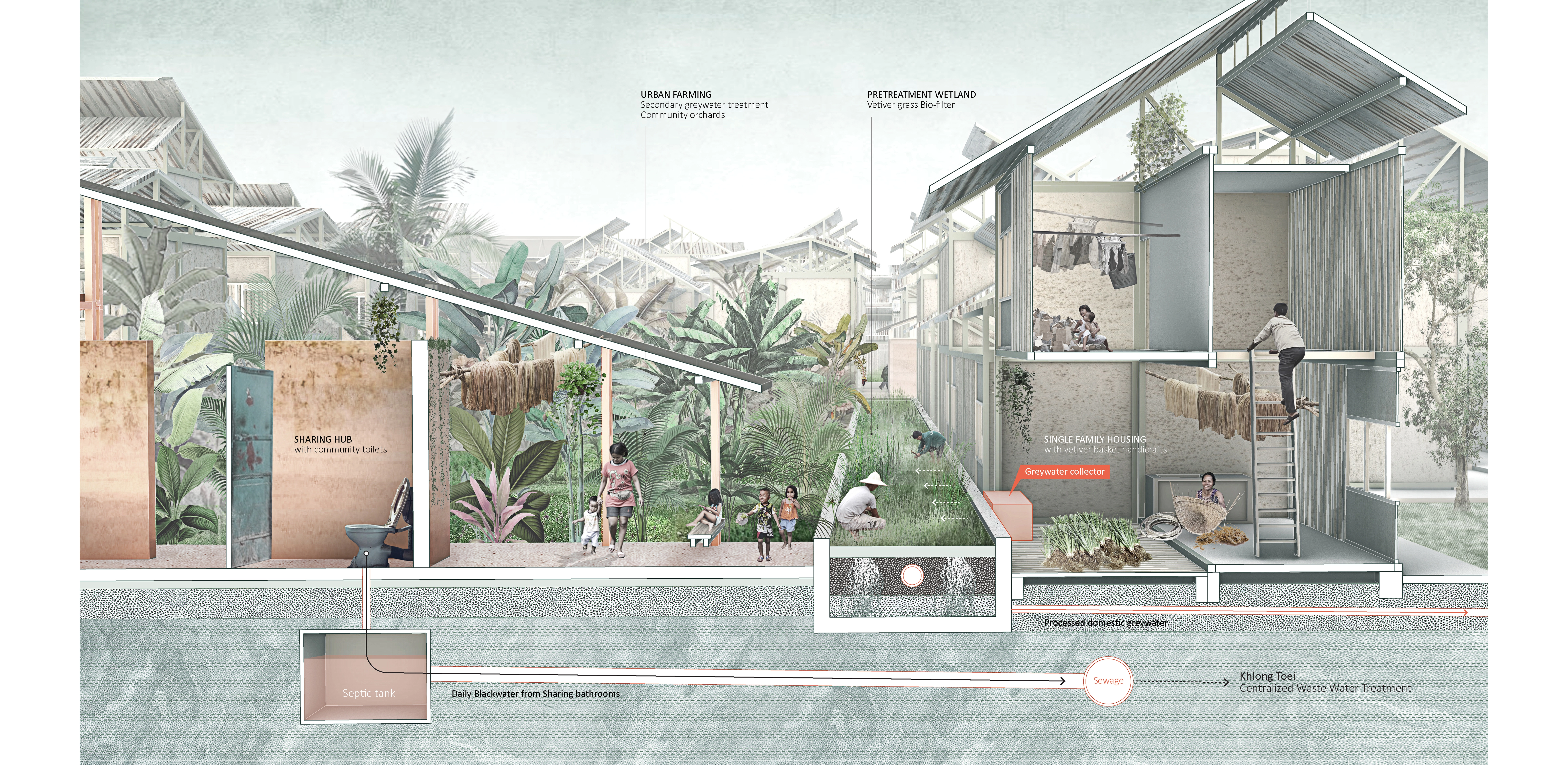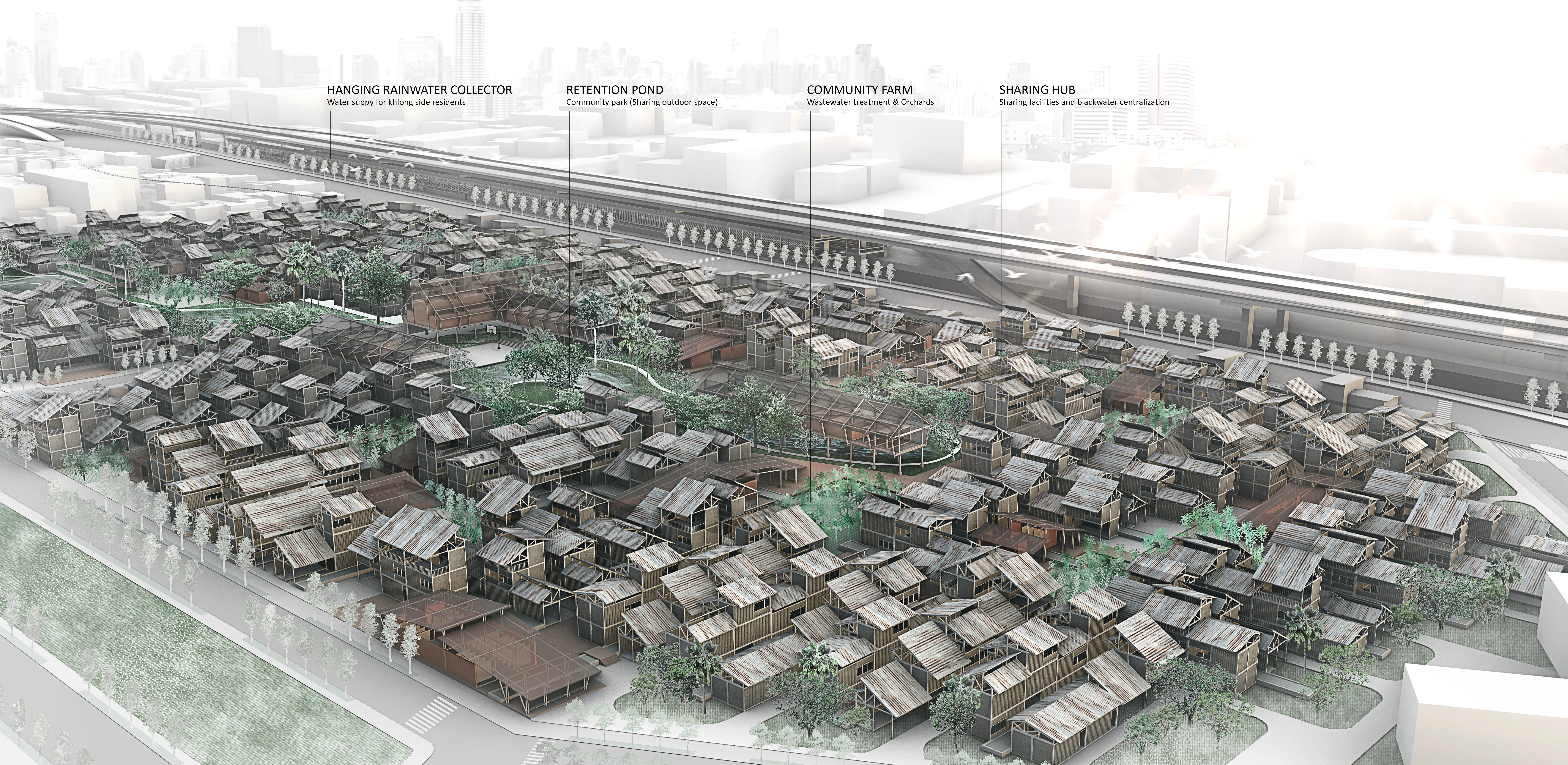 Bangkok’s Khlong Toei community—an informal settlement along one of the city’s many canals—suffers from contaminated water, degraded health conditions, and the constant threat of relocation. But if this impermanent community were made a permanent and planned part of the city, as this project proposes, a mutually beneficial arrangement between inhabitants and city government could blossom. Starting with a multi-functional infrastructure of shared toilets feeding a wastewater treatment plant, greywater would be generated for use in community orchards. A retention pond and storage tanks would collect excess monsoon rainwater to be used during the drier months. By addressing this community’s needs, rather than shunting it to another temporary location, the local government would advance social equity while improving urban hygiene through a new, sustainable ecology.