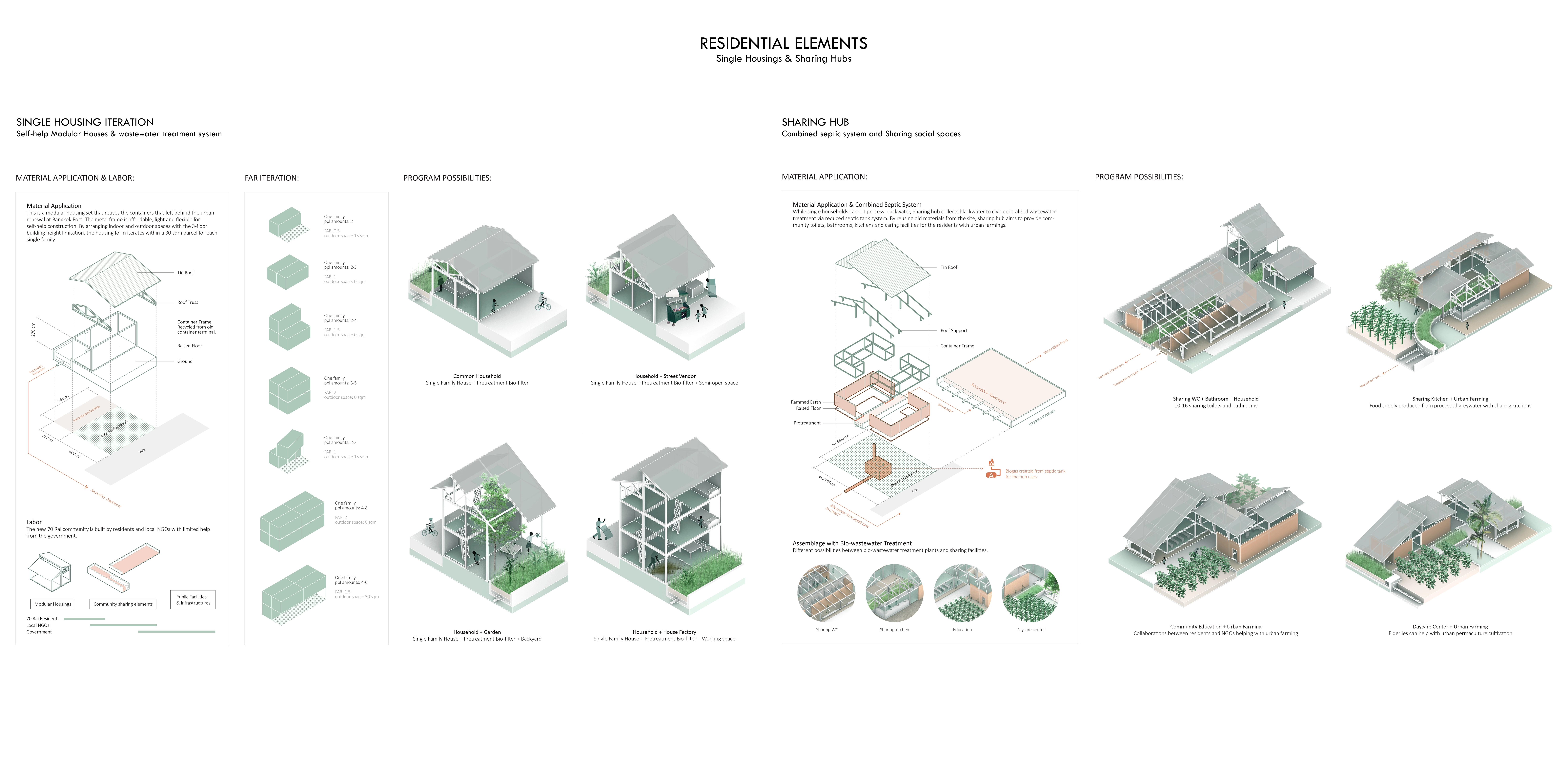 [ The complex of Bangkok informal settlements ] Because of its myriad hydrological system on the Lower Chao Phraya floodplain, Bangkok is known as the “the Venice of the East”. Despite the mixture of a great civilization and agriculture industry that derived from the highly disturbed khlong (local canal) system, the waterways are currently heavily polluted by rapid urbanization and immense levels of urban wastes. While the Thai livelihood used to be closely tied to the khlongs, the waterways ended up as open-air sewers where 60% of the pollution sources come from adjacent unprocessed domestic wastewaters. Similar to most of the khlong-side informal settlements in Bangkok, the Khlong Toei Community is located in the heart of the capital, where lands owned by the Port Authority of Thailand (PAT). In the 1930s, people from peri-urban were attracted by terminal employment with a low-cost land rent system. After the second eviction from PAT, the Land Sharing Plan made an agreement between PAT and National Housing Authority (NHA), while PAT occupied a third of former squatter land to build its container terminal, with an area of 70 Rai leased to NHA for a 20-year period, subdivided into regular blocks and rented to residents. Though the residential quality was improved and secured by more infrastructures and building materials supply, the swamp substrates and degrading water qualities kept threatening the community health. What is worse, due to the impending eviction, the entire Khlong Toei community will be replaced with a commercial district, by depriving their harbor jobs and moving them into a remote 26-floor public housing tower. Opposite to the governmental plan, my project -- Informality as Filter proposes a renewed land-sharing plan with wastewater infrastructure that is adaptive, productive, and poly-functional, opening the enclosed community to more public awareness that could help change their fates. Known as the biggest informal settlement in Bangkok, Khlong Toei has attracted international tourists all over the world. In Khlong Toei Community, the squatters live informally in three civic infrastructure space types: abandoned waterway encroachment, derelict railway track, and vacant lands beside khlongs under highways. Sharing a similar linear narrow form that cannot be easily developed, those types are very common in the Greater Bangkok Area. [ Renewed Land Sharing Plan & Wastewater Treatment ] Rather than relocating the entire community, by moving 70 Rai to the north-eastern proportion of the community, PAT can own a more regulate land for future commercial development. The newly relocated 70 Rai community serves as a threshold to filter domestic wastewater that preserves local culture and right to stay with mutual benefits between government and residents. To harness this new “filter”, the whole wastewater treatment process includes a sequential order of sharing toilets, pretreatment bio-filter, secondary treatment (community farming), and maturation ponds. In addition to boosting civil water quality, these adaptive elements serve as a poly-functional infrastructure when gathering blackwater and treating greywater for community agricultural uses. The concept of “sharing” is emphasized within the new community: while residents can share public toilets, kitchens, classrooms, and daycare facilities, they take care of community orchards and maintain the wastewater-driven economy. For example, vetiver grass plays a vital role in the pretreatment bio-filter (subsurface flow wetland) by offering phytoremediation and raw materials for the domestic industry simultaneously. Other valuable exports from the secondary treatment orchards include banana, balsam apple, star fruit, and several kinds of vegetables savored in iconic Thai cuisines and street foods. Finally, before the processed wastewater reaches the khlong, pathogens are removed in the maturation pond that is combined with the abandoned railway track on the edge of At Narong Road, representing a commercial façade that welcomes external visitors and pedestrians. Besides wastewater treatment, the community’s irrigation and potable water come from strategic rainwater harvesting techniques that suit Bangkok’s tropical monsoon climate: retention pond and hanging rainwater collector. During the rainy season from July to October, the extra amount of stormwater will be storage in emergency tanks that can subsidize necessary needs in dry seasons. Due to the delta geology and high groundwater level, instead of using conventional buried water tanks, a hanging rainwater collector is an ideal alternative that can utilize empty voids beneath elevated highway structures to stabilize rainwater panels and pipelines. Other than providing clean water to adjacent dwellings, the harvest system includes a semi-open urban platform that renders public events like outdoor market and recreations with shade, subsequently close the circulation gap from the khlong below. What is more, it can turn into a continuous urban cooling system with a few amount of stored water, which is a great gift to Bangkok, especially during scorching hot days. [ Residential Plan: Modular Housing and Sharing Hub ] In 70 Rai, there are around 1,300 families, and the average number of people per family is 5. Instead of relocating them in high rise affordable housing, which is not suitable and affordable on soft grounds, a strategical layout of modular housings and sharing hubs will renew the current settlement style. Cooperation from government and local NGOs such as Mercy Centre, the wastewater infrastructure will be implemented first to supply basic needs. By reusing the terminal containers that left behind the urban renewal at Bangkok Port, the new modular housings are built with self-help metal frames. Single housing iterations are set on grids of 5 x 6 meters, allowing for modifications in terms of FAR or height with the 3-floor limitation. By adhering to the v