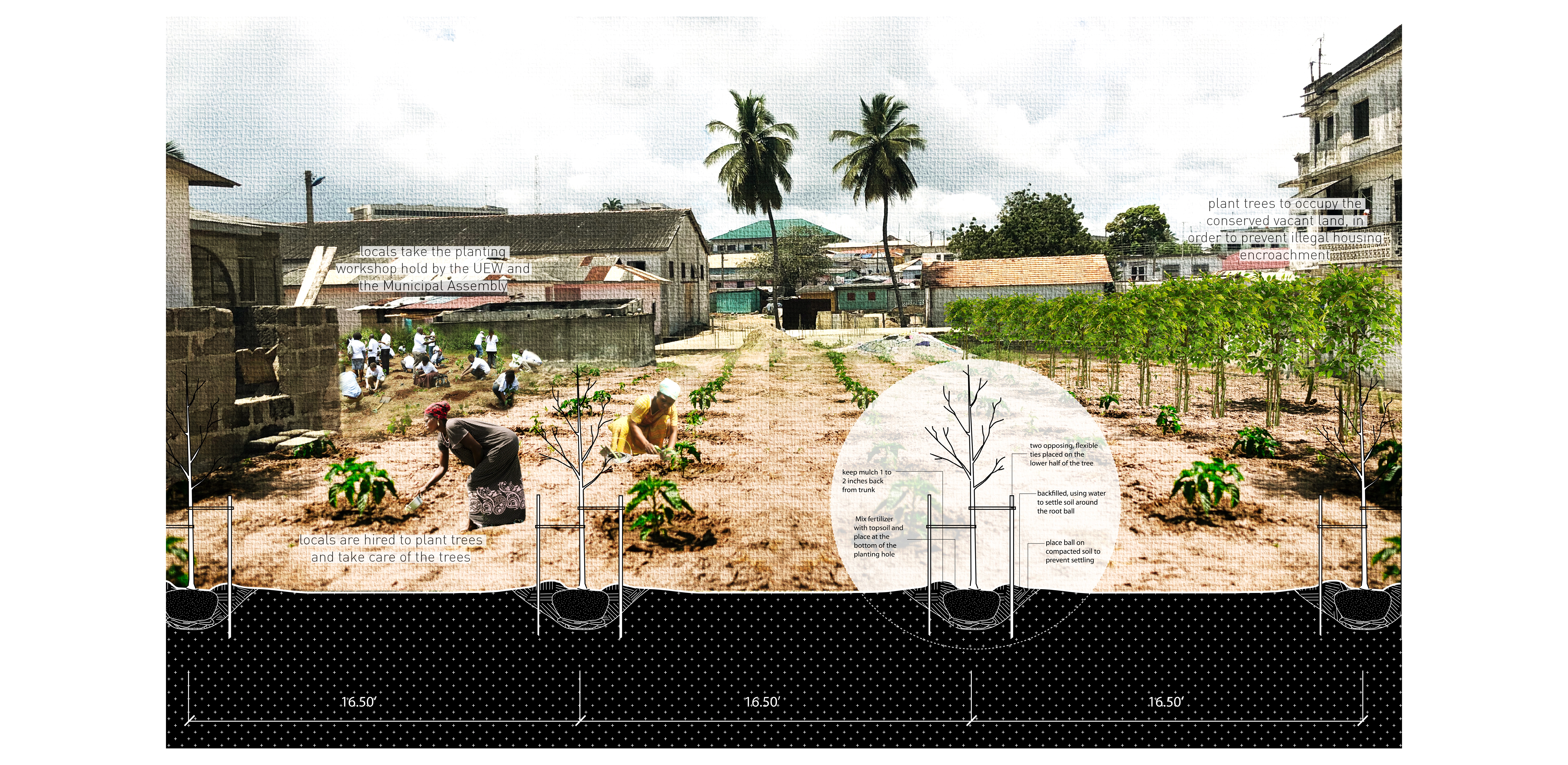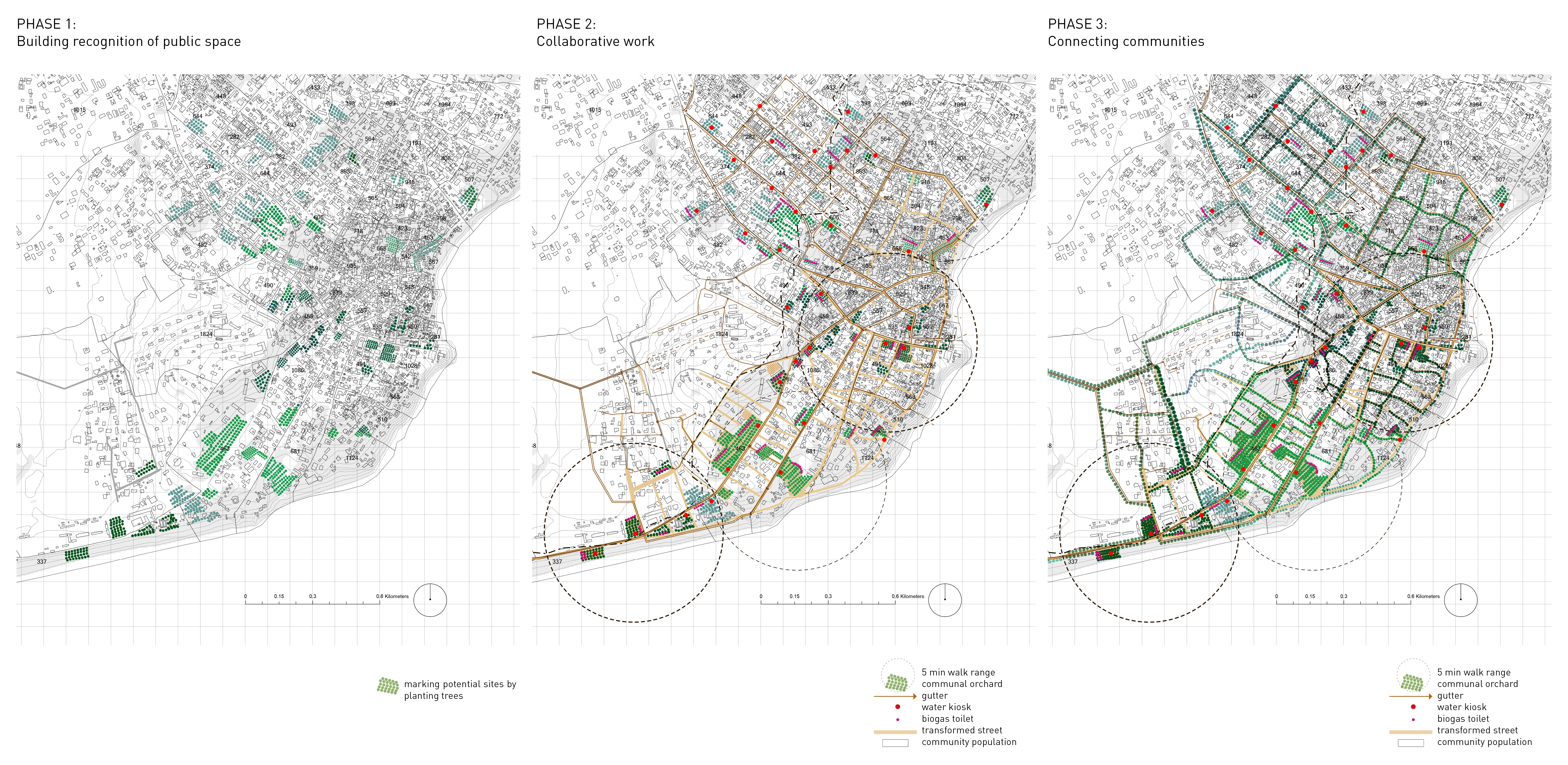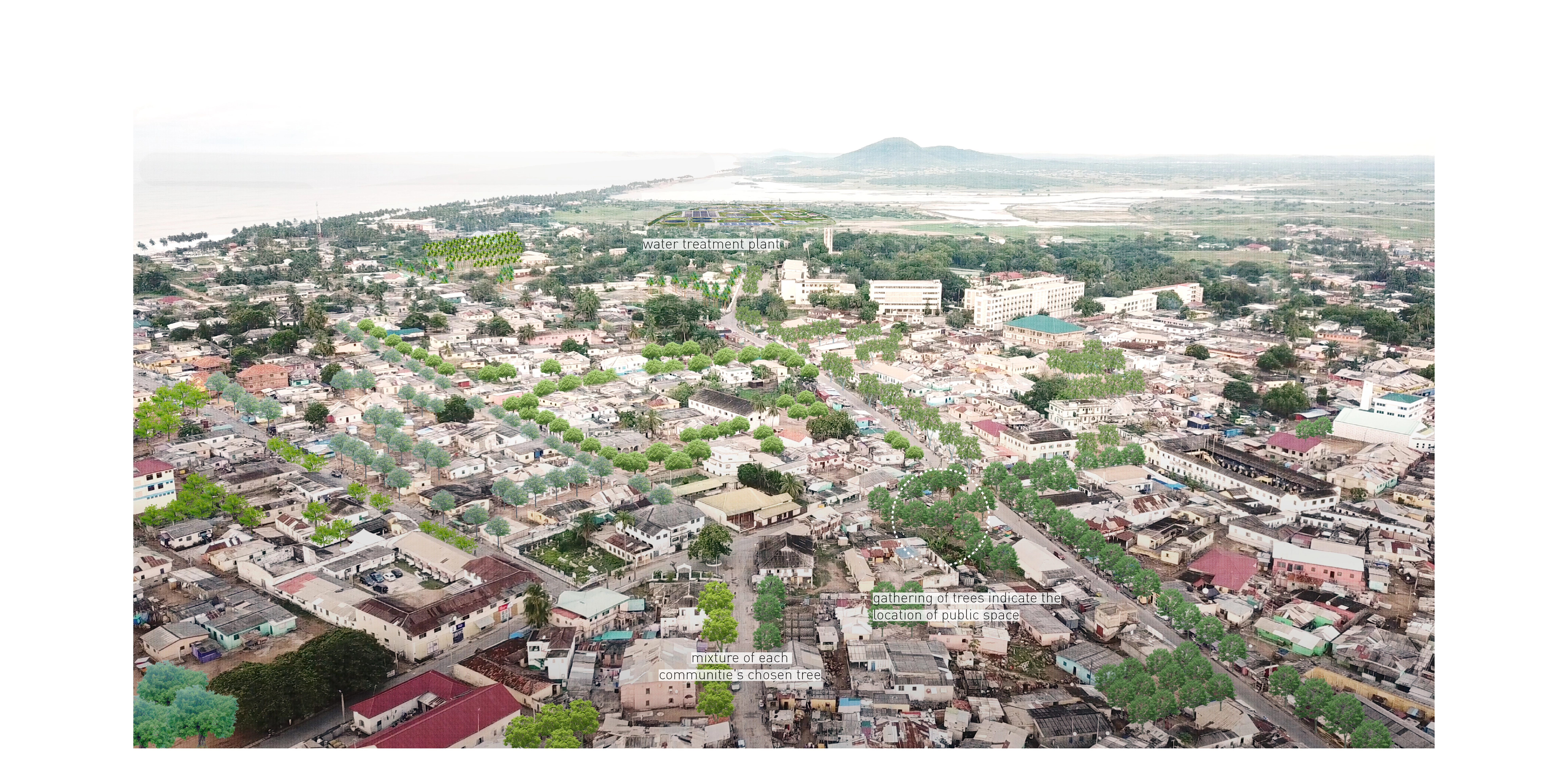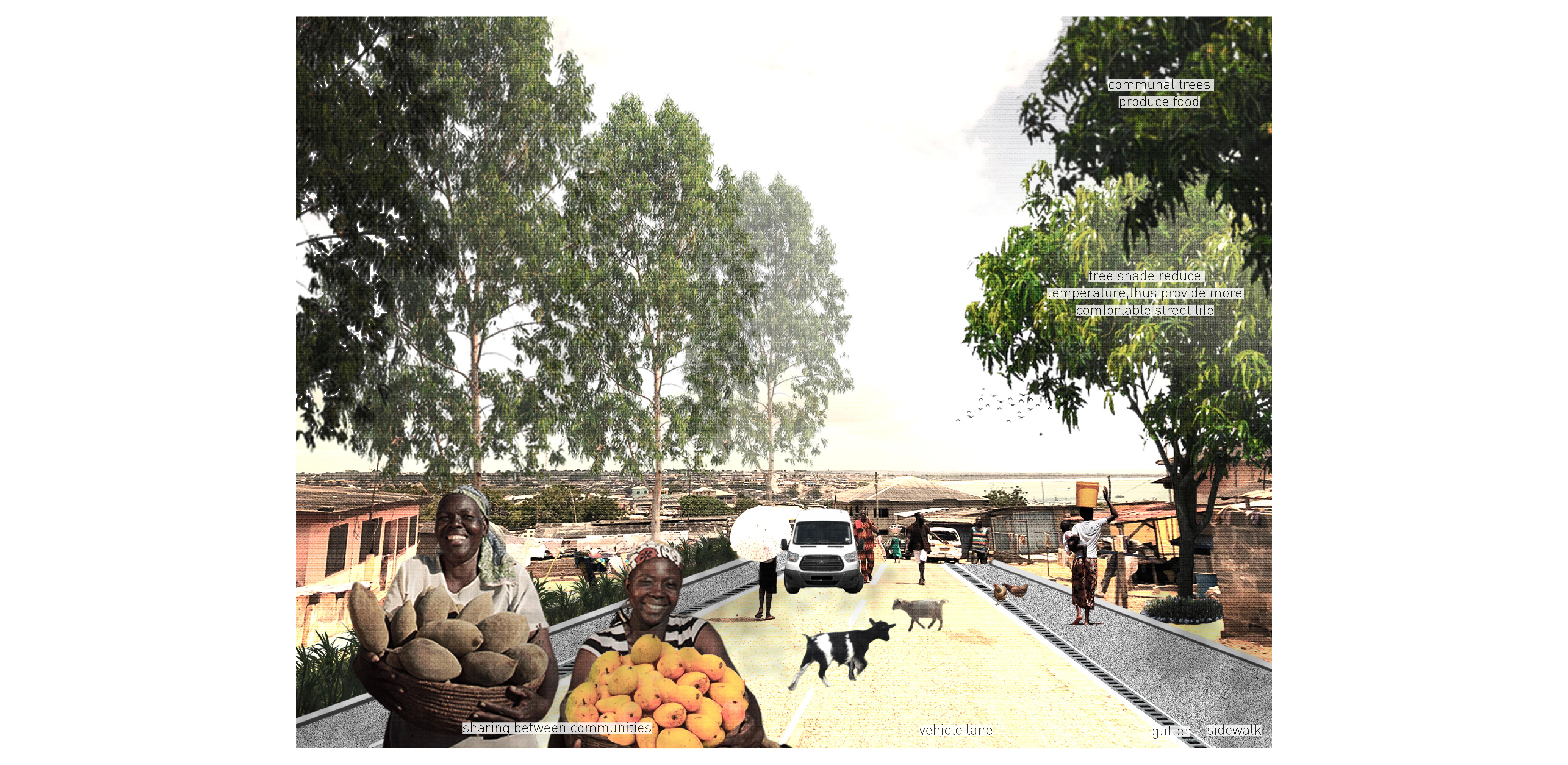 Winneba, just like other coastal cities in West Africa, is suffering from enormous social and ecological challenges, such as inadequate infrastructure, water sanitation, food insecurity, environmental degradation, and social conflicts. This project initiates from understanding the socio-ecological role of Ghanaian public space. Research into community power in conservation, in particular, that of sacred groves, reveals its unique role in legitimizing social arrangements, addressing a sense of belonging, and reconcile differences. The success in maintaining these small eco-systems through local efforts can inform better policy-making. Drawing inspiration from social research and local traditions, this project proposes a network of vegetated public spaces that function as a catalyst to initiate ecological and social transformation. It encourages bottom-up community participation in each of the three phases. In addition to amenities that enable access to tree shade, clean water, public toilets, bio-energy, and food, these spaces provide a connection among residents regardless of their origin and social status. Through collaborative efforts, people of different social groups are brought together to improve social, economic, and environmental well-being.
