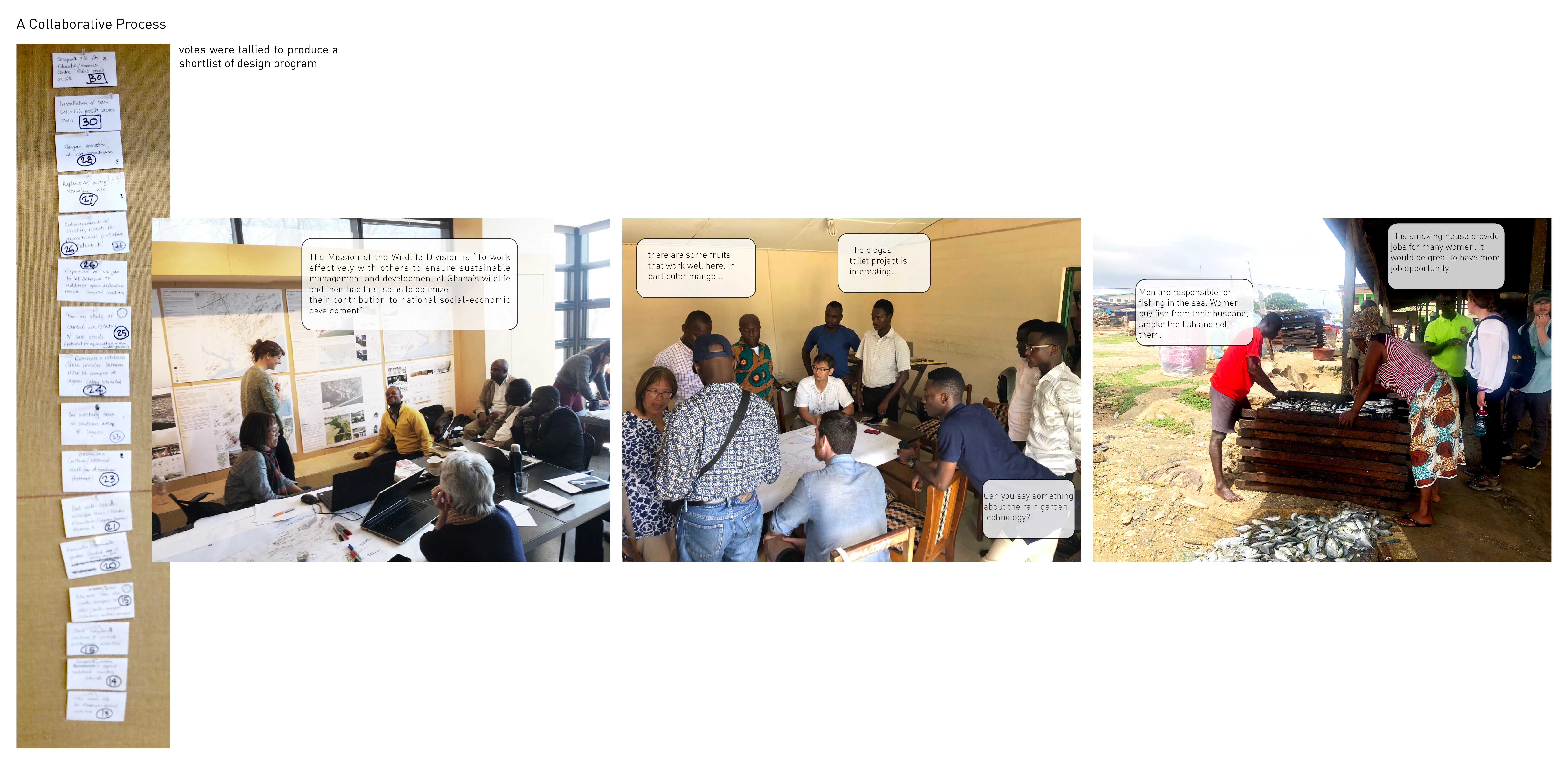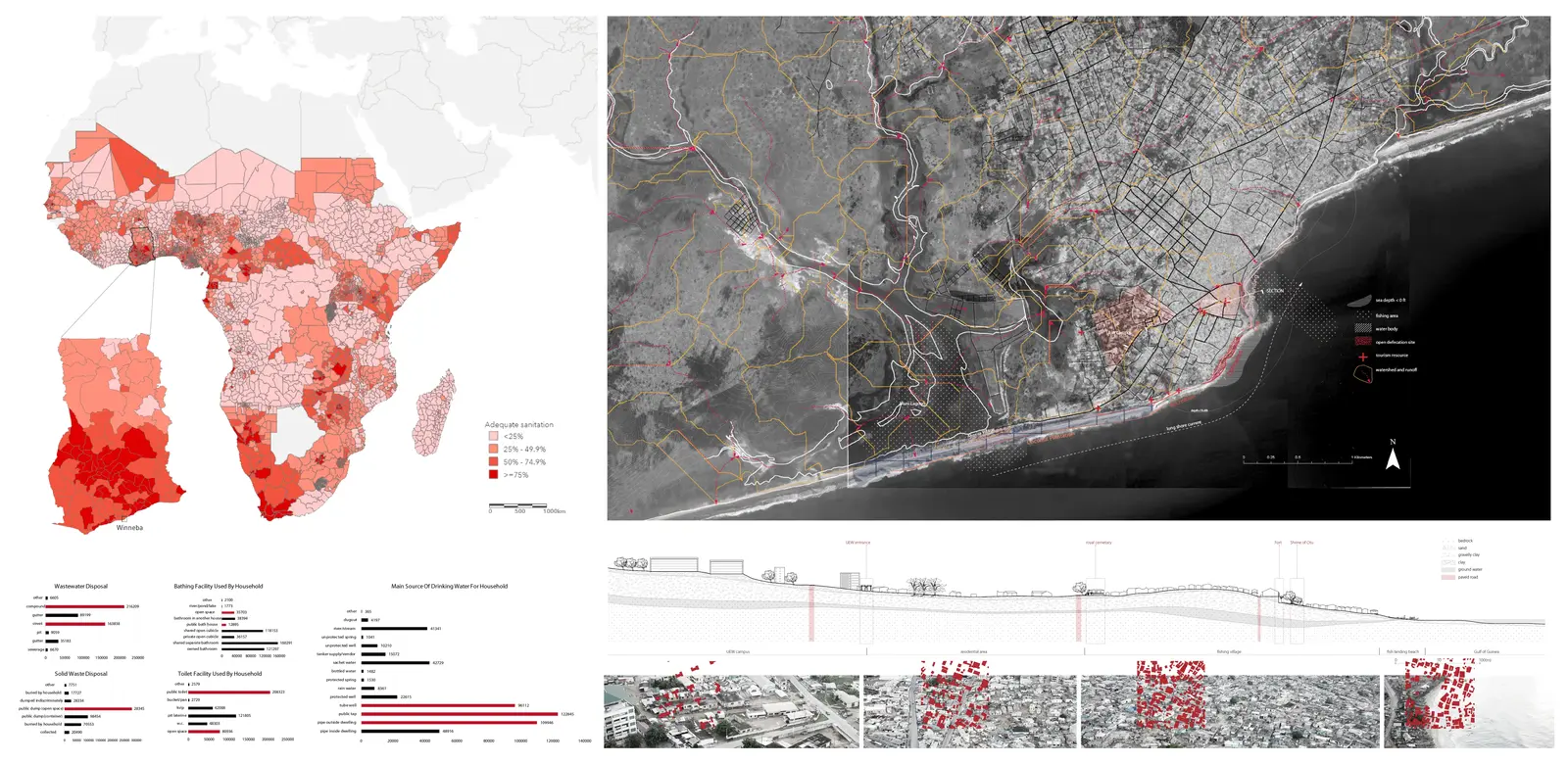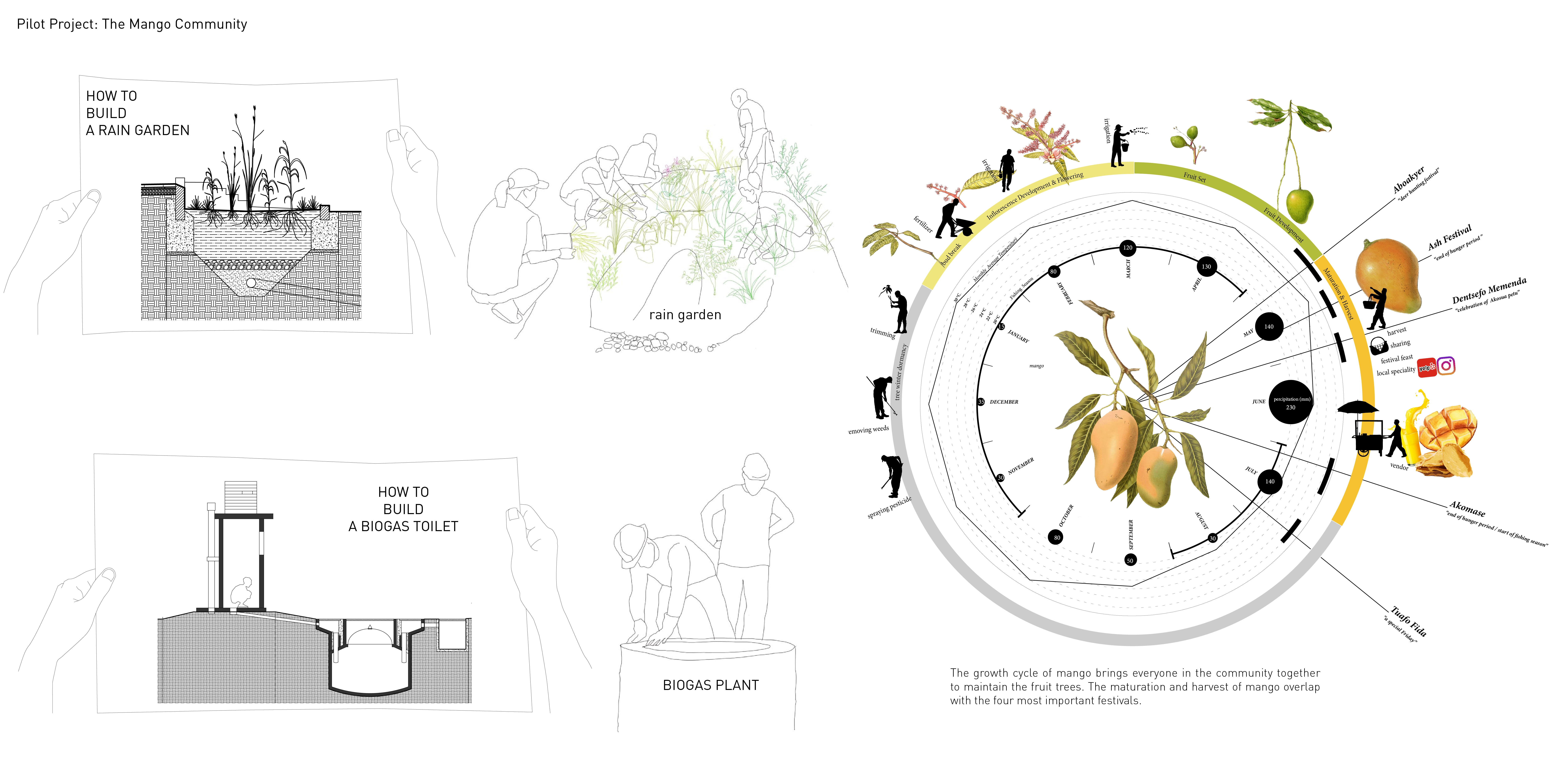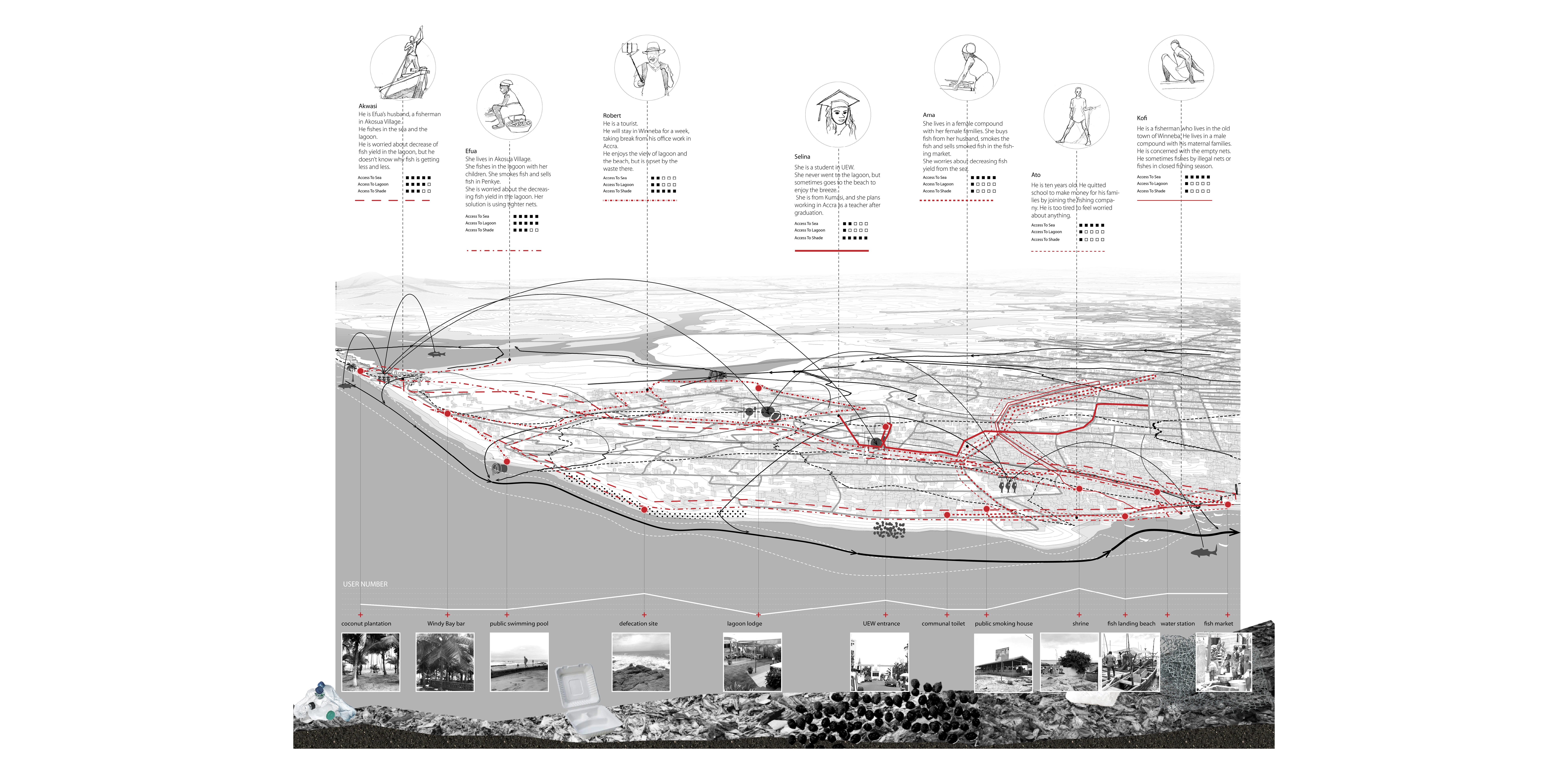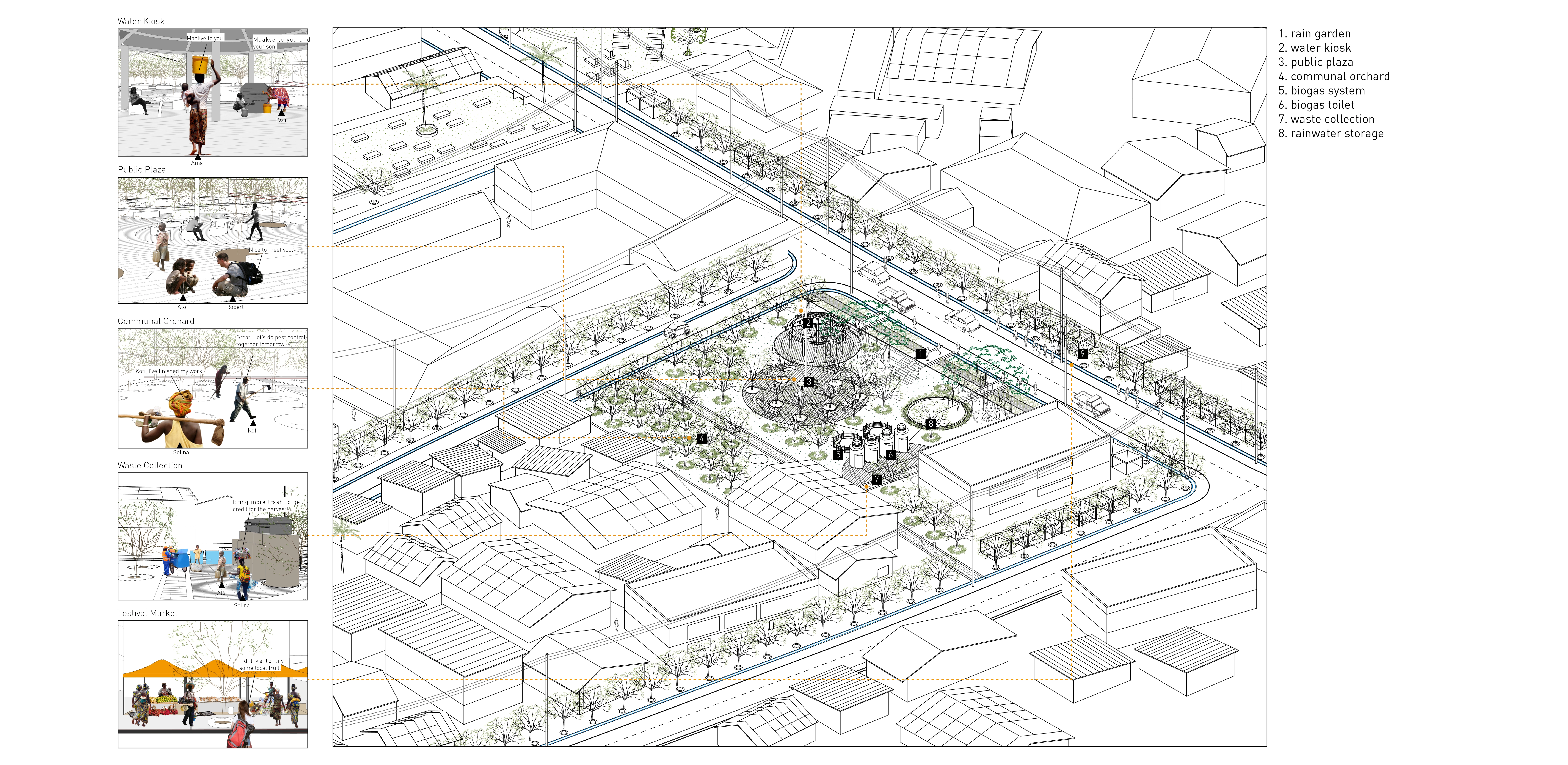 Winneba, just like other coastal cities in West Africa, is suffering from enormous social and ecological challenges, such as inadequate infrastructure, water sanitation, food insecurity, environmental degradation, and social conflicts. This project initiates from understanding the socio-ecological role of Ghanaian public space. Research into community power in conservation, in particular, that of sacred groves, reveals its unique role in legitimizing social arrangements, addressing a sense of belonging, and reconcile differences. The success in maintaining these small eco-systems through local efforts can inform better policy-making. Drawing inspiration from social research and local traditions, this project proposes a network of vegetated public spaces that function as a catalyst to initiate ecological and social transformation. It encourages bottom-up community participation in each of the three phases. In addition to amenities that enable access to tree shade, clean water, public toilets, bio-energy, and food, these spaces provide a connection among residents regardless of their origin and social status. Through collaborative efforts, people of different social groups are brought together to improve social, economic, and environmental well-being.