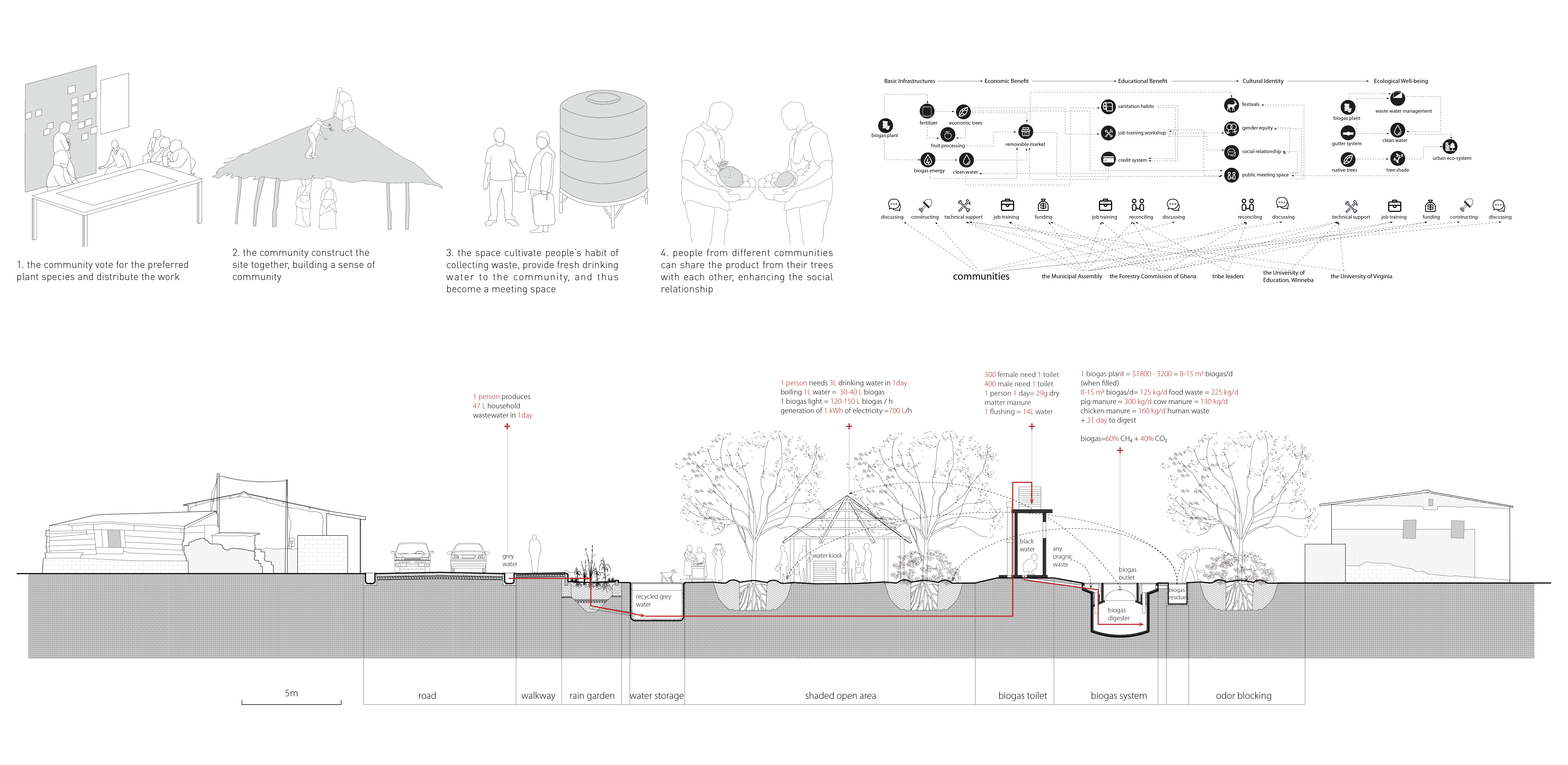 “You cannot protect the environment unless you empower people, you inform them, and you help them understand that these resources are their own, that they must protect them.” -Wangari Maathai, Kenyan political activist and Nobel Peace Prize laureate Context investigation The city of Winneba is located on the Gulf of Guinea in Ghana’s Central Region. Residents have relied on artisan fishing as their main livelihood for hundreds of years. As it expands from a small fishing community to a college town in the 1960s, then to a satellite town of the capital, indigenous Effutu people are joined by migrants from diverse backgrounds. Today, Winneba is a rapidly growing city with a population of 60,000. However, infrastructure lags far behind the development. People defecate in open areas, domestic wastewater is released untreated into natural water bodies, posing great challenges to environmental and public health. The low level of sanitation delivery, which is partially blamed on inappropriate regulations, is interrelated to social inequity. Tackling social issues is as critical to the long-term management of the water sanitation system as building new infrastructure. Social conflicts are always impacting this region, such as hostility between native Effutu and other settlers, matrilineal and patrilineal and dual-descent system, succession issues resulted from colonial history. In addition, gender debates are increasingly significant. Females are usually responsible for collecting water and other household chores. In Ghana, 65% of women spend 3-4 hours per day in just collecting water, limiting their education and financial independence. Social power and management policy Customary practice plays an important role in landscape conservation and social cohesion. Festivals have long been used to celebrate harvest and thank nature’s generosity. Taboos are made by local tribes to protect wetlands and forests. Although in recent years, such cohesion is being shaken by the influx of new arrivals, societal transformation, as well as landscape degradation, the success in maintaining these ecologies through local efforts could still inform better policy-making and management. One of the most notable cases is the conservation of sacred grove, in which no tree is allowed to be removed as it is believed that the spirit of gods will be disturbed. Sacred groves are dense woods standing out from the field, characterized for their cooling shade, and is used to hold ceremonies or rituals by the public. Each time a clan conducts a sacrifice in sacred groves, its members assert certain principles of social order, such as obedience to elders and chiefs. Caring for the grove is considered part of acknowledging such social principles. In a word, the success in maintaining these landscapes relies on that it responds to current structural power, mediates conflicts between social groups, and shapes consensus among them. Design program Drawing inspiration from sacred grove conservation, this project proposed a network of green public spaces, which address social equity and ecological benefits. As an alternative to top-down government-led projects, this project calls for residents to build sanitation infrastructures for their own communities. The proposal integrates a gutter system, rain garden, water kiosks, orchard, communal biogas toilets, and waste collection system into its landscape design. Domestic grey water is filtered and recycled for biogas toilets. Biogas system turns human waste into energy to support water boiling at the water kiosk where people coming to collect clean water can socialize in a traditional way. The residue from biogas system fertilizes economic trees that provide well-needed shade and define public space in the densely populated old town. Cultivating, harvesting, processing and selling tree products by locals further boost public activities and street life. To encourage local participation, a credit system is also included. Residents can gain credit in their account or voucher by using public toilets, bringing organic waste, or taking part in maintenance. Credits and vouchers can be used later to redeem rewards like a liter of clean water, fruits from the communal trees, bus tickets, or school supplies. Everyone in Winneba is equally welcomed to participate in the project and benefit from it. Shades are introduced to the community. Access to improved water facilities reduces the risks of transmitting disease, releases women from the heavy burden of collecting water. In addition, through collaborative labor, different social groups are brought together to build their community, thus cultivate a cultural identity. Phasing Strategy This project is mostly based on bottom-up community participation. A newly established committee made of members from the Municipal Assembly, the University of Education, Winneba, the local tribe leaders, the Forestry Commission of Ghana, and representatives from the University of Virginia will be responsible for funding, advising, training, mediating potential conflicts, and overseeing the whole process. PHASE 1: Building recognition of public space In Ghana trees indicate the existence of gathering space for many reasons, culturally and sensorially, therefore trees are considered as essential design elements to demarcate the site for public use. The community will be given a list of recommended tree species. The list includes trees that are tolerant to the local environment and have economic potentials. Residents are asked to vote for their preferred ones and plant trees to occupy the conserved vacant land, in order to prevent illegal housing encroachment. As the trees grow, the groves will become popular meeting space and shelter under tropical sun. A pilot project will be built in one of the communities near the old town, within five minutes’ walk from the shrine where famous festivals and related animal sacrifices are held. Mango tree has been selected a