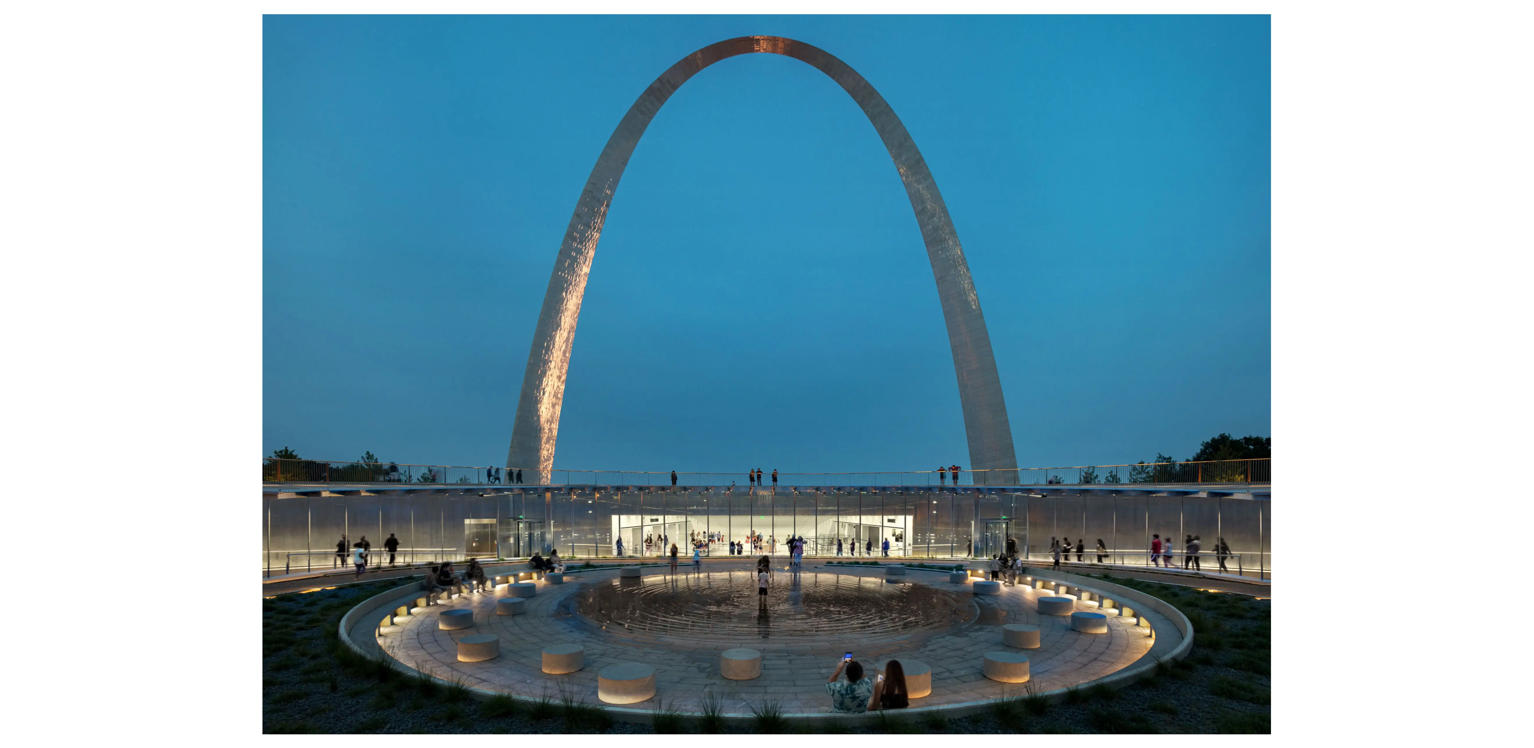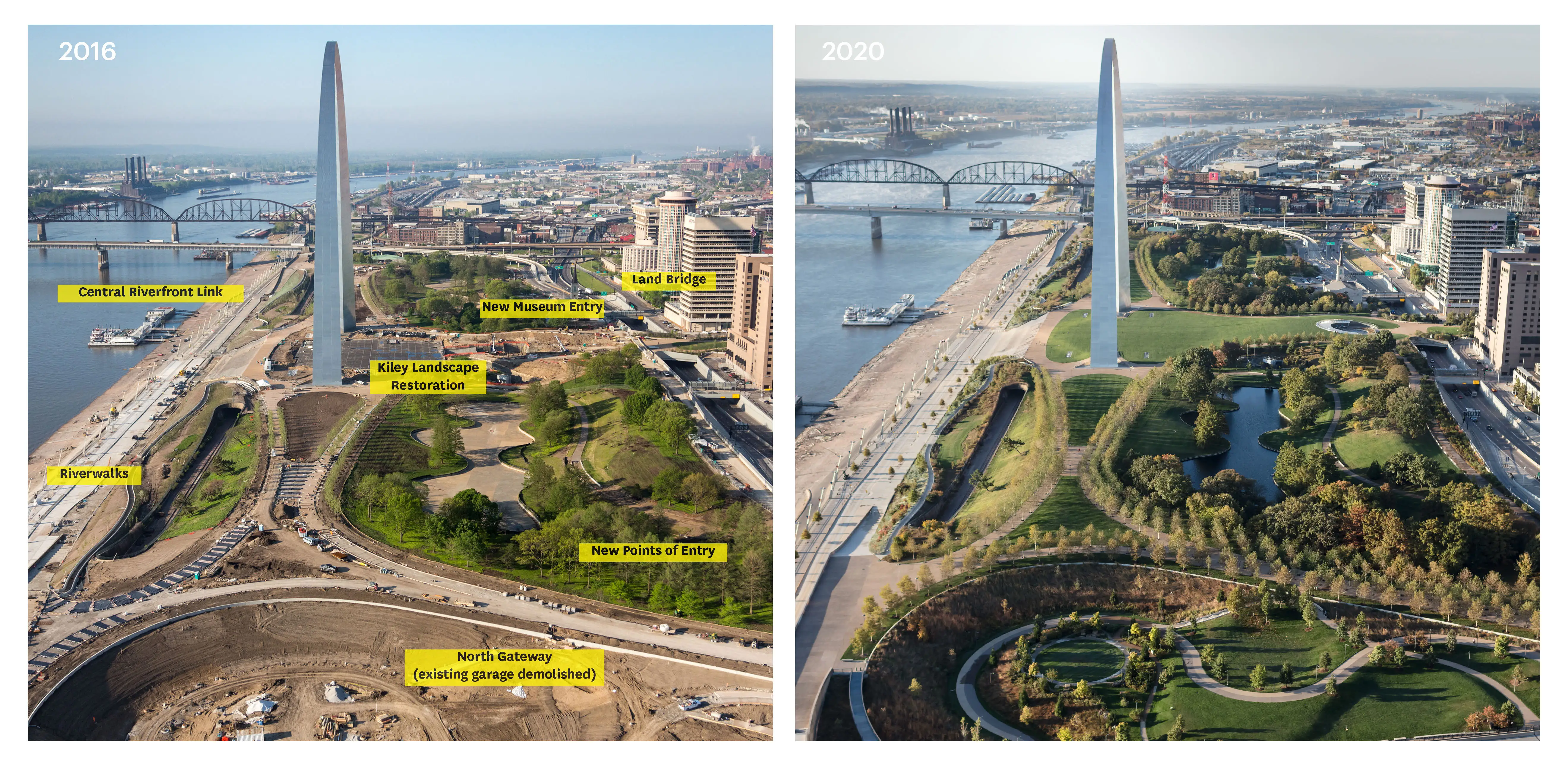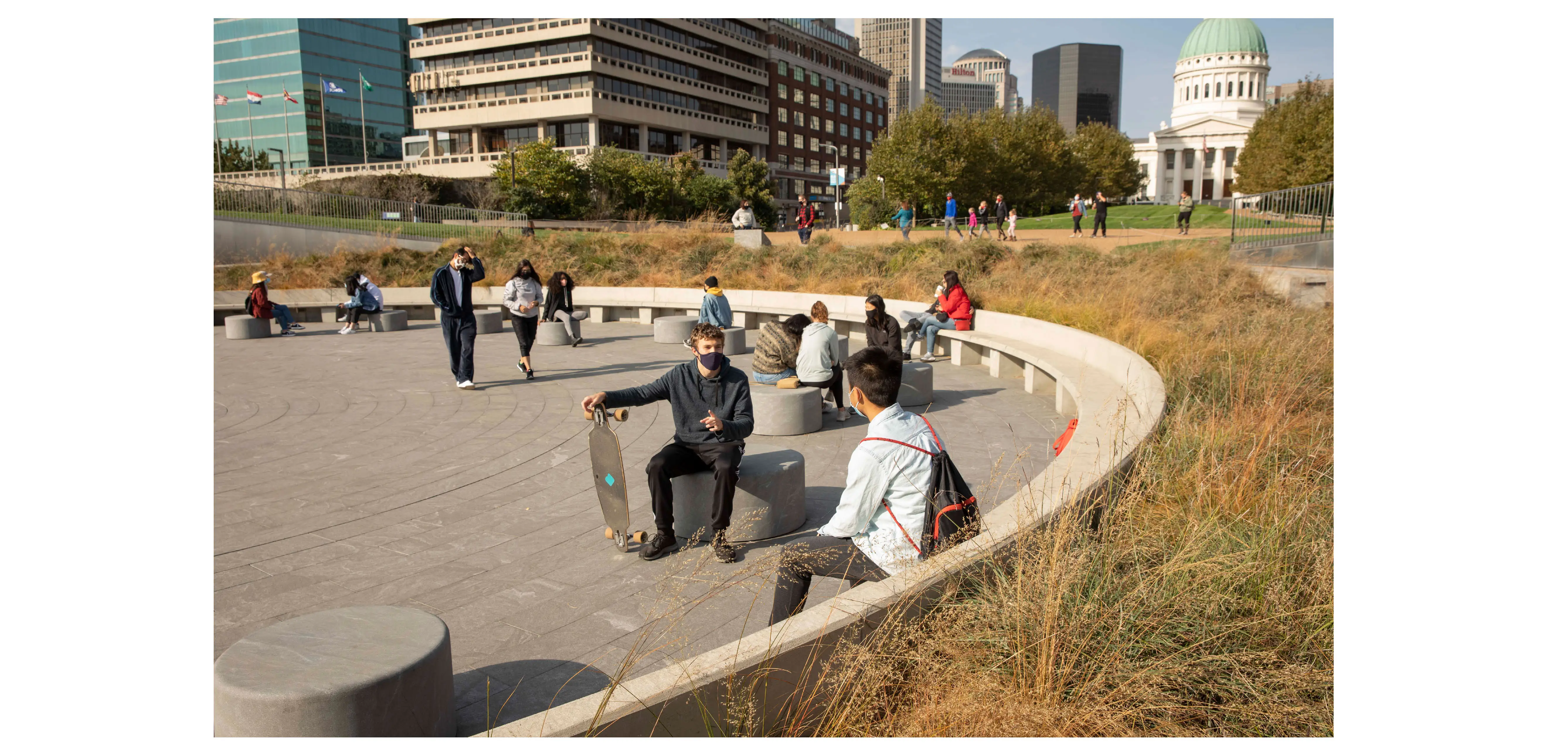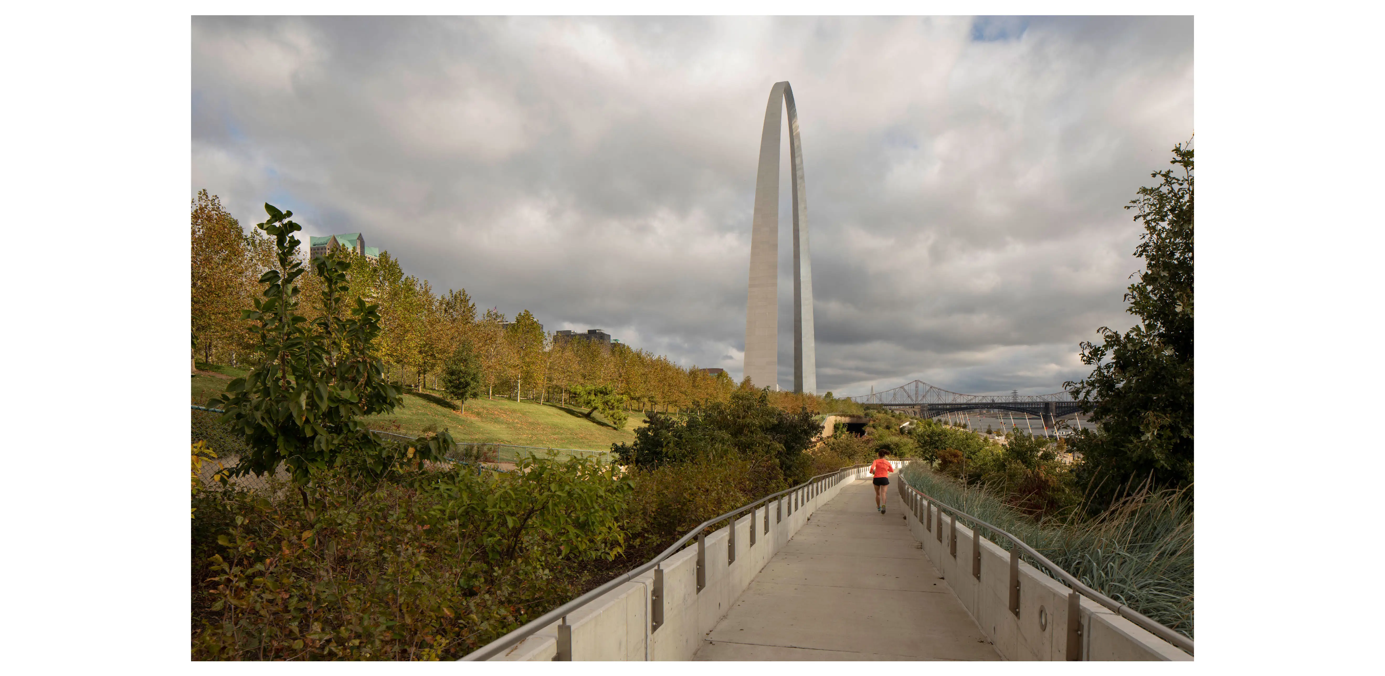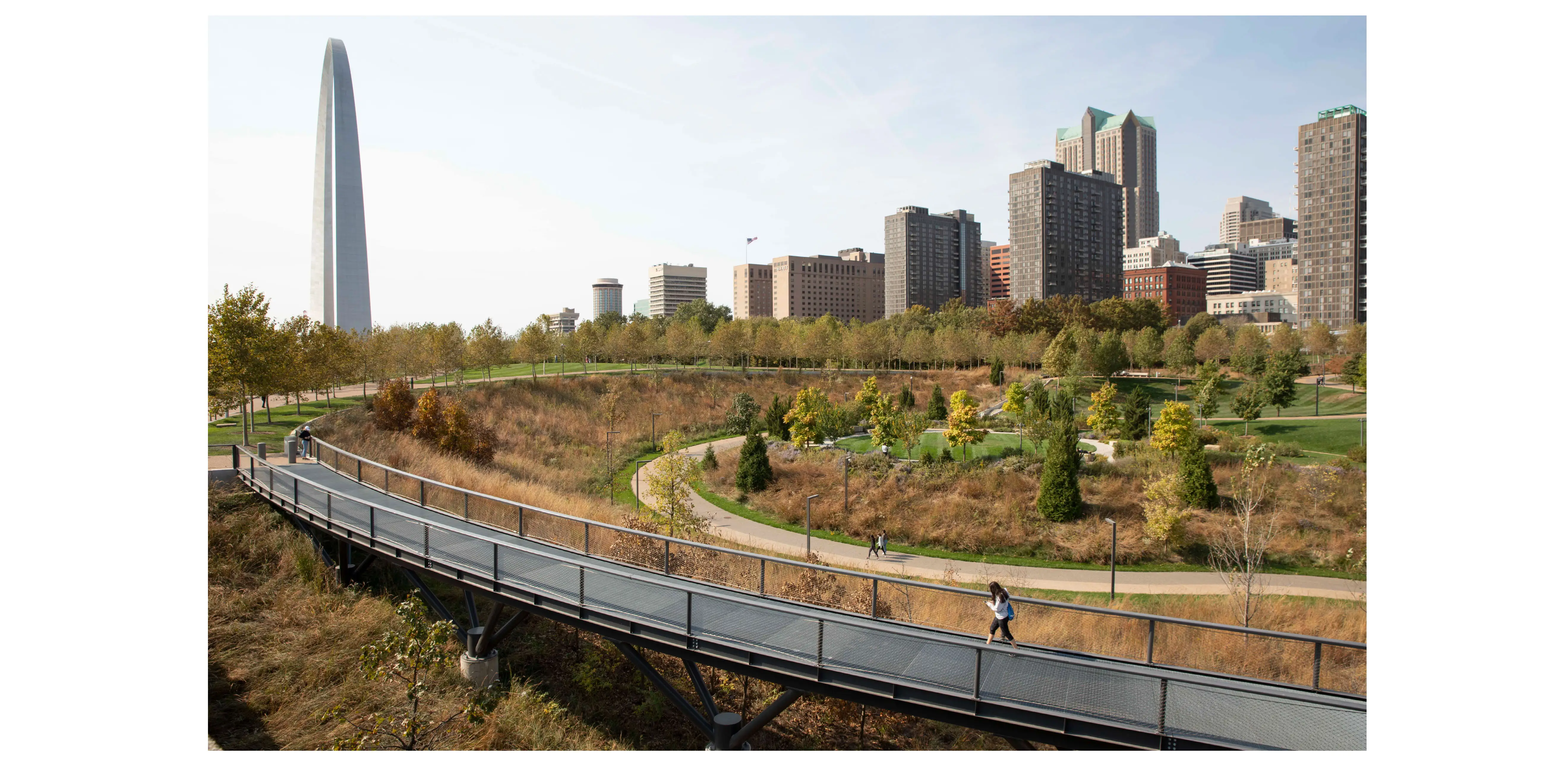 Weaving a National Landmark Back into the Urban Context of St. Louis Eero Saarinen’s Gateway Arch, conceived alongside the 91-acre grounds designed by Dan Kiley, is an unforgettable St. Louis landmark memorializing a nationally significant crossing point of the Mississippi River. Severed from downtown by an interstate highway introduced late in the original design process and with connectivity further weakened by decades of piecemeal planning, the Arch grounds did not live up to their promise as a center of public life. As the monument approached its 50th anniversary, The CityArchRiver Foundation commissioned a project to lay out a comprehensive urban design strategy to redefine and expand its role in the city and region. The Foundation was formed in 2009 to bring together the Mississippi River and the Arch as national landmarks, and remedy the monument’s unfulfilled economic and social potential. In 2010, the landscape architects, leading a large team of consultants, won an international ideas competition with their proposal for how to reconnect the experience of downtown St. Louis, the Gateway Arch, and Mississippi River—while breathing new life and economic vitality into a downtown suffering from 5 decades of population and economic decline. The design employed a myriad of tactical solutions to mitigate problematic infrastructure, poor urban connectivity, and a high-maintenance, under-performing landscape. Together, these solutions formed a unified strategy to accomplish the project’s overarching objective. The team worked with 30 federal, state, and city agencies, community groups, and countless other stakeholders to overcome the monument’s isolation. Key topics of early planning efforts included interstate transportation, multi-modal connectivity, sustainability and landscape resilience, water quality improvements in the Mississippi, the needs of the local business community, regional economic impact, accessibility, equity, and the prospect of democratizing the prominent site given its location within the federal jurisdiction. When the I-70 highway was built just after the monument was finished, downtown St. Louis became completely cut off from the Arch grounds. The CityArchRiver team used traffic planning models to persuade transportation agencies to approve the reclamation of a significant portion of the National Parkland that intersected the Interstate right-of-way. The reinstatement of park sovereignty facilitated a new land bridge that spanned over the highway, integrating the existing park into a new downtown-facing museum entrance, and, at a broader scale, linking St. Louis’ Gateway Mall, to the Mississippi River. The new land bridge and museum entry transformed the experience of visiting the Arch by welcoming the visitor at the beginning of a visit, making the entire facility accessible for the first time, and creating a series of interior and exterior spaces along the axis of the Arch to support both local St. Louis cultural events in line with the mission of the National Park. The project was funded through private and public sources, including a voter-supported sales tax and federal funding through a Transportation Investment Generating Economic Recovery (TIGER) Grant. Rethinking Access to Support a More Inclusive Landscape The primary entrance to the Arch grounds was a 1,600-car garage on the north side of the site which offered all too convenient access to and from the highway, bypassing most visitor interaction with downtown. As part of the CityArchRiver project, the garage was demolished and an incentive program was created to direct visitors to the many underutilized garages along the nearby Gateway Mall. The removal of the garage and the associated roadways created 9.3 acres of newly designed landscapes to invite visitors and locals alike to the grounds and offer new experiences at the edges of the site. The reclaimed area features a bowl-shaped lawn for musical performances and festivals and an Explorer’s Garden set against the backdrop of the Eads Bridge masonry previously concealed by the massive garage. A once-isolated neighborhood and light-rail station north of the monument is now accessible directly to and from the Arch grounds and the downtown core via a curved, 400-foot-long elevated walk. Overall removal of the garage, improves transportation efficacy, pedestrian safety, bike networks, and casual and programmed activities for the surrounding communities—all of which strengthen the sense of a civic connection to the monument. The previously underutilized and hard-to-access Kiener Plaza, which is the westernmost open space in the Gateway Mall axis, was redesigned to provide a landing point for most visitors to the National Park, including a playground, cafe, lawn, and market space that serve as a draw for both tourists and locals. A 16-foot-wide loop trail was inscribed into the edge of the site, decoupled from the adjacent roads improving pedestrian and bike connections between the downtown, the Arch grounds, and the Mississippi Riverfront. Replacing unapproachable street-edge sidewalks, a new trail meanders through the park landscape, and links to the new central bikeway on the Mississippi River that ties together multiple regional networks. The loop and network of pedestrian access work together to make accessibility the norm, rather than the exception. Environmental Sustainability and Landscape Resilience The project navigated historic preservation parameters defined by the NPS and contemporary goals for ecological resilience. Over 800 ash trees, vulnerable to the Emerald Ash Borer, were replaced with more resilient London Plane trees and an additional 3,000 new trees were planted on site. New meadows and bioswales improved habitat and stormwater management while honoring the original design intent. Shallow sinuous ponds, originally designed by Kiley and Saarinen, were re-engineered to eliminate green algae plumes resulting from nutrient 