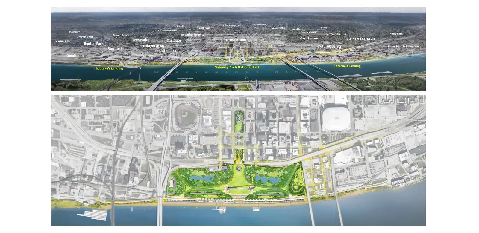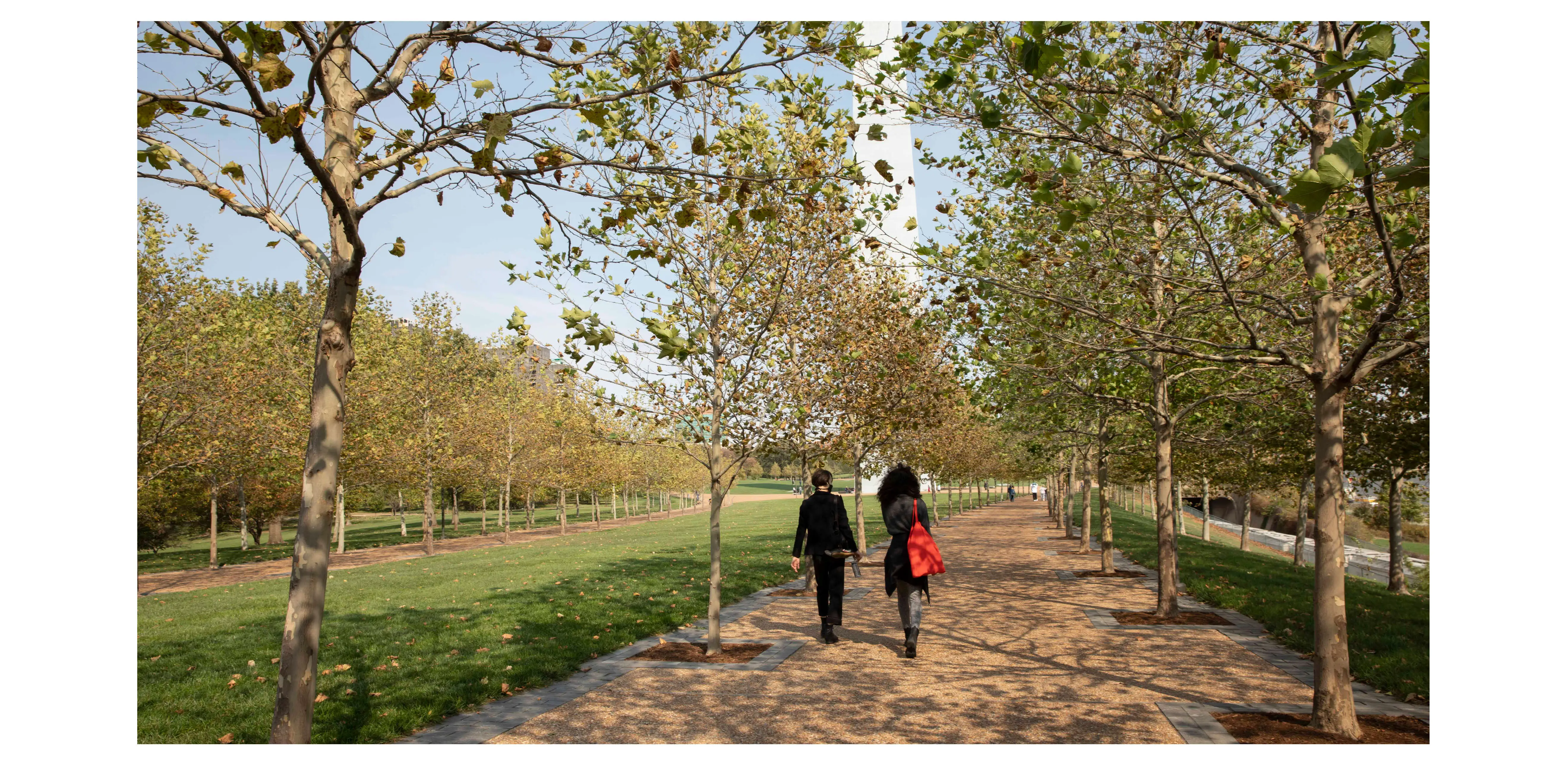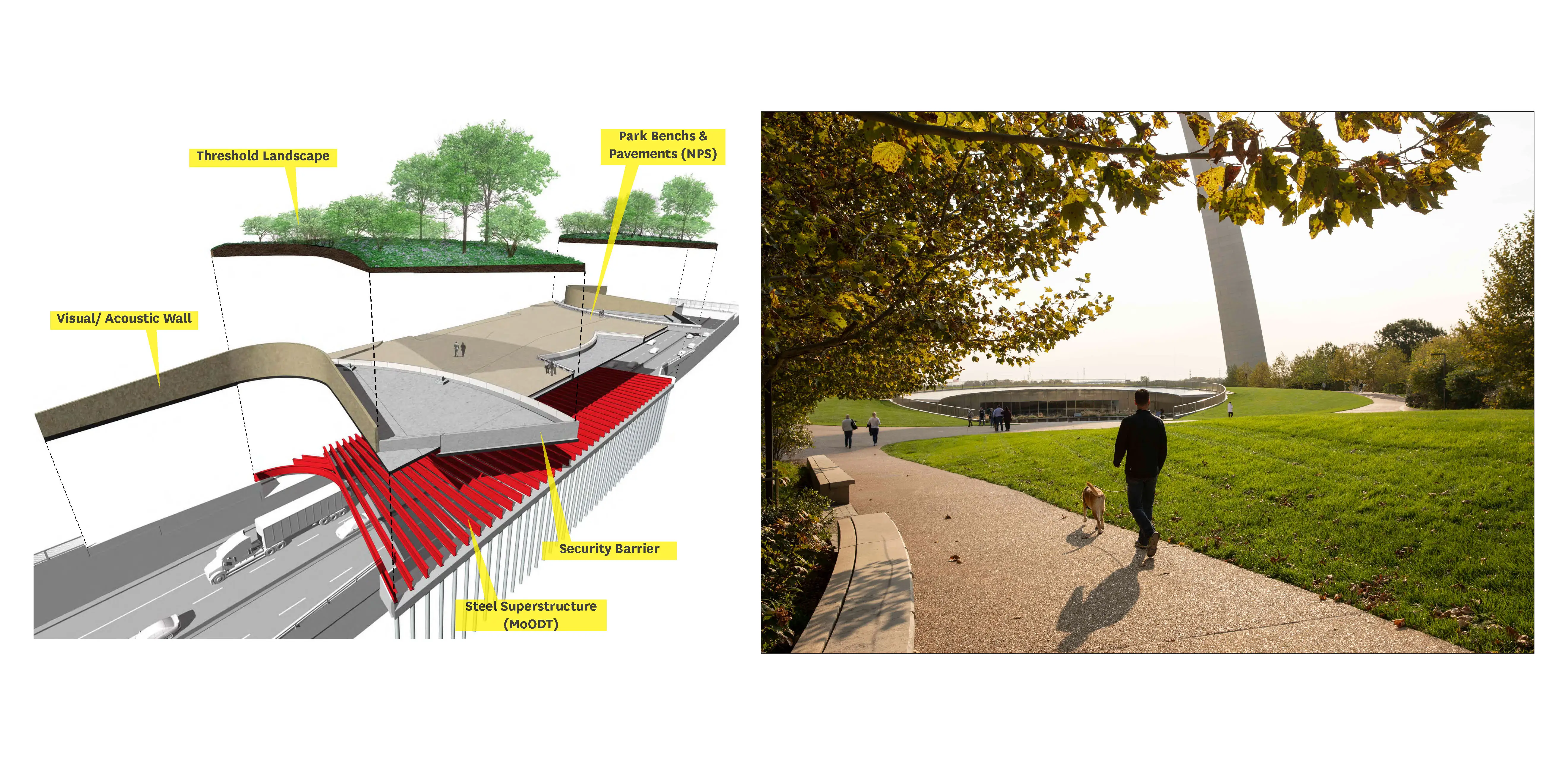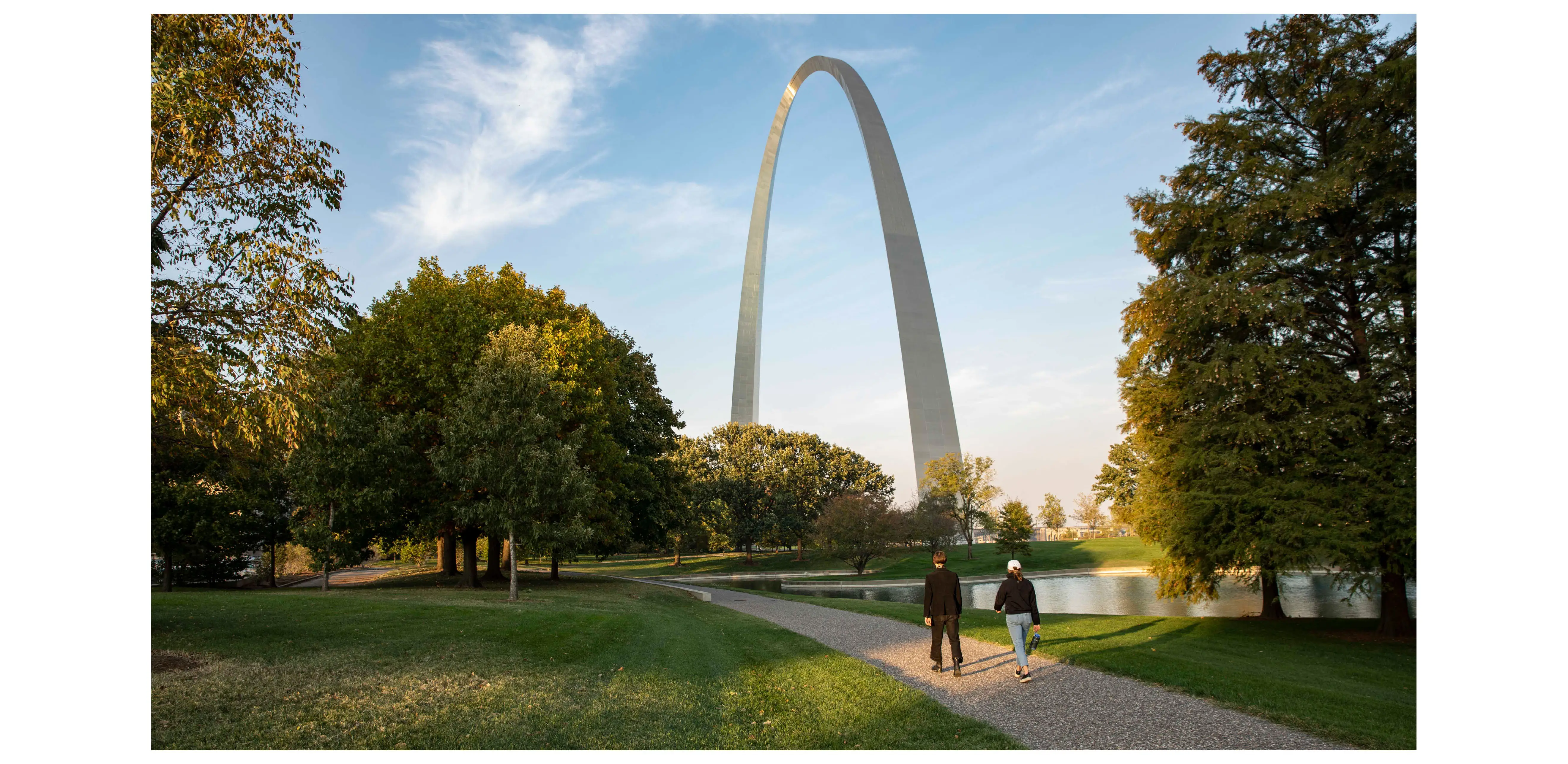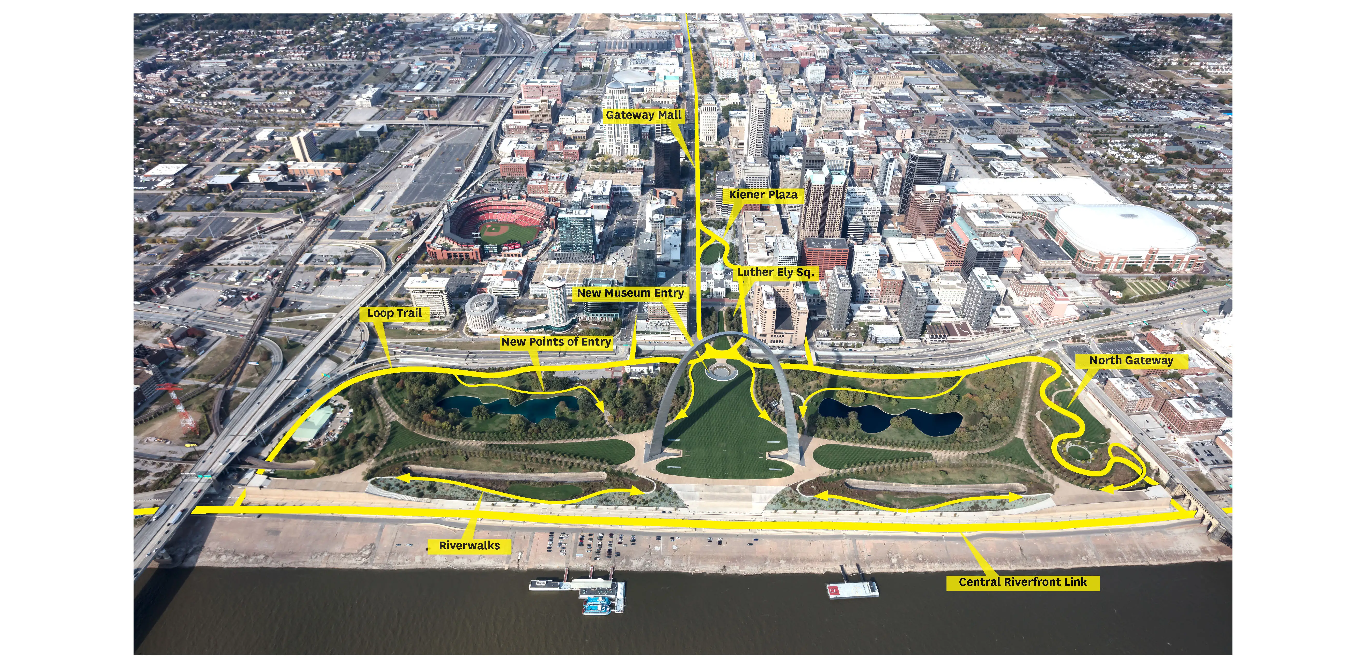 Weaving a National Landmark Back into the Urban Context of St. Louis Eero Saarinen’s Gateway Arch, conceived alongside the 91-acre grounds designed by Dan Kiley, is an unforgettable St. Louis landmark memorializing a nationally significant crossing point of the Mississippi River. Severed from downtown by an interstate highway introduced late in the original design process and with connectivity further weakened by decades of piecemeal planning, the Arch grounds did not live up to their promise as a center of public life. As the monument approached its 50th anniversary, The CityArchRiver Foundation commissioned a project to lay out a comprehensive urban design strategy to redefine and expand its role in the city and region. The Foundation was formed in 2009 to bring together the Mississippi River and the Arch as national landmarks, and remedy the monument’s unfulfilled economic and social potential. In 2010, the landscape architects, leading a large team of consultants, won an international ideas competition with their proposal for how to reconnect the experience of downtown St. Louis, the Gateway Arch, and Mississippi River—while breathing new life and economic vitality into a downtown suffering from 5 decades of population and economic decline. The design employed a myriad of tactical solutions to mitigate problematic infrastructure, poor urban connectivity, and a high-maintenance, under-performing landscape. Together, these solutions formed a unified strategy to accomplish the project’s overarching objective. The team worked with 30 federal, state, and city agencies, community groups, and countless other stakeholders to overcome the monument’s isolation. Key topics of early planning efforts included interstate transportation, multi-modal connectivity, sustainability and landscape resilience, water quality improvements in the Mississippi, the needs of the local business community, regional economic impact, accessibility, equity, and the prospect of democratizing the prominent site given its location within the federal jurisdiction. When the I-70 highway was built just after the monument was finished, downtown St. Louis became completely cut off from the Arch grounds. The CityArchRiver team used traffic planning models to persuade transportation agencies to approve the reclamation of a significant portion of the National Parkland that intersected the Interstate right-of-way. The reinstatement of park sovereignty facilitated a new land bridge that spanned over the highway, integrating the existing park into a new downtown-facing museum entrance, and, at a broader scale, linking St. Louis’ Gateway Mall, to the Mississippi River. The new land bridge and museum entry transformed the experience of visiting the Arch by welcoming the visitor at the beginning of a visit, making the entire facility accessible for the first time, and creating a series of interior and exterior spaces along the axis of the Arch to support both local St. Louis cultural events in line with the mission of the National Park. The project was funded through private and public sources, including a voter-supported sales tax and federal funding through a Transportation Investment Generating Economic Recovery (TIGER) Grant. Rethinking Access to Support a More Inclusive Landscape The primary entrance to the Arch grounds was a 1,600-car garage on the north side of the site which offered all too convenient access to and from the highway, bypassing most visitor interaction with downtown. As part of the CityArchRiver project, the garage was demolished and an incentive program was created to direct visitors to the many underutilized garages along the nearby Gateway Mall. The removal of the garage and the associated roadways created 9.3 acres of newly designed landscapes to invite visitors and locals alike to the grounds and offer new experiences at the edges of the site. The reclaimed area features a bowl-shaped lawn for musical performances and festivals and an Explorer’s Garden set against the backdrop of the Eads Bridge masonry previously concealed by the massive garage. A once-isolated neighborhood and light-rail station north of the monument is now accessible directly to and from the Arch grounds and the downtown core via a curved, 400-foot-long elevated walk. Overall removal of the garage, improves transportation efficacy, pedestrian safety, bike networks, and casual and programmed activities for the surrounding communities—all of which strengthen the sense of a civic connection to the monument. The previously underutilized and hard-to-access Kiener Plaza, which is the westernmost open space in the Gateway Mall axis, was redesigned to provide a landing point for most visitors to the National Park, including a playground, cafe, lawn, and market space that serve as a draw for both tourists and locals. A 16-foot-wide loop trail was inscribed into the edge of the site, decoupled from the adjacent roads improving pedestrian and bike connections between the downtown, the Arch grounds, and the Mississippi Riverfront. Replacing unapproachable street-edge sidewalks, a new trail meanders through the park landscape, and links to the new central bikeway on the Mississippi River that ties together multiple regional networks. The loop and network of pedestrian access work together to make accessibility the norm, rather than the exception. Environmental Sustainability and Landscape Resilience The project navigated historic preservation parameters defined by the NPS and contemporary goals for ecological resilience. Over 800 ash trees, vulnerable to the Emerald Ash Borer, were replaced with more resilient London Plane trees and an additional 3,000 new trees were planted on site. New meadows and bioswales improved habitat and stormwater management while honoring the original design intent. Shallow sinuous ponds, originally designed by Kiley and Saarinen, were re-engineered to eliminate green algae plumes resulting from nutrient 