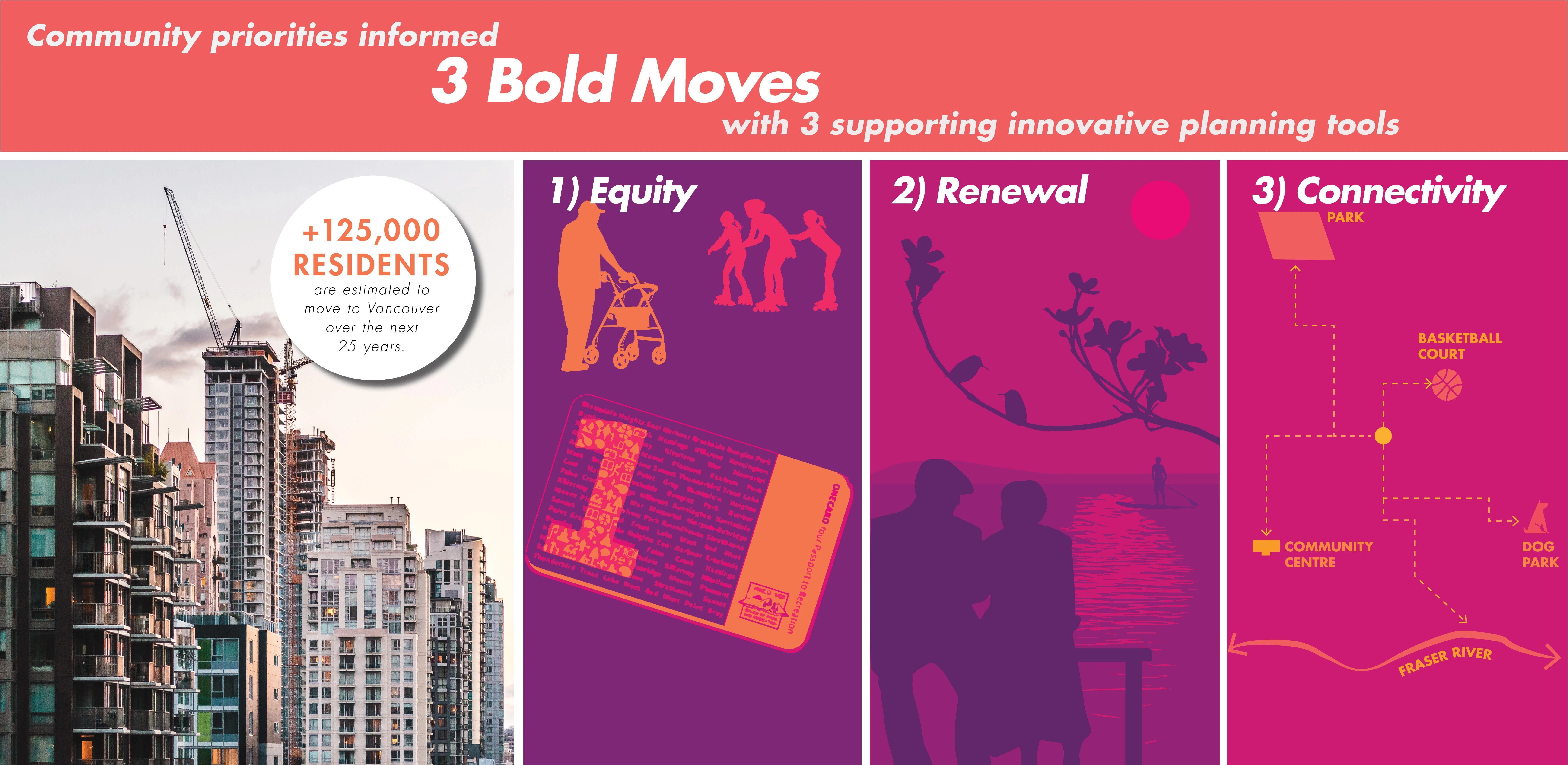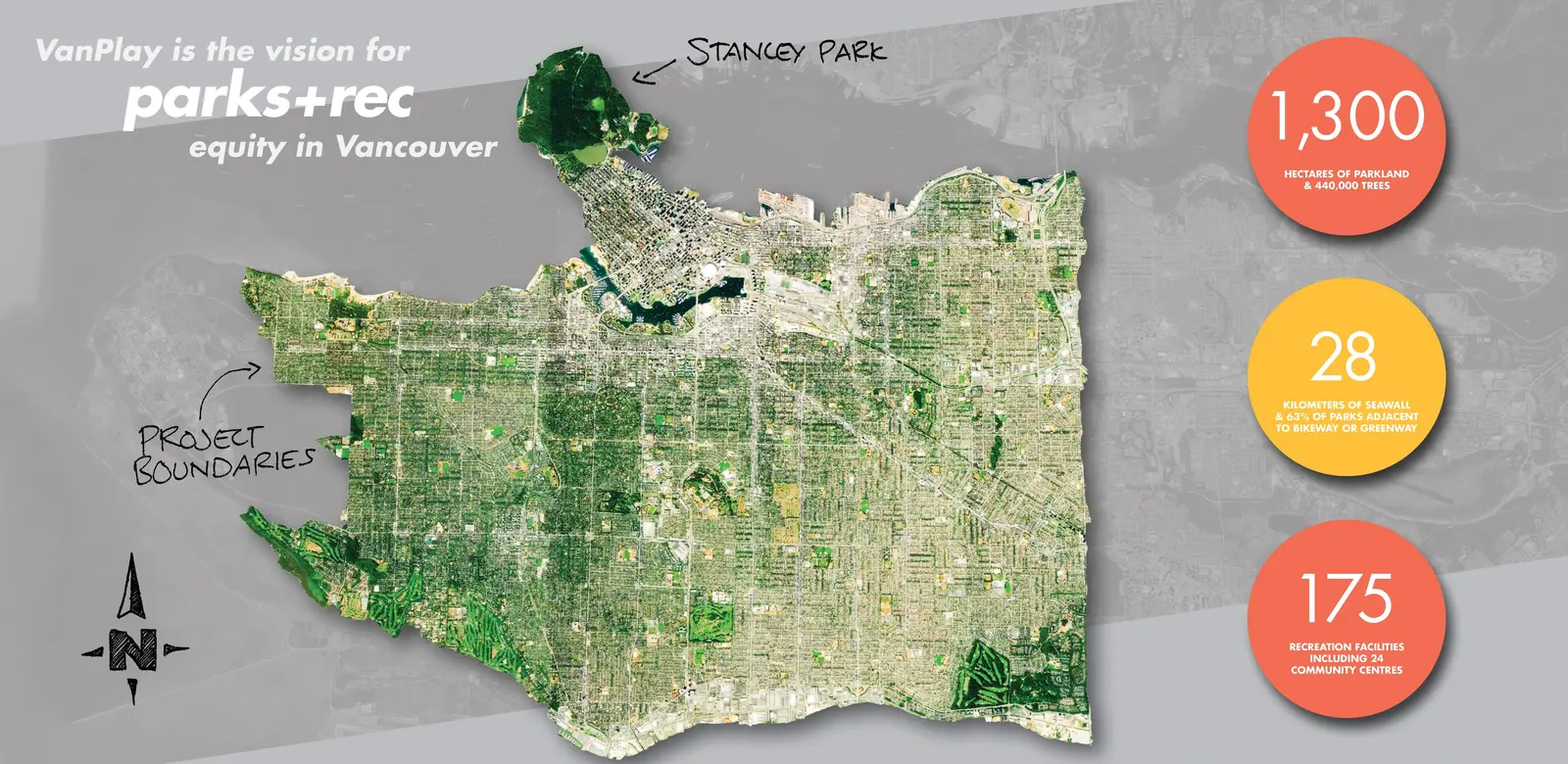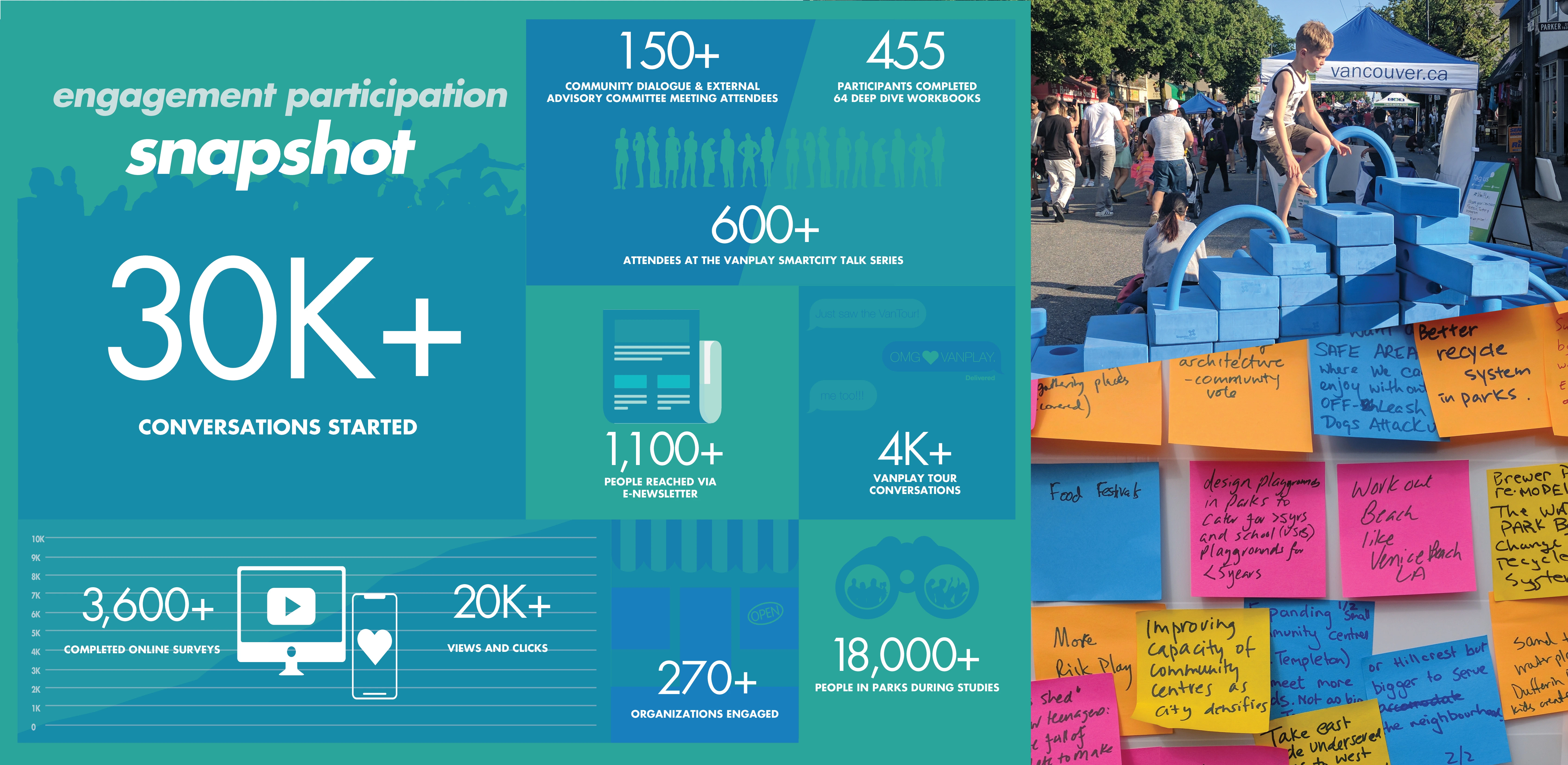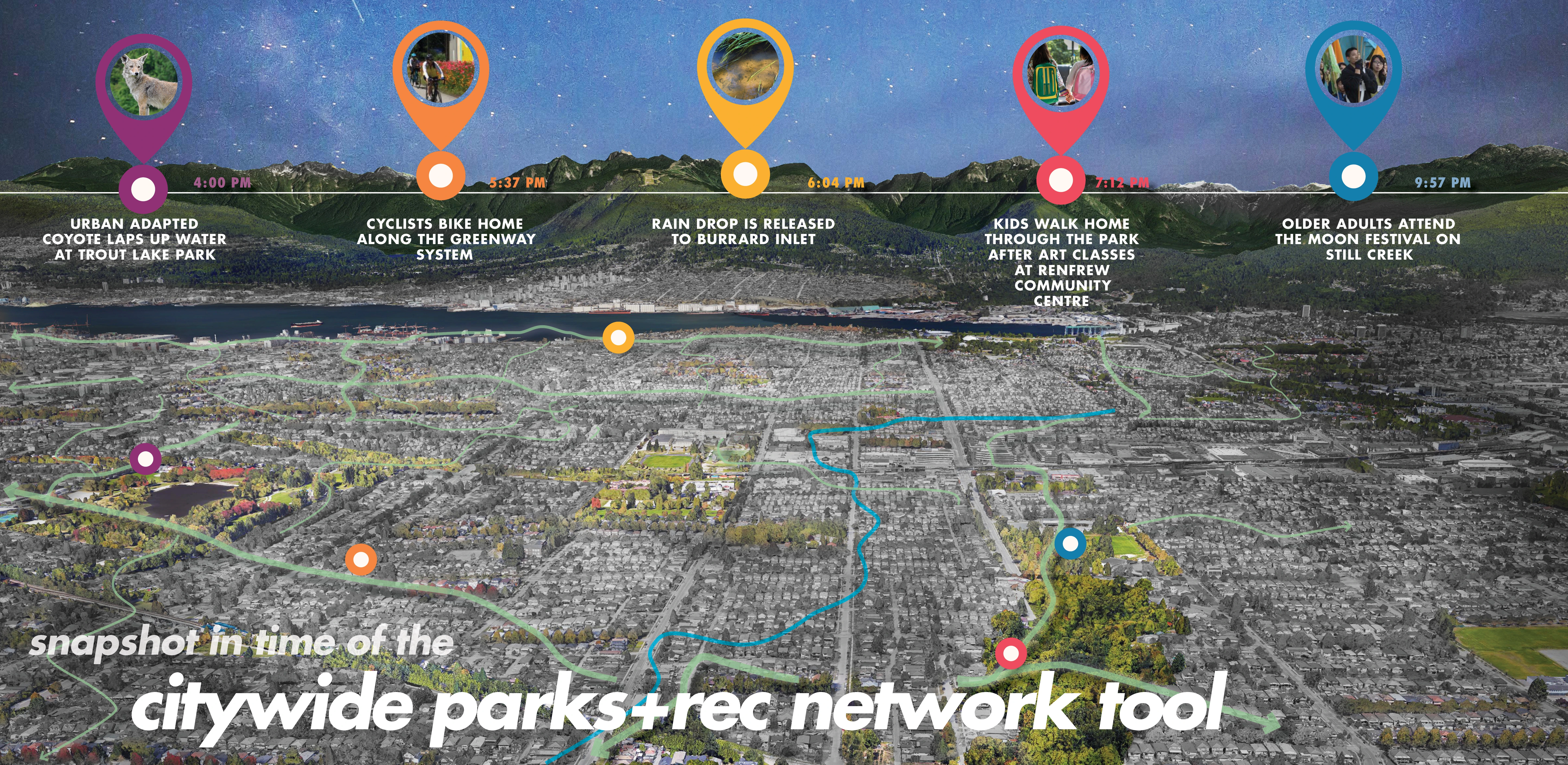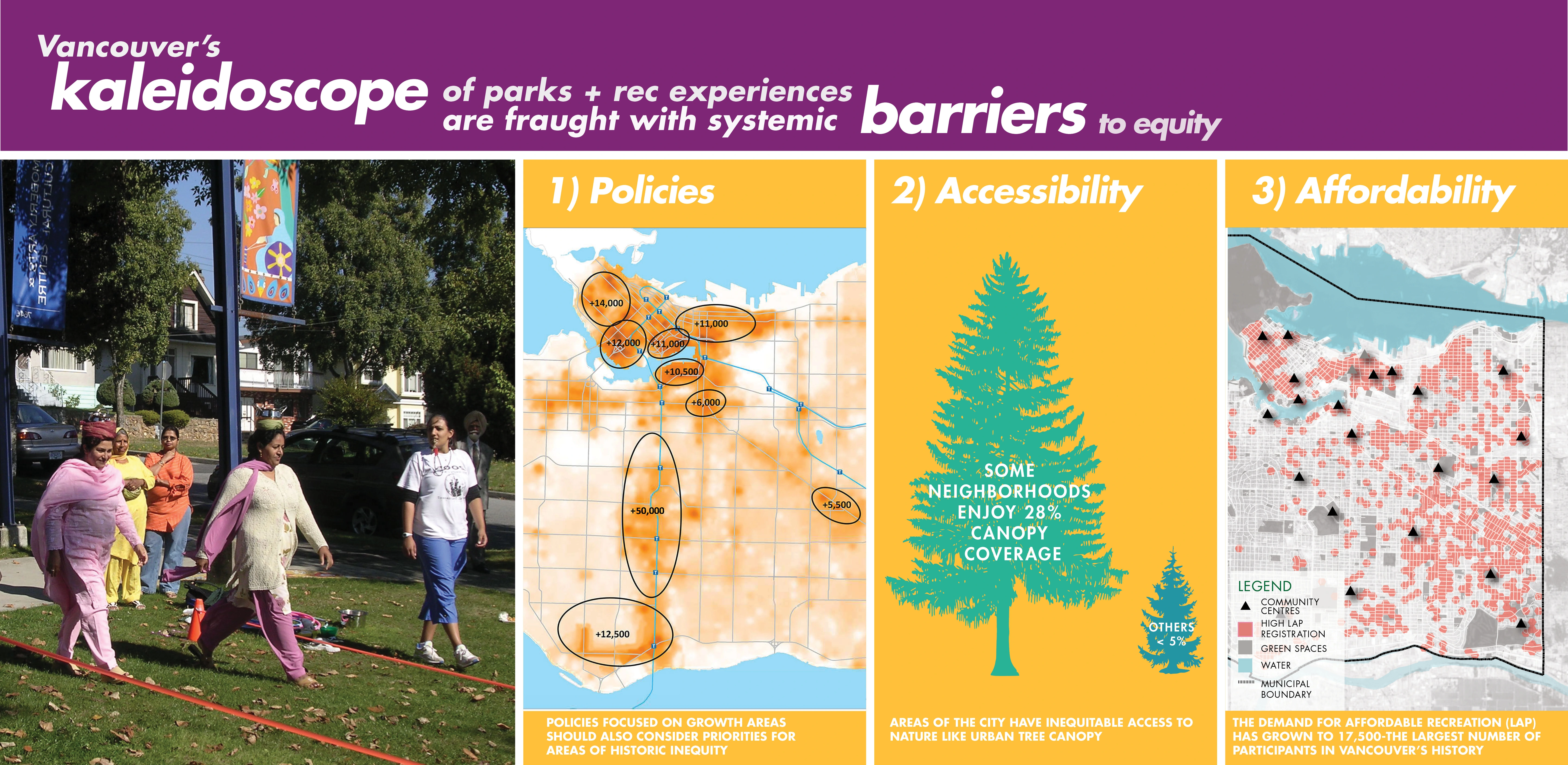 PROJECT GOALS VanPlay is centered around three Bold Moves that support the pursuit of equity, connectivity, and access to parks and recreation for the current population and the 125,000 additional city residents anticipated by 2040. As a 44-square-mile land-locked city, Vancouver would have to add a park the size of Stanley Park (1001 acres) to keep up with the projected densification. Helping to address this future and lift up areas of historic inequity, the Bold Moves include three innovative planning tools: 1. Initiative Zone Mapping Tool highlights areas of the city in need of resources and includes equity analysis factors so that projects, programs, and plans can be focused for more equitable provision over time. 2. Parks and Recreation Asset Target Tool considers quantity, quality, capacity, and distribution of parks, natural areas and recreation facilities in the context of a growing population, deferred maintenance and limited resources. 3. Citywide Parks and Recreation Network Tool conceptualizes a 100-year vision of a seamless public realm to connect places, such as community centers, trail systems and large parks together with publicly accessible waterfront lands that expand access regionally and protect ecosystems threatened by impacts of climate change. SOCIAL DATA AND ANALYSIS SNAPSHOT Each tool addresses a critical question for the future of parks and recreation and is informed by a strong foundation of previous plans and Vancouver-specific social demographic studies. The team conducted rigorous case studies of global best practices for parks, recreation and equity frameworks. Furthermore, a systemwide observation study (System for Observing Play and Recreation in Communities-SOPARC) took place over six weeks and documented how over 18,000 people used parks in neighborhoods of varying income and diverse backgrounds. Using these findings and a recent park provision study, the team considered barriers to access that are not normally accounted for—such as busy street crossings, lack of public transportation, and the price of local recreation programs. HOW DO WE MEASURE AND MAP SPATIAL EQUITY? While 99 percent of Vancouverites currently live within a 10-minute walk of a greenspace, the quality and condition of these spaces vary widely, particularly in low-income communities. The Initiative Zone Mapping Tool uses three indicators which are layered atop one another at a block-scale resolution to reveal areas of the city that have historically been marginalized for provision of park space, recreation opportunity and green, leafy living environments. This inequity is systemic prejudice and has profound impacts on health and well-being, social capital, and economic development. The spatial equity tool introduced in VanPlay is powerful in its simplicity and how clearly it shows the locations of priority areas. The areas of the city with low park space per person, that are less green, and that are screaming out for more recreation opportunities are the places where there are people living in small apartments, who perhaps do not have private outdoor space like a backyard in which to quarantine, or do not have access to shade on a hot summer day and are more likely to suffer from heat stroke. HOW DO WE MEET COMMUNITY NEEDS WHILE PRIORITIZING LIMITED RESOURCES EQUITABLY? North American cities are struggling to keep up with community needs. In Denver for example, it would take over 400 years at the current level of funding to fill in all the missing sidewalks. Complex, long-standing factors, such as patterns of development and investment, often result in an uneven distribution of amenities across a city. The Parks and Recreation Asset Target Tool takes stock of the city’s recreational resources (assets), which include park space, sport fields, ice rinks, and urban forests, to name a few. The tool analyzes not just their location but also their condition, renewal timelines, and considers future needs through goal setting to ensure all Vancouverites have access to excellent amenities. The planning team scoured benchmark methodologies including the Trust for Public Land’s ParkScore system as well as total asset management best practices. Coupled with the Initiative Zone Mapping Tool, the city can now triangulate which amenities need improvements in distribution and quality, and which ones are located in areas of historic inequity. HOW DO WE CONNECT MORE PEOPLE TO NATURE AND STRENGTHEN ENVIRONMENTAL RESILIENCE? The Citywide Parks and Recreation Network Tool conceptualizes places to play, exercise, and socialize with direct and intuitive connections for pedestrians and cyclists of all ages and abilities in and between these spaces, while providing pathways for the movement of urban wildlife and stormwater. Multiple departments collaborated together to understand how this tool could help Vancouver adapt to the impacts of climate change, including a potential 11 percent loss of the city’s landmass to sea level rise, while adding more opportunities for recreation and wellness through the city. Because land in Vancouver can cost into the tens of millions of dollars per hectare, buying the land needed for new parks to balance the rapid growth in population is not possible. For this reason, the Network Tool provides a new conceptualization of recreational space, which includes the whole public realm—streetscapes, tree canopy, schools, rooftops, interiors of buildings—with a call for integrated blue-green infrastructure systems that can provide resilience in the face of climate change and global pandemics. From a public health perspective, this network extends into Equity Initiative Zones and helps connect those communities, which typically experience transportation barriers and public health inequities, with more opportunities for walking and cycling to greenspace destinations as part of their daily lives. 30,000 COMMUNITY CONVERSATIONS Facing a community burned-out with planning fatigu