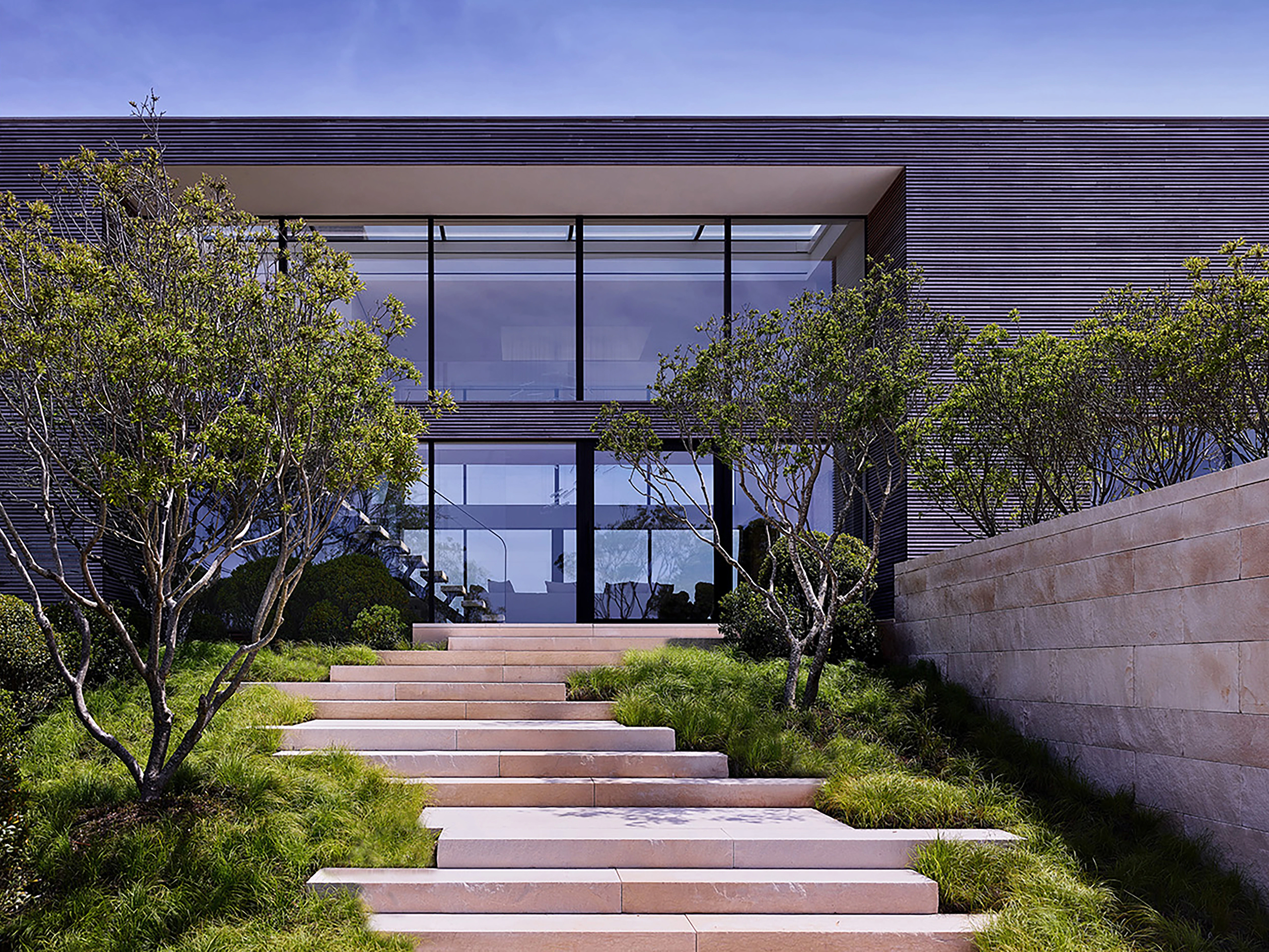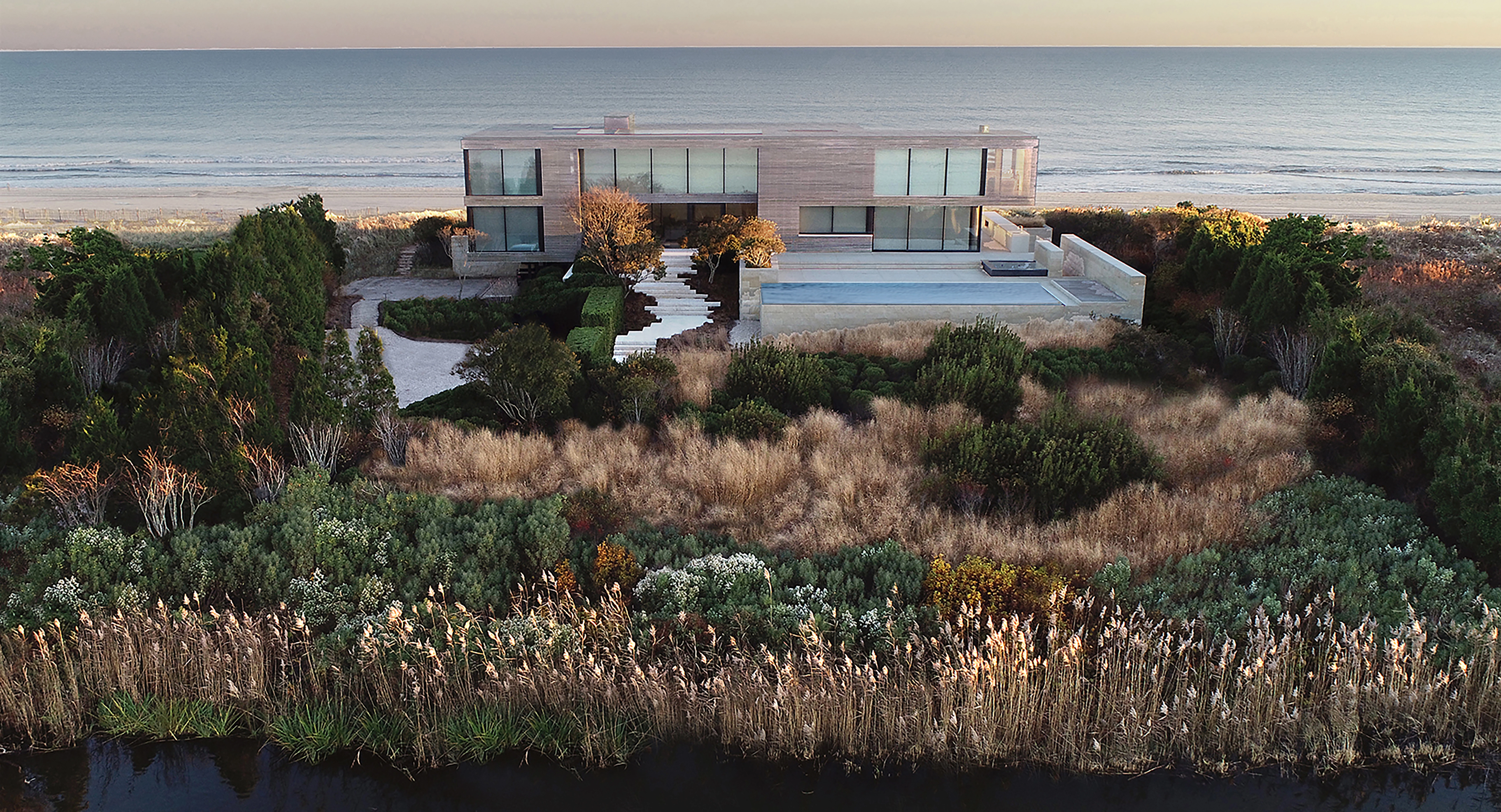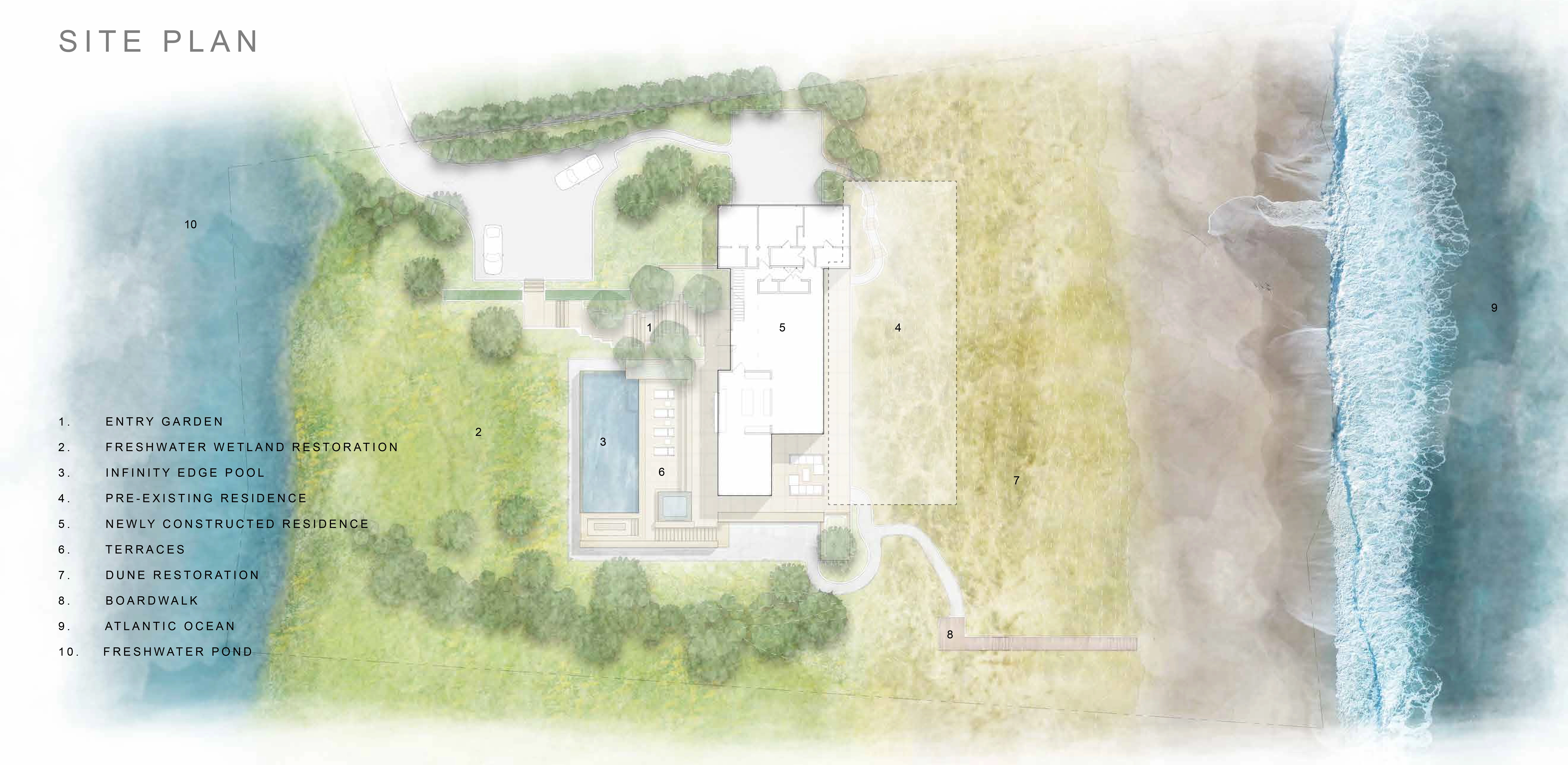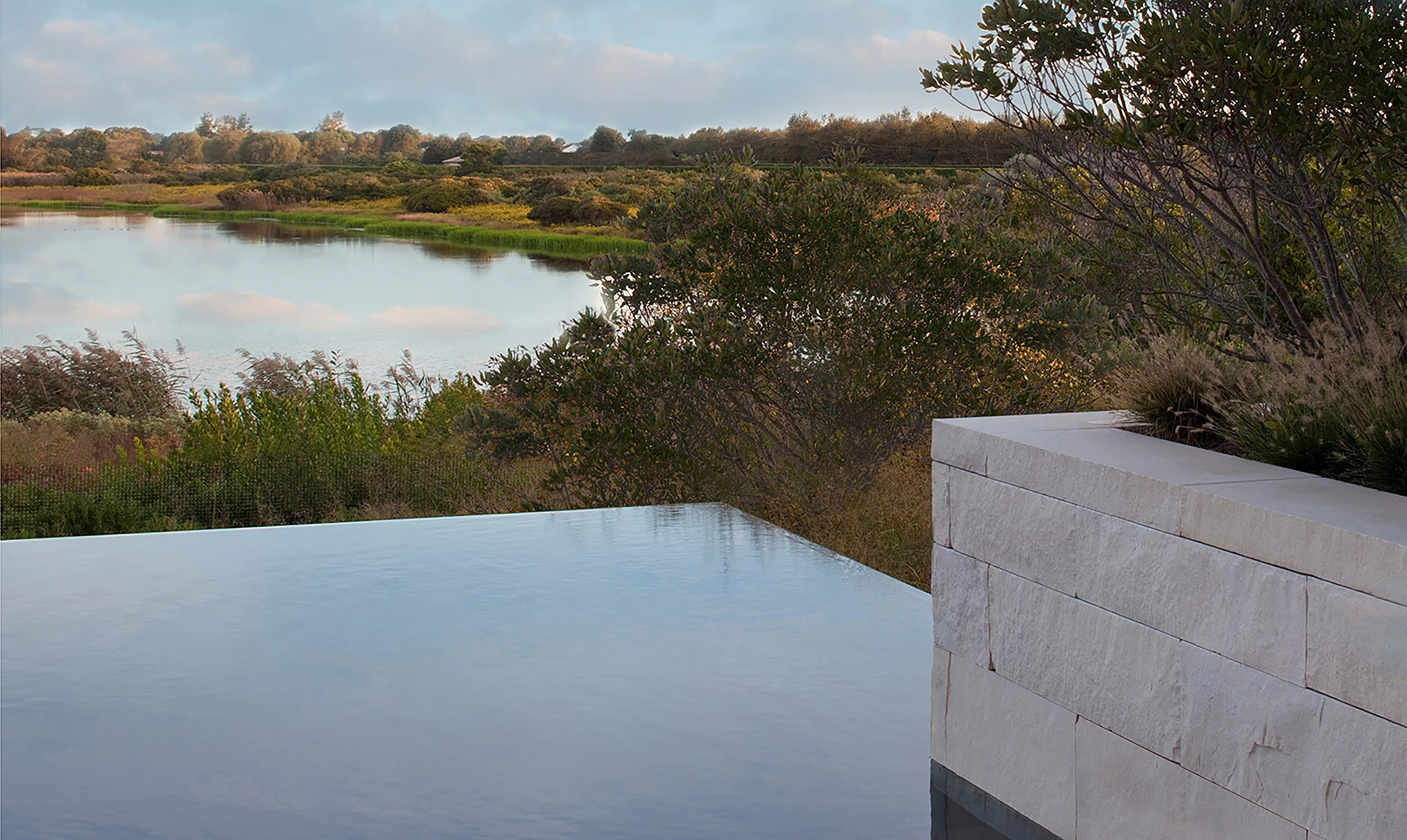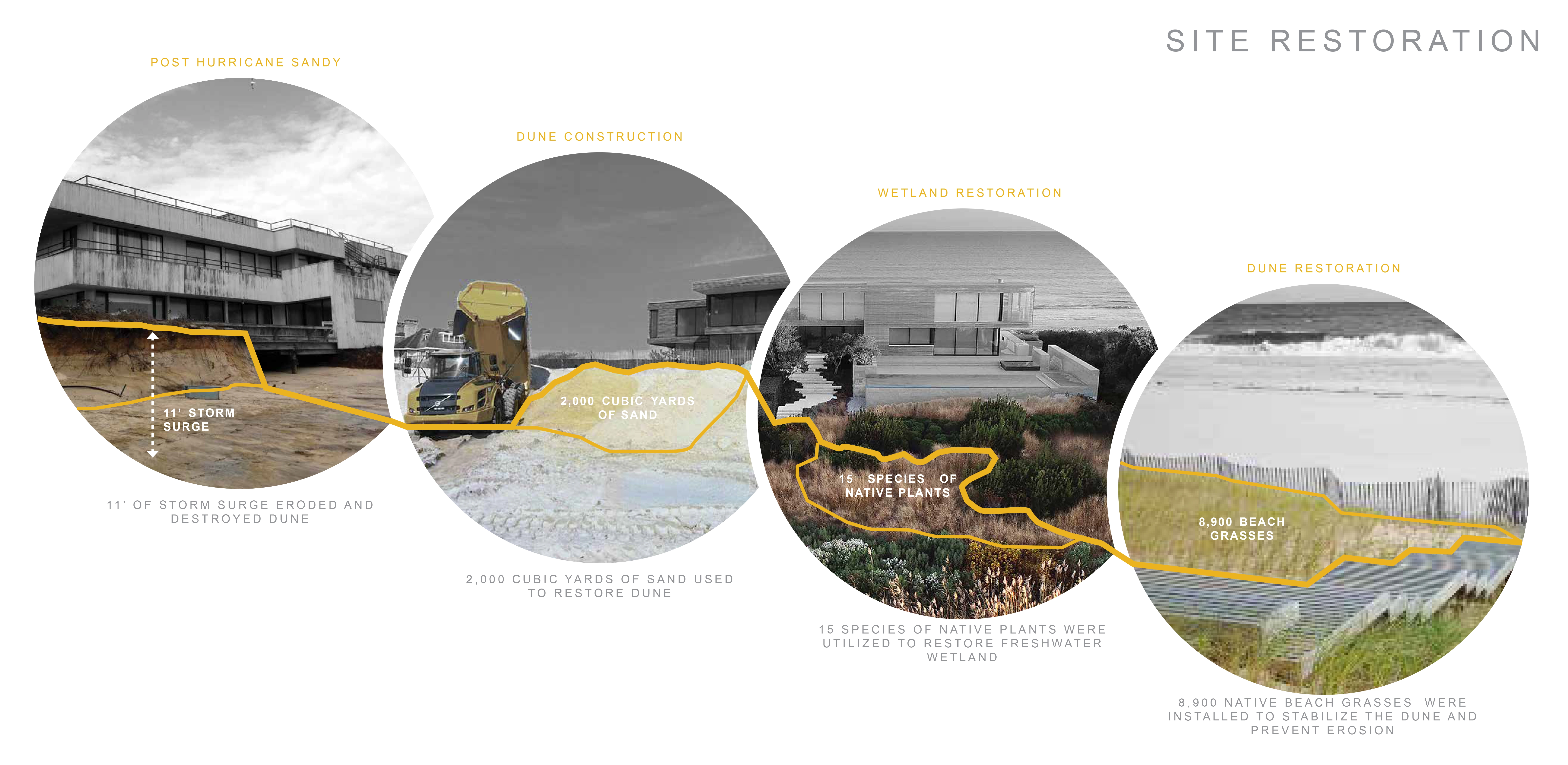 Superstorm Sandy was a disaster of historic proportions, but at least on this site it created an opportunity. Undermining an undistinguished existing house, the storm also devastated its landscape overgrown with exotic and, all too often, invasive plantings. Redevelopment provided a chance to work with the natural characteristics of the site and shape the new infrastructure to reinforce the local ecology. A new house was built farther back from the beach. National and local agencies introduced numerous parameters for developing the property. Most significant was a FEMA requirement to raise the new residence roughly 10’ above existing grade, protecting it from future storm events. This created the potential for a disconnect between the building and landscape. The first challenge, then, was marrying these two elements. To bridge this disconnect between building and site, the concept arose to reestablish a large dune landform to the South of the new residence, physically protecting and connecting the house and surrounding ecological context. This new dunescape was created by shaping 5,000 cubic yards of local reclaimed beach sand into sinuous and undulating forms that reference the naturally created dunes, which had previously existed. The buff-colored limestone echoes the color of the beach sand and extended the lines of the house, creating a strong visual sense of integration. A sea of American Beach Grass was used to stabilize the sand, and low masses of native Beach Plum and Bayberry were layered in, providing deeper root structure to strengthen the dune. Recognizing the environmental significance of this undertaking, a similar restoration effort was implemented along the freshwater edge of Fairfield Pond, situated north of the site. Carefully preserving native plant communities and habitat; soil and debris were removed by hand. A new diverse matrix of native wetland plants including High Bush Blueberry, Inkberry, switch Grass and Spartina Grass were used to reestablish the wetland edge and upland buffer between the house and pond. Understanding the significant impact of restoring these natural systems, a conscious decision was made to use only native plants for the entire project, even in areas were ornamental planting would be permissible. Wild field-collected specimens of native Shadblow, Bayberry and Winterberry were located, serving as prominent features in the design. Carex Pensylvanica was creatively reimagined as a tailored groundcover, used in place of ornamental alternatives. By electing to showcase these native plant options, the landscape became a sustainable part of the larger environmental context; improving water quality, creating habitat, bio-diversity and reducing water and energy consumption.