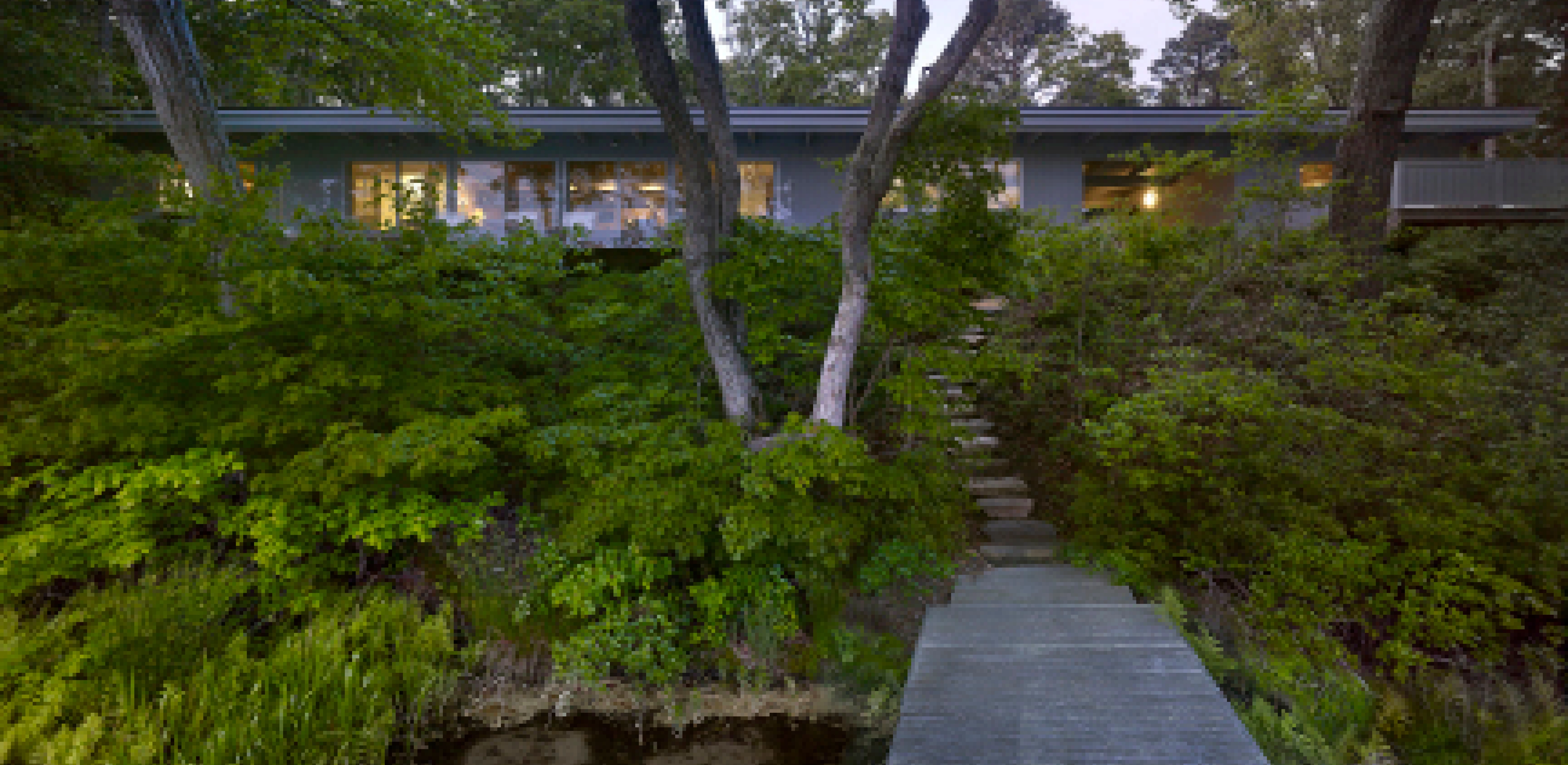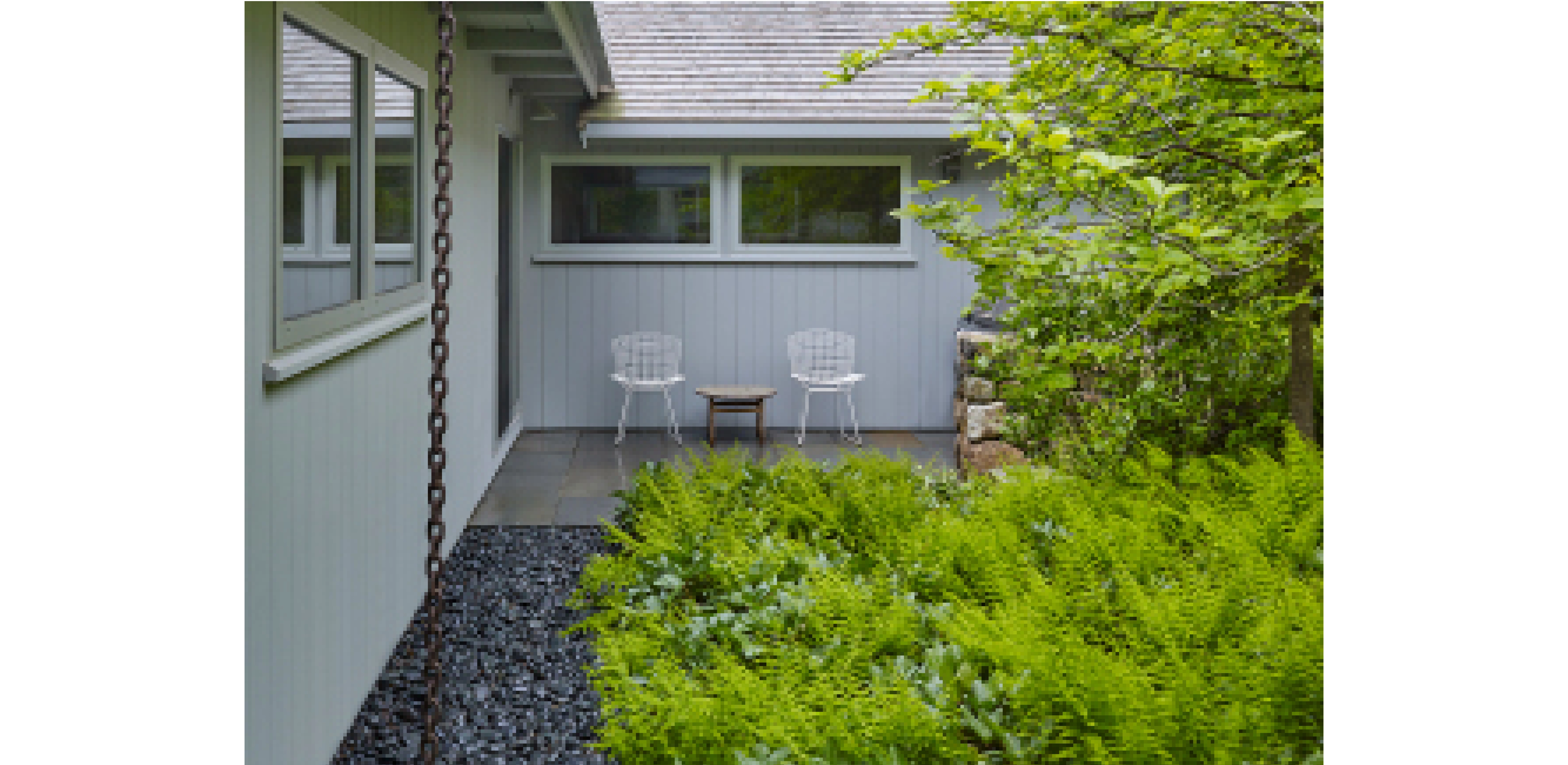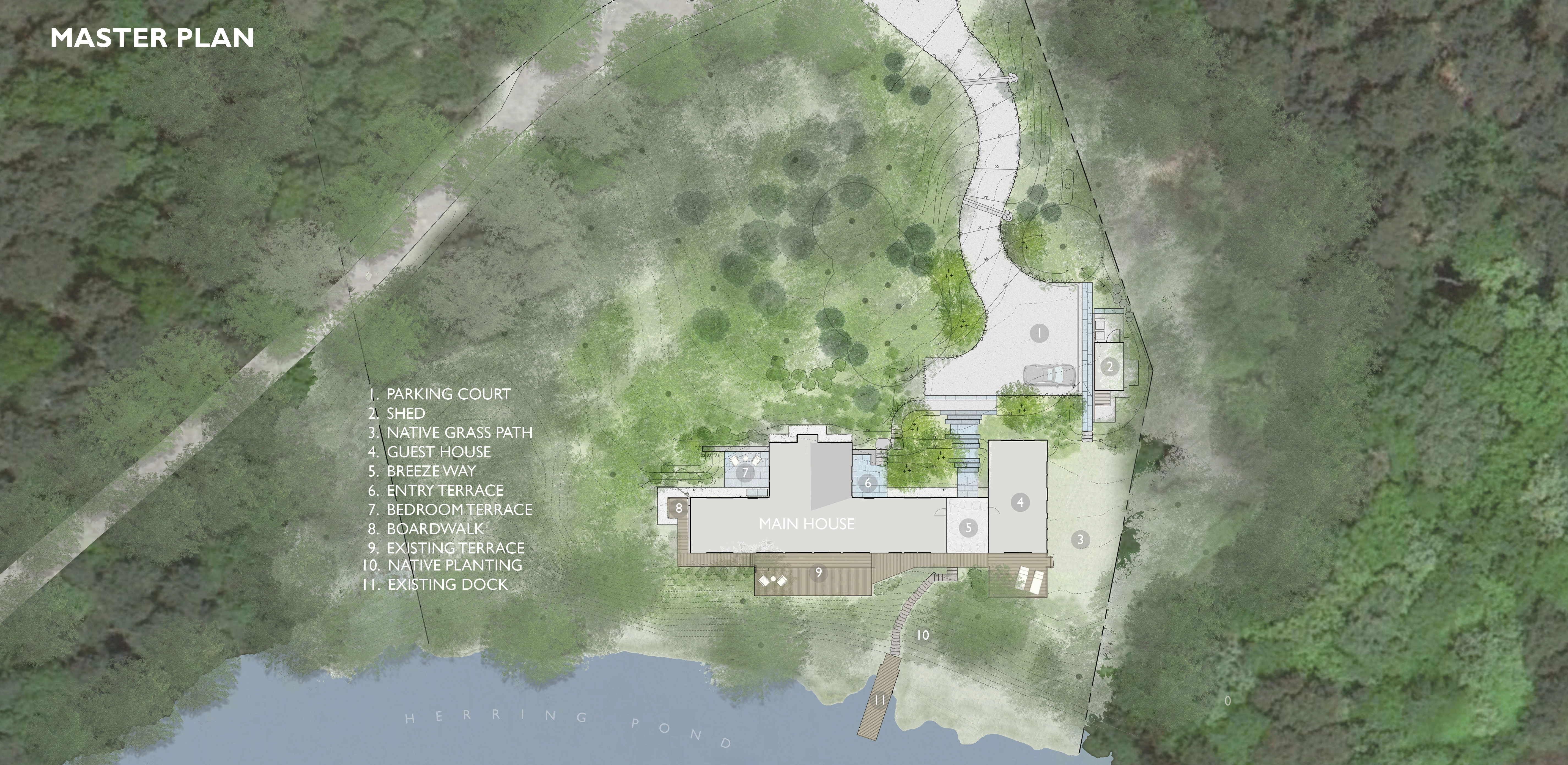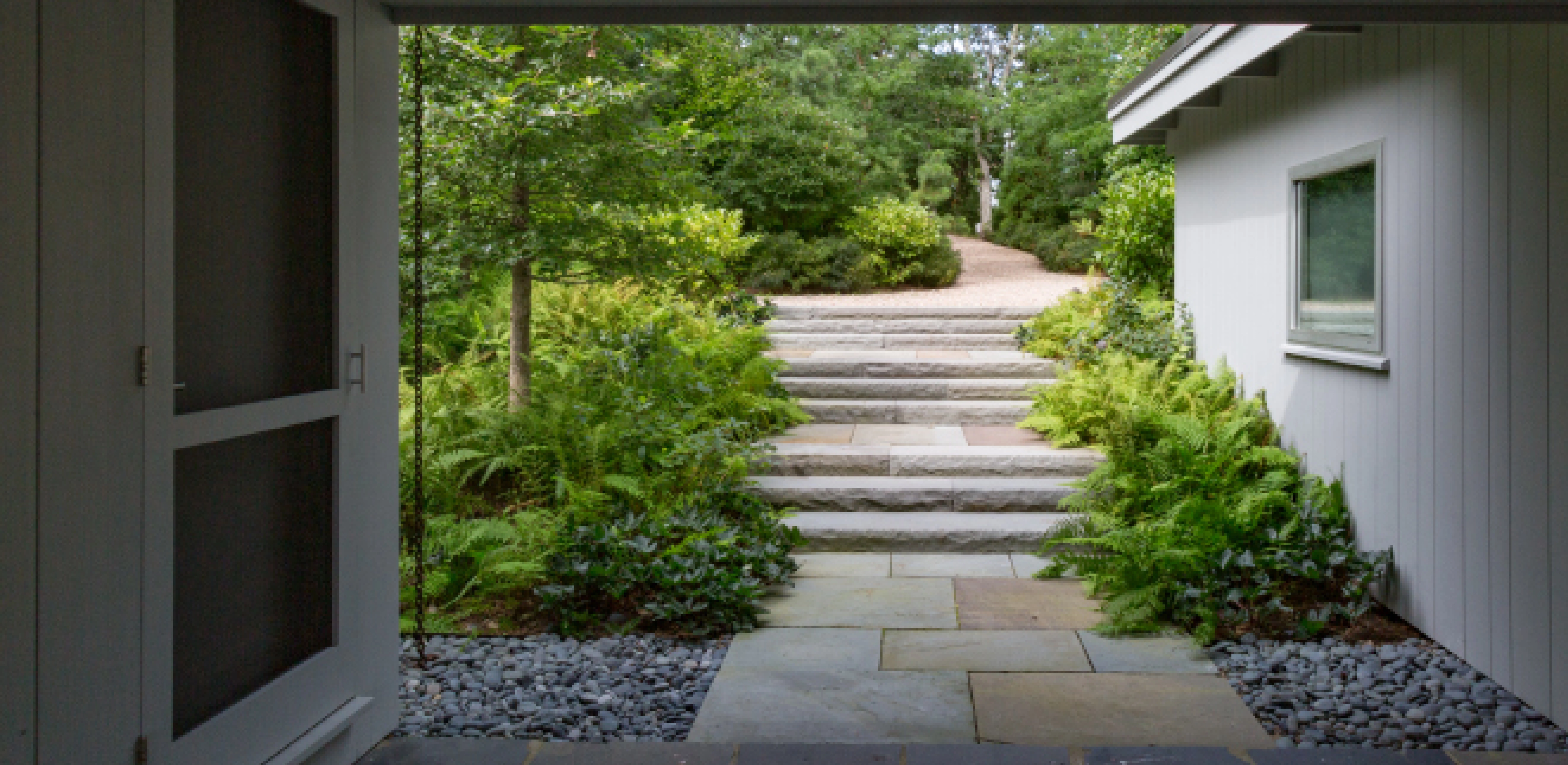 The spare, inexpensively built original house was typical of post-war Cape Cod Modernism, an ad-hoc school of simple framed structures covered in almost ephemeral materials, concocted from stock lumberyard elements and melding Bauhaus ideals with the Cape’s vernacular traditions. Built in 1960, the summer residence juxtaposed a low-slung, flat-roofed bar to an existing gable-roofed fisherman’s cottage. The site is likewise pure Cape Cod, overlooking a “kettle pond,” one of the deep puddles that formed around lingering chunks of ice at the end of the last Ice Age as the moraine that made the Cape retreated and new land formed. Despite the drama of its siting, the design otherwise deferred to this geologically fascinating landscape. Our design process strove to respect the simplicity of the property’s architecture, whose palpable beauty shone through a state of neglect. With restrained gestures and materials, we were able to underscore the original design’s intent and extend its spirit to several new outdoor spaces that the client requested for entertaining and relaxation. Our goal was to enhance and refine the almost humble qualities of the original design, not overshadow it. In doing so we were able to subtly emphasize numerous natural features of the very landscape that the house had been designed to enjoy. The odd angles that characterized the original site design created some surprising moments, but at the cost of legibility and continuity. Outdoor spaces were seemingly at odds with one another, as the property lacked a focused, consistent hierarchy. Our desire was to achieve a sustained and coherent dialogue between the architecture and the landscape. This conversation begins with the realigned graveled entry drive, whose configuration now adds suspense to the approach, first denying and then offering up glimpses of the pond behind the residence. The breezeway that bifurcates the structure, while retaining its original configuration, now perfectly frames that key view and becomes the centering element of the ensemble. In an echo of the residence, the shed that delimits the parking court is sequestered behind panels of common wood siding, an example of the power of basic materials and elementary shapes to insert structures into the setting with a simplicity that feels self-evident. Nearing the house, inset bands of bluestone echo the linearity of the architecture as they lend rhythm to the drive and parking court. In contrast, the verticals of black gum trees lead the eye from the sky overhead down past the roof plane. The final bluestone band becomes the threshold of a sweeping new staircase, initiating a striking sequence that descends to the breezeway and welcomes the visitor into the embrace of the residence with the promise of the pond beyond. Beds of ferns and hellebores flank the broad bluestone steps, the whole tapering slightly so as to accentuate the excitement of arrival and the full reveal of the pond. By tucking the house into swaths of native plants we sought to give the impression that it grew alongside the ferns, turning to advantage its position below the surrounding ground plane, which relates it so effectively to the surface of the water. At the front of the house and enjoying these planting areas are new terraces for entertaining and relaxation, essentially blurring the lines between the interior and exterior spaces. Beach pebble was chosen to connect the zones surrounding the home. It provides a pleasant tactile and auditory difference, setting off the stone and wood. A short path along the front of the house captures site and roof runoff and leads to the grilling terrace. Sheltered beyond the projecting wing of the original cottage, the master bedroom terrace consists of a simple bluestone pad shaping a private dell surrounded by lush plantings. Ferns, fothergilla, oakleaf hydrangea and climbing hydrangea engulf this peaceful corner, obscuring any contrast between new plantings and existing woodland. Simple adjustments and minor alterations at the rear of the house became further opportunities to play up the beauty of the natural environment. Regrading brought spot elevations high enough that portions of the preexisting rear deck could remain unprotected, while the balance of its length was updated with a contemporary glass railing, eliminating the perception of a barrier between the living spaces and the pond below. A new sequence of fieldstone steps leading down to the existing dock is positioned slightly off-center relative to the breezeway, likewise preserving a limpid visual connection to the water. Carefully selected plantings around the deck convey a feeling of floating above the pond and among the trees and shrubs. The entire deck zone echoes the dock which appears to float on the pond surface, heightening the weightless quality of both structures, perched serenely on land and water alike. The denuded and erosion-prone bank beneath the house underwent a major rehabilitation to restore grades, remove invasive plants, and revegetate with native species that stabilize the soil. The rustic fieldstone chosen for the steps integrates deftly into the slope, both the material and its irregular placement speaking to the landscape rather than the right-angled architecture of the house above. Sweetfern, clethra and winterberry surround the steps as they descend to the pond. The restored bank becomes an ideal zone of transition between the sensory environment of the residence, light and orthogonal in its tectonics and palette, and the organic form of the primeval kettle pond, dark, still, and aqueous. From entry drive to dock, Pond House and its grounds exist on a continuum that unobtrusively integrates dwelling and nature, connecting the manmade to the natural landscape’s geologic features and vegetation. The result is beautifully simple, but far from simplistic.