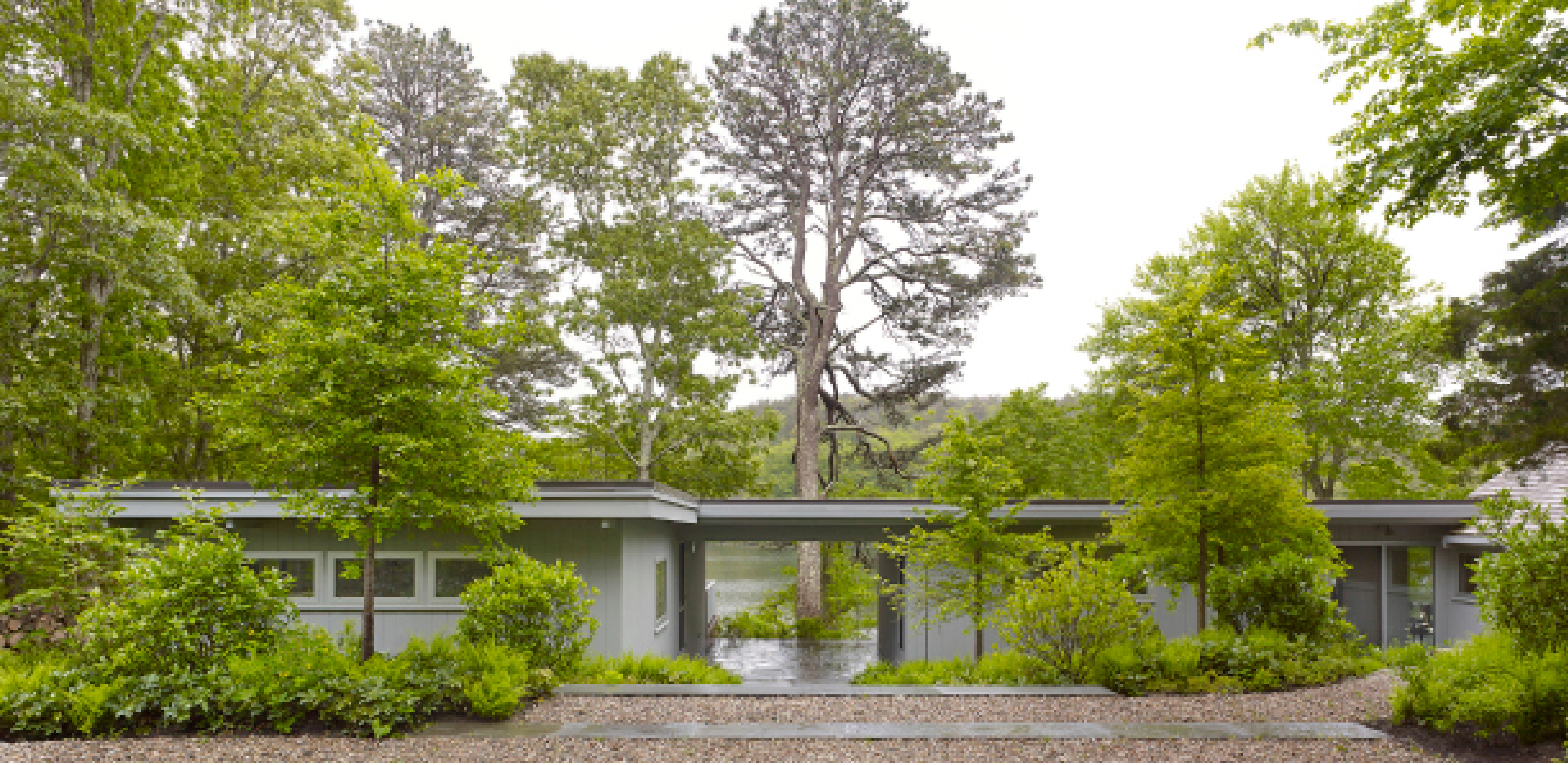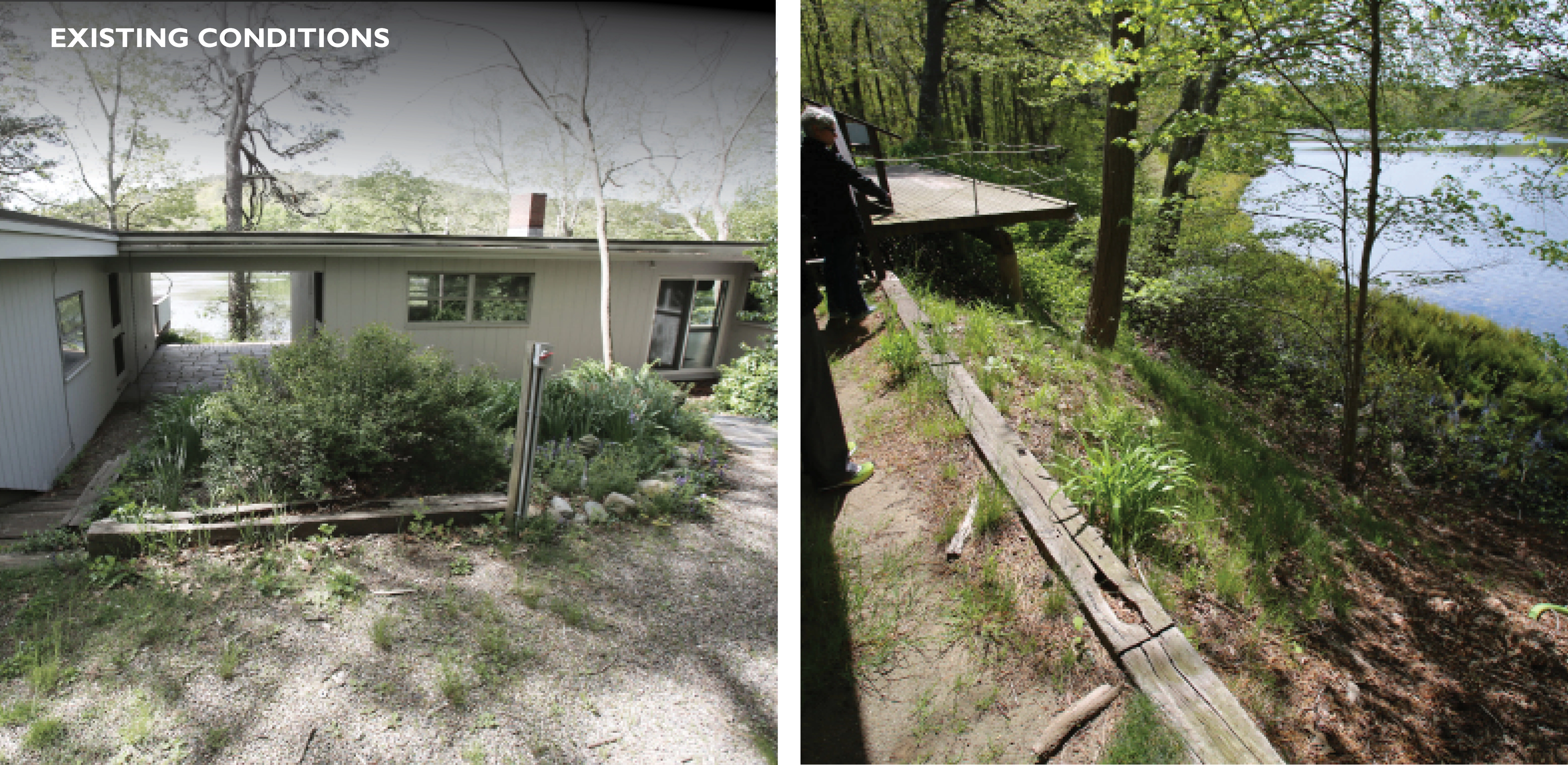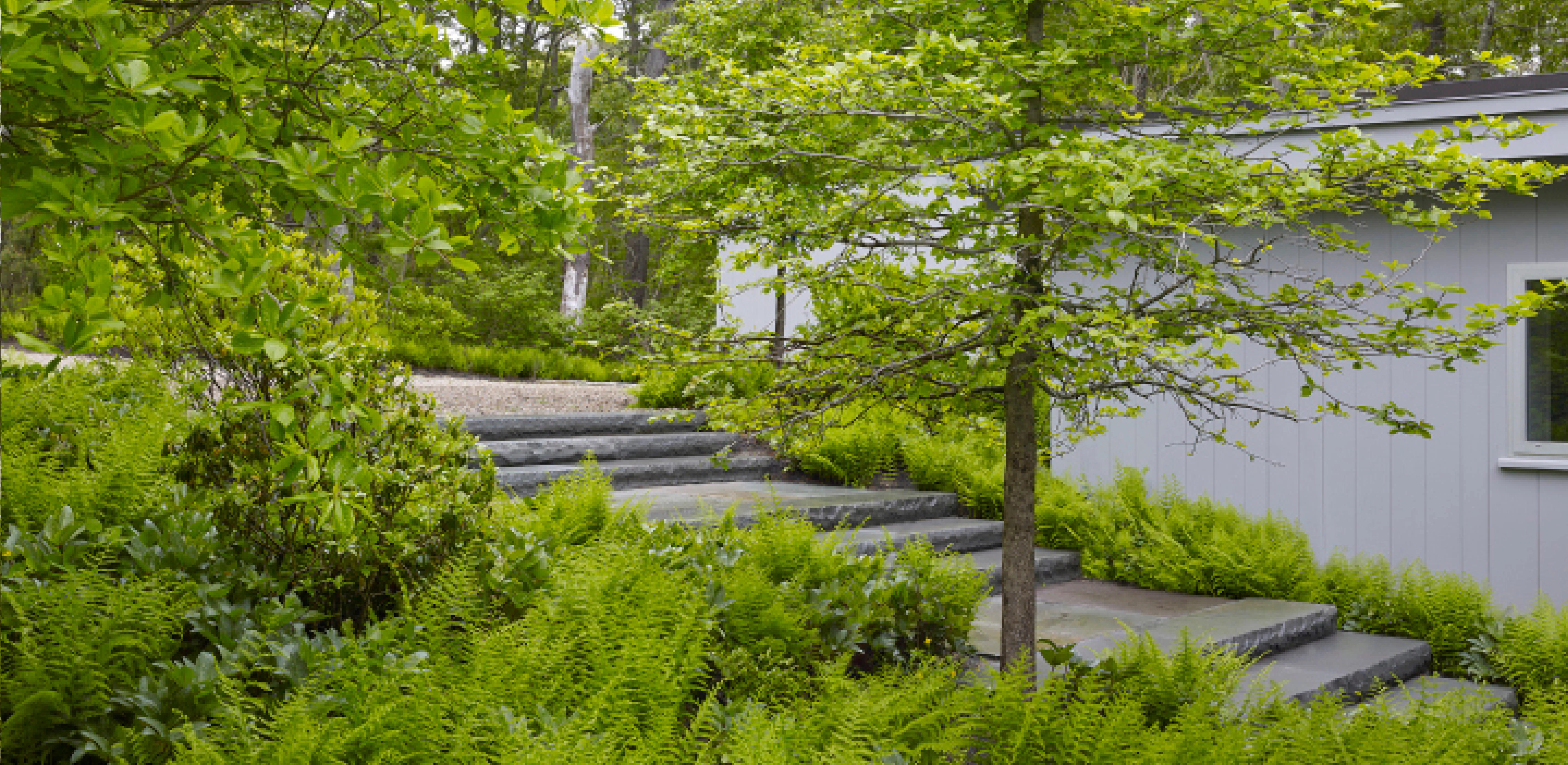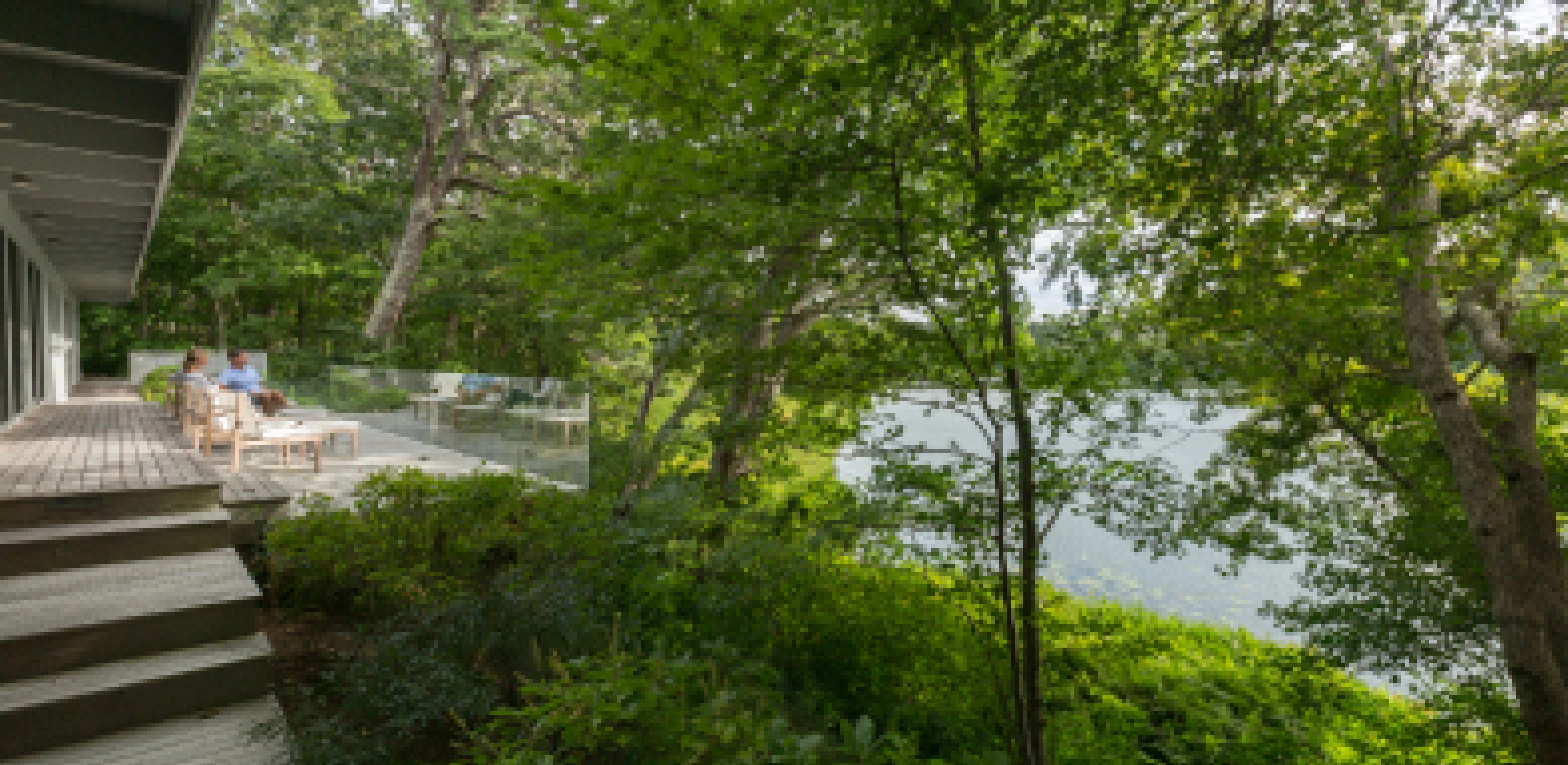 The spare, inexpensively built original house was typical of post-war Cape Cod Modernism, an ad-hoc school of simple framed structures covered in almost ephemeral materials, concocted from stock lumberyard elements and melding Bauhaus ideals with the Cape’s vernacular traditions. Built in 1960, the summer residence juxtaposed a low-slung, flat-roofed bar to an existing gable-roofed fisherman’s cottage. The site is likewise pure Cape Cod, overlooking a “kettle pond,” one of the deep puddles that formed around lingering chunks of ice at the end of the last Ice Age as the moraine that made the Cape retreated and new land formed. Despite the drama of its siting, the design otherwise deferred to this geologically fascinating landscape. Our design process strove to respect the simplicity of the property’s architecture, whose palpable beauty shone through a state of neglect. With restrained gestures and materials, we were able to underscore the original design’s intent and extend its spirit to several new outdoor spaces that the client requested for entertaining and relaxation. Our goal was to enhance and refine the almost humble qualities of the original design, not overshadow it. In doing so we were able to subtly emphasize numerous natural features of the very landscape that the house had been designed to enjoy. The odd angles that characterized the original site design created some surprising moments, but at the cost of legibility and continuity. Outdoor spaces were seemingly at odds with one another, as the property lacked a focused, consistent hierarchy. Our desire was to achieve a sustained and coherent dialogue between the architecture and the landscape. This conversation begins with the realigned graveled entry drive, whose configuration now adds suspense to the approach, first denying and then offering up glimpses of the pond behind the residence. The breezeway that bifurcates the structure, while retaining its original configuration, now perfectly frames that key view and becomes the centering element of the ensemble. In an echo of the residence, the shed that delimits the parking court is sequestered behind panels of common wood siding, an example of the power of basic materials and elementary shapes to insert structures into the setting with a simplicity that feels self-evident. Nearing the house, inset bands of bluestone echo the linearity of the architecture as they lend rhythm to the drive and parking court. In contrast, the verticals of black gum trees lead the eye from the sky overhead down past the roof plane. The final bluestone band becomes the threshold of a sweeping new staircase, initiating a striking sequence that descends to the breezeway and welcomes the visitor into the embrace of the residence with the promise of the pond beyond. Beds of ferns and hellebores flank the broad bluestone steps, the whole tapering slightly so as to accentuate the excitement of arrival and the full reveal of the pond. By tucking the house into swaths of native plants we sought to give the impression that it grew alongside the ferns, turning to advantage its position below the surrounding ground plane, which relates it so effectively to the surface of the water. At the front of the house and enjoying these planting areas are new terraces for entertaining and relaxation, essentially blurring the lines between the interior and exterior spaces. Beach pebble was chosen to connect the zones surrounding the home. It provides a pleasant tactile and auditory difference, setting off the stone and wood. A short path along the front of the house captures site and roof runoff and leads to the grilling terrace. Sheltered beyond the projecting wing of the original cottage, the master bedroom terrace consists of a simple bluestone pad shaping a private dell surrounded by lush plantings. Ferns, fothergilla, oakleaf hydrangea and climbing hydrangea engulf this peaceful corner, obscuring any contrast between new plantings and existing woodland. Simple adjustments and minor alterations at the rear of the house became further opportunities to play up the beauty of the natural environment. Regrading brought spot elevations high enough that portions of the preexisting rear deck could remain unprotected, while the balance of its length was updated with a contemporary glass railing, eliminating the perception of a barrier between the living spaces and the pond below. A new sequence of fieldstone steps leading down to the existing dock is positioned slightly off-center relative to the breezeway, likewise preserving a limpid visual connection to the water. Carefully selected plantings around the deck convey a feeling of floating above the pond and among the trees and shrubs. The entire deck zone echoes the dock which appears to float on the pond surface, heightening the weightless quality of both structures, perched serenely on land and water alike. The denuded and erosion-prone bank beneath the house underwent a major rehabilitation to restore grades, remove invasive plants, and revegetate with native species that stabilize the soil. The rustic fieldstone chosen for the steps integrates deftly into the slope, both the material and its irregular placement speaking to the landscape rather than the right-angled architecture of the house above. Sweetfern, clethra and winterberry surround the steps as they descend to the pond. The restored bank becomes an ideal zone of transition between the sensory environment of the residence, light and orthogonal in its tectonics and palette, and the organic form of the primeval kettle pond, dark, still, and aqueous. From entry drive to dock, Pond House and its grounds exist on a continuum that unobtrusively integrates dwelling and nature, connecting the manmade to the natural landscape’s geologic features and vegetation. The result is beautifully simple, but far from simplistic.