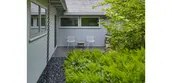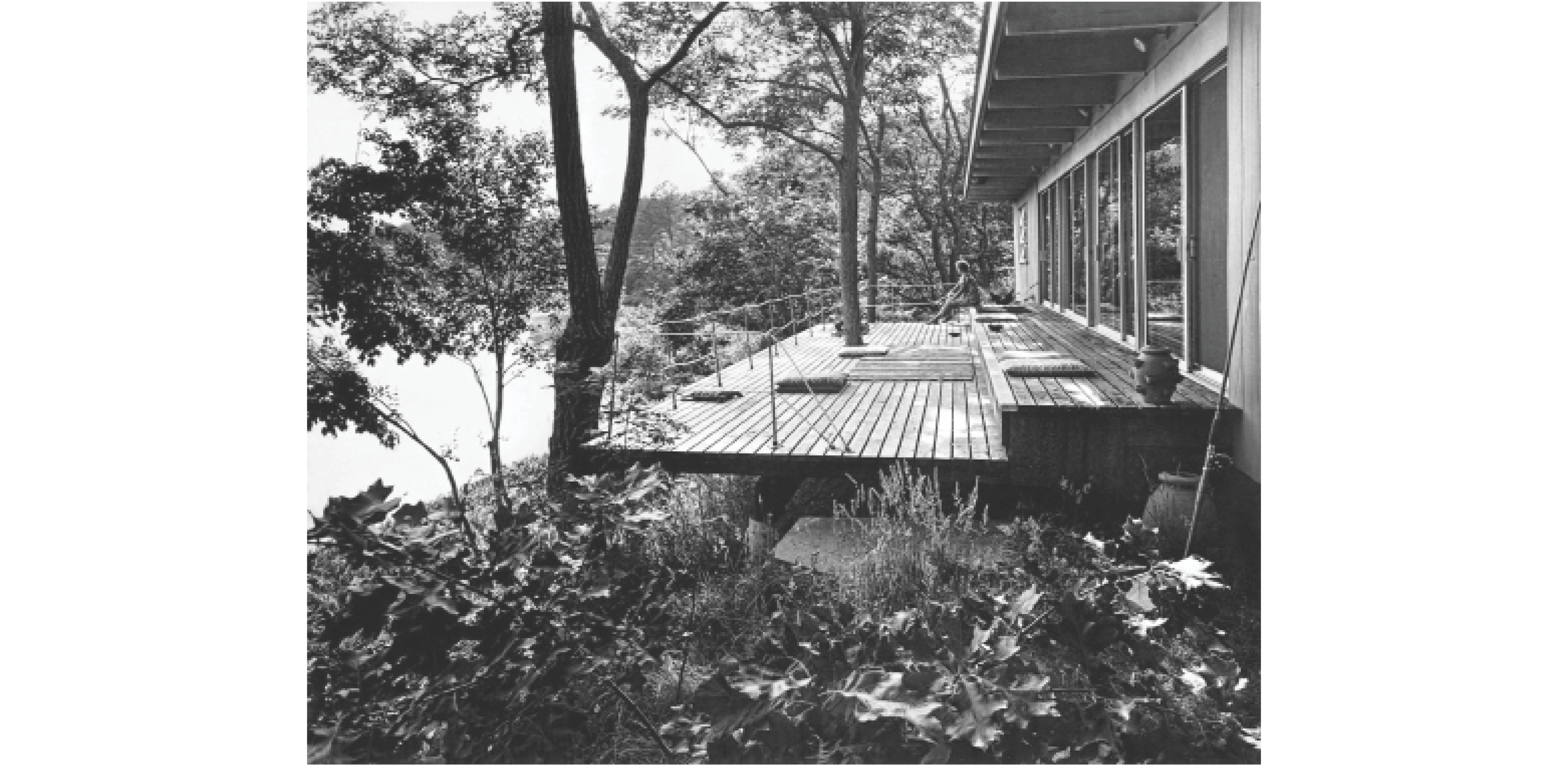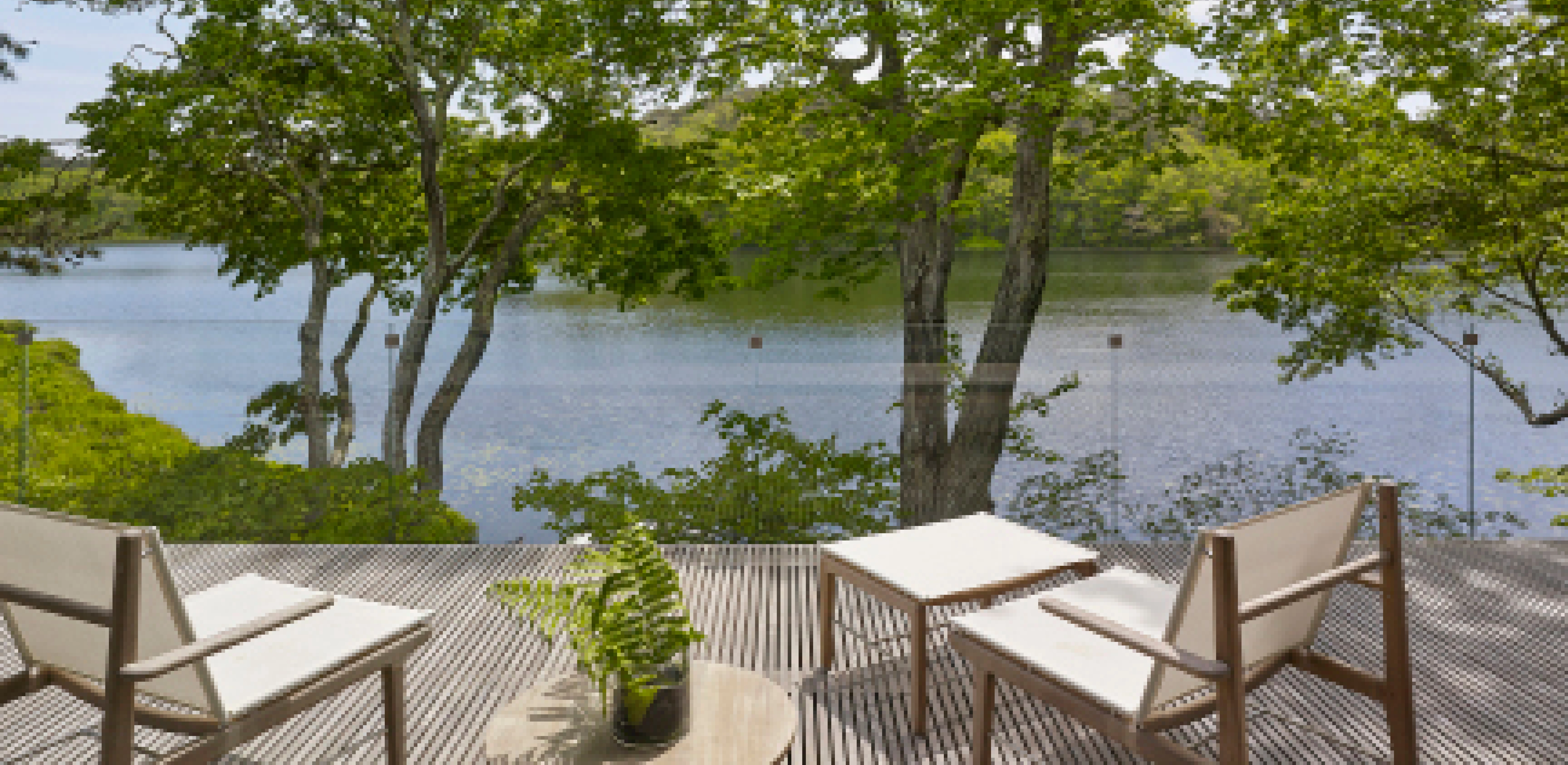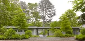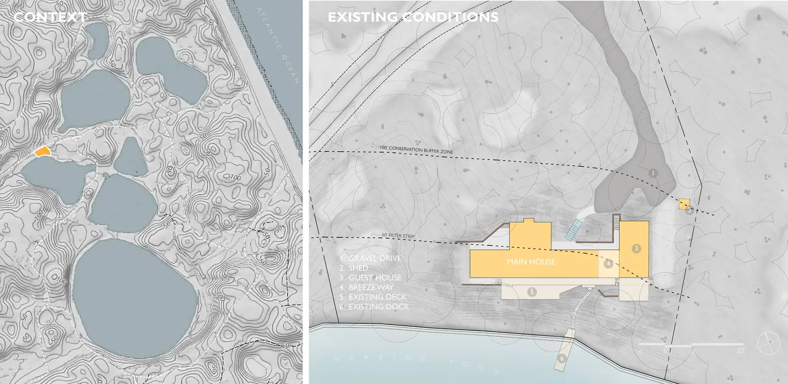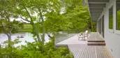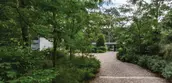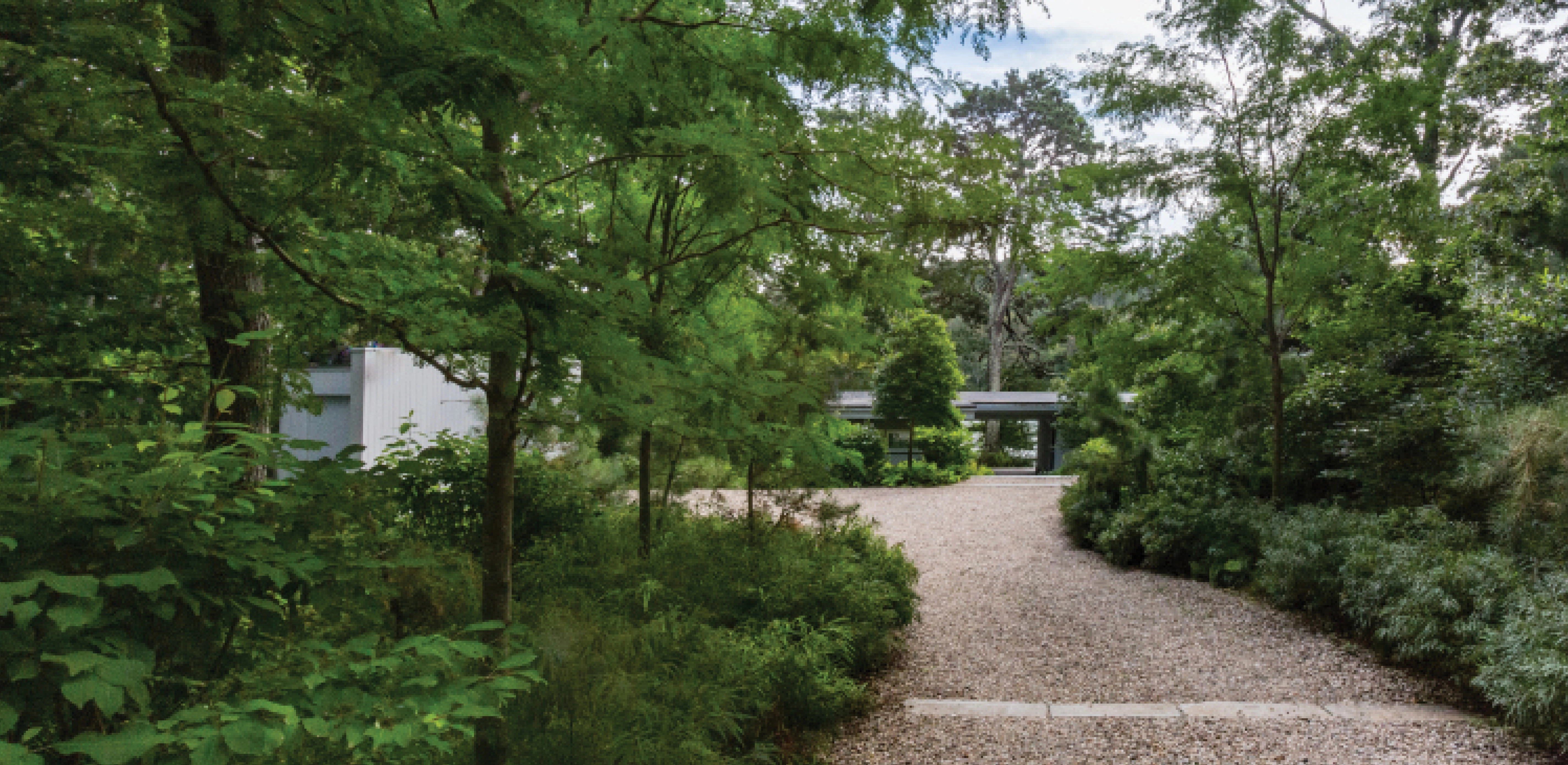 The spare, inexpensively built original house was typical of post-war Cape Cod Modernism, an ad-hoc school of simple framed structures covered in almost ephemeral materials, concocted from stock lumberyard elements and melding Bauhaus ideals with the Cape’s vernacular traditions. Built in 1960, the summer residence juxtaposed a low-slung, flat-roofed bar to an existing gable-roofed fisherman’s cottage. The site is likewise pure Cape Cod, overlooking a “kettle pond,” one of the deep puddles that formed around lingering chunks of ice at the end of the last Ice Age as the moraine that made the Cape retreated and new land formed. Despite the drama of its siting, the design otherwise deferred to this geologically fascinating landscape. Our design process strove to respect the simplicity of the property’s architecture, whose palpable beauty shone through a state of neglect. With restrained gestures and materials, we were able to underscore the original design’s intent and extend its spirit to several new outdoor spaces that the client requested for entertaining and relaxation. Our goal was to enhance and refine the almost humble qualities of the original design, not overshadow it. In doing so we were able to subtly emphasize numerous natural features of the very landscape that the house had been designed to enjoy. The odd angles that characterized the original site design created some surprising moments, but at the cost of legibility and continuity. Outdoor spaces were seemingly at odds with one another, as the property lacked a focused, consistent hierarchy. Our desire was to achieve a sustained and coherent dialogue between the architecture and the landscape. This conversation begins with the realigned graveled entry drive, whose configuration now adds suspense to the approach, first denying and then offering up glimpses of the pond behind the residence. The breezeway that bifurcates the structure, while retaining its original configuration, now perfectly frames that key view and becomes the centering element of the ensemble. In an echo of the residence, the shed that delimits the parking court is sequestered behind panels of common wood siding, an example of the power of basic materials and elementary shapes to insert structures into the setting with a simplicity that feels self-evident. Nearing the house, inset bands of bluestone echo the linearity of the architecture as they lend rhythm to the drive and parking court. In contrast, the verticals of black gum trees lead the eye from the sky overhead down past the roof plane. The final bluestone band becomes the threshold of a sweeping new staircase, initiating a striking sequence that descends to the breezeway and welcomes the visitor into the embrace of the residence with the promise of the pond beyond. Beds of ferns and hellebores flank the broad bluestone steps, the whole tapering slightly so as to accentuate the excitement of arrival and the full reveal of the pond. By tucking the house into swaths of native plants we sought to give the impression that it grew alongside the ferns, turning to advantage its position below the surrounding ground plane, which relates it so effectively to the surface of the water. At the front of the house and enjoying these planting areas are new terraces for entertaining and relaxation, essentially blurring the lines between the interior and exterior spaces. Beach pebble was chosen to connect the zones surrounding the home. It provides a pleasant tactile and auditory difference, setting off the stone and wood. A short path along the front of the house captures site and roof runoff and leads to the grilling terrace. Sheltered beyond the projecting wing of the original cottage, the master bedroom terrace consists of a simple bluestone pad shaping a private dell surrounded by lush plantings. Ferns, fothergilla, oakleaf hydrangea and climbing hydrangea engulf this peaceful corner, obscuring any contrast between new plantings and existing woodland. Simple adjustments and minor alterations at the rear of the house became further opportunities to play up the beauty of the natural environment. Regrading brought spot elevations high enough that portions of the preexisting rear deck could remain unprotected, while the balance of its length was updated with a contemporary glass railing, eliminating the perception of a barrier between the living spaces and the pond below. A new sequence of fieldstone steps leading down to the existing dock is positioned slightly off-center relative to the breezeway, likewise preserving a limpid visual connection to the water. Carefully selected plantings around the deck convey a feeling of floating above the pond and among the trees and shrubs. The entire deck zone echoes the dock which appears to float on the pond surface, heightening the weightless quality of both structures, perched serenely on land and water alike. The denuded and erosion-prone bank beneath the house underwent a major rehabilitation to restore grades, remove invasive plants, and revegetate with native species that stabilize the soil. The rustic fieldstone chosen for the steps integrates deftly into the slope, both the material and its irregular placement speaking to the landscape rather than the right-angled architecture of the house above. Sweetfern, clethra and winterberry surround the steps as they descend to the pond. The restored bank becomes an ideal zone of transition between the sensory environment of the residence, light and orthogonal in its tectonics and palette, and the organic form of the primeval kettle pond, dark, still, and aqueous. From entry drive to dock, Pond House and its grounds exist on a continuum that unobtrusively integrates dwelling and nature, connecting the manmade to the natural landscape’s geologic features and vegetation. The result is beautifully simple, but far from simplistic.