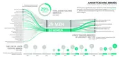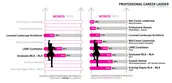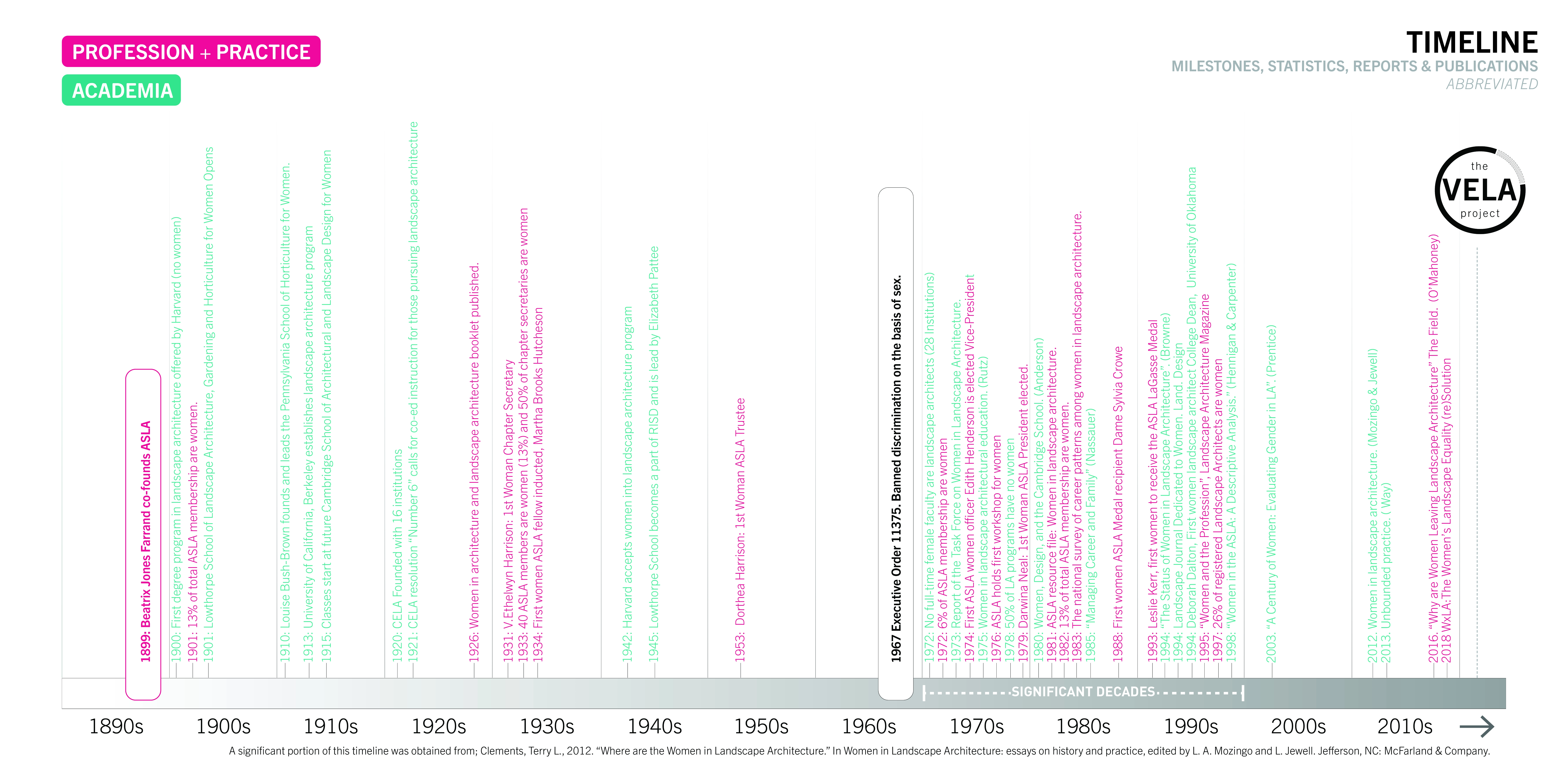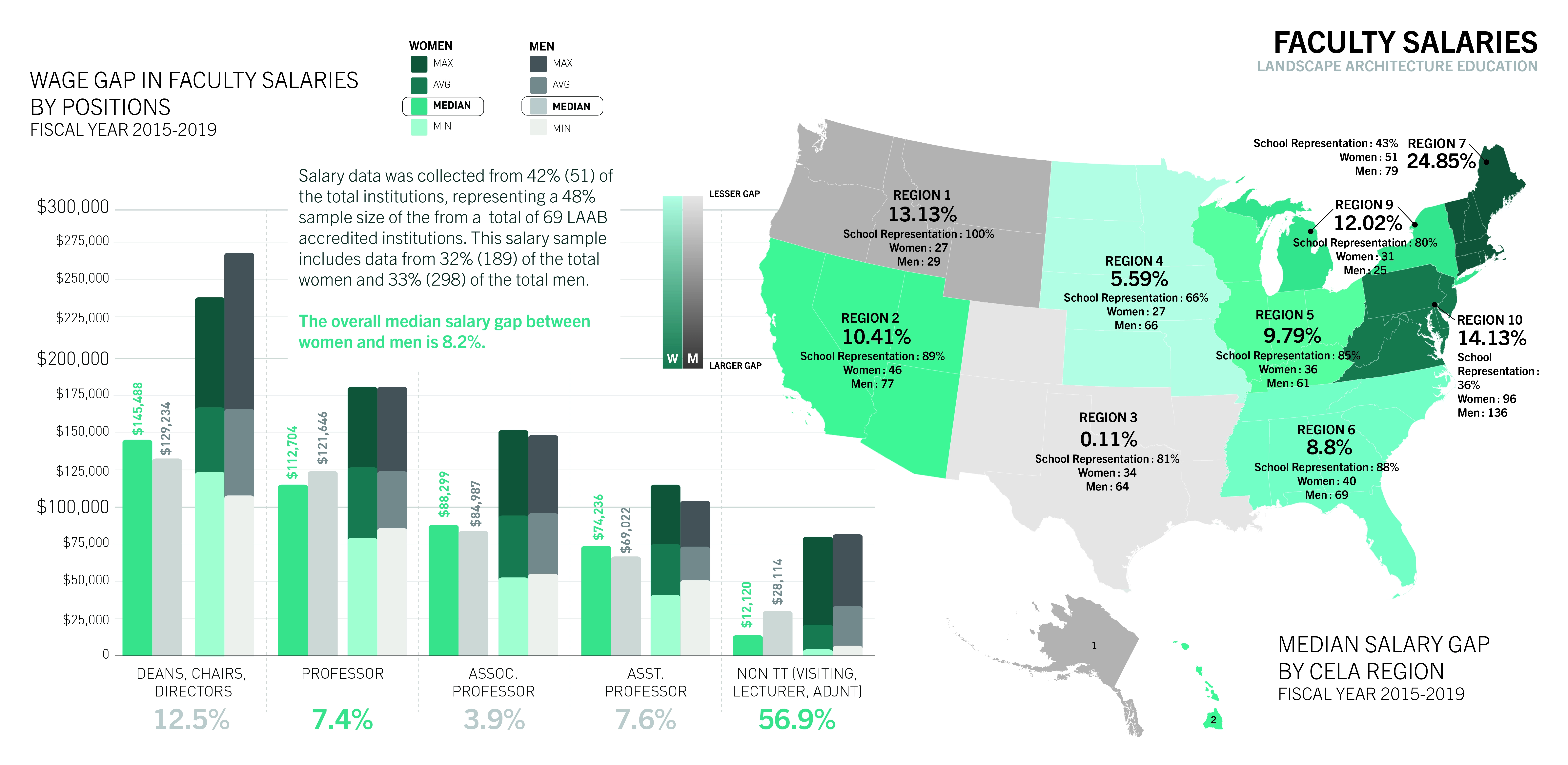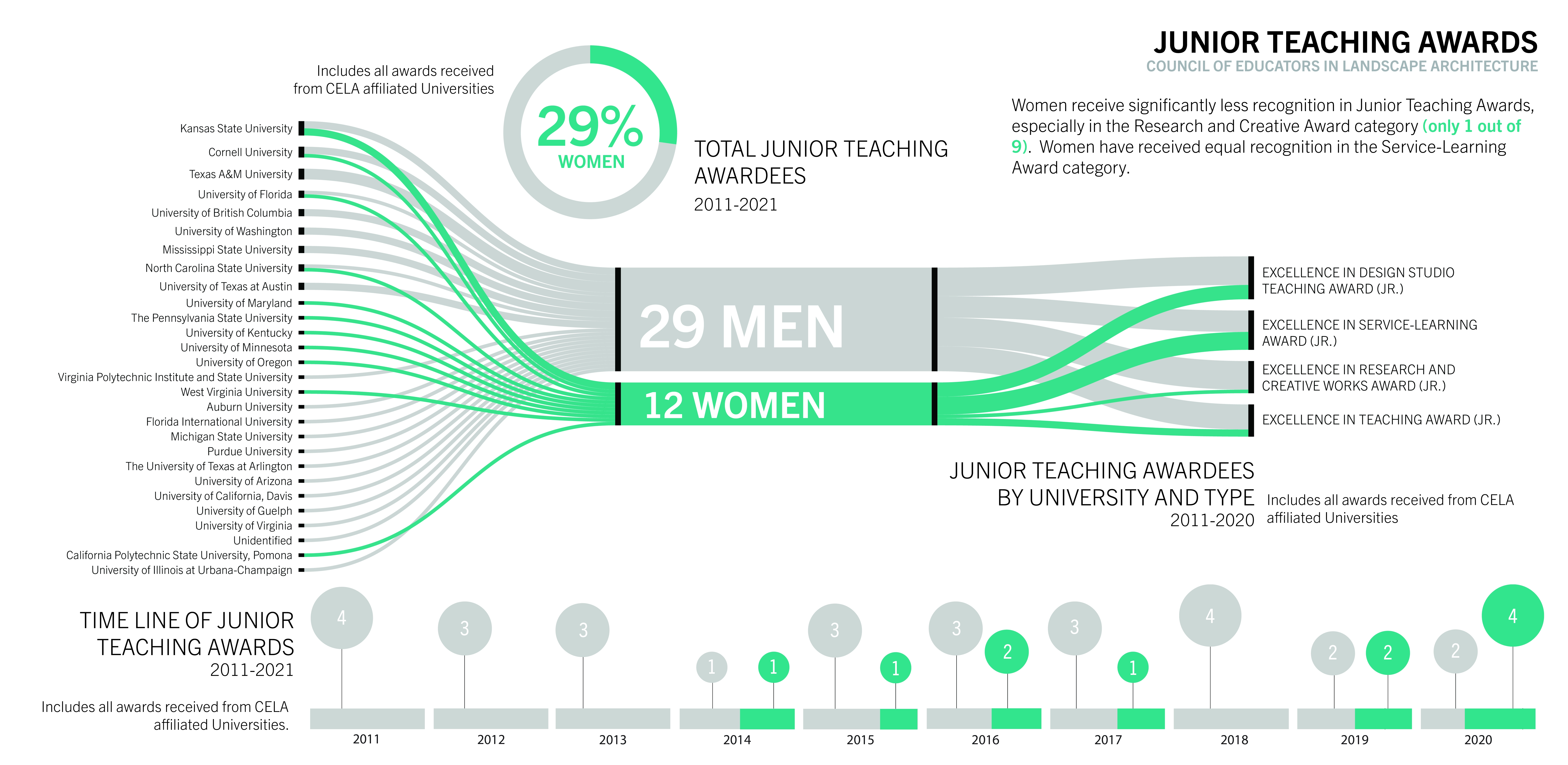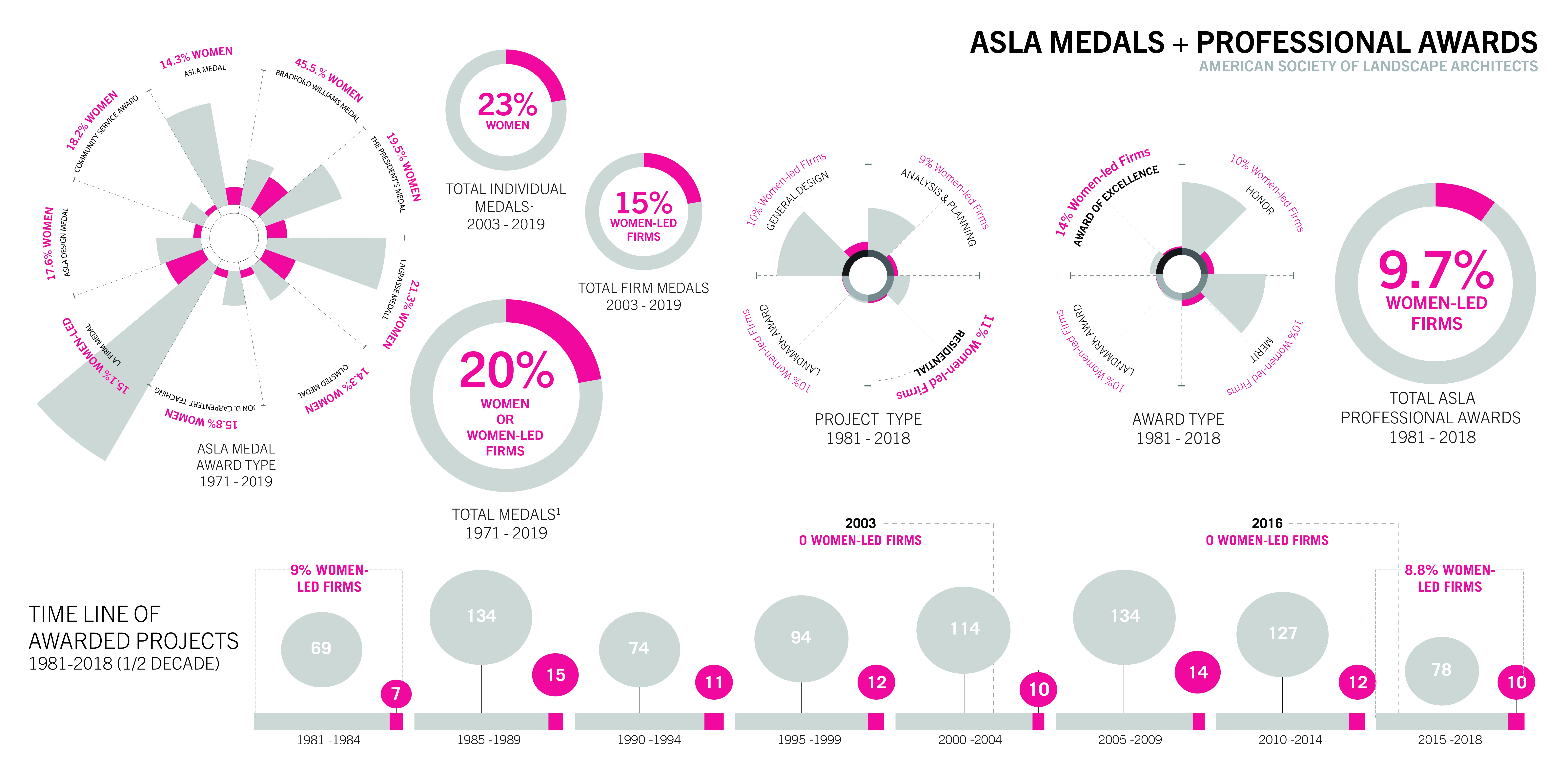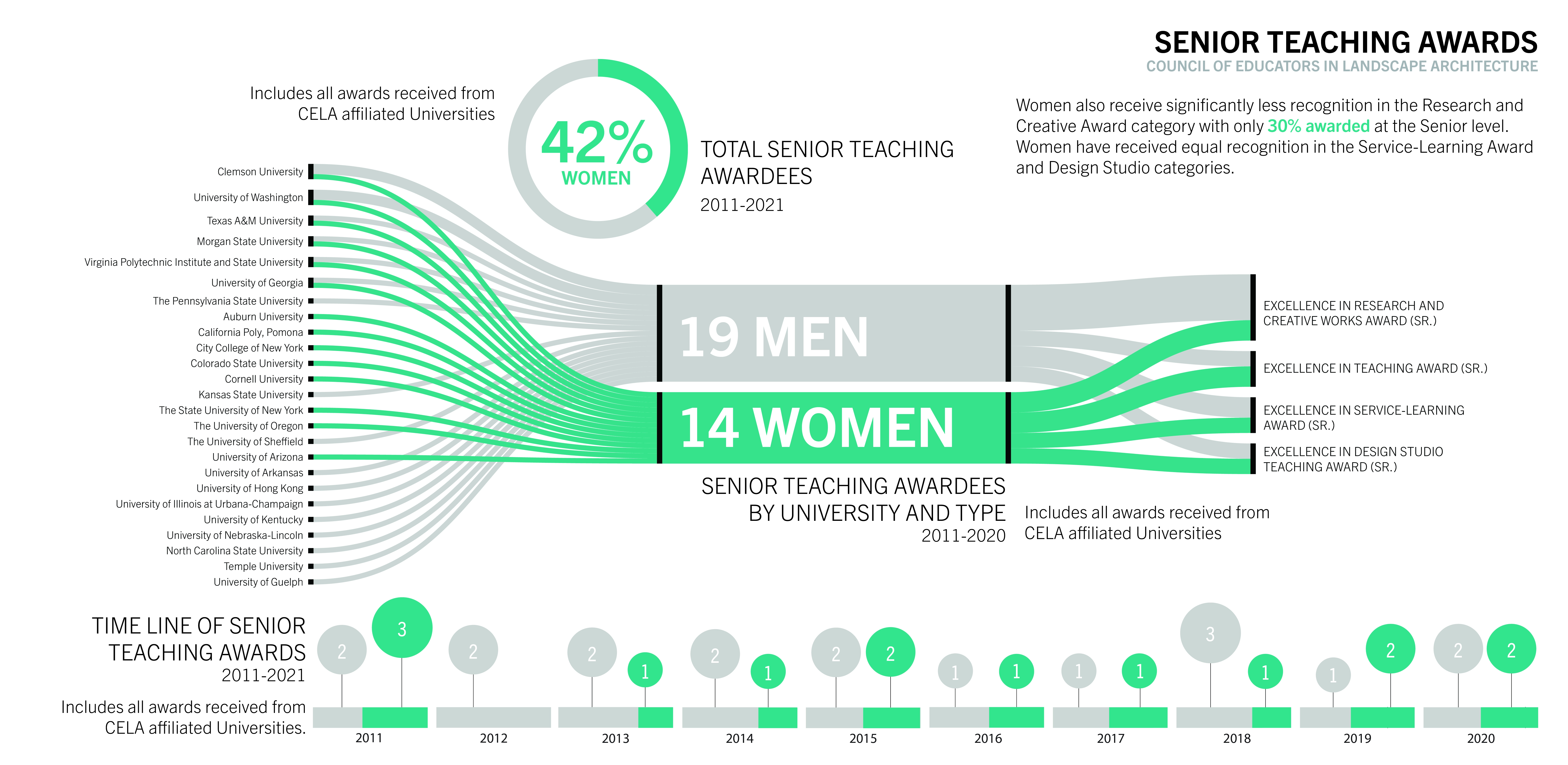 Research Statement In 1973, Darwina Neal—the first female president of the ASLA—prepared the premier report on women in landscape architecture. Surged by the groundbreaking findings, several subsequent studies throughout the following decades emerged. Each provided critical insights into the status of women in the profession. The last 50 years of literature and reports highlight substantial disparities in licensure and promotion, women-owned businesses, and job discrimination. It has been over twenty years since the last significant study was released, yet women today still face similar issues. With the resurgence of women-based initiatives populating social media channels and conference circuits, the timeliness of having a contemporary dive into the status of women in landscape architecture is imperative. Unlike previous studies that collected data solely from exclusive membership pools, the VELA Project reveals evidence from open-sourced data, providing a glimpse into less studied areas of academia and professional progression and leadership. The research asks questions across various topics and comparatively maps the overall distribution and disparities found between men and women while revealing how those disparities have changed over time. These categories include; graduates, student awards, licensure, design awards, organizational leadership, faculty rank, faculty salary, and research/teaching awards. The work presents a series of data-driven cartographic visualizations and infographics that are easily accessible to the viewer while providing deeper analysis and reflection opportunities. Methods The primary research methods involved secondary data analysis collected from publicly accessible sources and existing data reports. The inventory of data was aggregated into larger datasets that eliminated individuals identification to maintain anonymity in the representation of the results. This process occurred through spatial simplification and data points receiving either a W (for women) or M (for men). This research's organizers acknowledge that specific metrics include bias based on perceived identification of binary gender classifications. After the extensive data collection, the results were organized and then visualized by time, ratio, quantity, and proportion. The results are not only the collected statistics, but the visualizations themselves are the results. Professional Organization and Leadership Results The VELA Project collected 16,000 unique data points collected from ASLA, the Landscape Architecture Foundation Olmsted Scholar Program, CLARB data on active members with a council record, and state ASLA chapter websites. The overall data shows that women dominate in pre-professional narratives. More women enroll in and graduate (55%) with landscape architecture degrees, showing a nearly 10% gain from 2013 to 2017. In the ASLA student awards, women receive more recognition in the Communications, Collaboration, and Community Service categories while the General Design and Analysis and Planning categories have almost equal representation of both men and women. And 65% of the Landscape Architecture Foundation Olmsted Scholars are women. This momentum and representation drastically dissipate as women enter the workforce and navigate through their professional careers. After graduation, the amount of women actively pursuing licensure through CLARB drops almost 10%. And within CLARB's 2018 active, licensed landscape architects database, only 27% identify as women. As the pool of mid-level and senior-level women practitioners decrease, so do the residual effects in leadership and recognition. Since 1981, less than 10% of ASLA Professional Awards in the General, Residential, and Analysis and Planning categories have been awarded to women-led/owned firms. On an individual level, 23% of the ASLA Medals have been awarded to women, with the highest representation (45%) in the Bradford Williams Medal and the lowest in the Community Service (10%) and ASLA Medal (12.5%) categories. The Council of Fellows, which has been inducting members since 1899, has a membership base of 16% women. Thirty-two percent of the ASLA chapter presidents in the 2018-2019 leadership cycle were women, and from 1901-2018, only 9 out of 73 (12%) ASLA presidents have been women. Academic Results In a 1975 task force report by Miriam Rutz, only six women were identified holding tenure track positions in landscape architecture across the United States. Today, there are approximately 388 women throughout the U.S. faculties of landscape architecture. The VELA Project collected about 1,400 unique data points extracted from available public data found on sixty-nine LAAB accredited programs in the United States. The results looked at the relationship between women and men across rank, salary, organizational leadership, and awards. The percentages across junior faculty ranks suggest women are making tremendous strides in representation. Disparities still exist at the senior level, where full professors have the lowest percentage of women. Salary data was collected from 42% of the institutions researched, all of which were public institutions. The results show that the salary divide between men and women (8.2%) is not as disproportionate as the national average of around 18%. There are also instances where women overall are being compensated more than men. This data suggests that current regulations regarding pay transparency and pay equity at public institutions are effective in lowering the gender wage gap for women. However, there is a significant disparity of pay for non-tenure-track faculty. Of the total tenured positions, only 35% are women—where 70% are associate professors, and 30% are full professors. Men outnumber women in administrative leadership roles by 2:1, and second, to non-tenure-track positions, leadership roles regionally experience some of the highest percentages of wage disparities. Nationally, wom