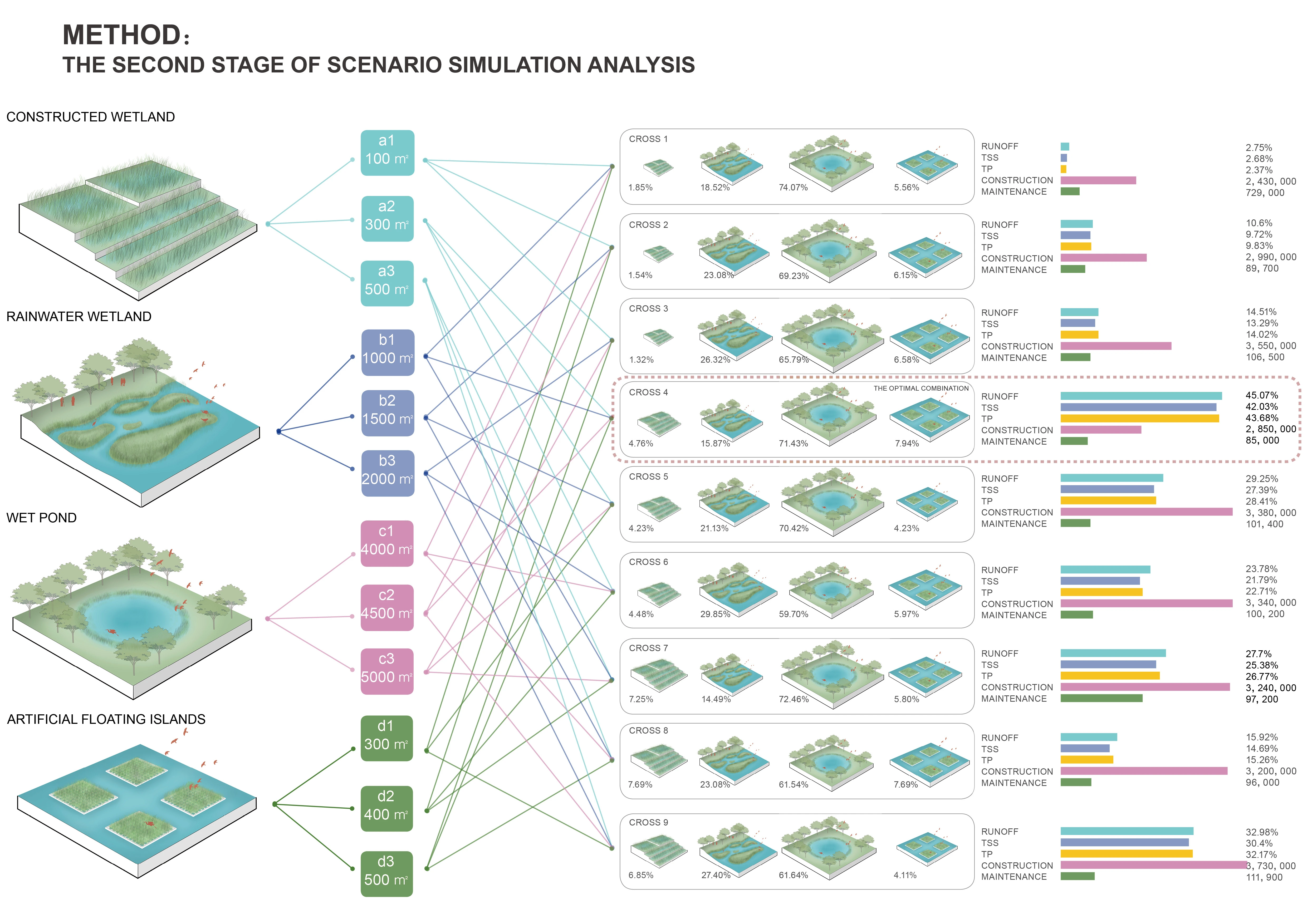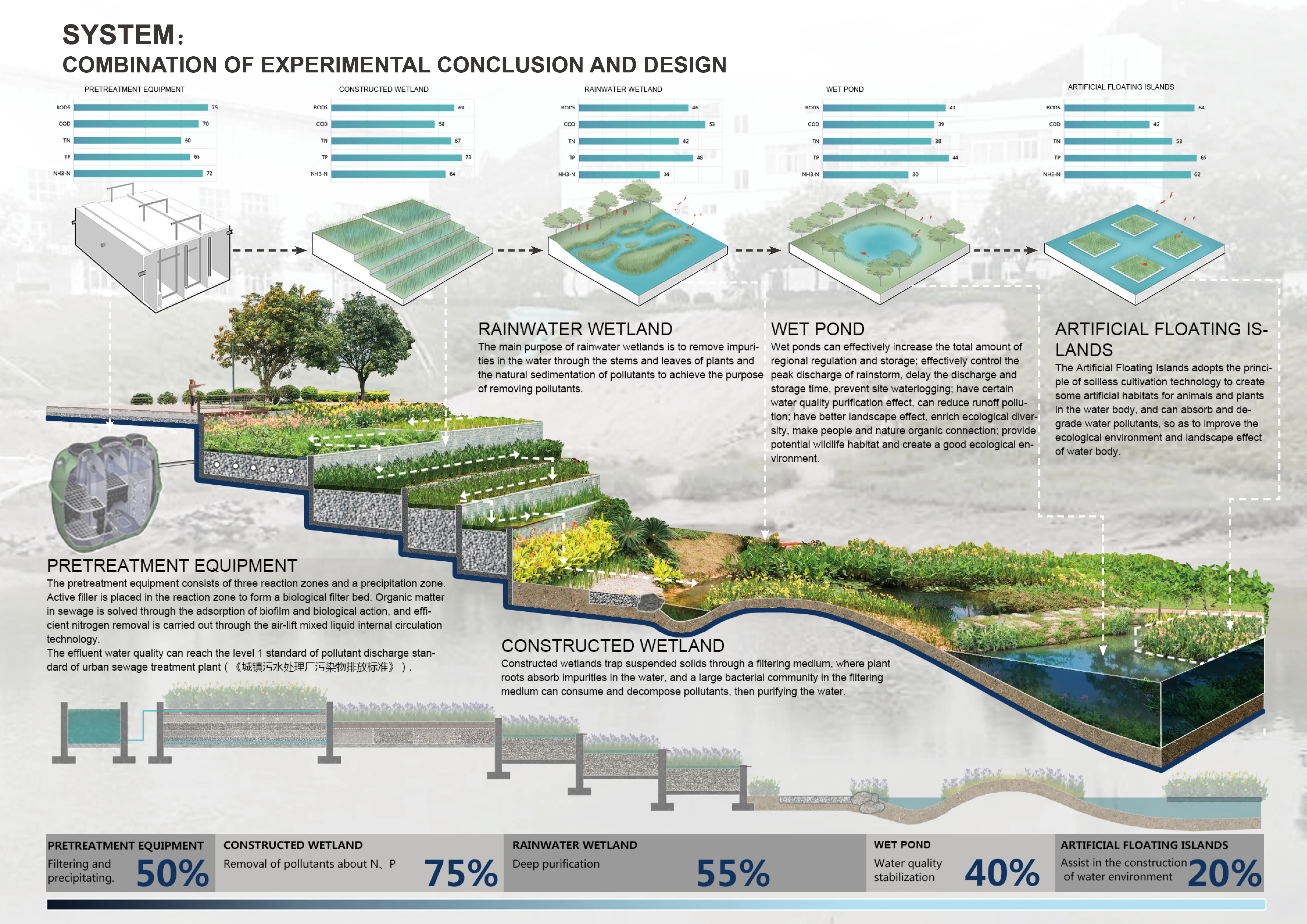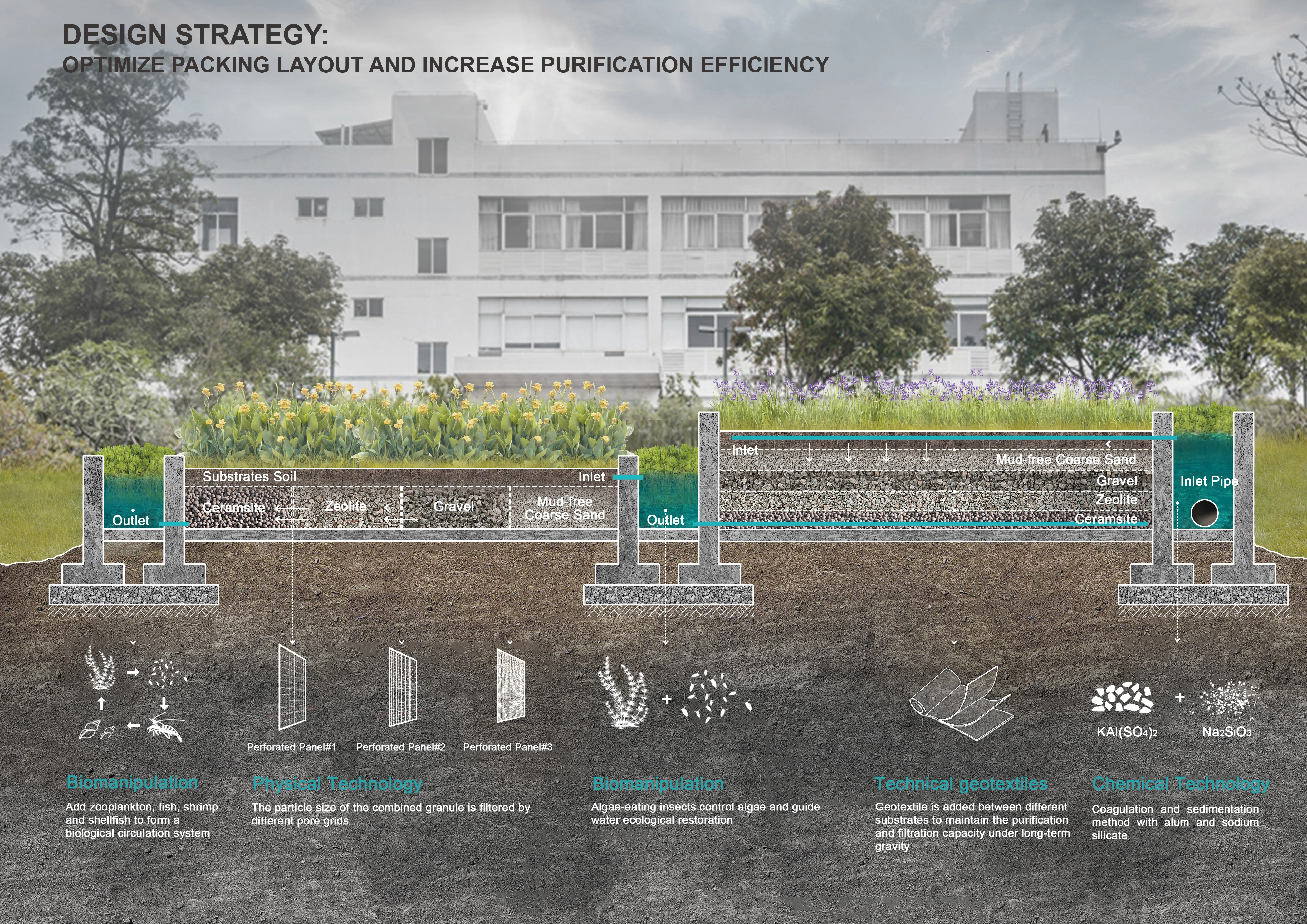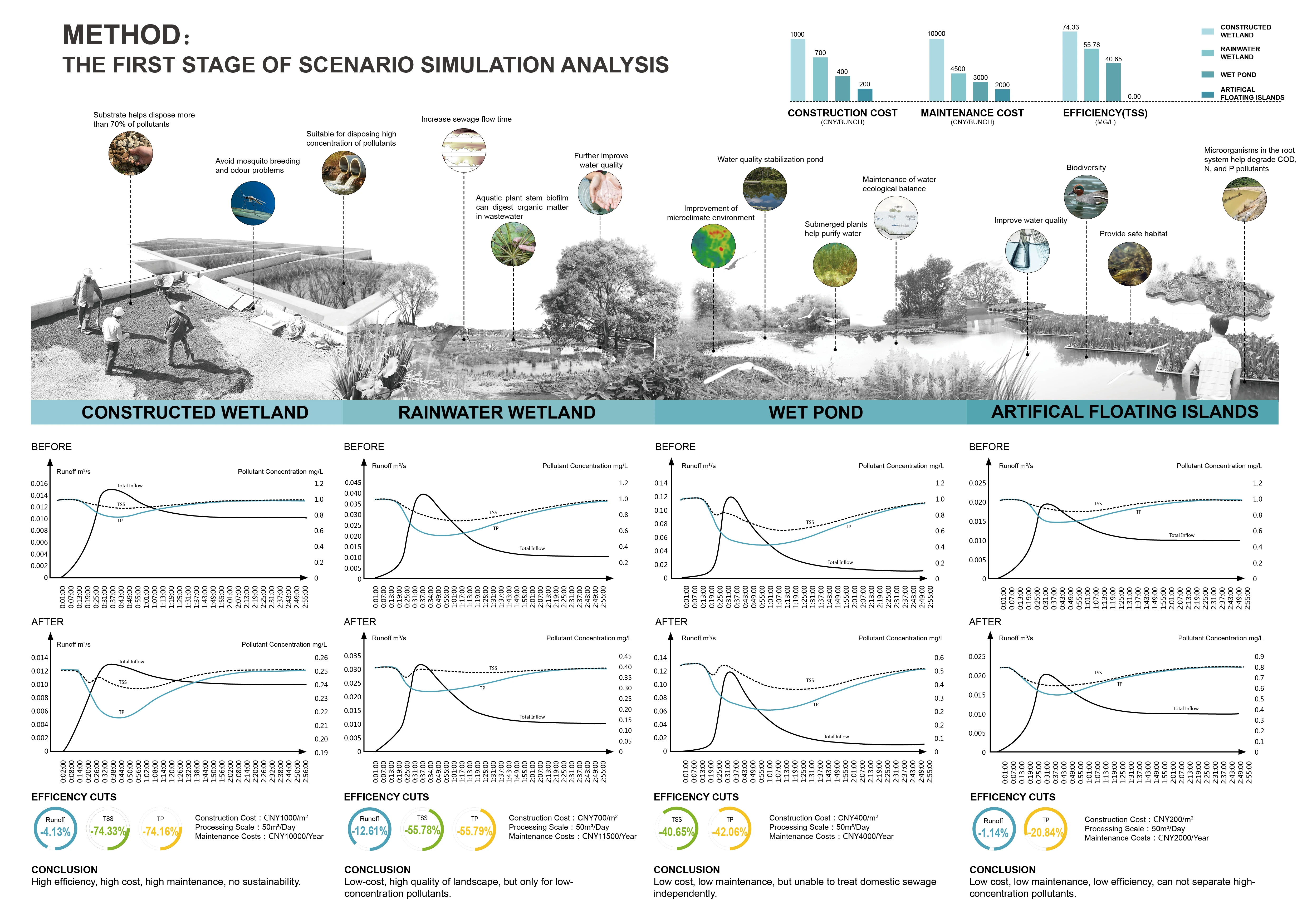 Research Background According to the data released in the Healthy Environment Healthy People (Nairobi, 2016) by the United Nations Environment Programmed (UNEP), more than 80% of the world’s sewage is discharged into the environment without treatment, especially in remote areas in developing countries. Environmental pollution caused by sewage threatens human well-beings, however, the traditional sewage treatment facilities for urban areas require high construction and maintenance costs that are difficult to implement. Unlike traditional engineering approaches, this project adopts a "Research through Design" method, uses the 15,000m2 contaminated central pond area and surrounding areas of the Feilaixia Water Conservancy Hub as the research core.The site is located in a remote area, with under-developed municipal infrastructure and limited construction funds, typical of a undeveloped area. Furthermore, the sewage from the research zone, office and living area on the site have been only treated with basic secondary septic tanks, and directly discharged into the pond of the park. The water quality of the pond has deteriorated year by year, which does not even meet the requirement for agricultural irrigation prior to the works. Meanwhile, the renovation was restricted due to a shortage of funds, which result in serious damage to the environment and biodiversity of the pond and surroundings. Research Questions Can landscape responses replace the high- cost traditional engineering methods and using ecological sewage treatment methods with "low maintenance cost and high operation efficiency" to solve the sewage treatment problems in the undeveloped areas? The project aims to address: (1) What are the effective Low Impact Development (LID) facilities for sewage treatment? Can these approaches simultaneously act on the treatment of the surface water pollution caused by rainwater and domestic sewage? (2) How to effectively combine different types and proportions of Low Impact Development (LID) facilities under low cost constraints to achieve the optimal purification performance and achieve the goal of “Low cost and High efficiency”? Research Methods Based on the above research questions, landscape architects led the research of the project and collaborated with specialists in the fields of sewage treatment, phytology and water conservancy engineering to consult on various specialist areas. The primary research methods are as follows: (1) Literature Review: Various books and publications related to sewage treatment technologies. Sewage purification capacities of different wetland plants and substrates mixes were analyzed to inform the selection of suitable LID facilities as well as a list of experimental plants and substrates with high-efficiency sewage purification capacity. (2) Field Work: Selected plants and substrates are tested and the data is collected for their actual performance. (3) Market Research: Based on the statistical analysis of the field research on local material suppliers and nurseries combined with online big data, the materials with high-efficiency cost performance are determined. (4) Scenario Simulations Analysis: The first stage: The research team is to build models on the Storm Water Management Model (SWMM) platform based on the preselected four types of LID facilities including: constructed wetland, rainwater wetland, wet pond and artificial floating islands. The control variates method will be used to simulate and analyze the pollutant treatment efficiency of the LID, and the construction and maintenance cost, the scale of the function and the service life of each LID were superimposed and analyzed. The second stage: According to the principle of the orthogonal experiment, four LID facilities were used as combination factors, and the area of different factors was changed as the second-level factor. Based on the second-level factors, 9 types of combinations will be simulated based on the permutations and combinations of the second-level factors. The runoff control rate, the removal rate of TSS (total suspended solids) and TP (total P) were simulated respectively on the SWMM platform, and the calculation of construction and maintenance costs are superimposed to determine the optimal combination mode to achieve Low-cost and High-efficiency. Research Results (1) The combination of four types of LID facilities including constructed wetland, rainwater wetland, wet pond and artificial floating islands, can both meet the requirements of treating storm water runoff pollution and domestic sewage at the same time, thereby replacing traditional engineering methods. (2) When the four LID facilities of: constructed wetland, rainwater wetland, wet pond and artificial floating islands account for 4.76%, 15.87%, 71.43% and 7.94% respectively, the sewage treatment strategy has the optimal efficiency on the site. Design Strategies In order to maximize the capacity of LID facilities on the site, the research team proposes 2 innovative design strategies which matches with site characteristics based on the result of the research. 1. To resolve the huge difference of elevation on site, the constructed wetland was designed as terraces. On the one hand, it resolves the height difference of 8 meters of the site, on the other hand, it maximizes the water body area, so as to maximize the decontamination efficiency, at the same time, it can also provide more potential for landscape opportunities. 2. To increase the contact area and time between the constructed wetland and the sewage, we introduced a brand-new vertical layout for substrates instead of the traditional horizontal layout, this arrangement demonstrated higher efficiency in decontamination. Monitoring the Results This project was completed in 2018 and has been in operation for three years. After tracking and monitoring, the Hash multi-parameter water quality online monitor is used by the research team to monitor water quality on BOD5, 