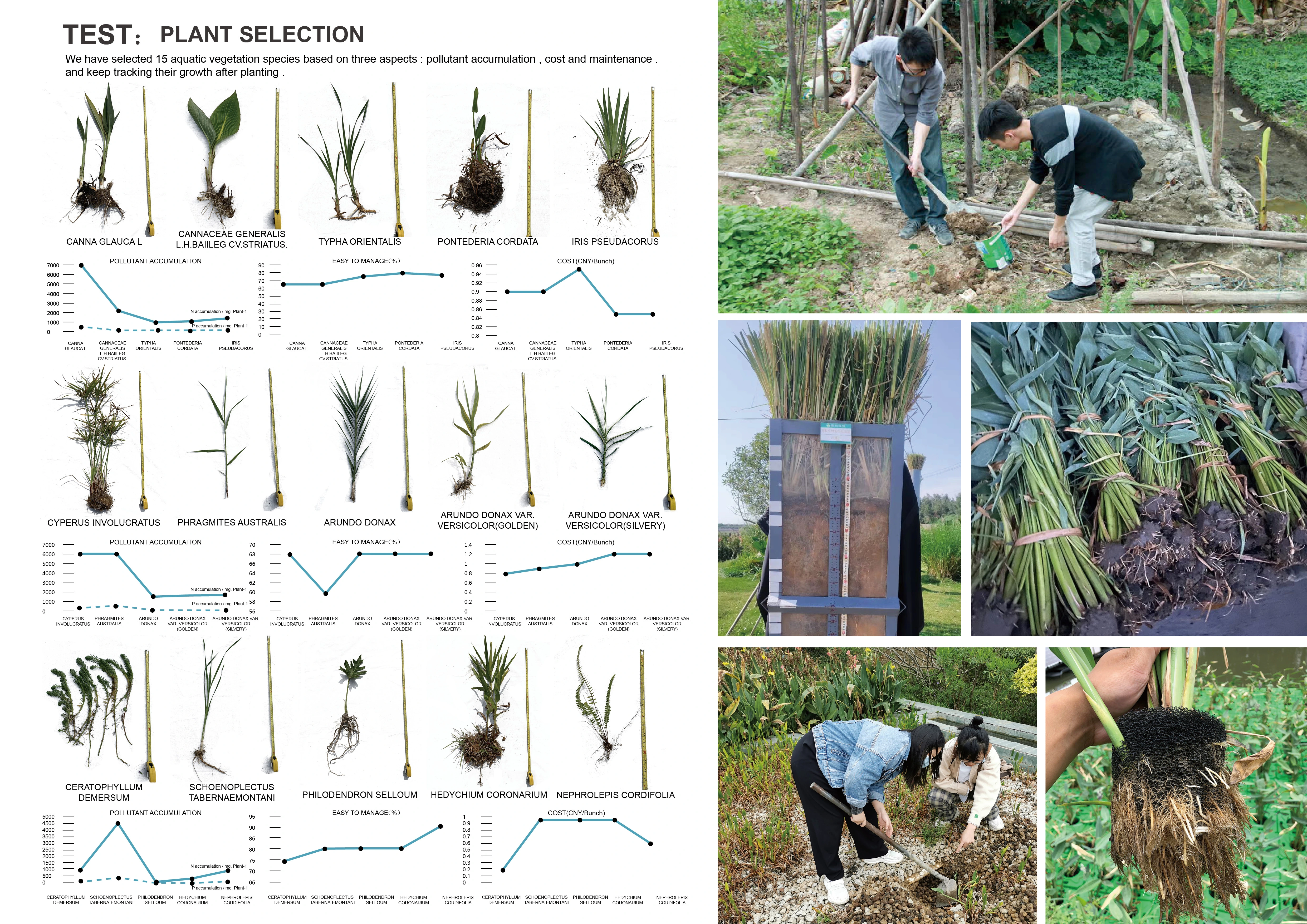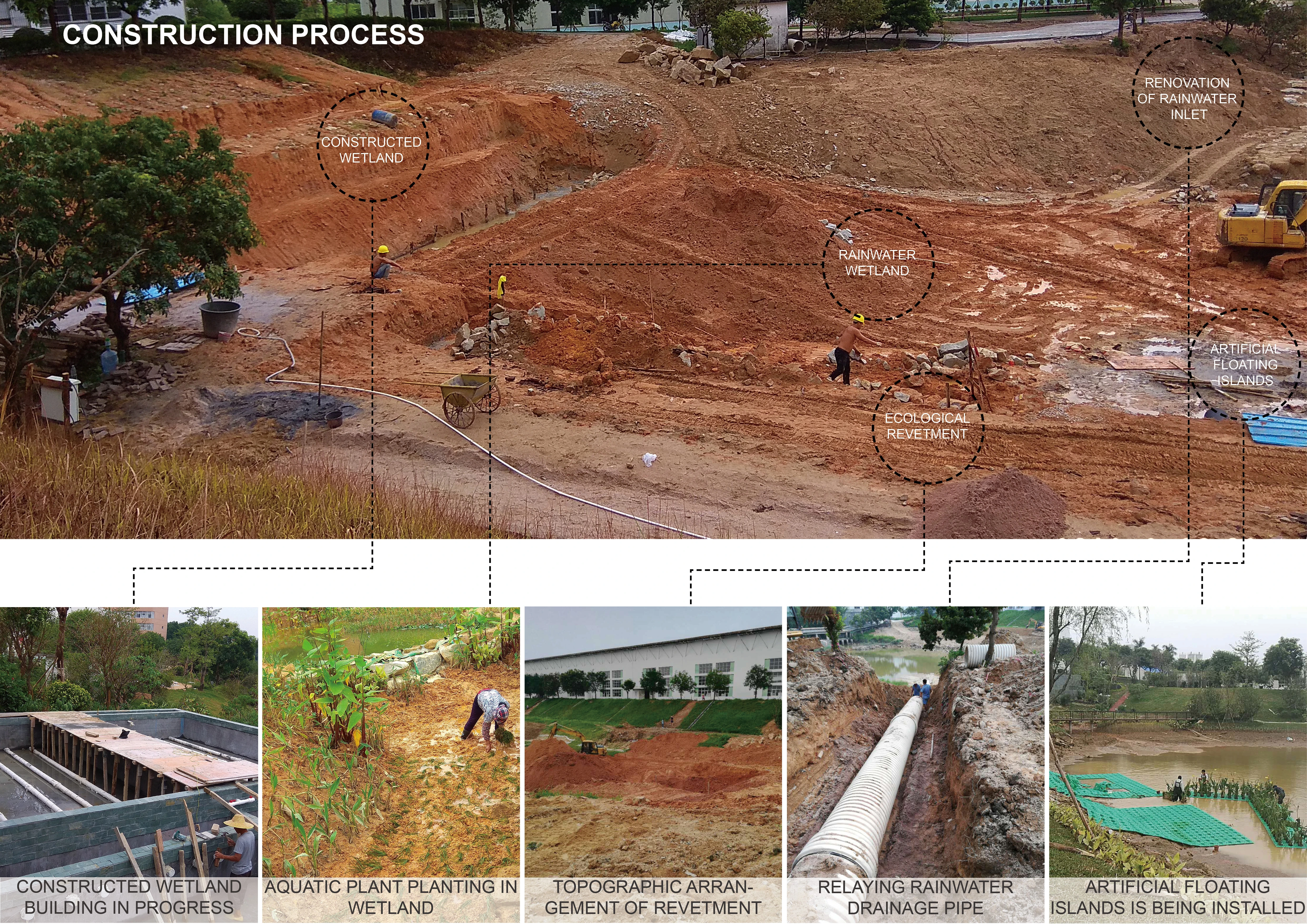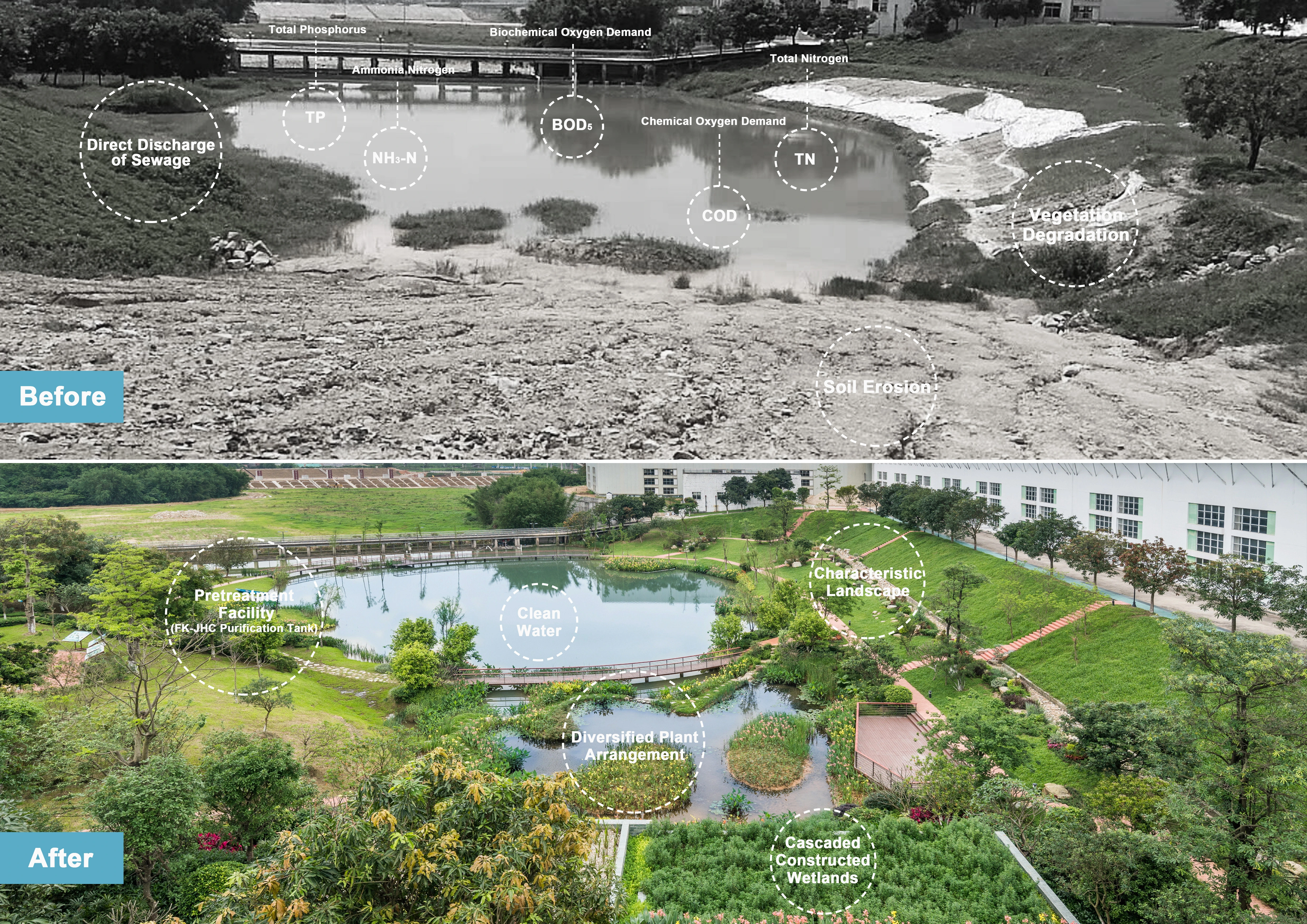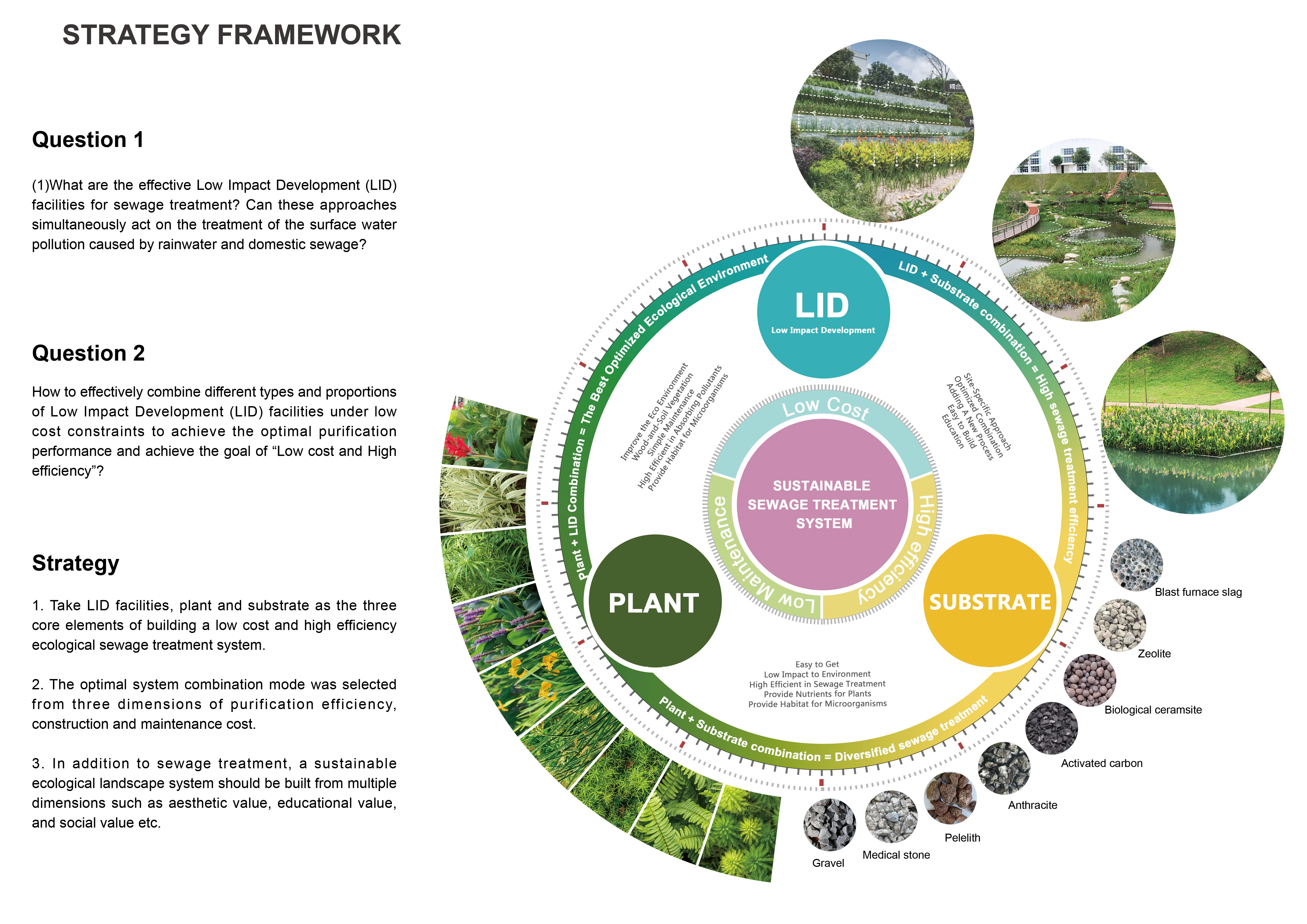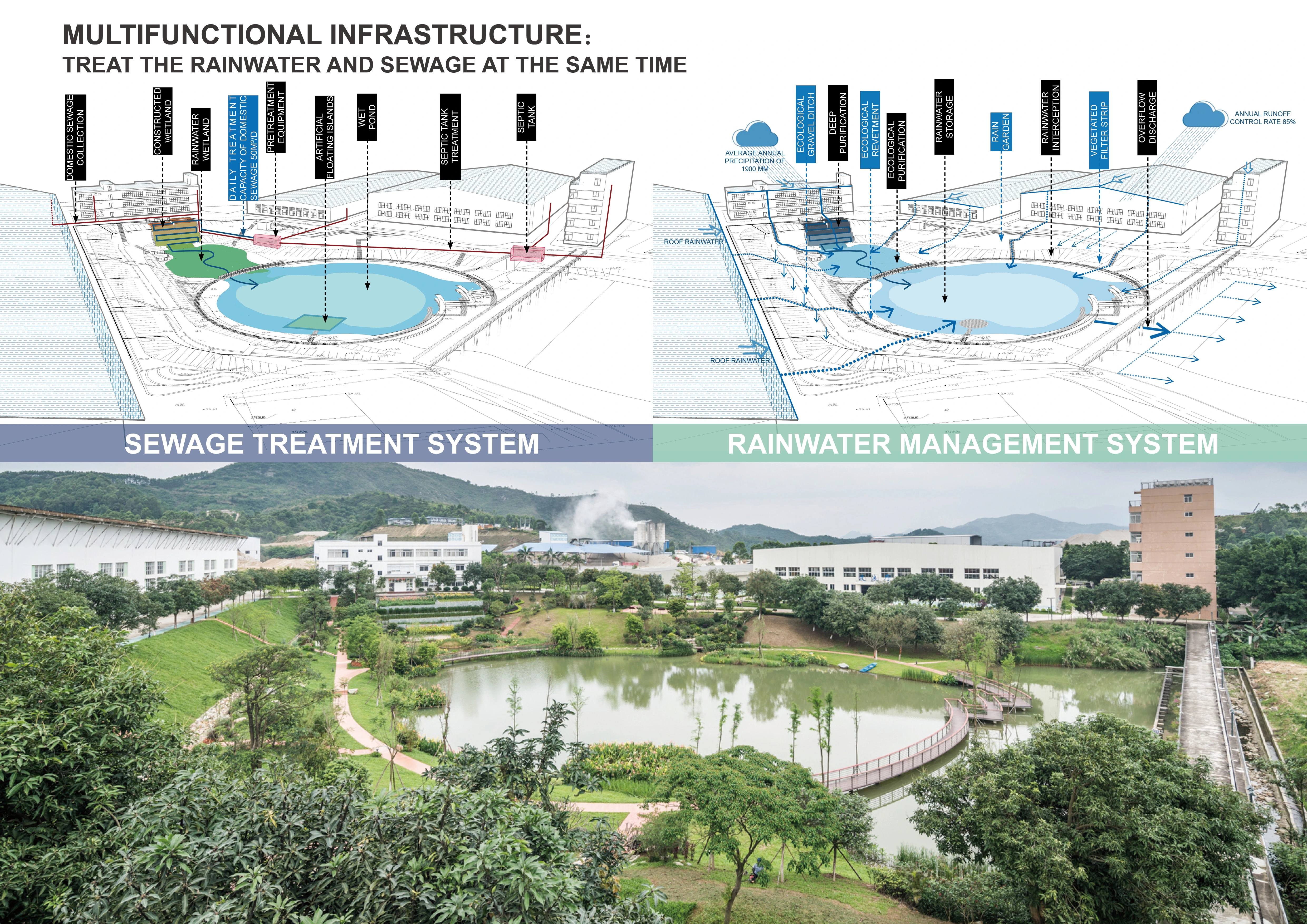 Research Background According to the data released in the Healthy Environment Healthy People (Nairobi, 2016) by the United Nations Environment Programmed (UNEP), more than 80% of the world’s sewage is discharged into the environment without treatment, especially in remote areas in developing countries. Environmental pollution caused by sewage threatens human well-beings, however, the traditional sewage treatment facilities for urban areas require high construction and maintenance costs that are difficult to implement. Unlike traditional engineering approaches, this project adopts a "Research through Design" method, uses the 15,000m2 contaminated central pond area and surrounding areas of the Feilaixia Water Conservancy Hub as the research core.The site is located in a remote area, with under-developed municipal infrastructure and limited construction funds, typical of a undeveloped area. Furthermore, the sewage from the research zone, office and living area on the site have been only treated with basic secondary septic tanks, and directly discharged into the pond of the park. The water quality of the pond has deteriorated year by year, which does not even meet the requirement for agricultural irrigation prior to the works. Meanwhile, the renovation was restricted due to a shortage of funds, which result in serious damage to the environment and biodiversity of the pond and surroundings. Research Questions Can landscape responses replace the high- cost traditional engineering methods and using ecological sewage treatment methods with "low maintenance cost and high operation efficiency" to solve the sewage treatment problems in the undeveloped areas? The project aims to address: (1) What are the effective Low Impact Development (LID) facilities for sewage treatment? Can these approaches simultaneously act on the treatment of the surface water pollution caused by rainwater and domestic sewage? (2) How to effectively combine different types and proportions of Low Impact Development (LID) facilities under low cost constraints to achieve the optimal purification performance and achieve the goal of “Low cost and High efficiency”? Research Methods Based on the above research questions, landscape architects led the research of the project and collaborated with specialists in the fields of sewage treatment, phytology and water conservancy engineering to consult on various specialist areas. The primary research methods are as follows: (1) Literature Review: Various books and publications related to sewage treatment technologies. Sewage purification capacities of different wetland plants and substrates mixes were analyzed to inform the selection of suitable LID facilities as well as a list of experimental plants and substrates with high-efficiency sewage purification capacity. (2) Field Work: Selected plants and substrates are tested and the data is collected for their actual performance. (3) Market Research: Based on the statistical analysis of the field research on local material suppliers and nurseries combined with online big data, the materials with high-efficiency cost performance are determined. (4) Scenario Simulations Analysis: The first stage: The research team is to build models on the Storm Water Management Model (SWMM) platform based on the preselected four types of LID facilities including: constructed wetland, rainwater wetland, wet pond and artificial floating islands. The control variates method will be used to simulate and analyze the pollutant treatment efficiency of the LID, and the construction and maintenance cost, the scale of the function and the service life of each LID were superimposed and analyzed. The second stage: According to the principle of the orthogonal experiment, four LID facilities were used as combination factors, and the area of different factors was changed as the second-level factor. Based on the second-level factors, 9 types of combinations will be simulated based on the permutations and combinations of the second-level factors. The runoff control rate, the removal rate of TSS (total suspended solids) and TP (total P) were simulated respectively on the SWMM platform, and the calculation of construction and maintenance costs are superimposed to determine the optimal combination mode to achieve Low-cost and High-efficiency. Research Results (1) The combination of four types of LID facilities including constructed wetland, rainwater wetland, wet pond and artificial floating islands, can both meet the requirements of treating storm water runoff pollution and domestic sewage at the same time, thereby replacing traditional engineering methods. (2) When the four LID facilities of: constructed wetland, rainwater wetland, wet pond and artificial floating islands account for 4.76%, 15.87%, 71.43% and 7.94% respectively, the sewage treatment strategy has the optimal efficiency on the site. Design Strategies In order to maximize the capacity of LID facilities on the site, the research team proposes 2 innovative design strategies which matches with site characteristics based on the result of the research. 1. To resolve the huge difference of elevation on site, the constructed wetland was designed as terraces. On the one hand, it resolves the height difference of 8 meters of the site, on the other hand, it maximizes the water body area, so as to maximize the decontamination efficiency, at the same time, it can also provide more potential for landscape opportunities. 2. To increase the contact area and time between the constructed wetland and the sewage, we introduced a brand-new vertical layout for substrates instead of the traditional horizontal layout, this arrangement demonstrated higher efficiency in decontamination. Monitoring the Results This project was completed in 2018 and has been in operation for three years. After tracking and monitoring, the Hash multi-parameter water quality online monitor is used by the research team to monitor water quality on BOD5, 