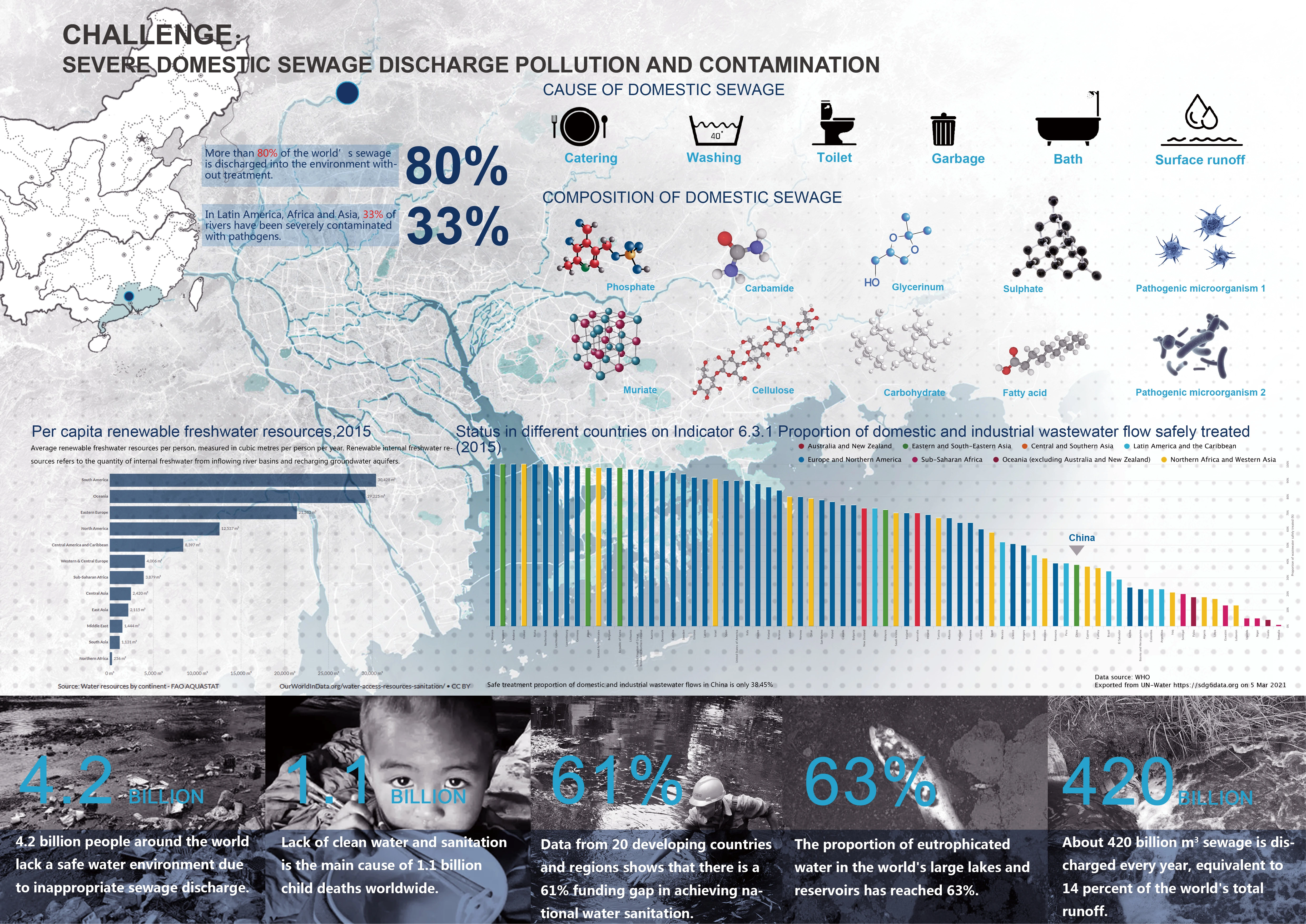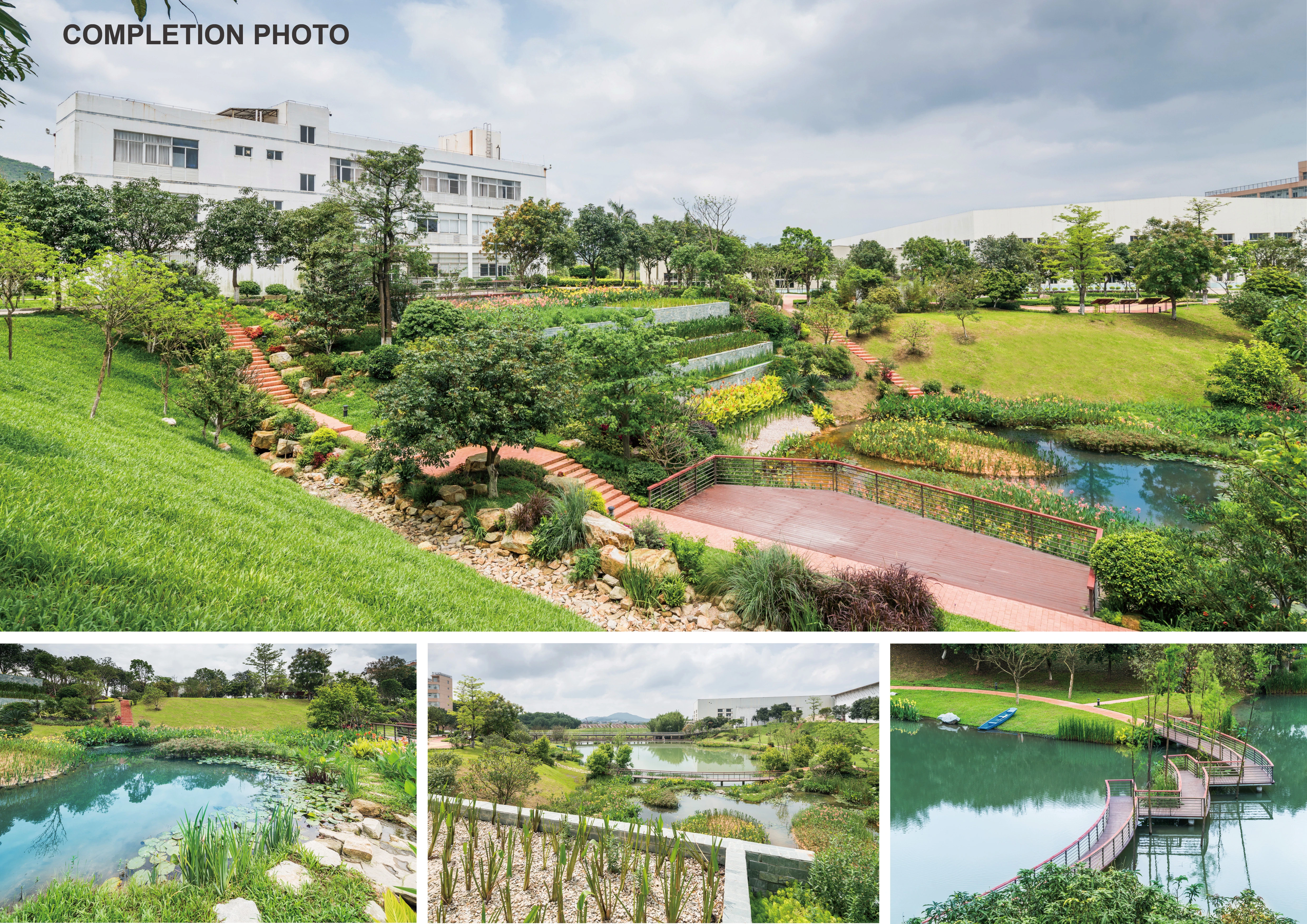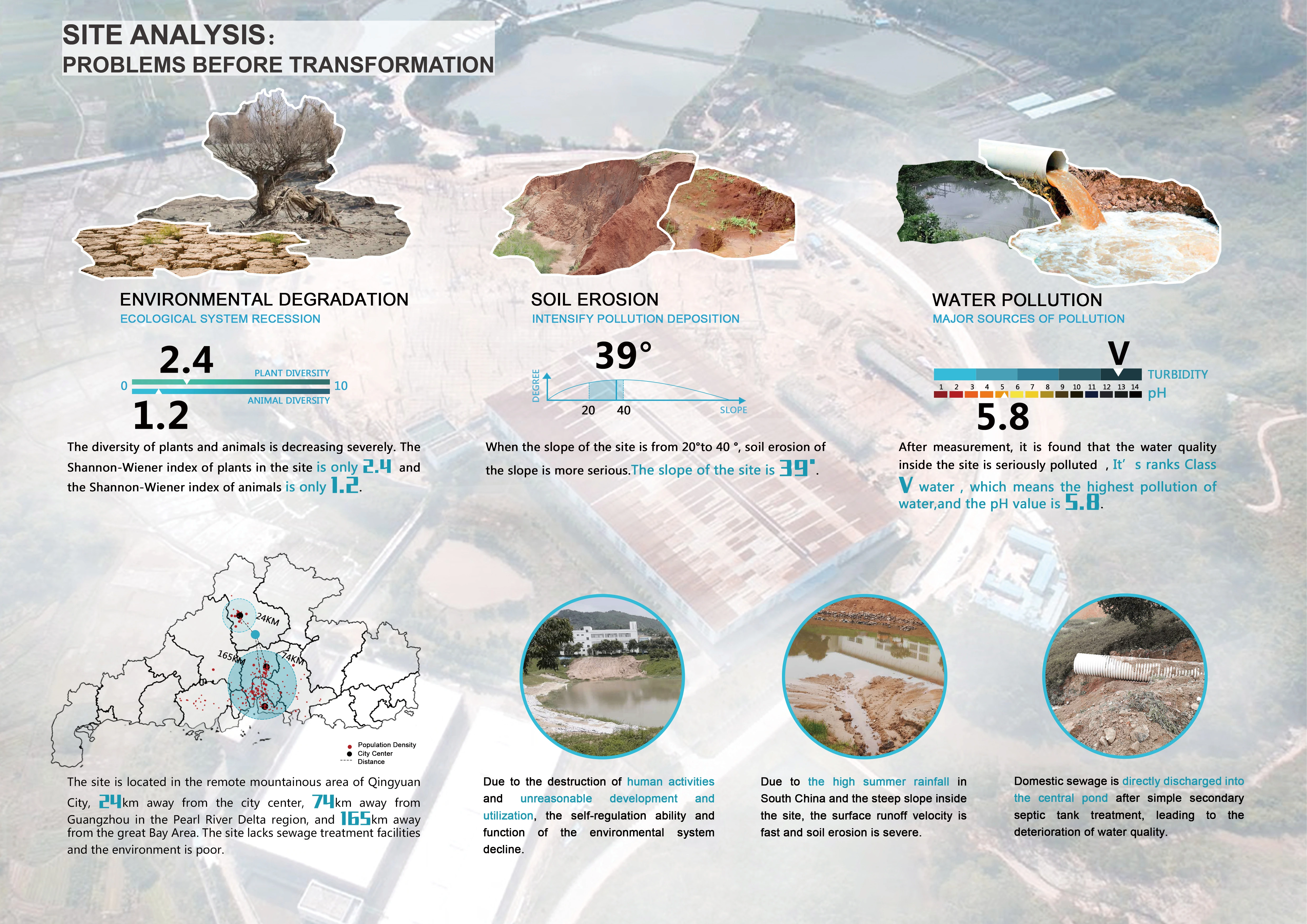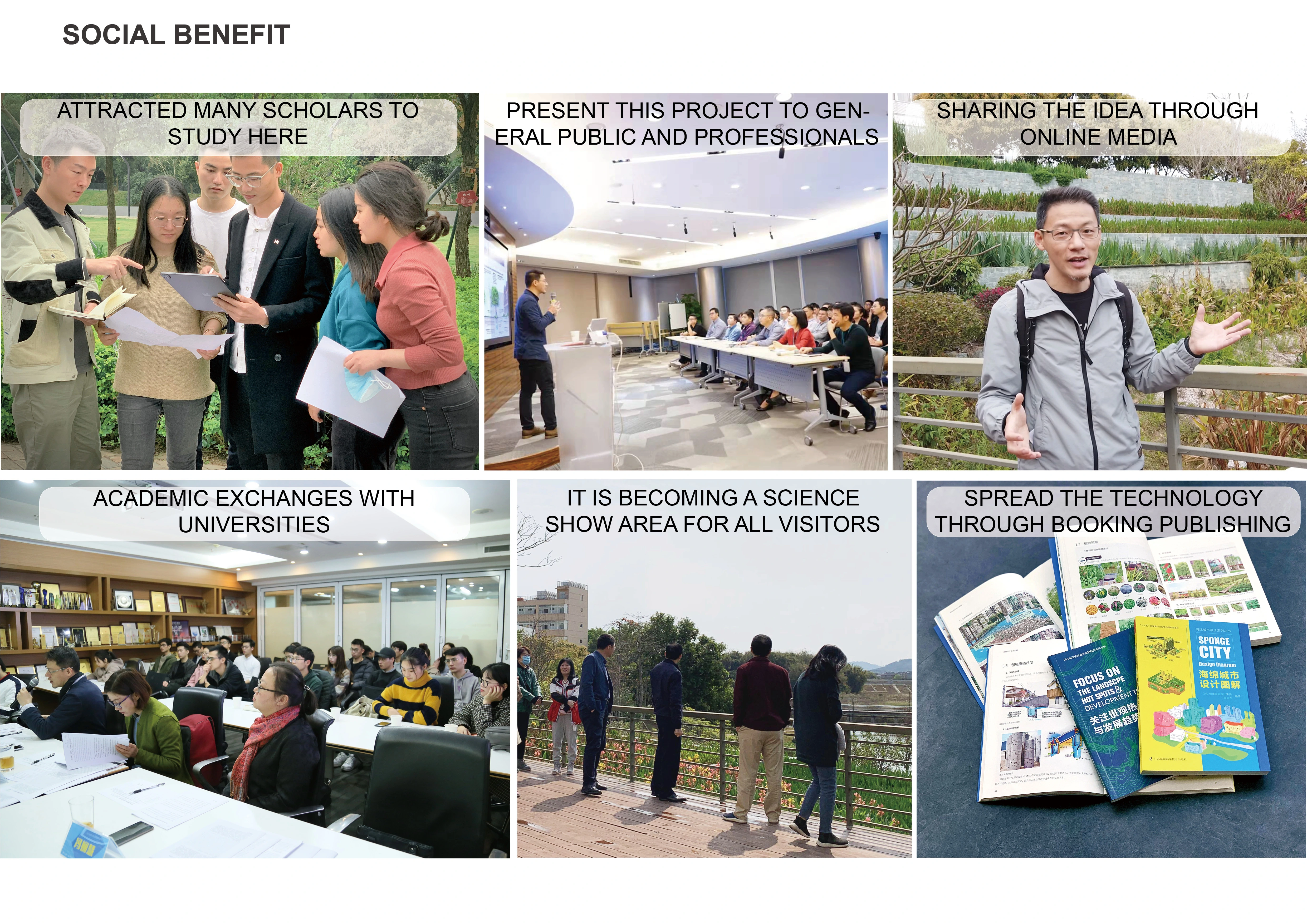 Research Background According to the data released in the Healthy Environment Healthy People (Nairobi, 2016) by the United Nations Environment Programmed (UNEP), more than 80% of the world’s sewage is discharged into the environment without treatment, especially in remote areas in developing countries. Environmental pollution caused by sewage threatens human well-beings, however, the traditional sewage treatment facilities for urban areas require high construction and maintenance costs that are difficult to implement. Unlike traditional engineering approaches, this project adopts a "Research through Design" method, uses the 15,000m2 contaminated central pond area and surrounding areas of the Feilaixia Water Conservancy Hub as the research core.The site is located in a remote area, with under-developed municipal infrastructure and limited construction funds, typical of a undeveloped area. Furthermore, the sewage from the research zone, office and living area on the site have been only treated with basic secondary septic tanks, and directly discharged into the pond of the park. The water quality of the pond has deteriorated year by year, which does not even meet the requirement for agricultural irrigation prior to the works. Meanwhile, the renovation was restricted due to a shortage of funds, which result in serious damage to the environment and biodiversity of the pond and surroundings. Research Questions Can landscape responses replace the high- cost traditional engineering methods and using ecological sewage treatment methods with "low maintenance cost and high operation efficiency" to solve the sewage treatment problems in the undeveloped areas? The project aims to address: (1) What are the effective Low Impact Development (LID) facilities for sewage treatment? Can these approaches simultaneously act on the treatment of the surface water pollution caused by rainwater and domestic sewage? (2) How to effectively combine different types and proportions of Low Impact Development (LID) facilities under low cost constraints to achieve the optimal purification performance and achieve the goal of “Low cost and High efficiency”? Research Methods Based on the above research questions, landscape architects led the research of the project and collaborated with specialists in the fields of sewage treatment, phytology and water conservancy engineering to consult on various specialist areas. The primary research methods are as follows: (1) Literature Review: Various books and publications related to sewage treatment technologies. Sewage purification capacities of different wetland plants and substrates mixes were analyzed to inform the selection of suitable LID facilities as well as a list of experimental plants and substrates with high-efficiency sewage purification capacity. (2) Field Work: Selected plants and substrates are tested and the data is collected for their actual performance. (3) Market Research: Based on the statistical analysis of the field research on local material suppliers and nurseries combined with online big data, the materials with high-efficiency cost performance are determined. (4) Scenario Simulations Analysis: The first stage: The research team is to build models on the Storm Water Management Model (SWMM) platform based on the preselected four types of LID facilities including: constructed wetland, rainwater wetland, wet pond and artificial floating islands. The control variates method will be used to simulate and analyze the pollutant treatment efficiency of the LID, and the construction and maintenance cost, the scale of the function and the service life of each LID were superimposed and analyzed. The second stage: According to the principle of the orthogonal experiment, four LID facilities were used as combination factors, and the area of different factors was changed as the second-level factor. Based on the second-level factors, 9 types of combinations will be simulated based on the permutations and combinations of the second-level factors. The runoff control rate, the removal rate of TSS (total suspended solids) and TP (total P) were simulated respectively on the SWMM platform, and the calculation of construction and maintenance costs are superimposed to determine the optimal combination mode to achieve Low-cost and High-efficiency. Research Results (1) The combination of four types of LID facilities including constructed wetland, rainwater wetland, wet pond and artificial floating islands, can both meet the requirements of treating storm water runoff pollution and domestic sewage at the same time, thereby replacing traditional engineering methods. (2) When the four LID facilities of: constructed wetland, rainwater wetland, wet pond and artificial floating islands account for 4.76%, 15.87%, 71.43% and 7.94% respectively, the sewage treatment strategy has the optimal efficiency on the site. Design Strategies In order to maximize the capacity of LID facilities on the site, the research team proposes 2 innovative design strategies which matches with site characteristics based on the result of the research. 1. To resolve the huge difference of elevation on site, the constructed wetland was designed as terraces. On the one hand, it resolves the height difference of 8 meters of the site, on the other hand, it maximizes the water body area, so as to maximize the decontamination efficiency, at the same time, it can also provide more potential for landscape opportunities. 2. To increase the contact area and time between the constructed wetland and the sewage, we introduced a brand-new vertical layout for substrates instead of the traditional horizontal layout, this arrangement demonstrated higher efficiency in decontamination. Monitoring the Results This project was completed in 2018 and has been in operation for three years. After tracking and monitoring, the Hash multi-parameter water quality online monitor is used by the research team to monitor water quality on BOD5, 