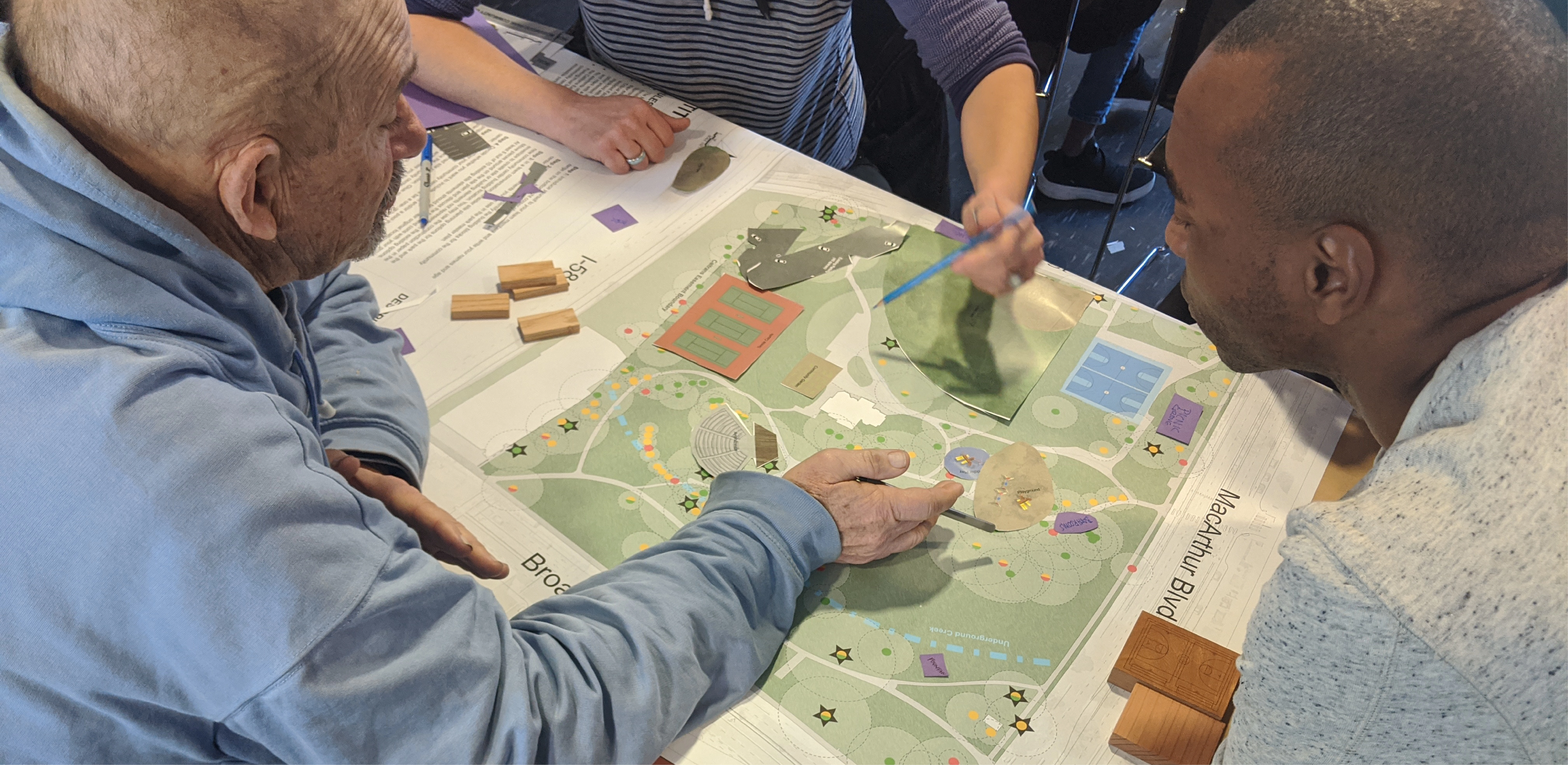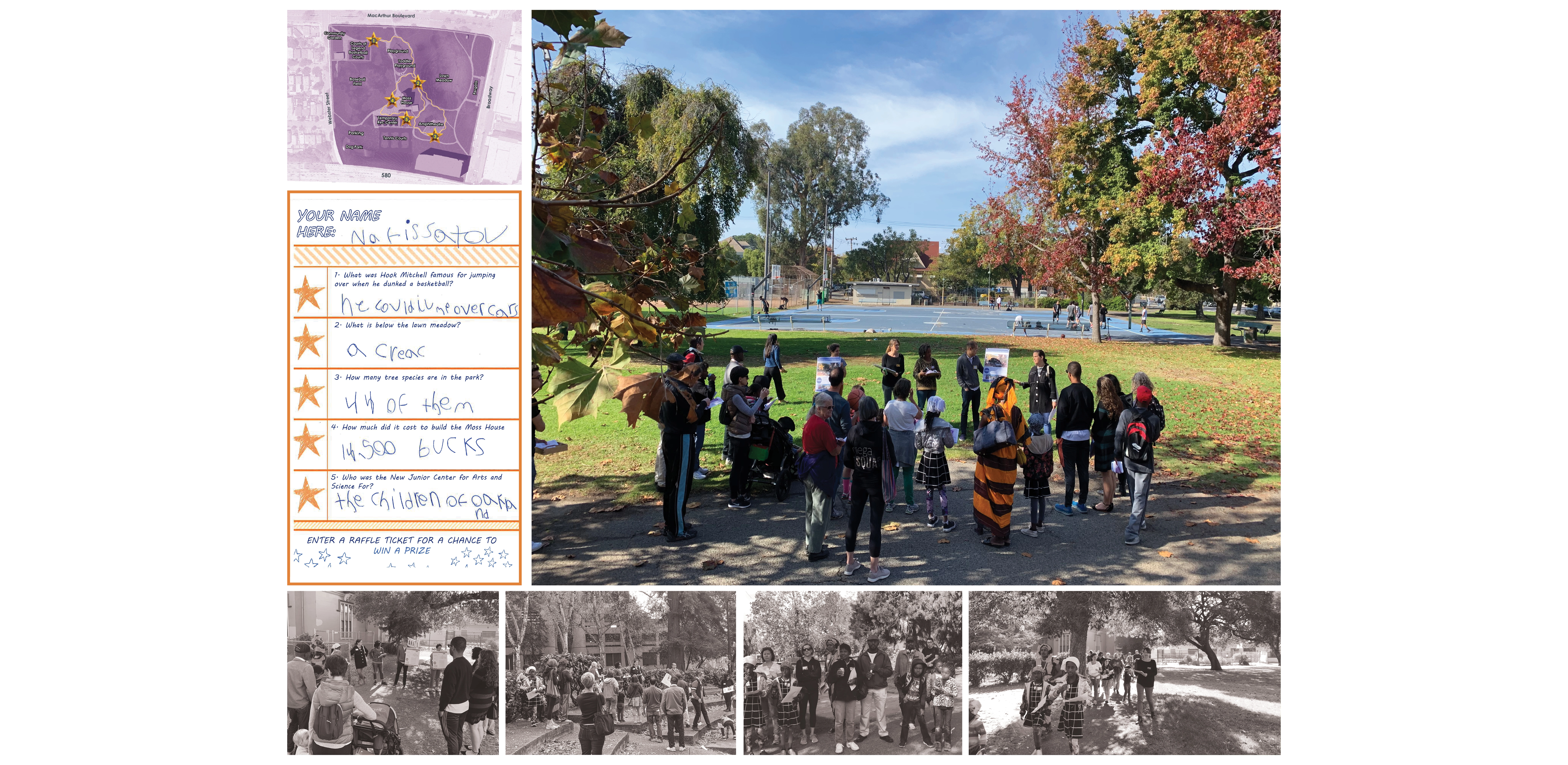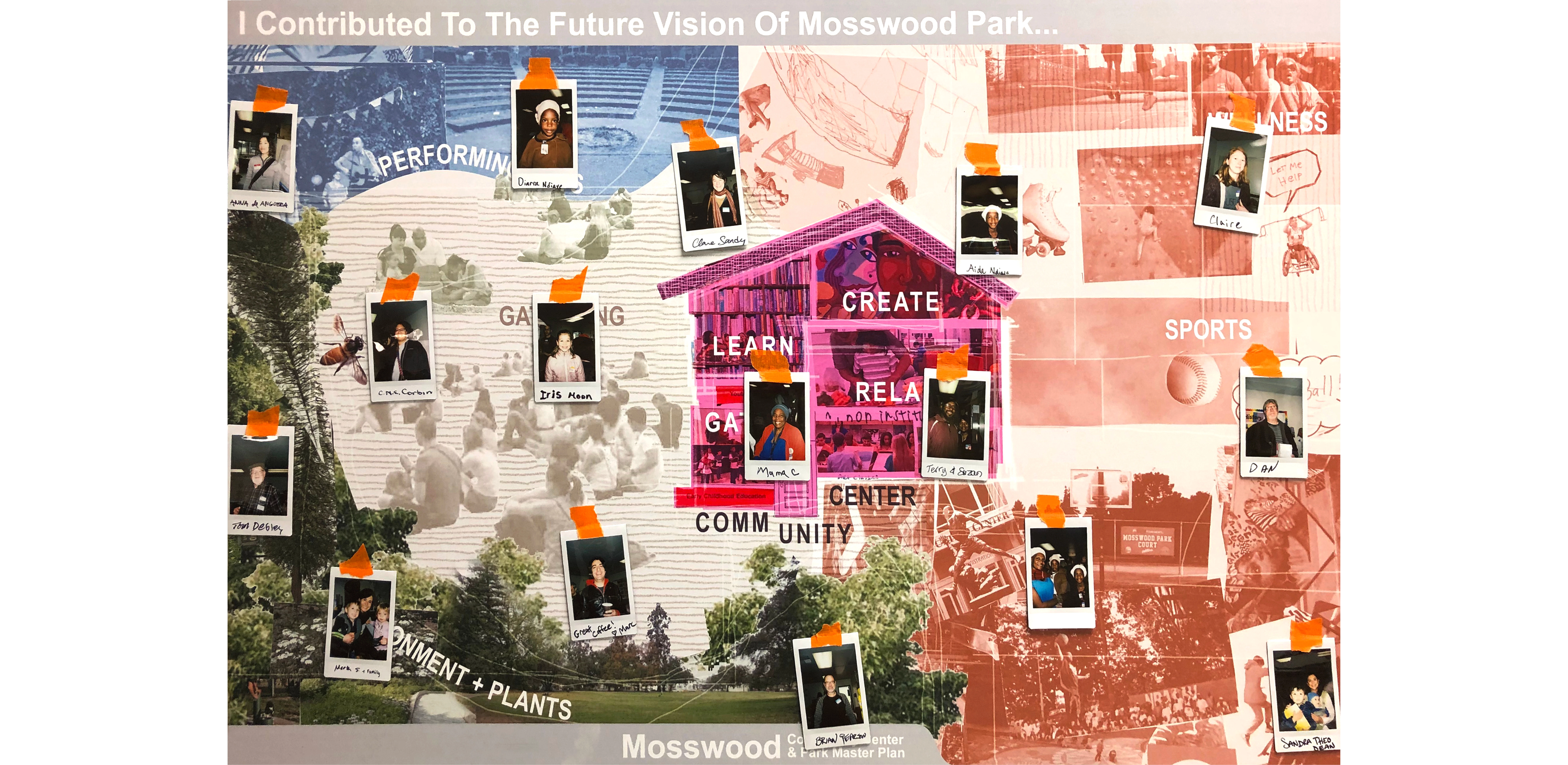 Site History + Project Framework Mosswood Park, located in Oakland, California, is a beloved community park. The Mosswood Park Master Plan began as a deep dive into a more complete history of the park that broadened the areas of historic interest, originally limited to the historic Carpenter Gothic J. Mora Moss House and Estate. This wider reconceptualization of history included pre-Mr. Moss’s ownership, numerous important events and community activities which occurred in the park throughout the 1970s, among other histories. The design team researched the history of the park beginning with the Ohlone people and the importance of the ecology of the creek that is now covered over. The team also reviewed the post wartime parks and recreation history at the site and the original conception of a community center at the Junior Center for Arts and Science. The center served all kids and had a curriculum focused on creativity, a precursor of today’s STEM and STEAM programs. Despite disruption of the park with the construction of highway 580 in 1954, Mosswood Park remained an important center for the African American community who exhibited resilience as gradual disinvestment in the neighborhood occurred. This deep dive into many eras of history and many different stories of the park resulted in a framework where the “Historic J. Mora Moss House” and the famous basketball Courts of Legend were both considered of equal importance in park history and numerous other smaller social events that together show social resistance and resiliency by marginalized groups were also considered of great value. Our team’s research reinforced the idea that although gentrification has changed the racial and economic make-up of immediate neighbors to the park, the site remains a place to protect, strengthen, and center culture for many black, indigenous and people of color communities (BIPOC) and as such, the propinquity of new generally wealthier and whiter neighbors would need to be balanced in planning for the future. Therefore, one of the goals of the Master Plan community engagement process was to give a voice to the older generation of Mosswood residents and their families, particularly the Black and African American communities that have a deep connection to the park but have been displaced over recent years to other parts of Oakland. Community Based Design A year-long process of workshops and community engagement was implemented by a grant application. The schedule necessitated moving quickly and required the community’s willingness to engage often during the year, a keystone to the success of the outcome. Prior to the start of the workshops, the design team attended events that extended a more personal invitation to marginalized groups. A total of six workshops were led at the temporary community center within the park and nearby Studio One Art Center. Developing high quality graphics for communication with the public was one way the design team expressed respect for the community members. The design team created a timeline which they called “The Incomplete History of Mosswood Park” that documented many different moments in the history of the land. The graphic included a board for ‘future visions of the park’ at the end of the workshops where community members expressed their hopes and dreams and imagined a future they would want to see at the park. This collective imagining of a shared future was a starting point for understanding what was working and beloved in the park, what was missing, and what could be changed. Tools for gathering ideas for the park’s design and a deep understanding of the site were created in numerous formats including: mapping with tape, individual collages of scenes in the park, group collages showing what people wanted to see at the new community center and surrounds, and site walks where spontaneous sharing of memories were layered over the design team’s recounting of important site stories they had learned about while researching the park’s history. Synthesizing community ideas into graphics, the design team also provided their expert knowledge about the trees, geotechnical conditions of the site, and the sizes of different site elements the community wanted in the park. A design challenge (with a few rules to protect important historic resources, including the mature trees) was explored by small teams. Wood blocks carefully cut and sanded from the most common species of trees found at the park—Oak, Redwood, and Catalina Cherry--were used as scaled building blocks that could be placed on site plans for study during discussions. Three primary locations for the new community center emerged from the community’s ideas and the design team refined each of these locations into schemes that further explored overall site organization. The community provided input on these three schemes which were presented in physical models, digital model views, and site plans. Stations for sustainability, history, and other important topics were set up for input on each of the three schemes. With remarkable consensus, a single location emerged from review of the three design options and was subsequently incorporated into the recommendation for the master plan. The final design was presented at a final workshop and posted to the city website for review. All comments were then addressed and the final master plan was published and approved in February 2021 by the Oakland City Council. Racial Equity Design Goals Working within a historically black community, with the knowledge that safety for black, indigenous and people of color communities (BIPOC) in public space has been severely lacking for a long time and is overdue to be addressed, the City of Oakland and the design team made a commitment to act on closing these disparities in the Master Plan document. The built environment has the unique responsibility to manifest values and close disparities by broadening windows of op