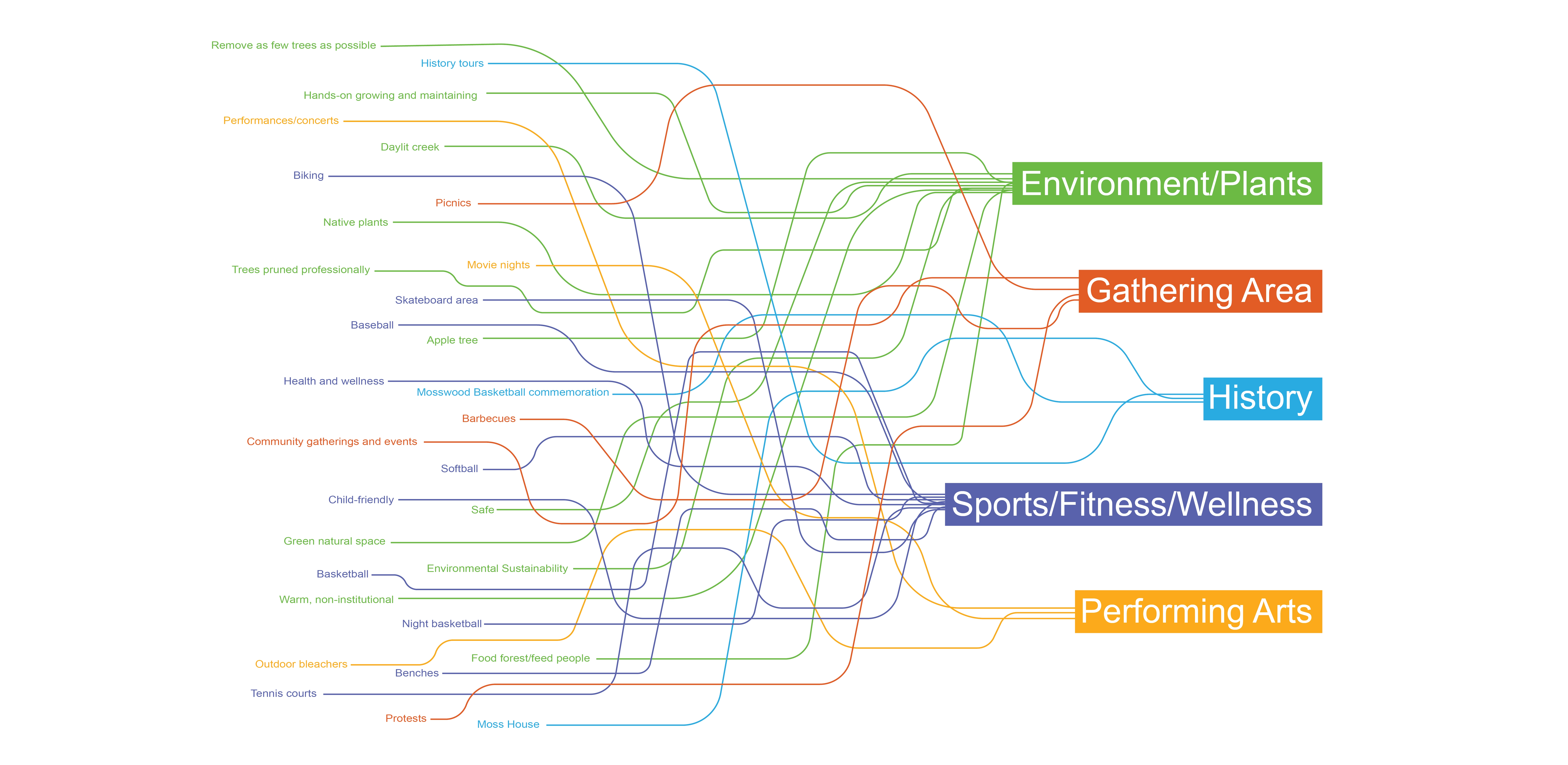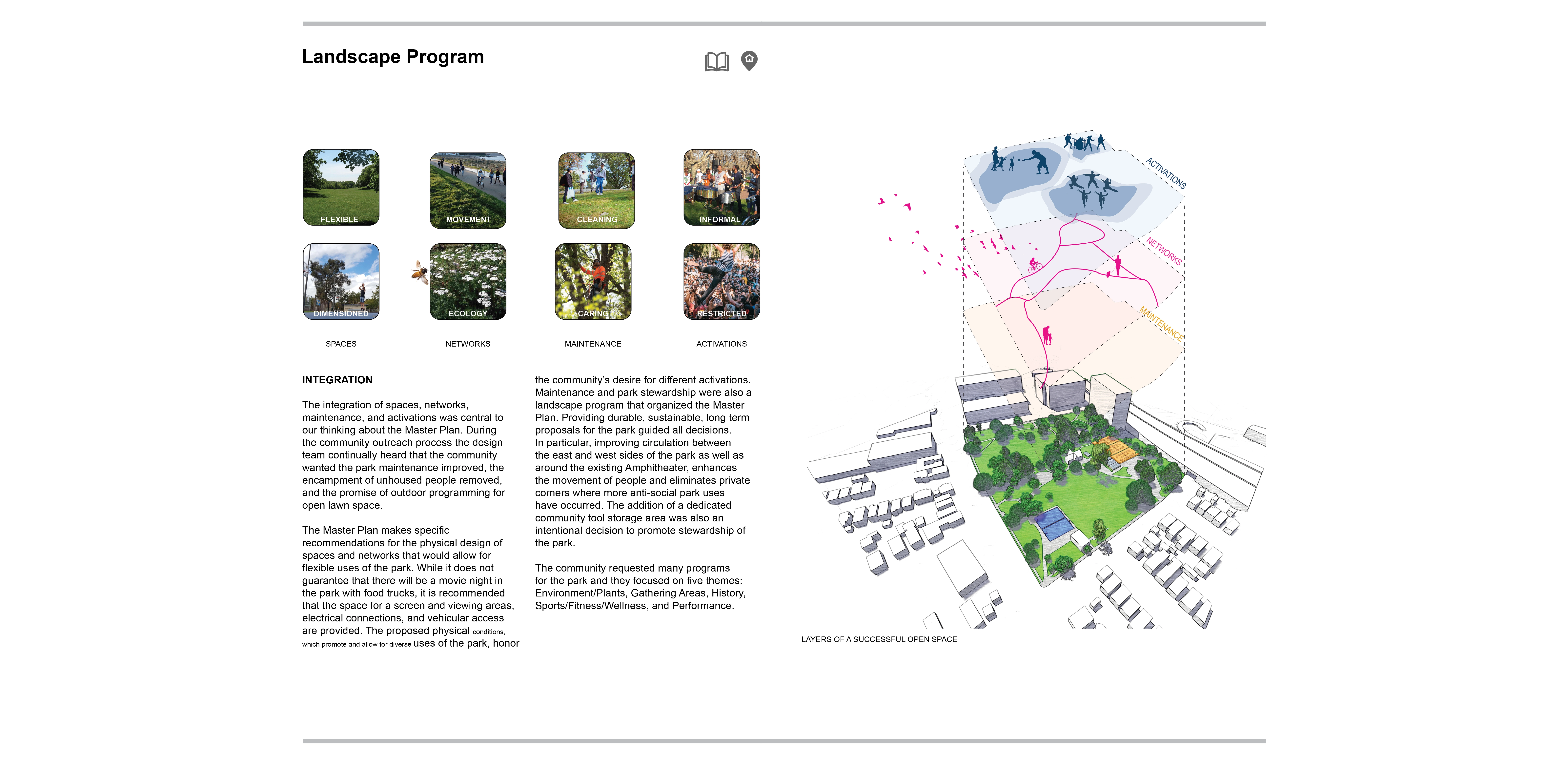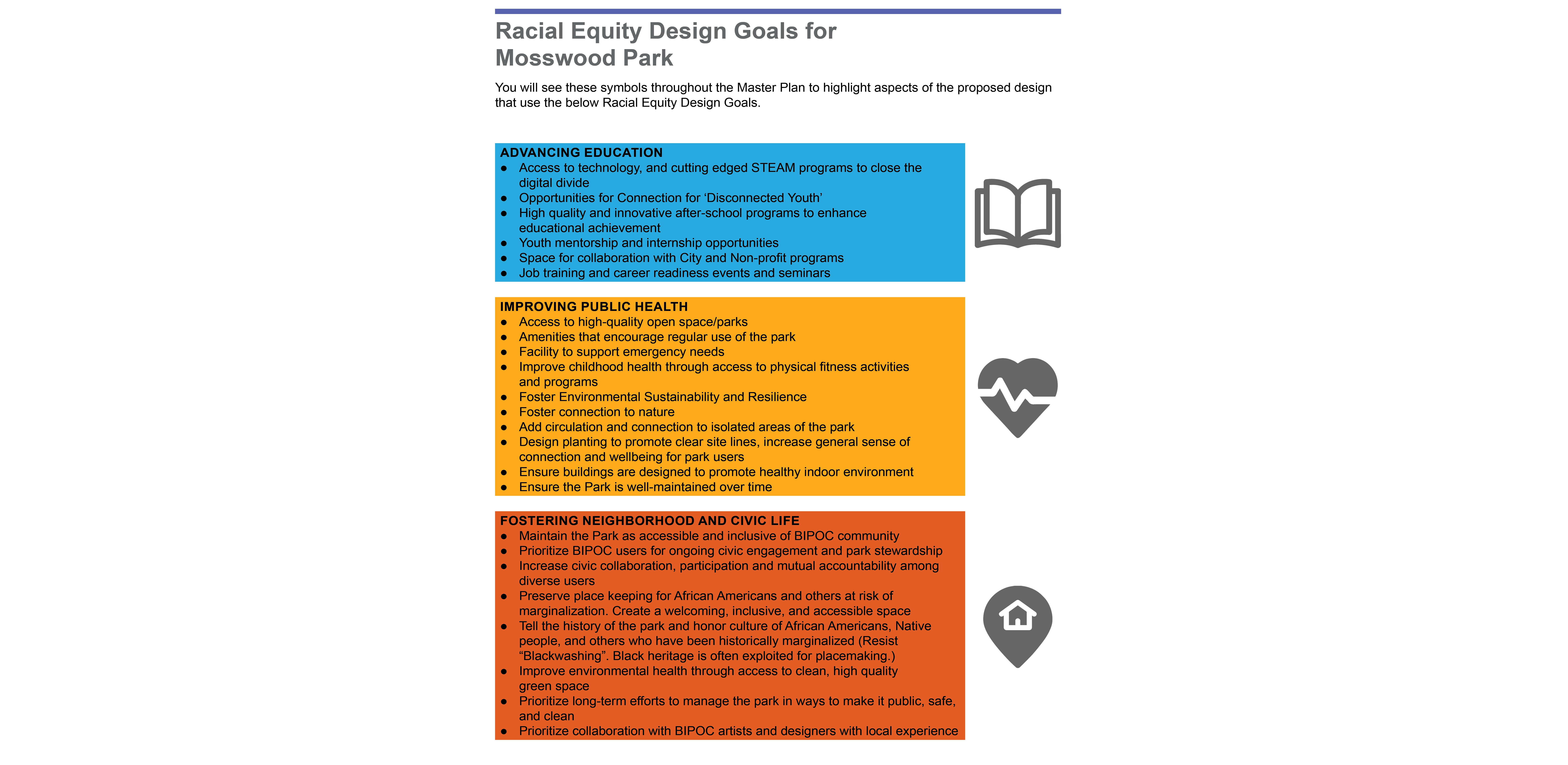Site History + Project Framework Mosswood Park, located in Oakland, California, is a beloved community park. The Mosswood Park Master Plan began as a deep dive into a more complete history of the park that broadened the areas of historic interest, originally limited to the historic Carpenter Gothic J. Mora Moss House and Estate. This wider reconceptualization of history included pre-Mr. Moss’s ownership, numerous important events and community activities which occurred in the park throughout the 1970s, among other histories. The design team researched the history of the park beginning with the Ohlone people and the importance of the ecology of the creek that is now covered over. The team also reviewed the post wartime parks and recreation history at the site and the original conception of a community center at the Junior Center for Arts and Science. The center served all kids and had a curriculum focused on creativity, a precursor of today’s STEM and STEAM programs. Despite disruption of the park with the construction of highway 580 in 1954, Mosswood Park remained an important center for the African American community who exhibited resilience as gradual disinvestment in the neighborhood occurred. This deep dive into many eras of history and many different stories of the park resulted in a framework where the “Historic J. Mora Moss House” and the famous basketball Courts of Legend were both considered of equal importance in park history and numerous other smaller social events that together show social resistance and resiliency by marginalized groups were also considered of great value. Our team’s research reinforced the idea that although gentrification has changed the racial and economic make-up of immediate neighbors to the park, the site remains a place to protect, strengthen, and center culture for many black, indigenous and people of color communities (BIPOC) and as such, the propinquity of new generally wealthier and whiter neighbors would need to be balanced in planning for the future. Therefore, one of the goals of the Master Plan community engagement process was to give a voice to the older generation of Mosswood residents and their families, particularly the Black and African American communities that have a deep connection to the park but have been displaced over recent years to other parts of Oakland. Community Based Design A year-long process of workshops and community engagement was implemented by a grant application. The schedule necessitated moving quickly and required the community’s willingness to engage often during the year, a keystone to the success of the outcome. Prior to the start of the workshops, the design team attended events that extended a more personal invitation to marginalized groups. A total of six workshops were led at the temporary community center within the park and nearby Studio One Art Center. Developing high quality graphics for communication with the public was one way the design team expressed respect for the community members. The design team created a timeline which they called “The Incomplete History of Mosswood Park” that documented many different moments in the history of the land. The graphic included a board for ‘future visions of the park’ at the end of the workshops where community members expressed their hopes and dreams and imagined a future they would want to see at the park. This collective imagining of a shared future was a starting point for understanding what was working and beloved in the park, what was missing, and what could be changed. Tools for gathering ideas for the park’s design and a deep understanding of the site were created in numerous formats including: mapping with tape, individual collages of scenes in the park, group collages showing what people wanted to see at the new community center and surrounds, and site walks where spontaneous sharing of memories were layered over the design team’s recounting of important site stories they had learned about while researching the park’s history. Synthesizing community ideas into graphics, the design team also provided their expert knowledge about the trees, geotechnical conditions of the site, and the sizes of different site elements the community wanted in the park. A design challenge (with a few rules to protect important historic resources, including the mature trees) was explored by small teams. Wood blocks carefully cut and sanded from the most common species of trees found at the park—Oak, Redwood, and Catalina Cherry--were used as scaled building blocks that could be placed on site plans for study during discussions. Three primary locations for the new community center emerged from the community’s ideas and the design team refined each of these locations into schemes that further explored overall site organization. The community provided input on these three schemes which were presented in physical models, digital model views, and site plans. Stations for sustainability, history, and other important topics were set up for input on each of the three schemes. With remarkable consensus, a single location emerged from review of the three design options and was subsequently incorporated into the recommendation for the master plan. The final design was presented at a final workshop and posted to the city website for review. All comments were then addressed and the final master plan was published and approved in February 2021 by the Oakland City Council. Racial Equity Design Goals Working within a historically black community, with the knowledge that safety for black, indigenous and people of color communities (BIPOC) in public space has been severely lacking for a long time and is overdue to be addressed, the City of Oakland and the design team made a commitment to act on closing these disparities in the Master Plan document. The built environment has the unique responsibility to manifest values and close disparities by broadening windows of op