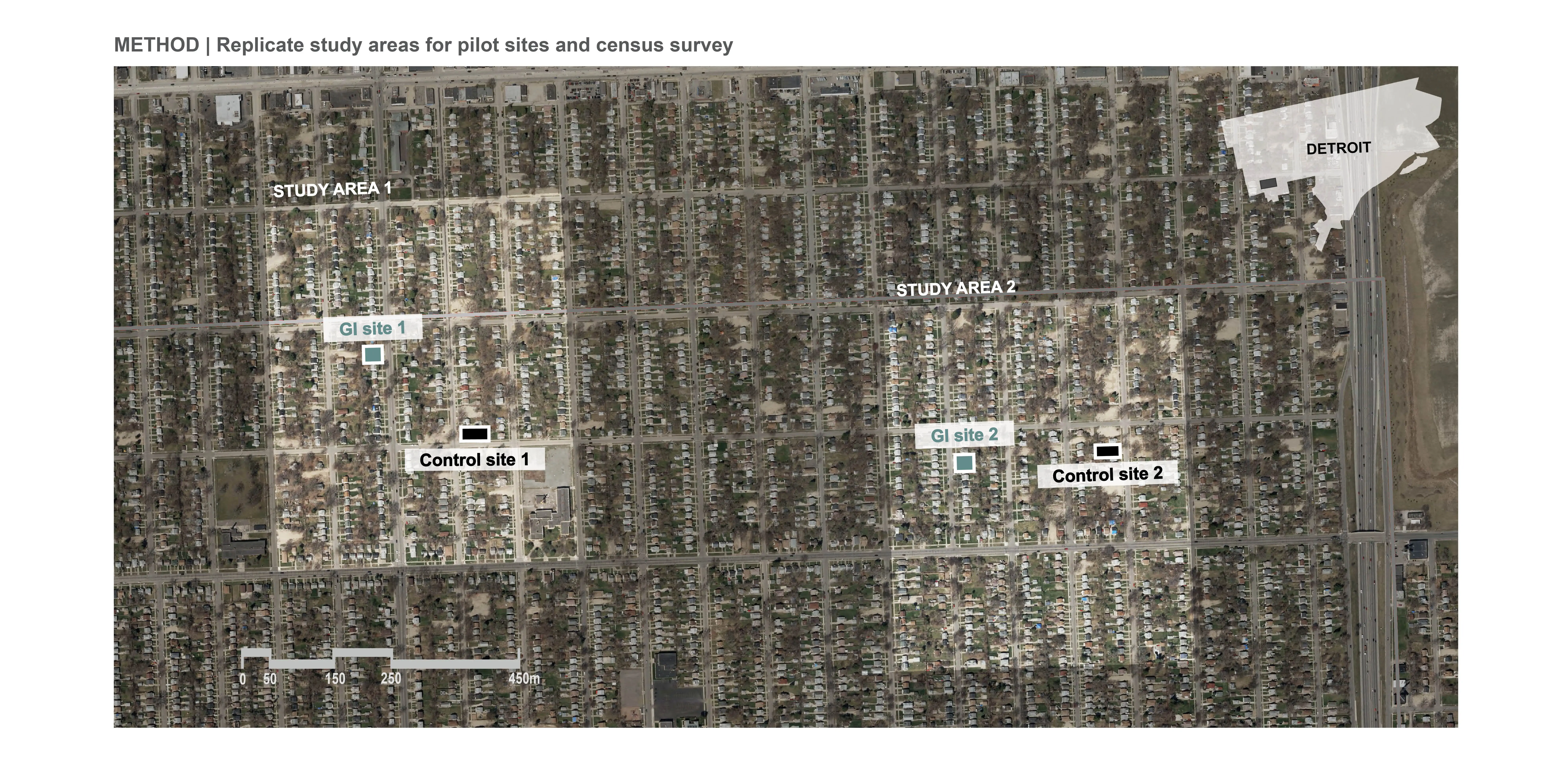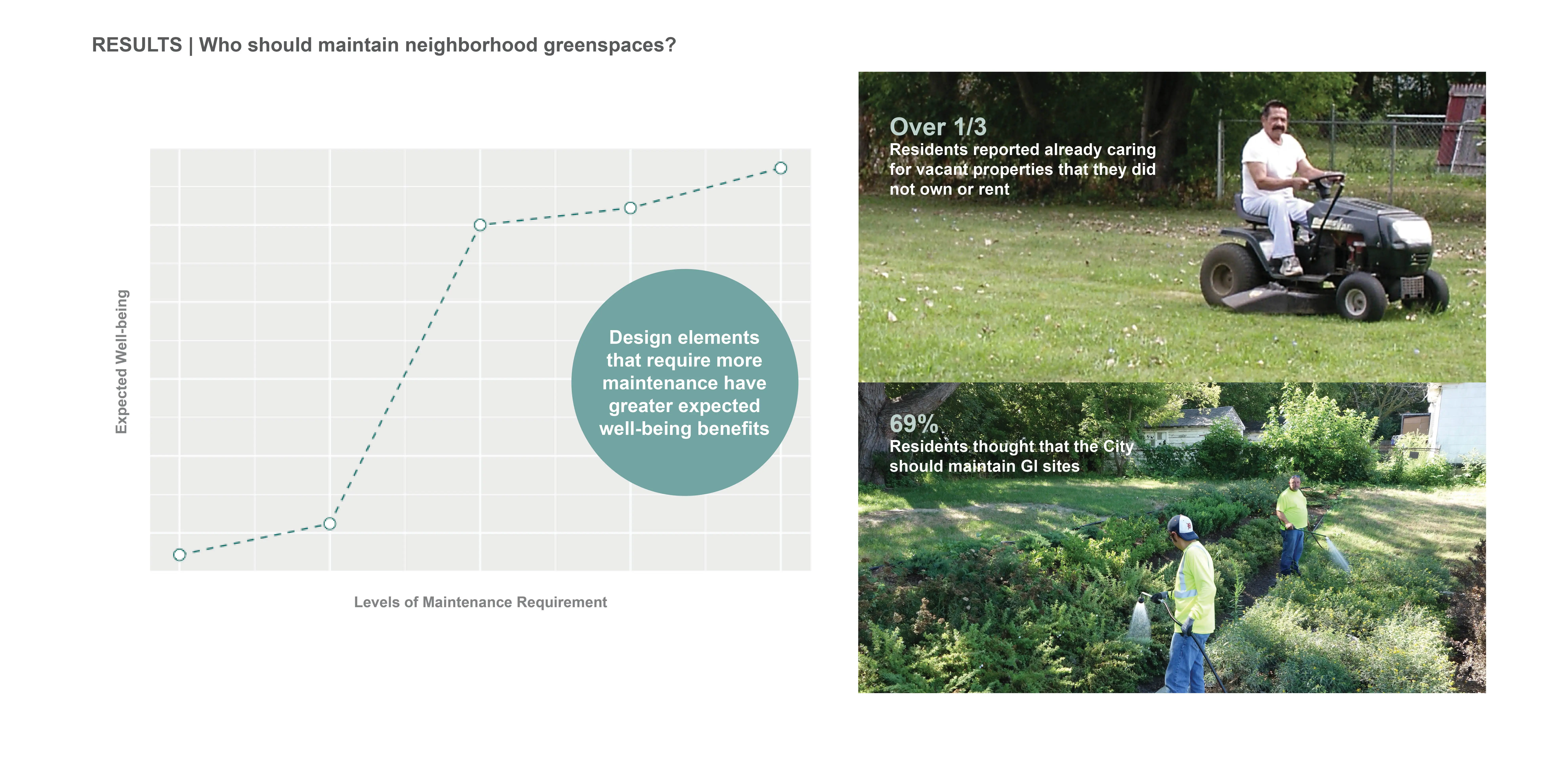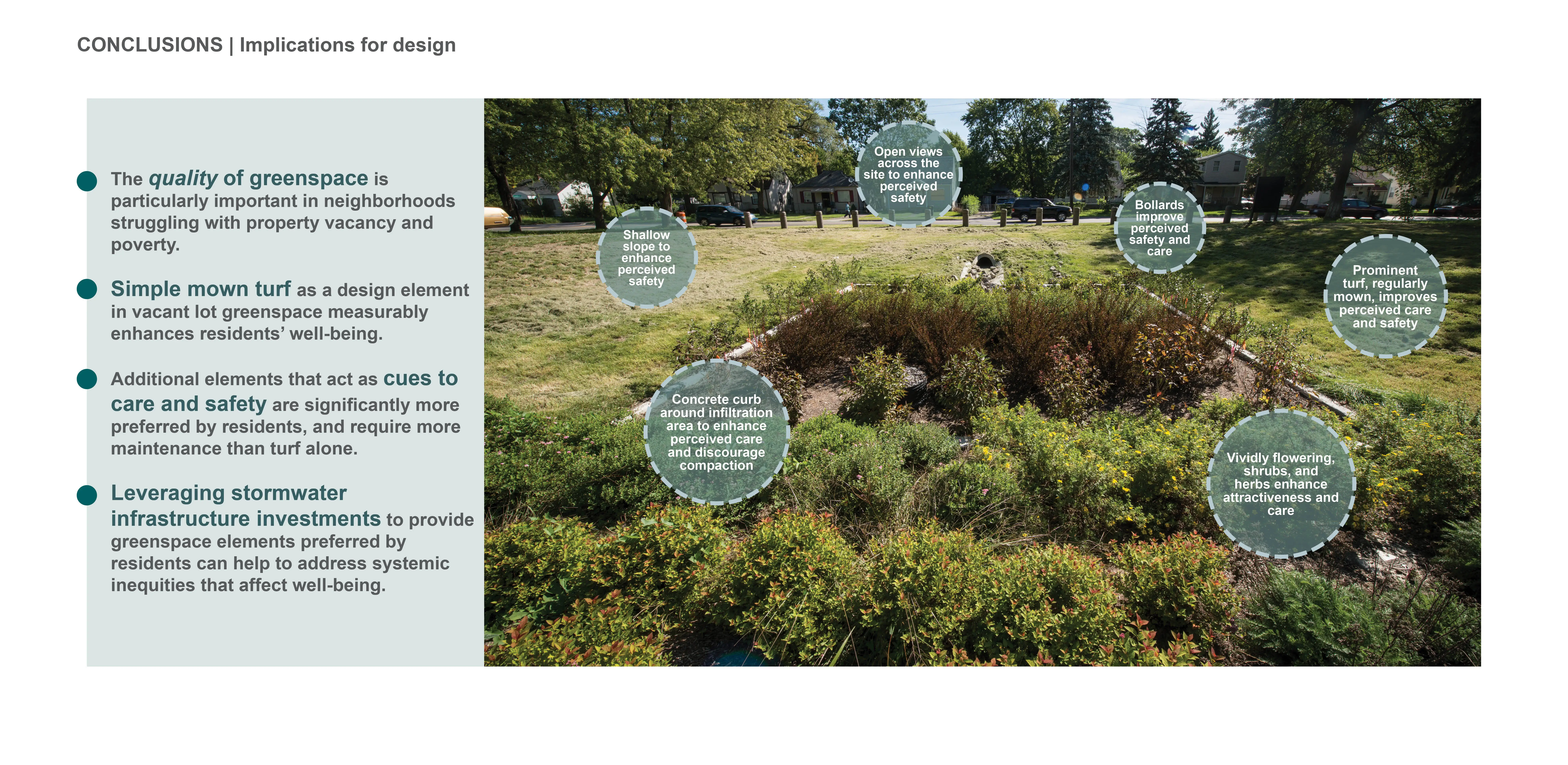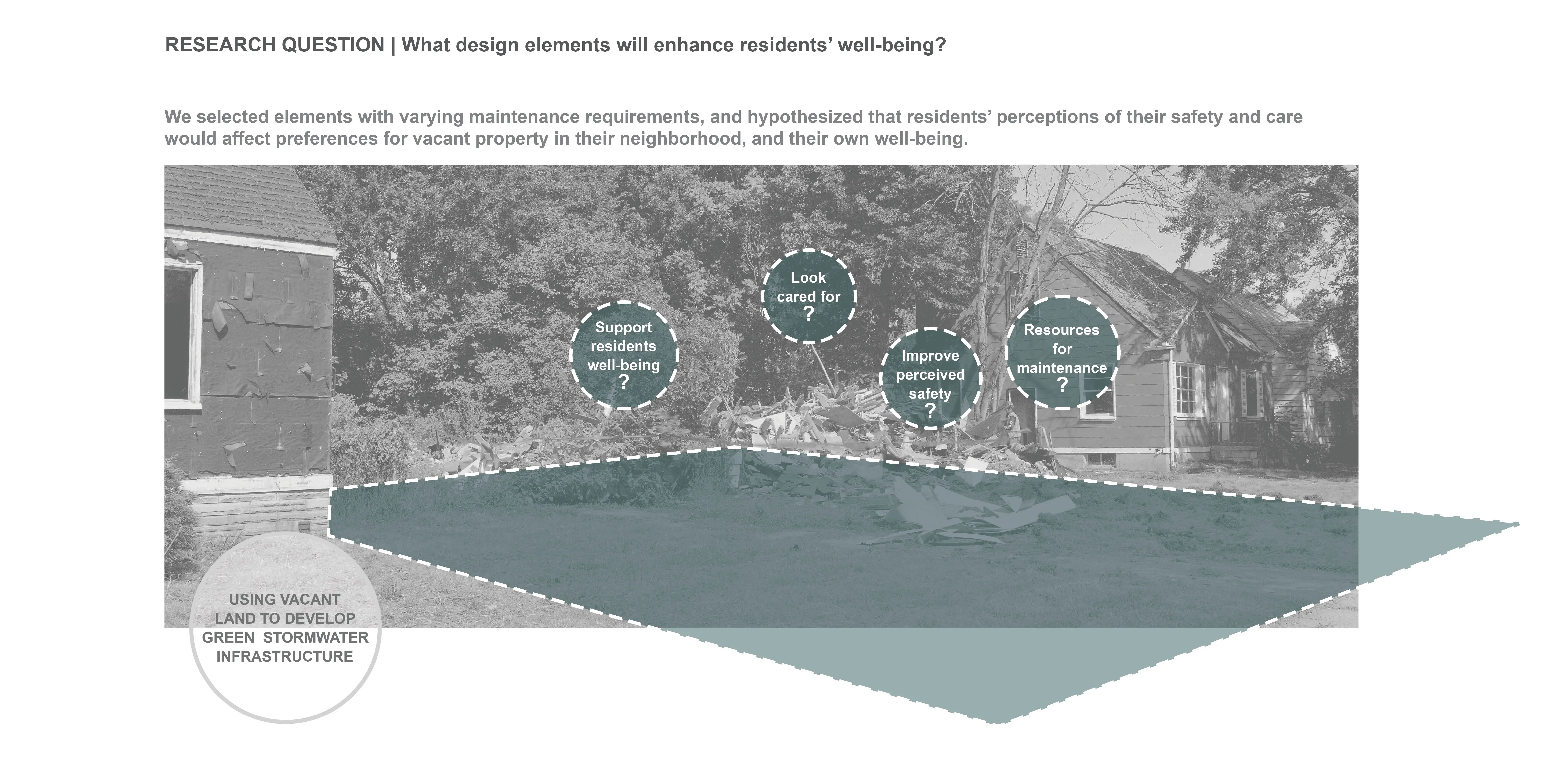 Importance of Research Goals Our overarching goal was to inform design strategies that can address inequities in the quality of neighborhood greenspace, especially where property vacancies and inadequate maintenance have changed neighborhood landscapes in legacy cities. Quality of greenspace may affect the well-being of residents. Well-being is known to be associated with access to greenspace, and inequitable greenspace distribution is understood to be a driver of health disparities. However, health disparities research has not focused on greenspace quality: the small scale design elements that landscape architects routinely select. This is particularly important in neighborhoods characterized by widespread property vacancy, which undermines perceptions of safety and care. Neighborhood greenspace quality affects residents’ experiences as they look out the windows of their home, use their yard, or walk down their block. Compared with access to large public greenspaces, these experiences more immediately confront residents with glaring disparities between their neighborhoods and others’. This project built new knowledge to help landscape architects meaningfully contribute to resolving these inequities. Research Problem Our research problem was to identify how much small-scale design elements of neighborhood greenspace that presented different maintenance requirements could enhance residents’ well-being. Framing the problem in this way, we could focus on well-being of residents while also tuning results to address maintenance challenges of legacy cities. We conceived of this problem on two complementary levels, both essential to the rigor of this actionable research: 1. Basis in practical understandings and local knowledge: a transdisciplinary action research process that produced immediate change in a disadvantaged neighborhood. This required intensive iterative collaboration among agencies, NGOs, neighborhood residents and an interdisciplinary research team over seven years. It led us to understand that neighborhood greenspaces in legacy cities should be maintained by agency staff rather than relying on volunteers. Accepting the limited revenues of legacy cities, we framed our research questions around design alternatives that offered a range of maintenance efficiencies. 2. Basis in scholarly theory: testing the effects of landscape design elements on residents’ well-being in a replicable way that was informed by thorough review of the scholarly literature about well-being, preferences, and perceptions of neighborhood greenspace. Related to well-being, we identified a need to understand how small scale landscape elements might affect residents’ mental and emotional health, as well as their social and physical behavior that may affect health. Related to perceived care and safety, ample scholarly literature suggests that perceived care and safety of neighborhood greenspace affects well-being of residents of legacy cities, and many studies identify design elements that act as cues to care or safety. However, there is a need to put the pieces together to address inequity in neighborhood greenspaces - experimentally varying design elements to quantify their relationship to preferences, perceptions, and well-being. Research Questions Drawing on knowledge at both levels, we identified these design elements for investigation as cues to care or safety that could affect well-being: bollards, low-growing vividly flowering shrubs and herbs, deciduous trees in rows, mown turf. We operationalized the research problem with these specific questions: • What combinations of these elements do residents most prefer for a nearby vacant lot? • How does perceived safety, care, and attractiveness affect what residents prefer? • How do residents expect different alternatives to affect their well-being, including mental or emotional health, interactions with neighbors, and likelihood to walk in their neighborhood? • Considering the need to minimize maintenance requirements, which elements are essential to enhanced well-being? Which most greatly enhance well-being? Methods Study area and site selection. In an area that the Detroit Water and Sewerage Department (DWSD) had prioritized for GSI implementation, we selected replicate study areas separated by more than 2415 m to reduce spillover effects across study areas. Each study area had a mix of occupied homes and vacant properties; overall vacancy was 39%. Each had majority black populations and a majority of households with incomes below $25,000/year (poverty level as per the US Department of Health and Human Services). Within each study area our team identified potential sites for GSI construction on vacant properties owned by the Detroit Land Bank Authority (DLBA), and a control vacant lot for “typical” management. As part of site selection, the possibility of constructing GSI on each site was vetted with nearby neighbors. Then, in 2015 our team designed and constructed two different GSI designs on two pilot sites operated by the DWSD in each study area. These pilot sites were the base sites for design alternatives tested in the 2017 census survey that we report upon here. Development of questionnaire and design alternatives. To answer our research questions, we developed a questionnaire including visualizations of 10 design alternatives (randomly selected from among 15 developed for each study area), and items related to perceived care, safety, well-being, and residents’ preferences for converting nearby vacant lots to neighborhood greenspace. The visualizations represented a factorial combination of the design elements we hypothesized to affect these outcomes. Based on insights of residents on our transdisciplinary team, we designed all alternatives to have open sight lines from the street and to discourage public entry. Census Survey. We conducted a census interview survey of all occupied households within 250m of the pilot sites in 20