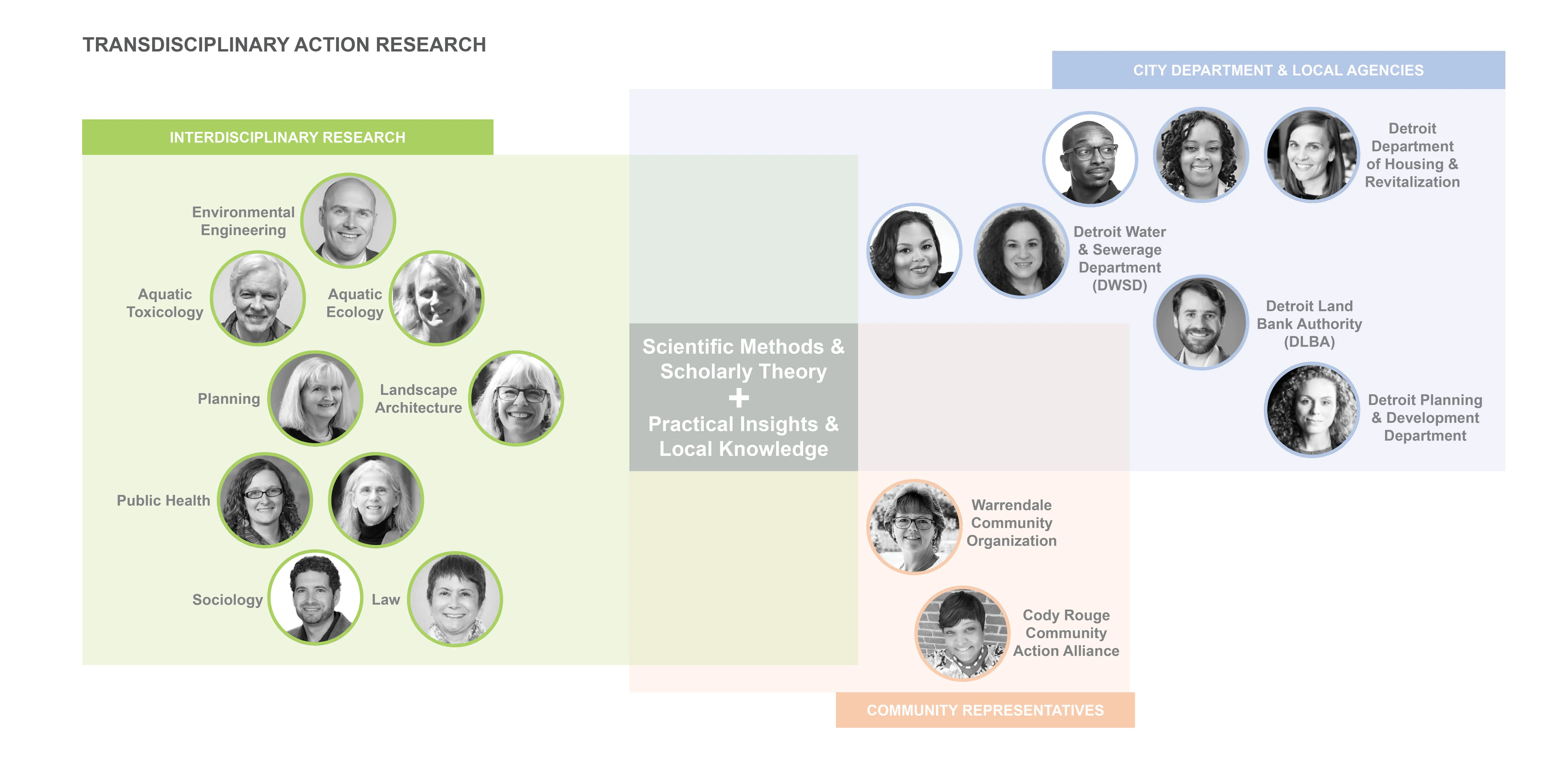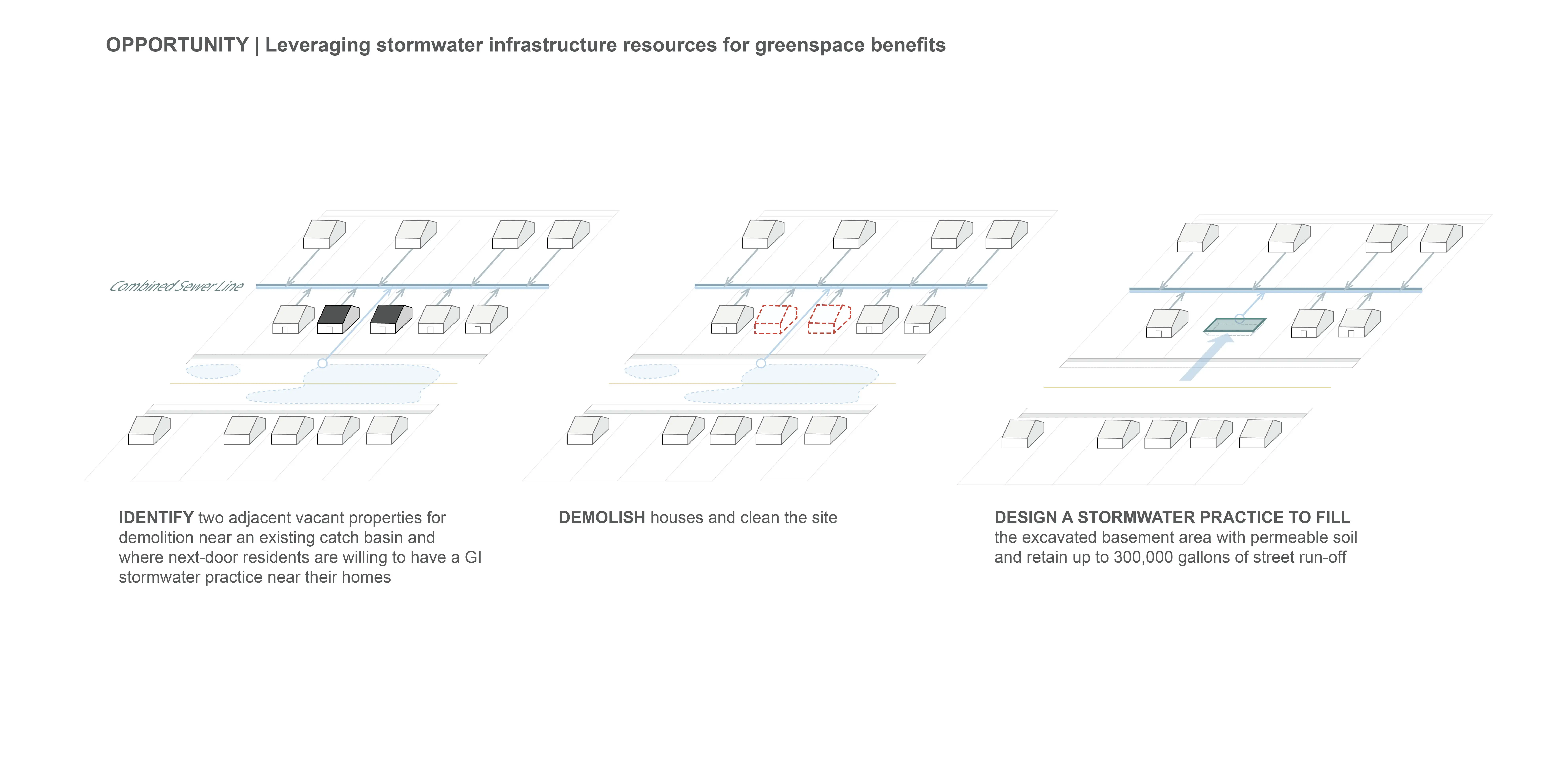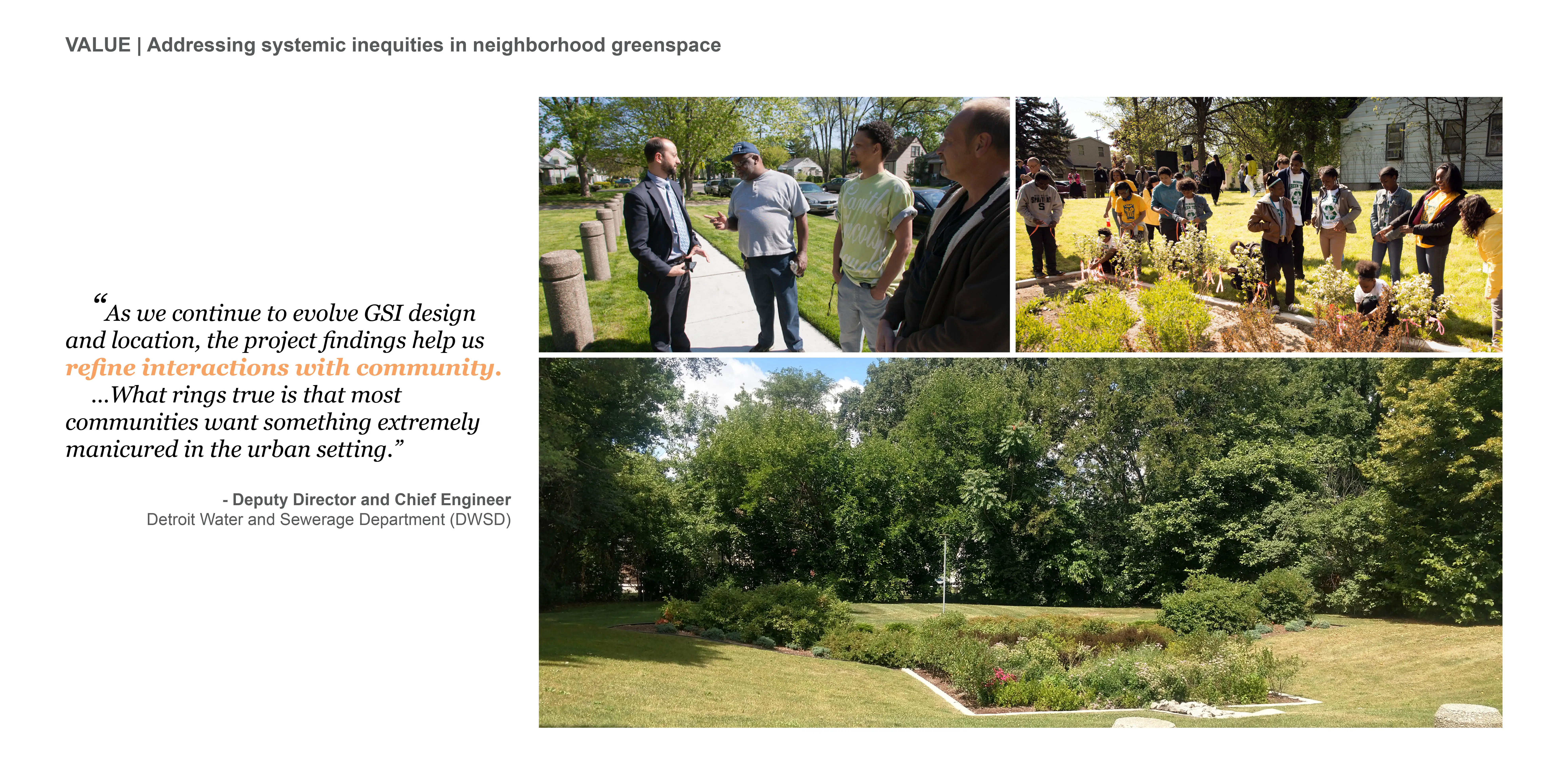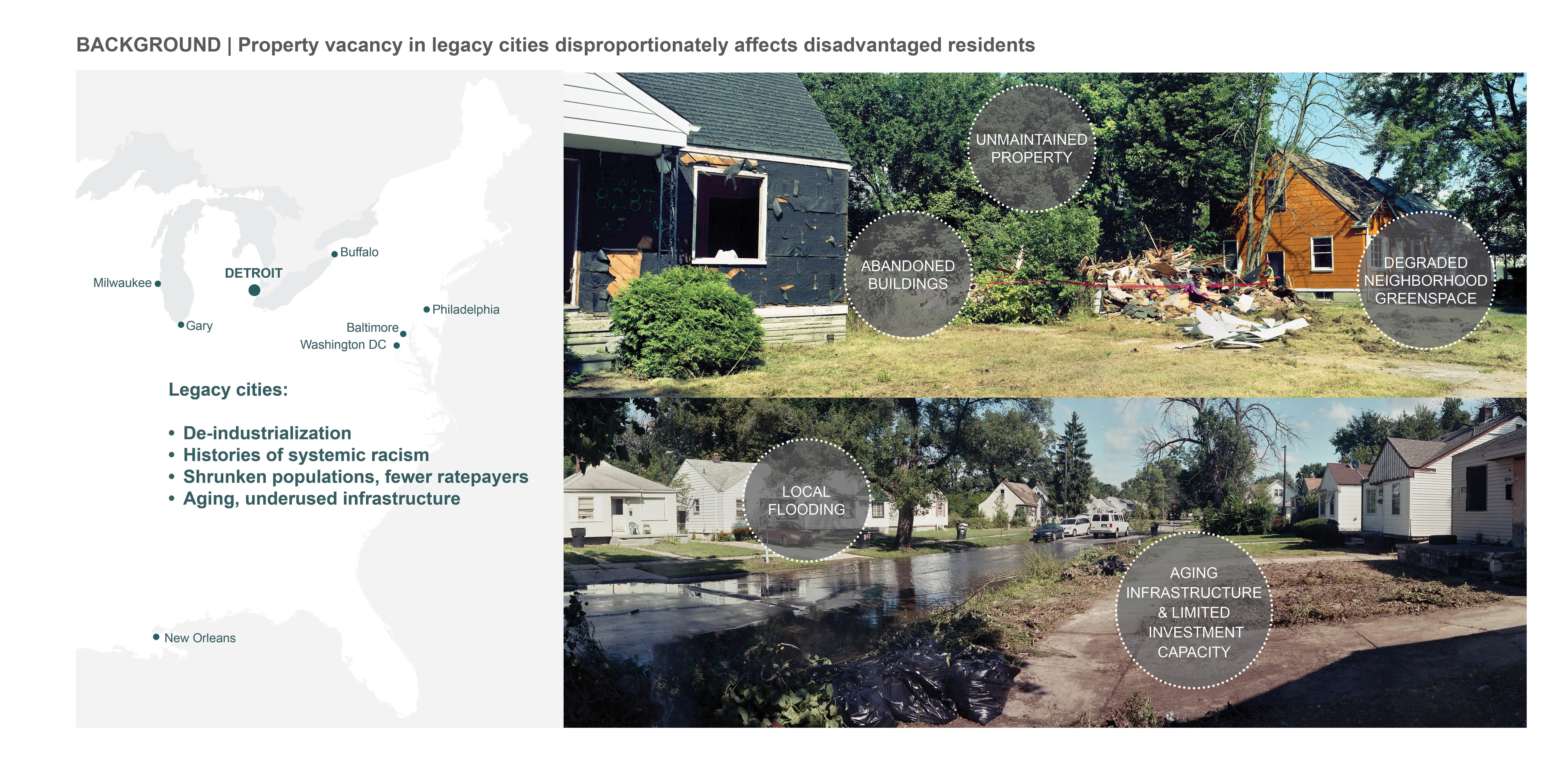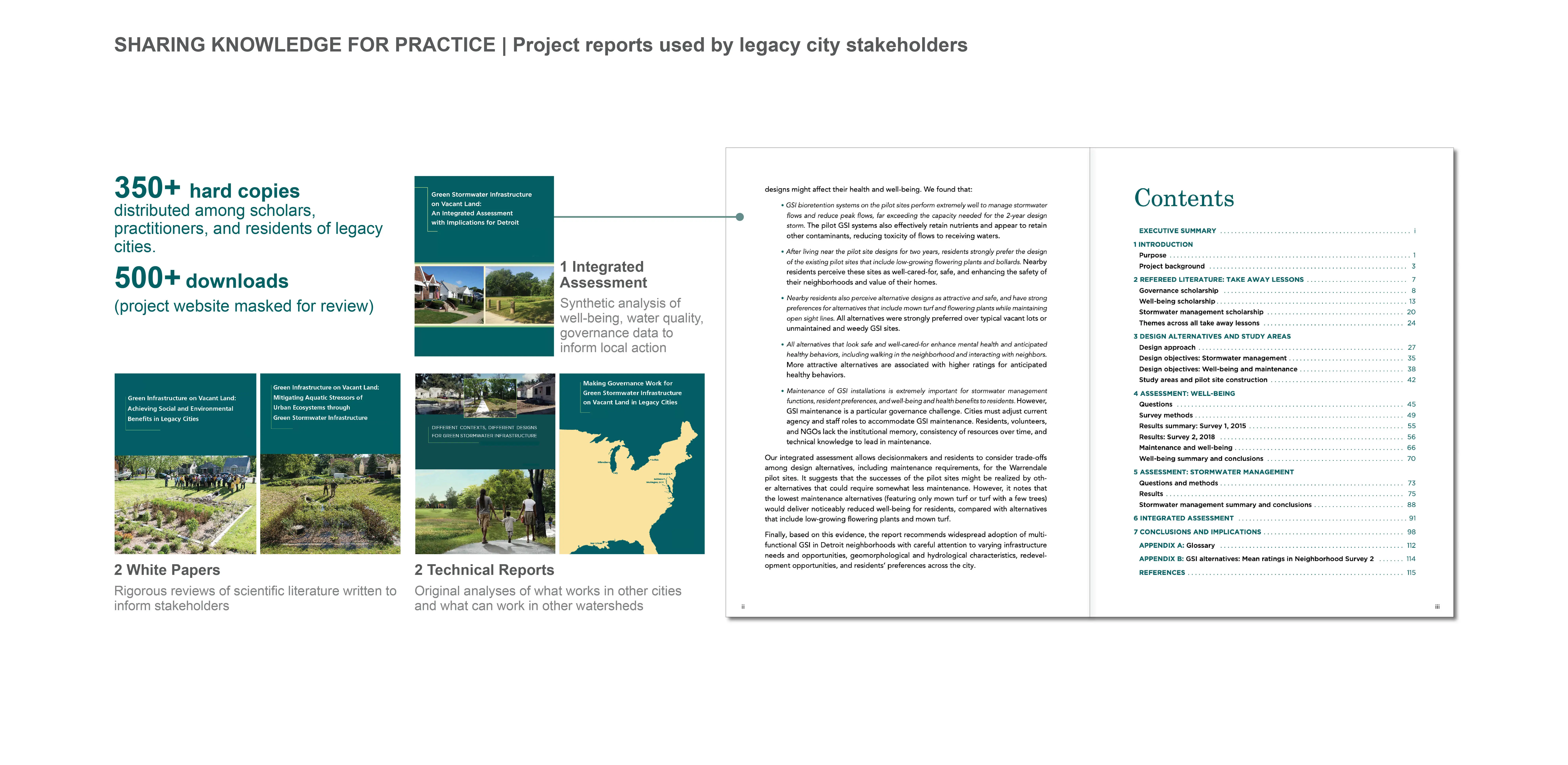 Importance of Research Goals Our overarching goal was to inform design strategies that can address inequities in the quality of neighborhood greenspace, especially where property vacancies and inadequate maintenance have changed neighborhood landscapes in legacy cities. Quality of greenspace may affect the well-being of residents. Well-being is known to be associated with access to greenspace, and inequitable greenspace distribution is understood to be a driver of health disparities. However, health disparities research has not focused on greenspace quality: the small scale design elements that landscape architects routinely select. This is particularly important in neighborhoods characterized by widespread property vacancy, which undermines perceptions of safety and care. Neighborhood greenspace quality affects residents’ experiences as they look out the windows of their home, use their yard, or walk down their block. Compared with access to large public greenspaces, these experiences more immediately confront residents with glaring disparities between their neighborhoods and others’. This project built new knowledge to help landscape architects meaningfully contribute to resolving these inequities. Research Problem Our research problem was to identify how much small-scale design elements of neighborhood greenspace that presented different maintenance requirements could enhance residents’ well-being. Framing the problem in this way, we could focus on well-being of residents while also tuning results to address maintenance challenges of legacy cities. We conceived of this problem on two complementary levels, both essential to the rigor of this actionable research: 1. Basis in practical understandings and local knowledge: a transdisciplinary action research process that produced immediate change in a disadvantaged neighborhood. This required intensive iterative collaboration among agencies, NGOs, neighborhood residents and an interdisciplinary research team over seven years. It led us to understand that neighborhood greenspaces in legacy cities should be maintained by agency staff rather than relying on volunteers. Accepting the limited revenues of legacy cities, we framed our research questions around design alternatives that offered a range of maintenance efficiencies. 2. Basis in scholarly theory: testing the effects of landscape design elements on residents’ well-being in a replicable way that was informed by thorough review of the scholarly literature about well-being, preferences, and perceptions of neighborhood greenspace. Related to well-being, we identified a need to understand how small scale landscape elements might affect residents’ mental and emotional health, as well as their social and physical behavior that may affect health. Related to perceived care and safety, ample scholarly literature suggests that perceived care and safety of neighborhood greenspace affects well-being of residents of legacy cities, and many studies identify design elements that act as cues to care or safety. However, there is a need to put the pieces together to address inequity in neighborhood greenspaces - experimentally varying design elements to quantify their relationship to preferences, perceptions, and well-being. Research Questions Drawing on knowledge at both levels, we identified these design elements for investigation as cues to care or safety that could affect well-being: bollards, low-growing vividly flowering shrubs and herbs, deciduous trees in rows, mown turf. We operationalized the research problem with these specific questions: • What combinations of these elements do residents most prefer for a nearby vacant lot? • How does perceived safety, care, and attractiveness affect what residents prefer? • How do residents expect different alternatives to affect their well-being, including mental or emotional health, interactions with neighbors, and likelihood to walk in their neighborhood? • Considering the need to minimize maintenance requirements, which elements are essential to enhanced well-being? Which most greatly enhance well-being? Methods Study area and site selection. In an area that the Detroit Water and Sewerage Department (DWSD) had prioritized for GSI implementation, we selected replicate study areas separated by more than 2415 m to reduce spillover effects across study areas. Each study area had a mix of occupied homes and vacant properties; overall vacancy was 39%. Each had majority black populations and a majority of households with incomes below $25,000/year (poverty level as per the US Department of Health and Human Services). Within each study area our team identified potential sites for GSI construction on vacant properties owned by the Detroit Land Bank Authority (DLBA), and a control vacant lot for “typical” management. As part of site selection, the possibility of constructing GSI on each site was vetted with nearby neighbors. Then, in 2015 our team designed and constructed two different GSI designs on two pilot sites operated by the DWSD in each study area. These pilot sites were the base sites for design alternatives tested in the 2017 census survey that we report upon here. Development of questionnaire and design alternatives. To answer our research questions, we developed a questionnaire including visualizations of 10 design alternatives (randomly selected from among 15 developed for each study area), and items related to perceived care, safety, well-being, and residents’ preferences for converting nearby vacant lots to neighborhood greenspace. The visualizations represented a factorial combination of the design elements we hypothesized to affect these outcomes. Based on insights of residents on our transdisciplinary team, we designed all alternatives to have open sight lines from the street and to discourage public entry. Census Survey. We conducted a census interview survey of all occupied households within 250m of the pilot sites in 20
