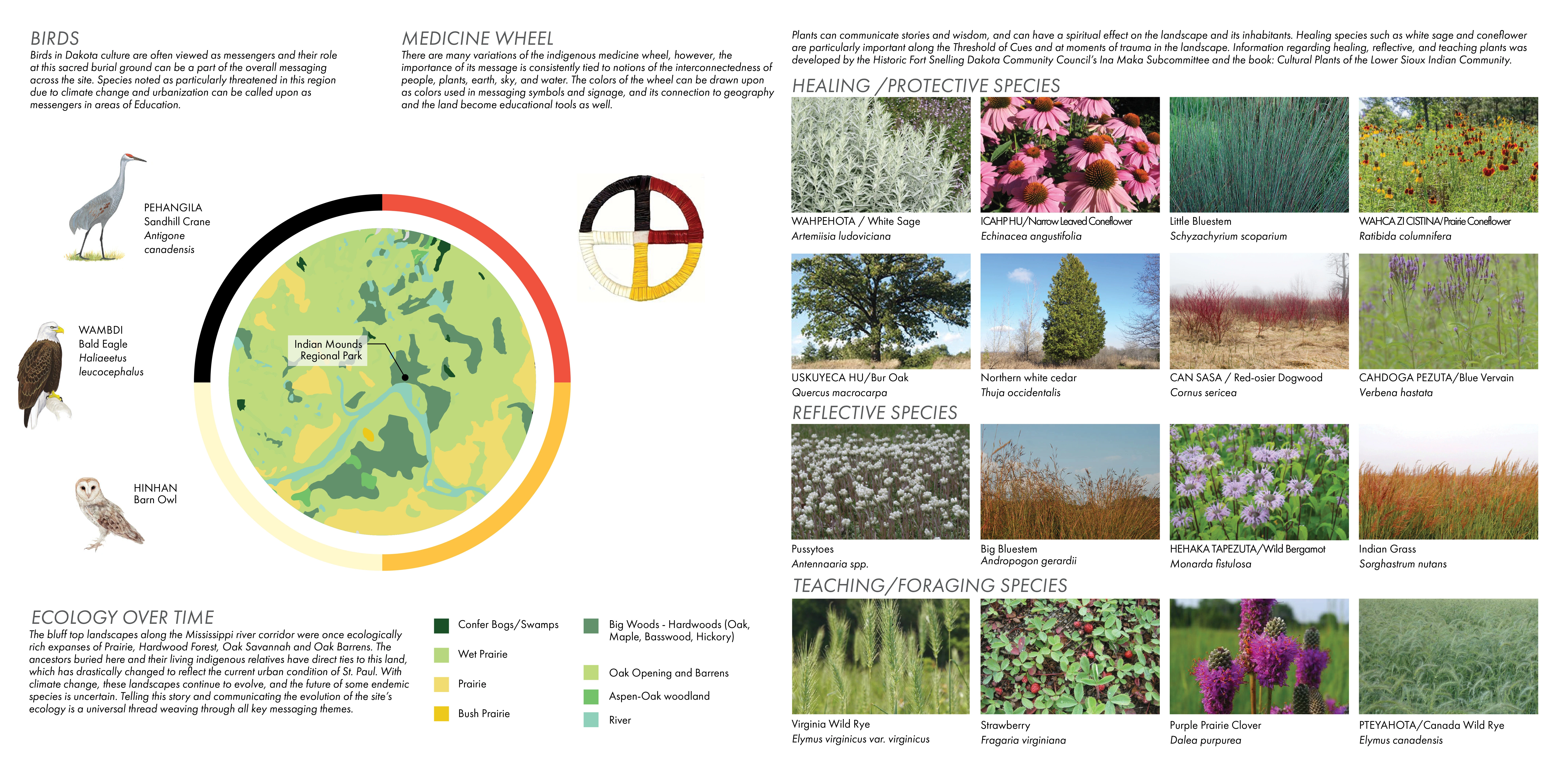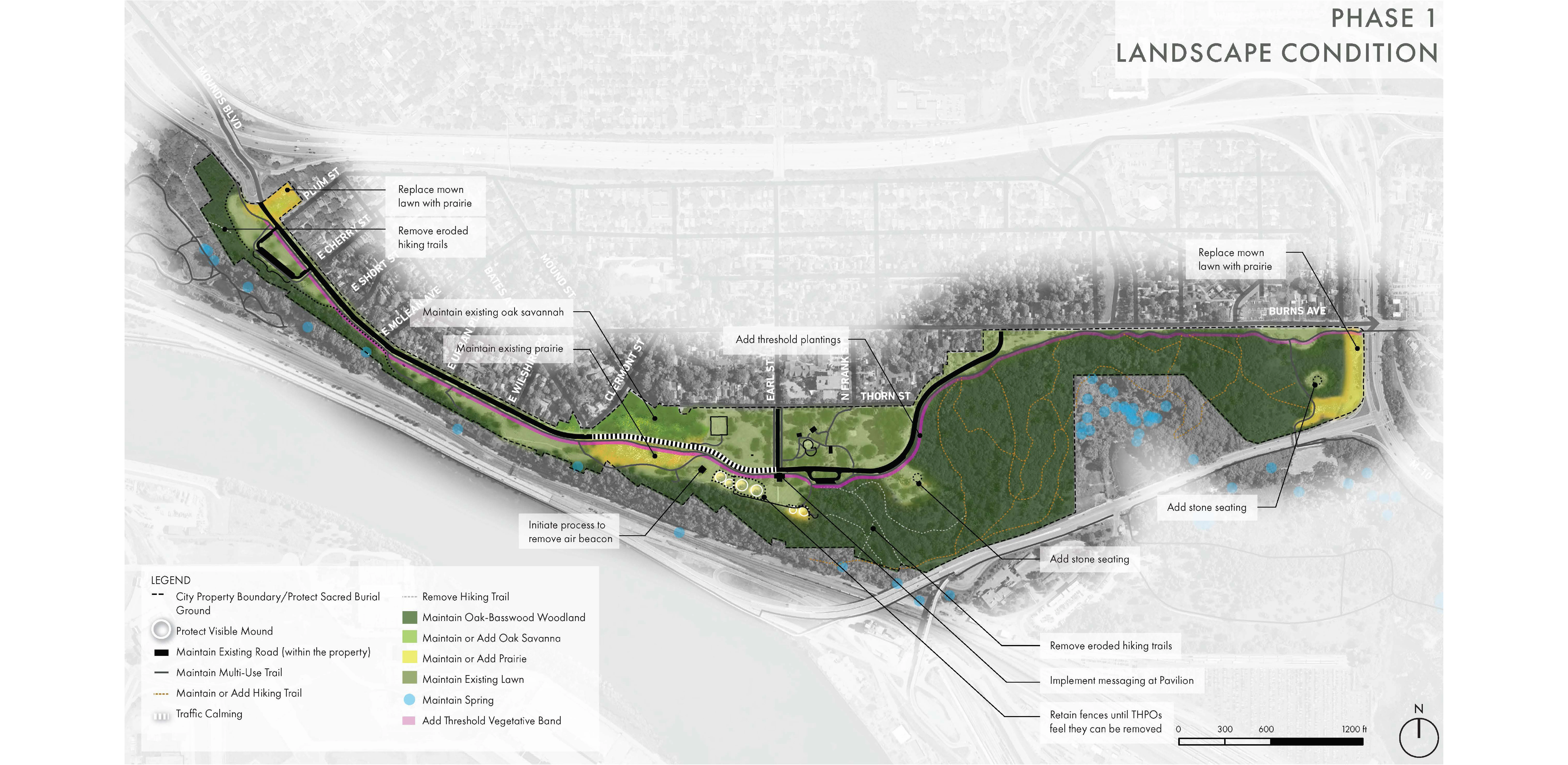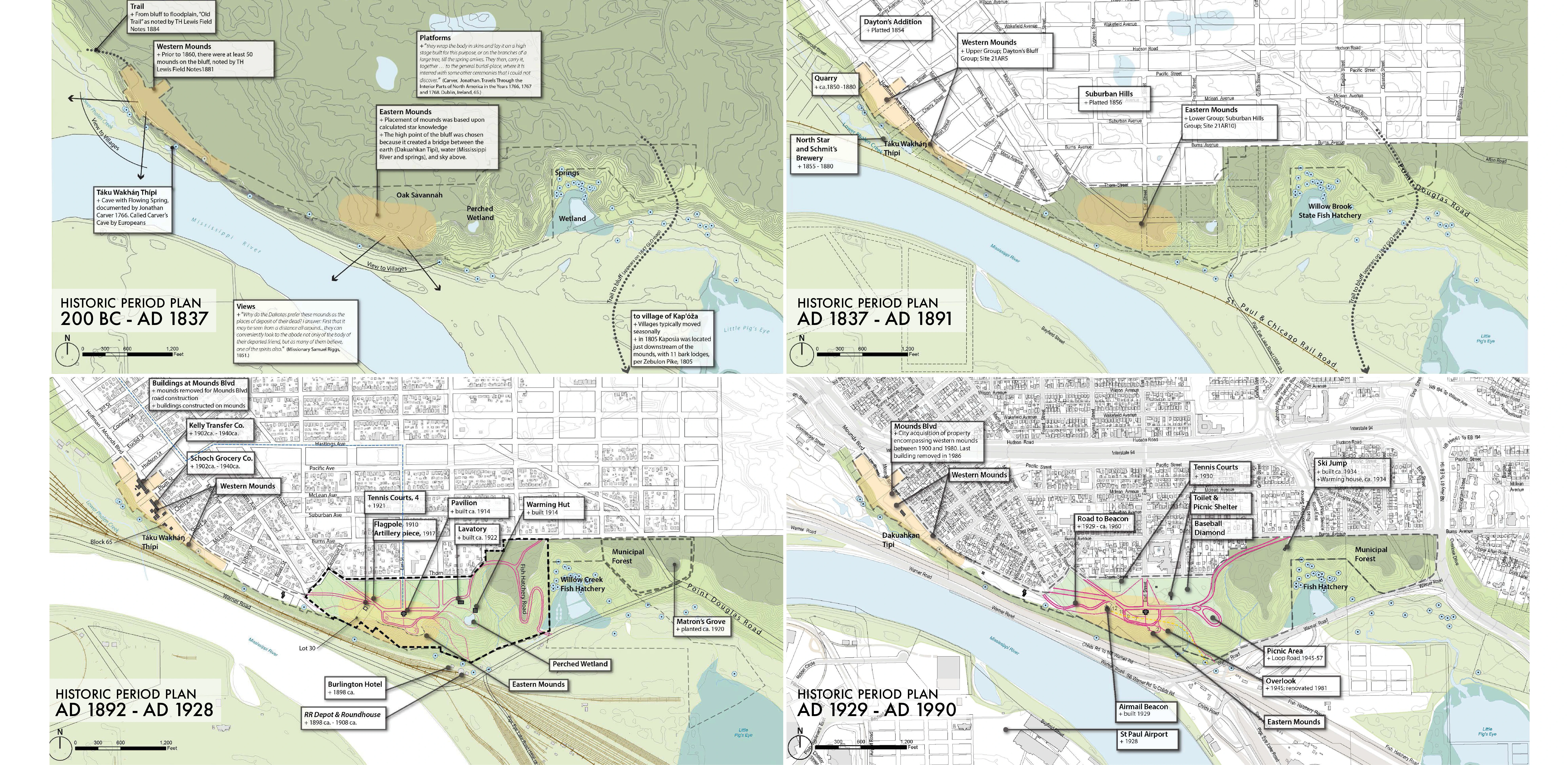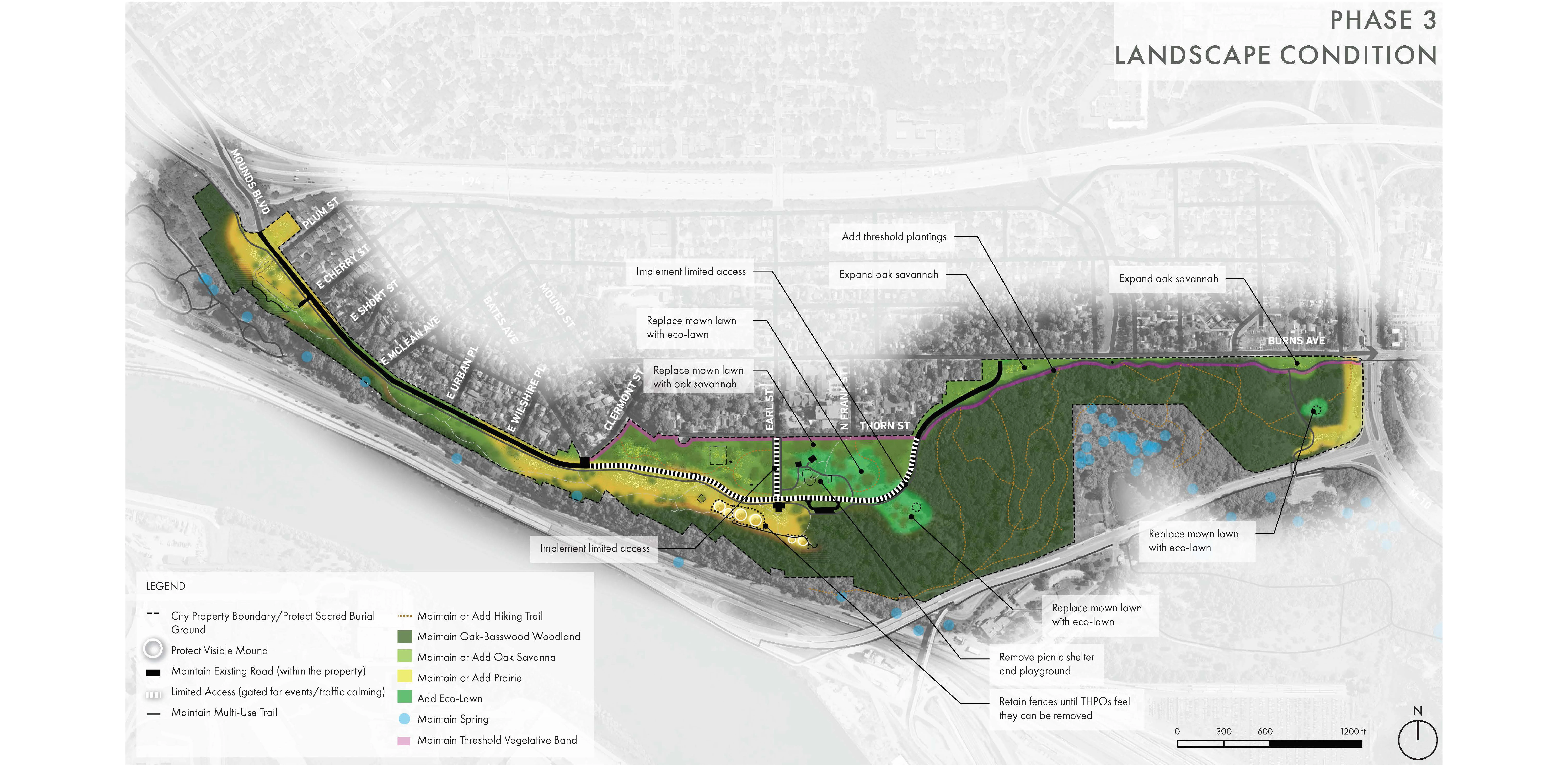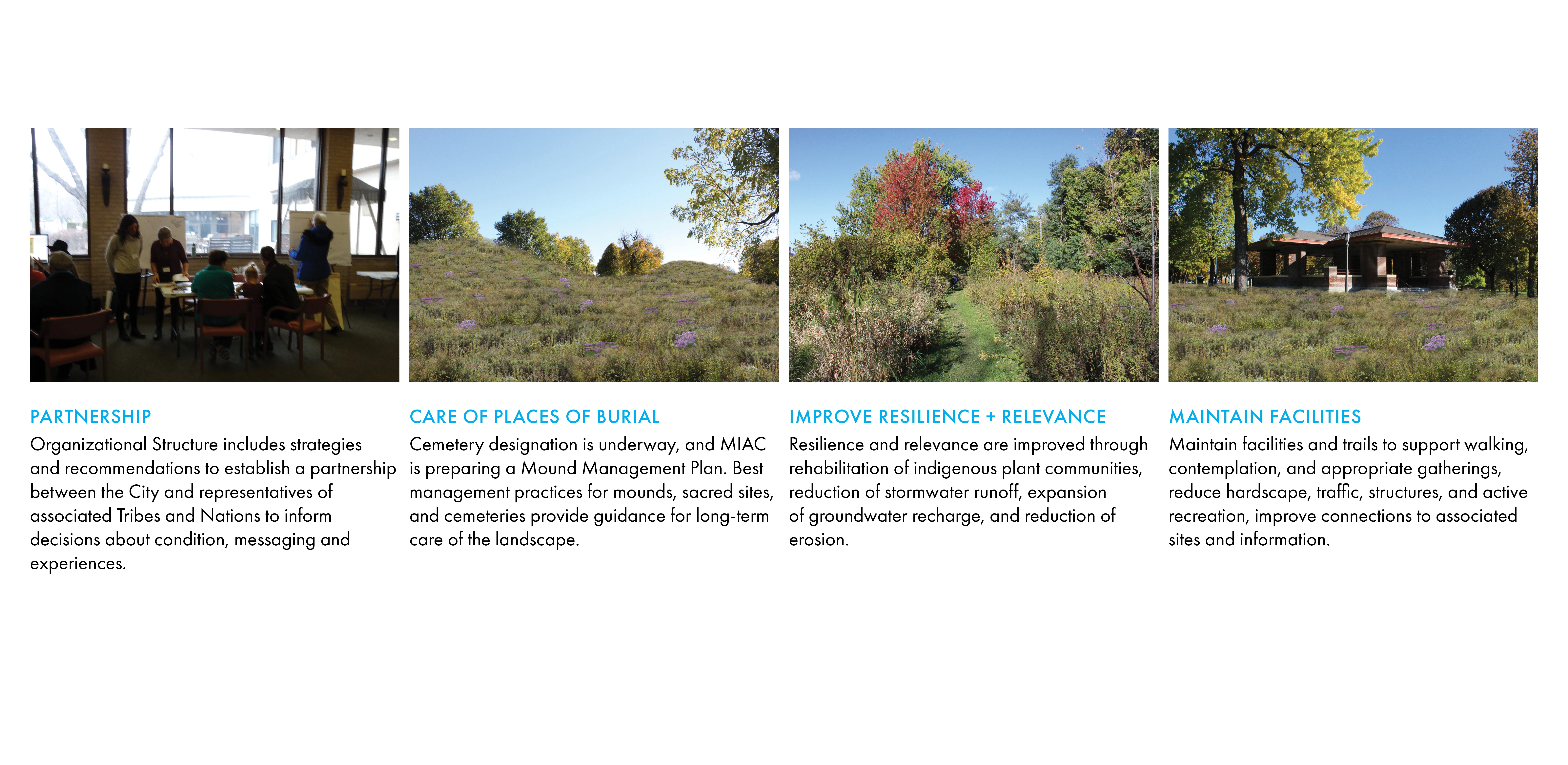 INTRODUCTION The Cultural Landscape Study and Messaging Plan presents an inspirational and holistic guide to gradually replace recreational features and activities with preservation of the burial ground, expansion of native plants, messaging acknowledging the sacred site, and removal of impacting elements. The transformed landscape will support use for contemplation, prayer, and connections, for people to whom it is sacred. Landscape interventions and messaging strategies were created through an iterative and collaborative process with the Tribal Historic Preservation Officers (THPOs), the Project Advisory Team (PAT), the community, and the City of St. Paul Parks and Recreation Department. Direct engagement and consultation with the THPOs from the Upper Sioux Community, Lower Sioux Community, Shakopee Mdewakanton Sioux, Prairie Island Indian Community, and The Ho-Chunk Nation of Wisconsin, the Iowa Tribe of Kansas and Nebraska, and the Sisseton-Wahpeton Oyate—was essential to the process. The project 1. Establishes a platform for inclusion of Indigenous communities in decision-making about sites that are significant to them. 2. Documents the historic development and use of the landscape and conducted thorough site analysis and assessment of historic significance and integrity. 3. Recommends long-term condition of the landscape informed by guidance from associated Indigenous communities. 4. Presents messaging strategies to acknowledge and help people understand this is a sacred place of burial. THIS PLACE IS NOT A PARK The Indigenous burial ground that is currently called “Indian Mounds Regional Park” has been a sacred burial ground for over a thousand years. It is significant to living Indigenous Peoples as a cemetery where their ancestors are buried. It is a place of reverence, remembrance, respect, and prayer. When the City of Saint Paul established a park in this location in 1892 with the purpose of protecting the historical setting and spectacular views, connections of contemporaneous Indigenous Peoples to the sacred site were not understood, considered, or valued. Over the last century the condition, name, and use of the landscape as a park have become beloved to the surrounding community. Yet many non-Indigenous people have wondered about this powerful landscape without understanding its importance to tribes. Through public gatherings with generous sharing by tribal representatives and members of the public, we learned that the power of this place affects the people who interact with it, and there is a strong desire to protect it as a sacred site. CULTURAL LANDSCAPE APPROACH The Landscape Architects applied a cultural landscape approach to the study. This began by facilitating a collaborative process including diverse stakeholders to develop a vision and goals for the project. We paid careful attention to building a strong relationship between the people culturally connected to the landscape and the city who maintains it. We listened to the people whose passionate connections to this place provide the basis of its significance; and to the landscape itself that exudes a spiritual sense of place. The sacredness of this place is communicated through a variety of changes to the landscape and sharing of messages that aim to build respect and restore dignity. Historical research utilized primary and secondary sources to develop a rich account of physical change in the landscape beginning with its geological formation through its current condition. The report includes a detailed chapter recounting the history of the site, with diagrams illustrating landscape conditions at key time periods. The tradition of mound building in Minnesota was initiated during a time when people became less mobile and larger communities came together to live in semi-permanent camps. People continued hunting and gathering and supplemented this with harvesting wild rice and gardening more intensively. Burial mounds were often located on elevated bluffs near major bodies of water, while villages were often located to provide access to wild rice. The Mississippi River valley was a regional center where people came together for ceremonies and events to reinforce communal ties and forge alliances. Interviews and collaboration with descendant American Indians contributed a broad understanding of the meaning of the landscape to their communities today. Representatives of the associated communities were included throughout the project process to ensure their cultural perspectives informed recommendations. A thorough analysis of integrity was conducted based on federal guidelines for cultural landscapes. The site is part of Mni Sota Makoce, Dakota homeland, and Bdote, the area surrounding the confluence of the Mississippi and Minnesota Rivers that is significant to many Dakota people as a place of origination, where the Dakota emerged. Dakota individuals come to the site to pray. The VISION for acknowledgement, care, and use of the site, is informed by, and respectful of, it as a sacred place. The VISION is guided by Mitákuye Ows’in, reflecting the interconnectedness of people, land, water, sky, animals, and plants, to provide a place for reverence, remembrance, and healing in a way that protects, honors, and acknowledges the sacred place of burial. Goals focus on protection of the sacred site; identification and preservation or restoration of important characteristics; guidance toward the desired condition of the mounds; increased understanding and respect of the sacred burial ground, relatives, and ancestors who are here; identification of appropriate experiences; and establishment of a partnership between the city and tribes to guide use and care of the site. TREATMENT + MESSAGING The treatment identifies strategies addressing partnership, experience, messaging, and condition, to ensure that the Vision is consistently applied across the site. The integration of native and culturally significant plants, physic