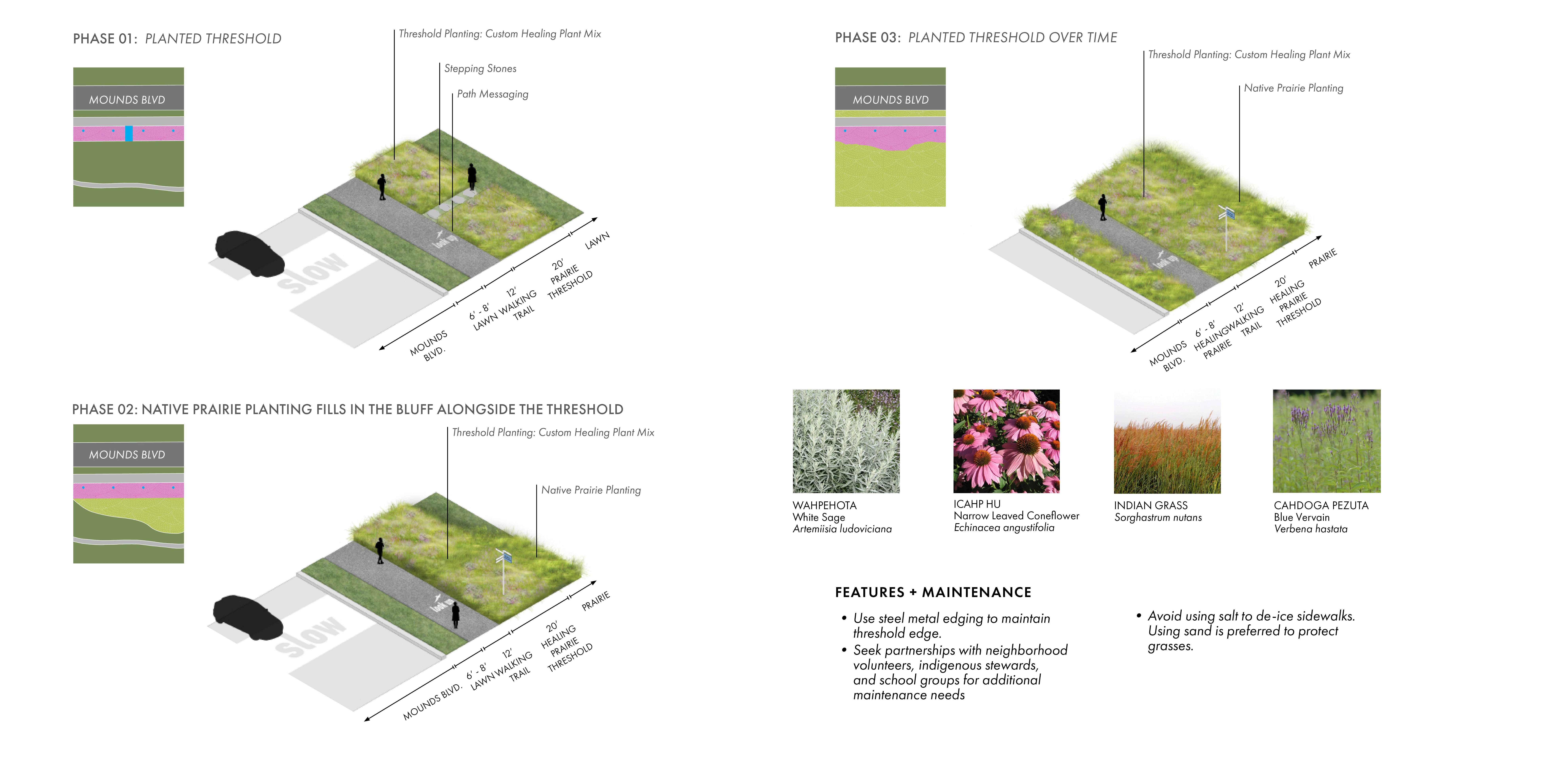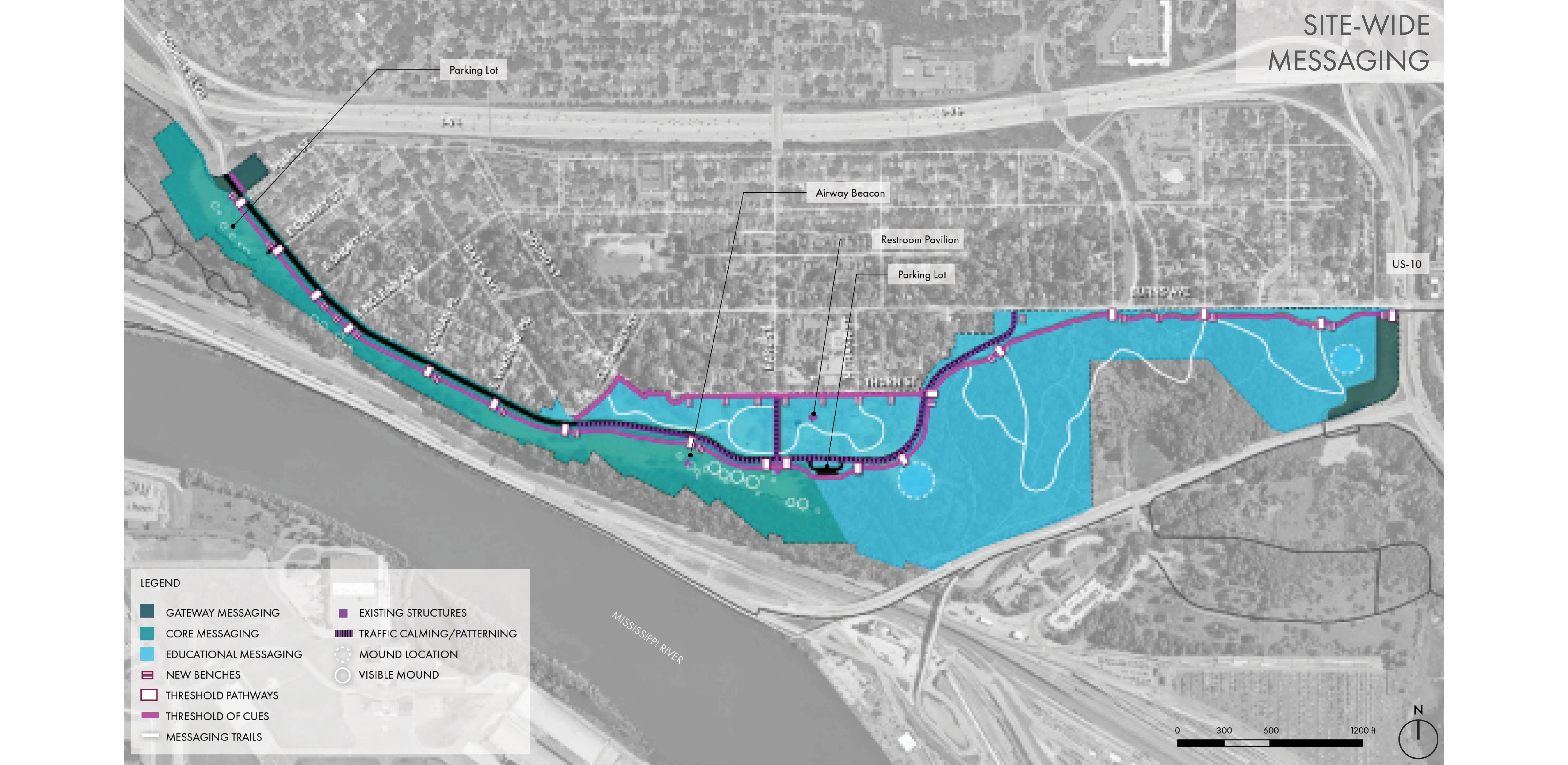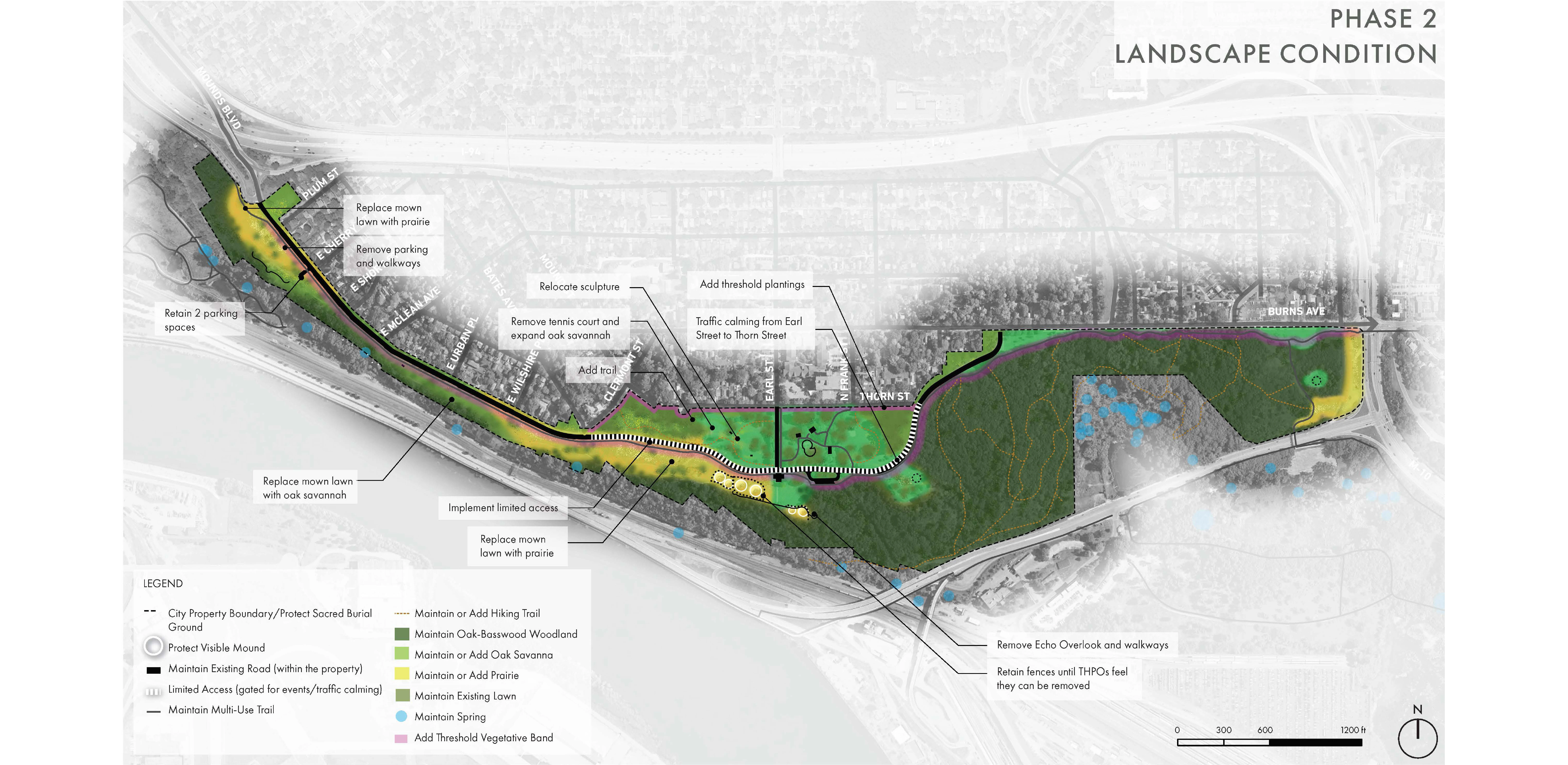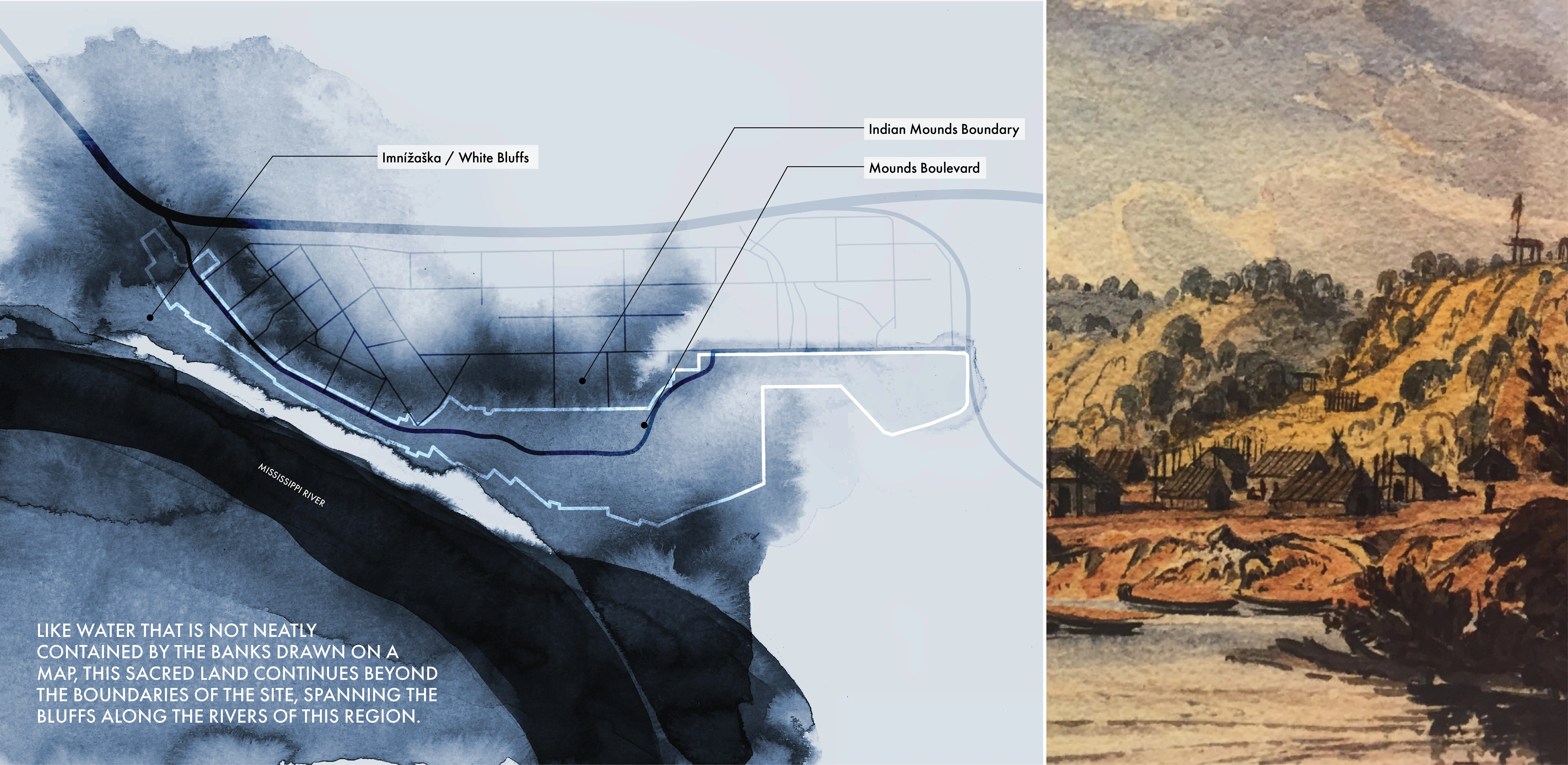 INTRODUCTION The Cultural Landscape Study and Messaging Plan presents an inspirational and holistic guide to gradually replace recreational features and activities with preservation of the burial ground, expansion of native plants, messaging acknowledging the sacred site, and removal of impacting elements. The transformed landscape will support use for contemplation, prayer, and connections, for people to whom it is sacred. Landscape interventions and messaging strategies were created through an iterative and collaborative process with the Tribal Historic Preservation Officers (THPOs), the Project Advisory Team (PAT), the community, and the City of St. Paul Parks and Recreation Department. Direct engagement and consultation with the THPOs from the Upper Sioux Community, Lower Sioux Community, Shakopee Mdewakanton Sioux, Prairie Island Indian Community, and The Ho-Chunk Nation of Wisconsin, the Iowa Tribe of Kansas and Nebraska, and the Sisseton-Wahpeton Oyate—was essential to the process. The project 1. Establishes a platform for inclusion of Indigenous communities in decision-making about sites that are significant to them. 2. Documents the historic development and use of the landscape and conducted thorough site analysis and assessment of historic significance and integrity. 3. Recommends long-term condition of the landscape informed by guidance from associated Indigenous communities. 4. Presents messaging strategies to acknowledge and help people understand this is a sacred place of burial. THIS PLACE IS NOT A PARK The Indigenous burial ground that is currently called “Indian Mounds Regional Park” has been a sacred burial ground for over a thousand years. It is significant to living Indigenous Peoples as a cemetery where their ancestors are buried. It is a place of reverence, remembrance, respect, and prayer. When the City of Saint Paul established a park in this location in 1892 with the purpose of protecting the historical setting and spectacular views, connections of contemporaneous Indigenous Peoples to the sacred site were not understood, considered, or valued. Over the last century the condition, name, and use of the landscape as a park have become beloved to the surrounding community. Yet many non-Indigenous people have wondered about this powerful landscape without understanding its importance to tribes. Through public gatherings with generous sharing by tribal representatives and members of the public, we learned that the power of this place affects the people who interact with it, and there is a strong desire to protect it as a sacred site. CULTURAL LANDSCAPE APPROACH The Landscape Architects applied a cultural landscape approach to the study. This began by facilitating a collaborative process including diverse stakeholders to develop a vision and goals for the project. We paid careful attention to building a strong relationship between the people culturally connected to the landscape and the city who maintains it. We listened to the people whose passionate connections to this place provide the basis of its significance; and to the landscape itself that exudes a spiritual sense of place. The sacredness of this place is communicated through a variety of changes to the landscape and sharing of messages that aim to build respect and restore dignity. Historical research utilized primary and secondary sources to develop a rich account of physical change in the landscape beginning with its geological formation through its current condition. The report includes a detailed chapter recounting the history of the site, with diagrams illustrating landscape conditions at key time periods. The tradition of mound building in Minnesota was initiated during a time when people became less mobile and larger communities came together to live in semi-permanent camps. People continued hunting and gathering and supplemented this with harvesting wild rice and gardening more intensively. Burial mounds were often located on elevated bluffs near major bodies of water, while villages were often located to provide access to wild rice. The Mississippi River valley was a regional center where people came together for ceremonies and events to reinforce communal ties and forge alliances. Interviews and collaboration with descendant American Indians contributed a broad understanding of the meaning of the landscape to their communities today. Representatives of the associated communities were included throughout the project process to ensure their cultural perspectives informed recommendations. A thorough analysis of integrity was conducted based on federal guidelines for cultural landscapes. The site is part of Mni Sota Makoce, Dakota homeland, and Bdote, the area surrounding the confluence of the Mississippi and Minnesota Rivers that is significant to many Dakota people as a place of origination, where the Dakota emerged. Dakota individuals come to the site to pray. The VISION for acknowledgement, care, and use of the site, is informed by, and respectful of, it as a sacred place. The VISION is guided by Mitákuye Ows’in, reflecting the interconnectedness of people, land, water, sky, animals, and plants, to provide a place for reverence, remembrance, and healing in a way that protects, honors, and acknowledges the sacred place of burial. Goals focus on protection of the sacred site; identification and preservation or restoration of important characteristics; guidance toward the desired condition of the mounds; increased understanding and respect of the sacred burial ground, relatives, and ancestors who are here; identification of appropriate experiences; and establishment of a partnership between the city and tribes to guide use and care of the site. TREATMENT + MESSAGING The treatment identifies strategies addressing partnership, experience, messaging, and condition, to ensure that the Vision is consistently applied across the site. The integration of native and culturally significant plants, physic